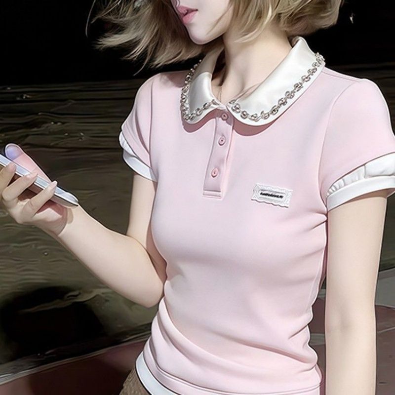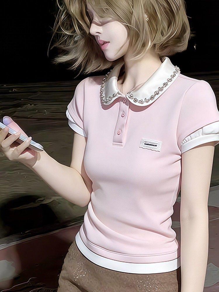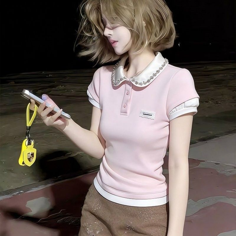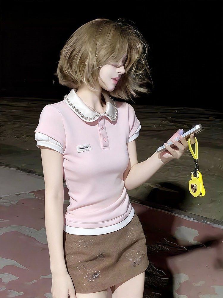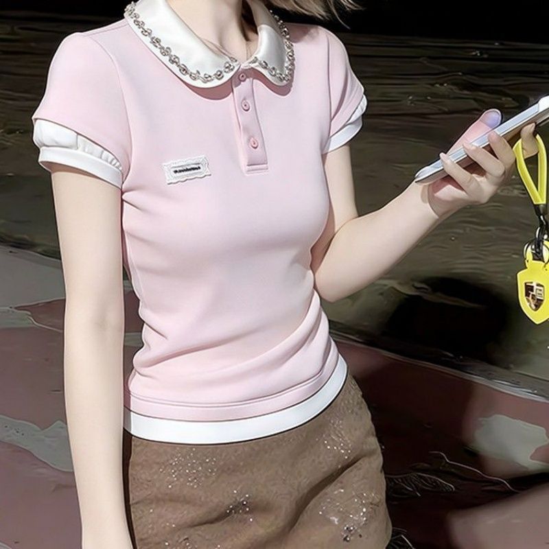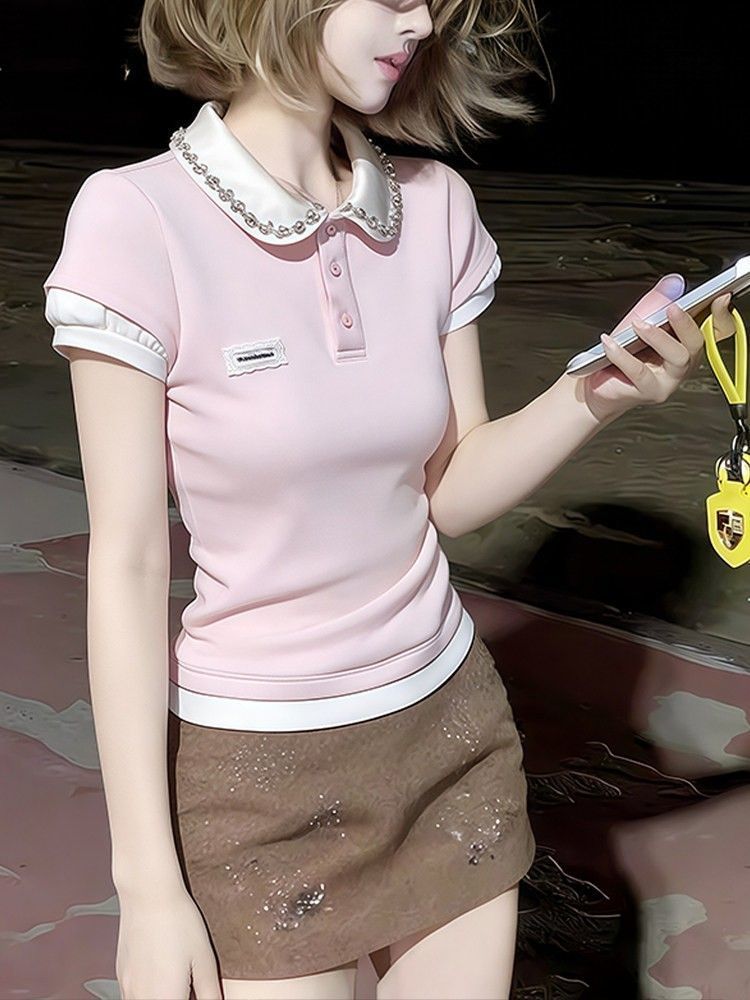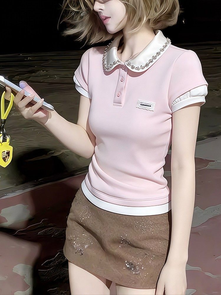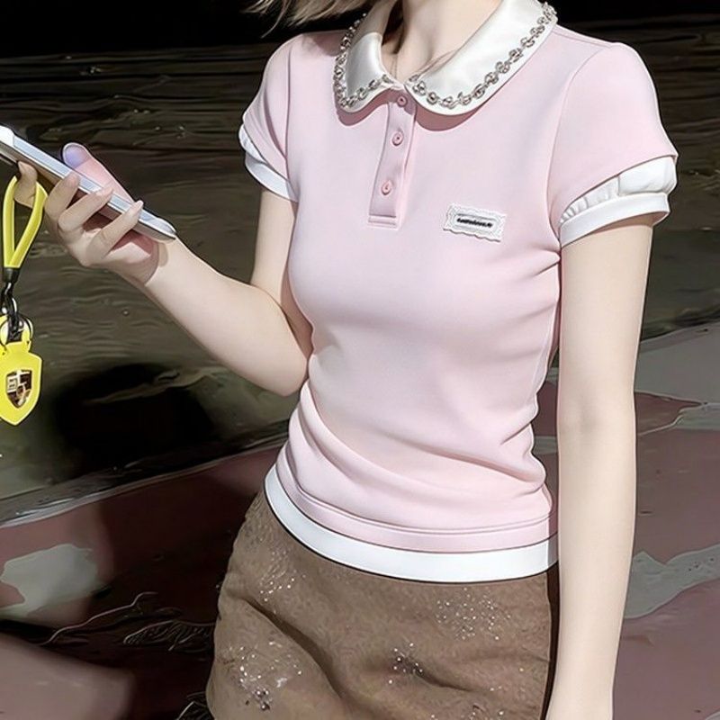 RY1298# 韩版粉色重工假两件水钻翻领短袖t恤女夏季短款收腰显瘦正肩上衣