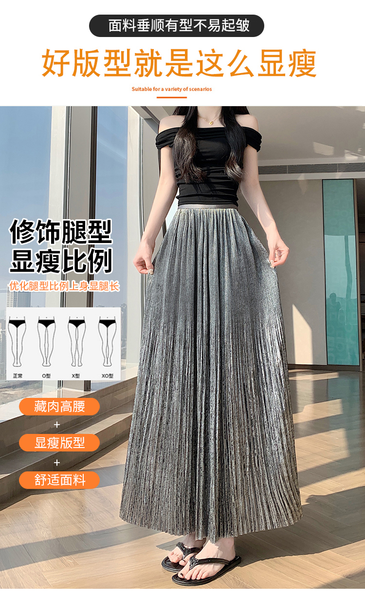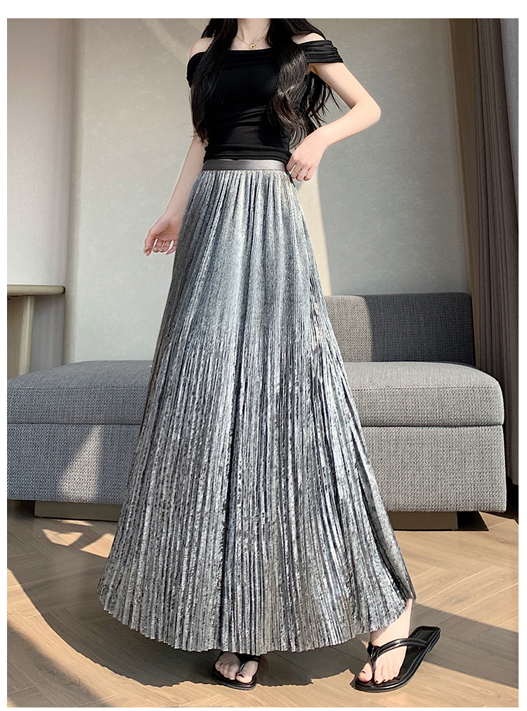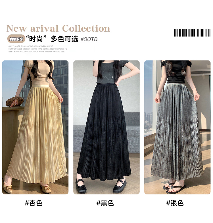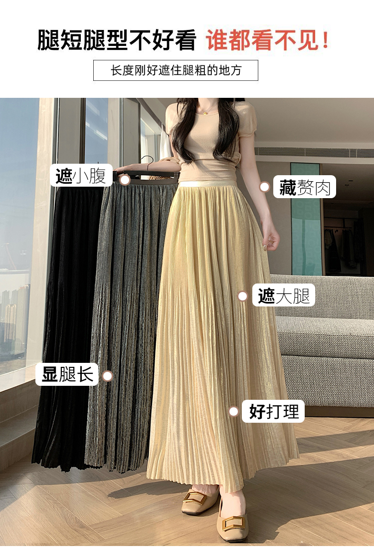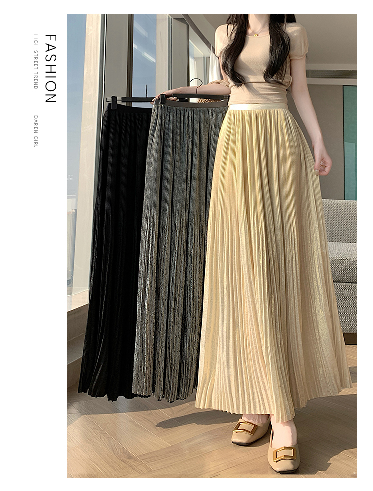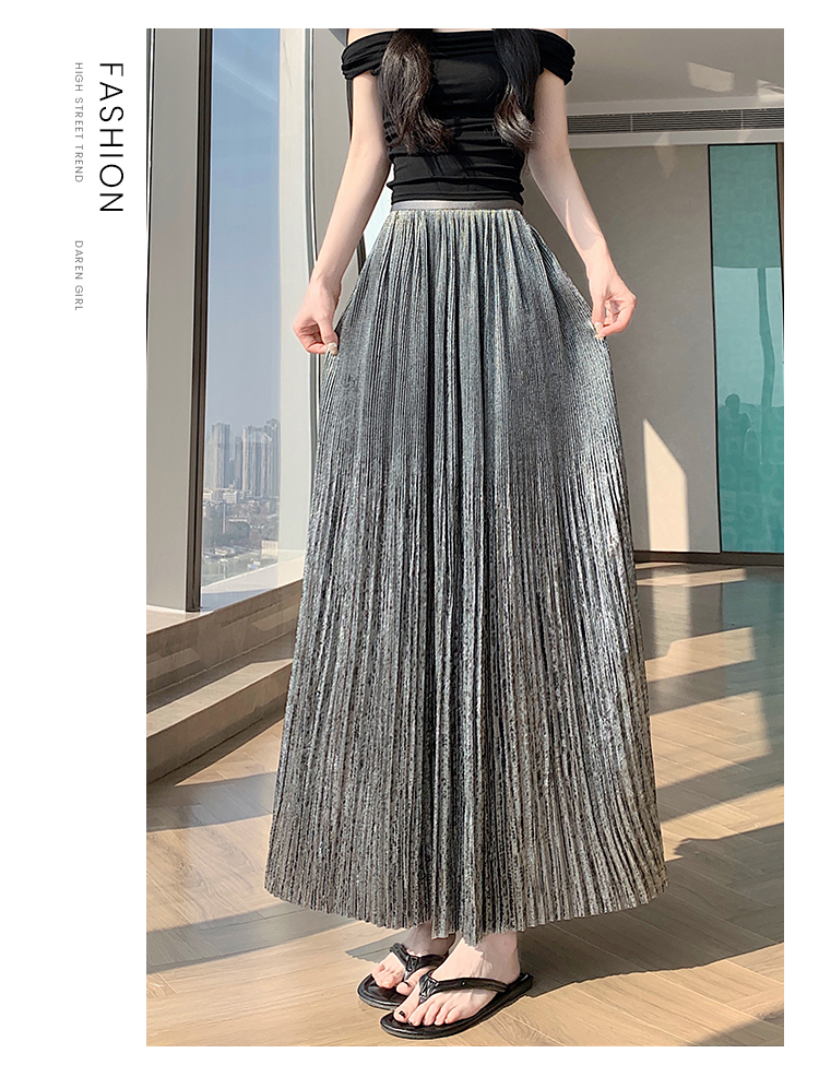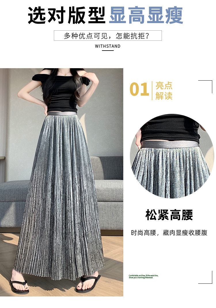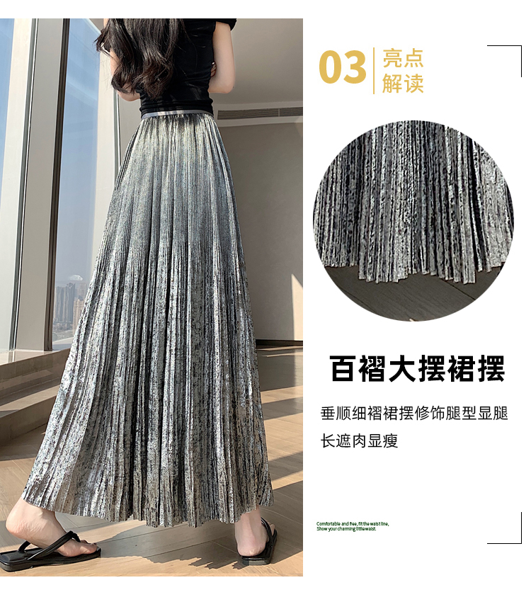 RY1333# 实拍 2026春夏松紧腰显瘦钻石感烫银珠光纱中长半身a字裙百褶伞裙