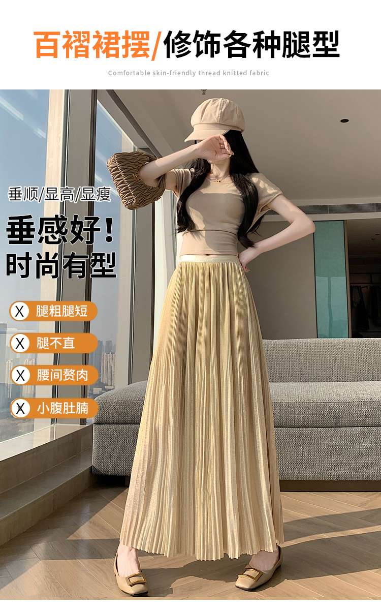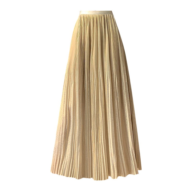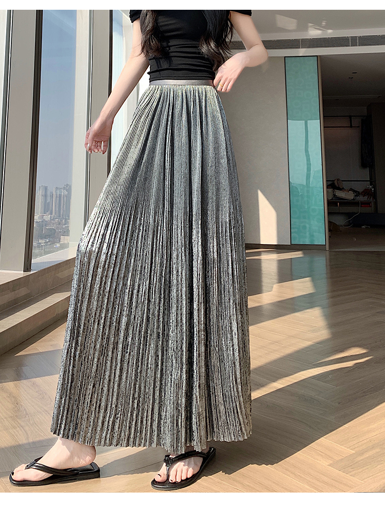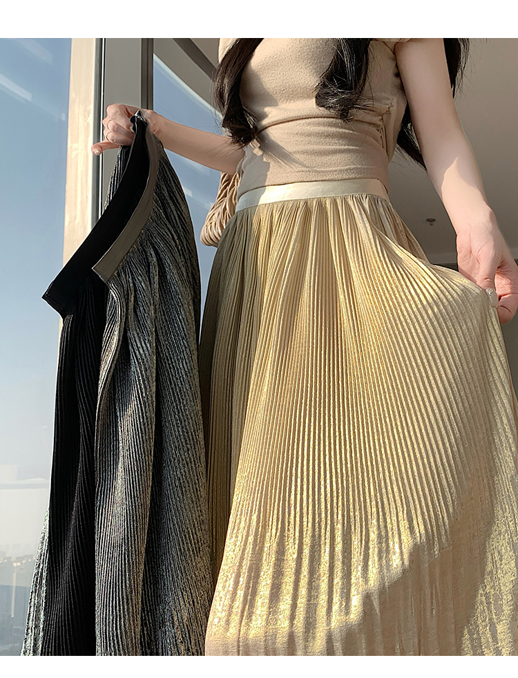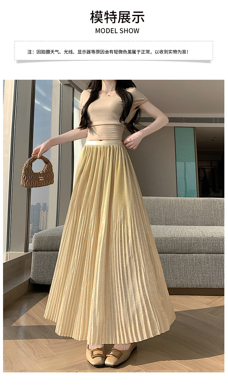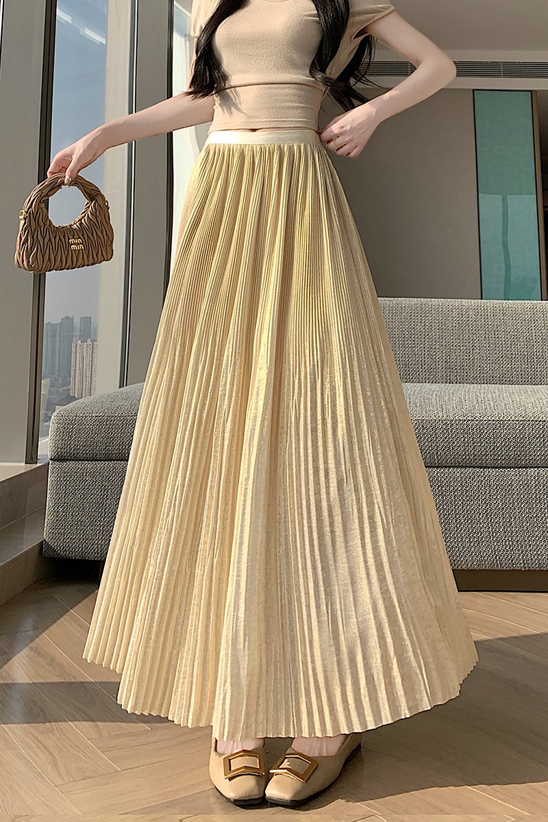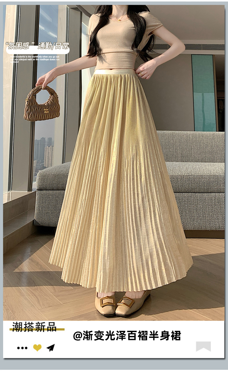 RY1333# 实拍 2026春夏松紧腰显瘦钻石感烫银珠光纱中长半身a字裙百褶伞裙