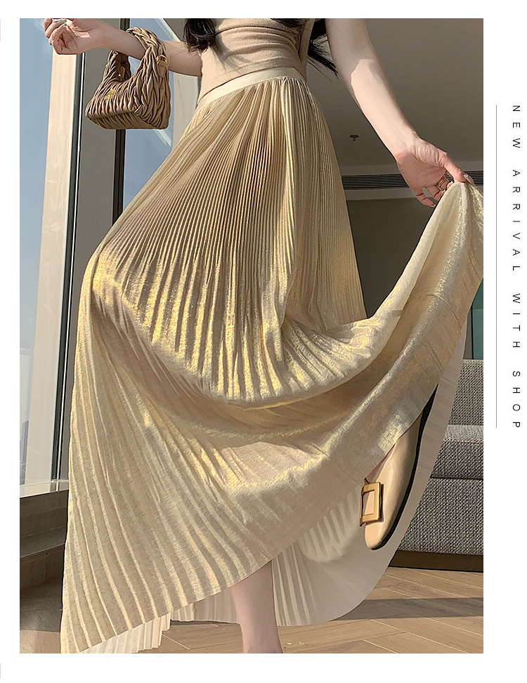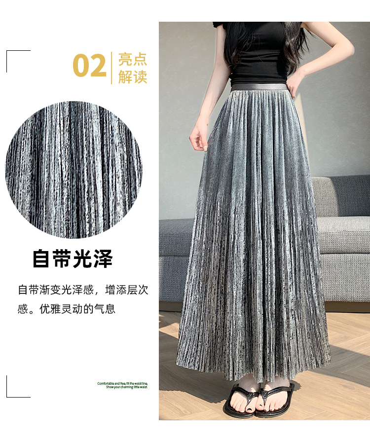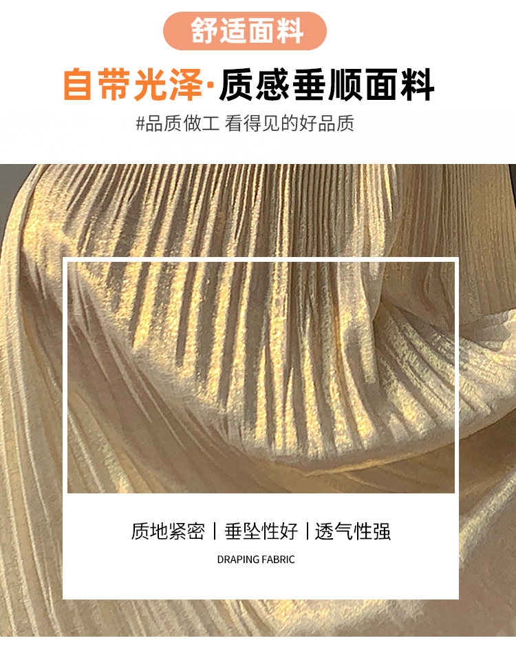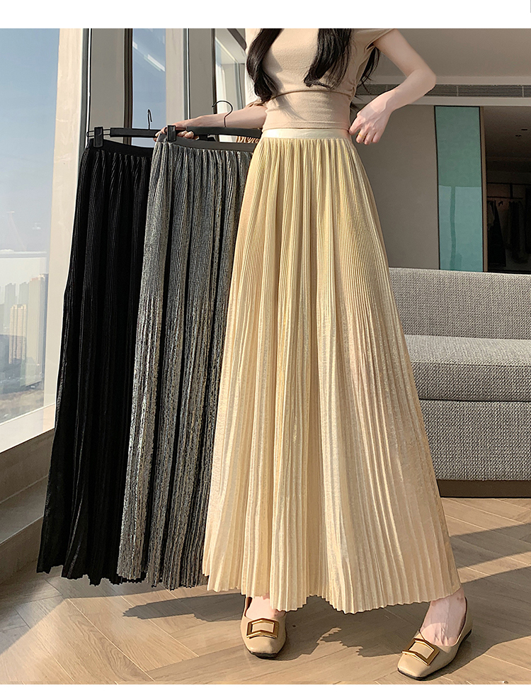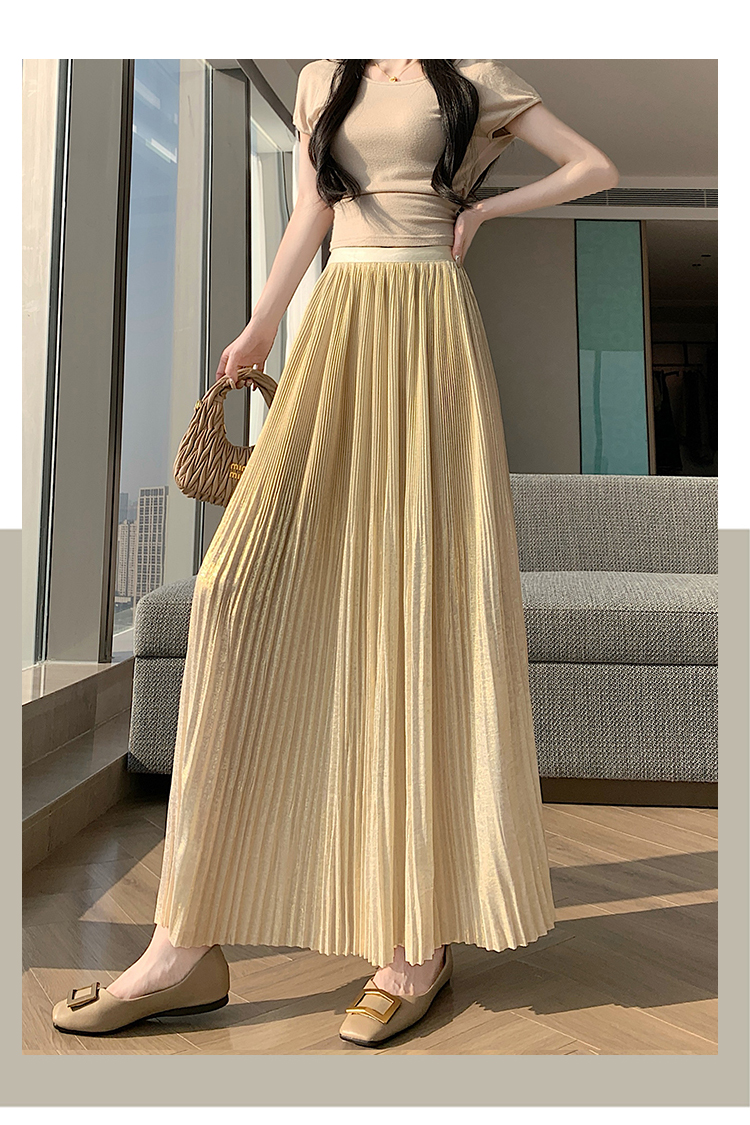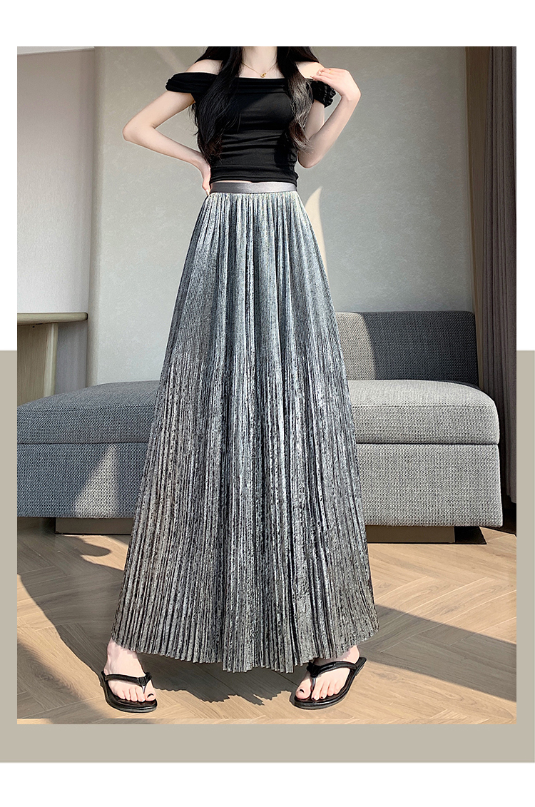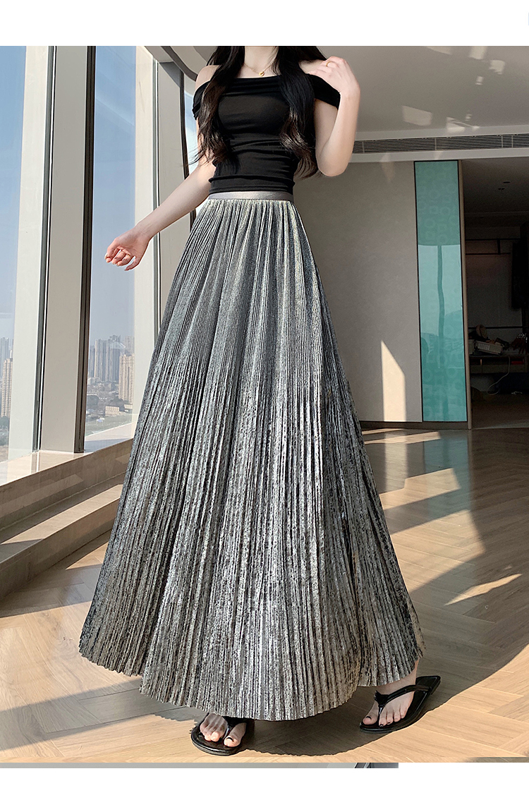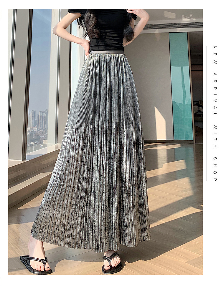 RY1333# 实拍 2026春夏松紧腰显瘦钻石感烫银珠光纱中长半身a字裙百褶伞裙