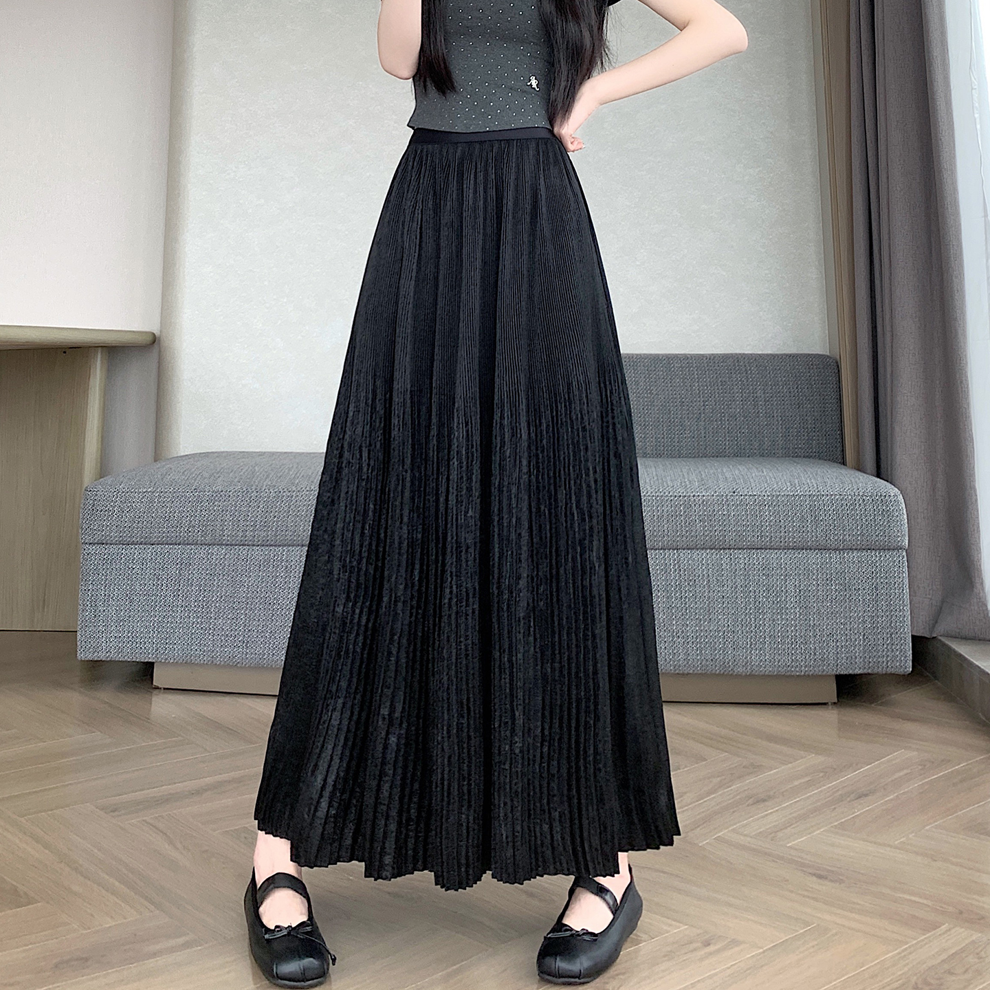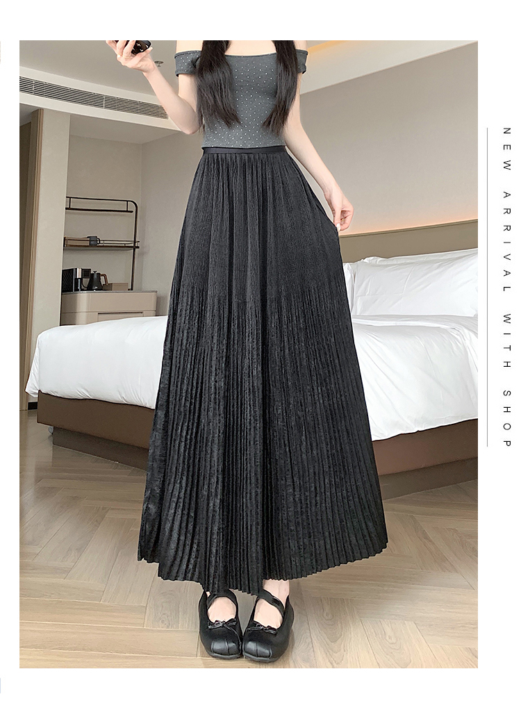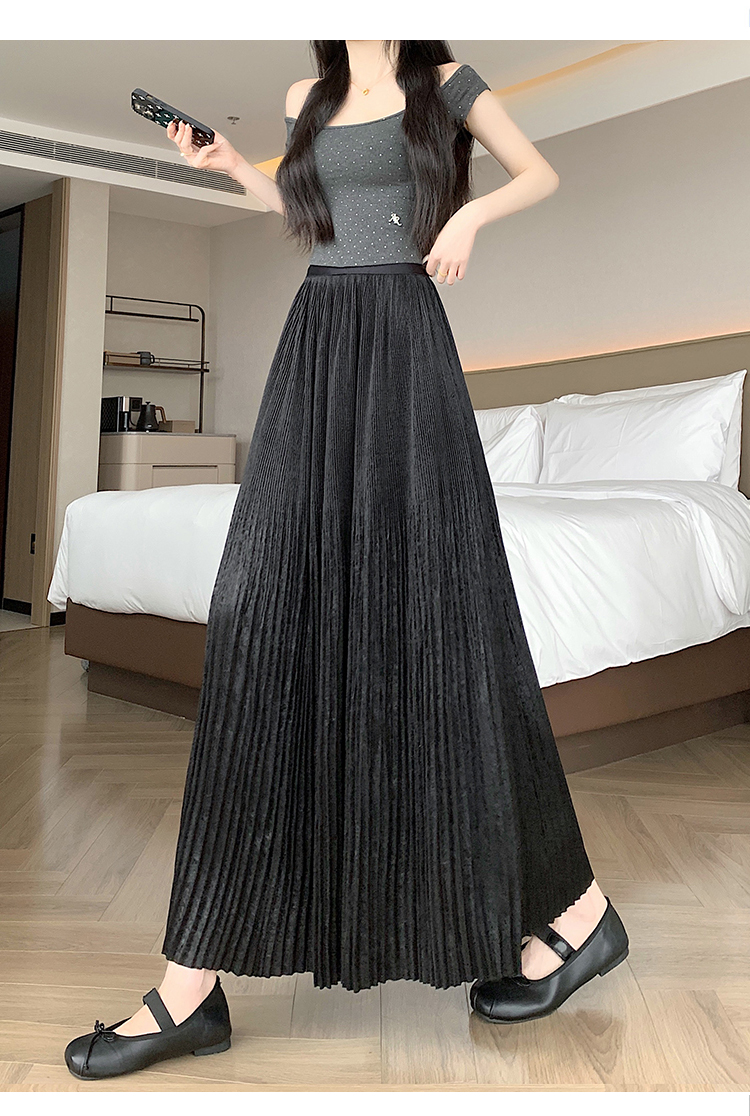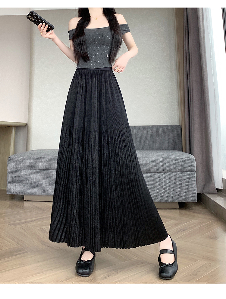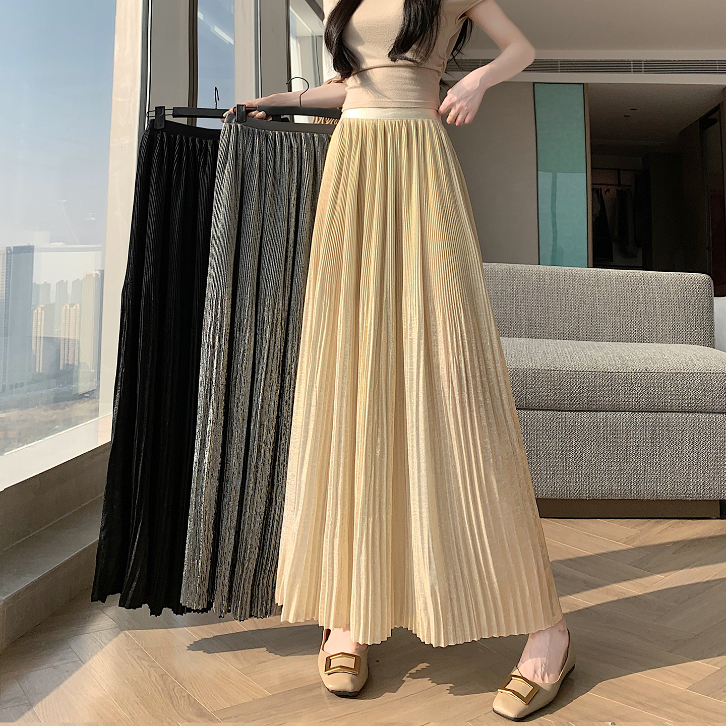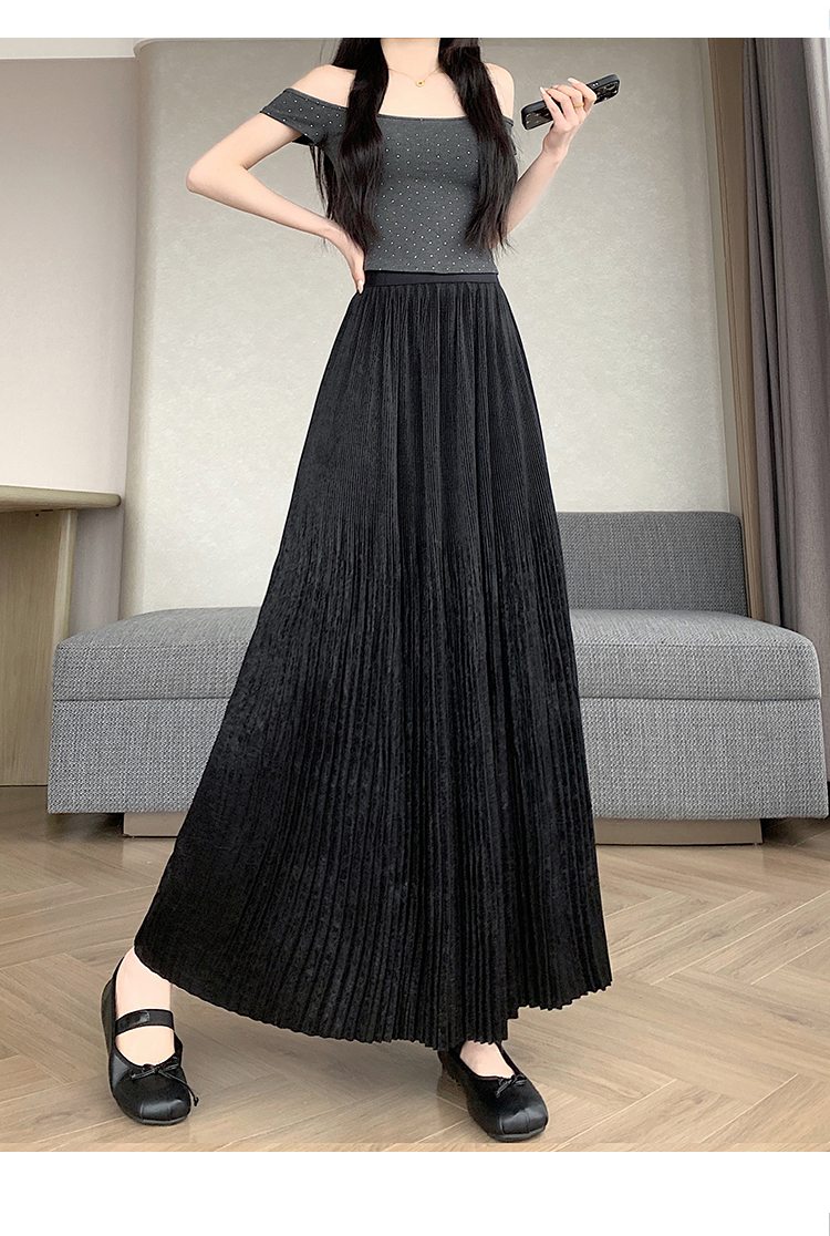 RY1333# 实拍 2026春夏松紧腰显瘦钻石感烫银珠光纱中长半身a字裙百褶伞裙