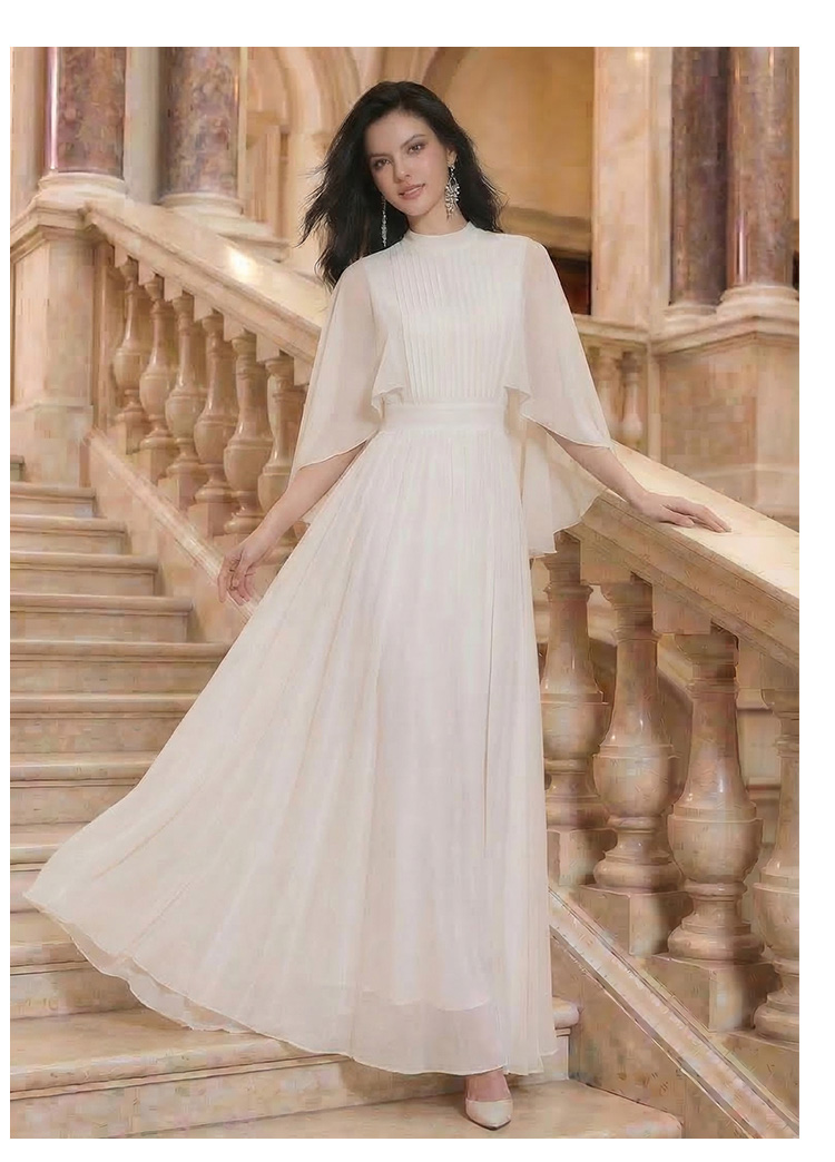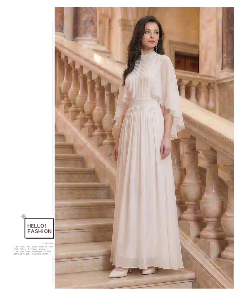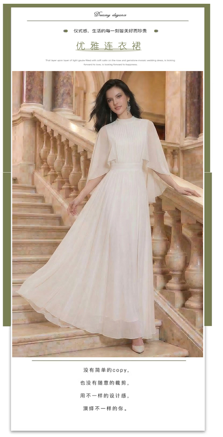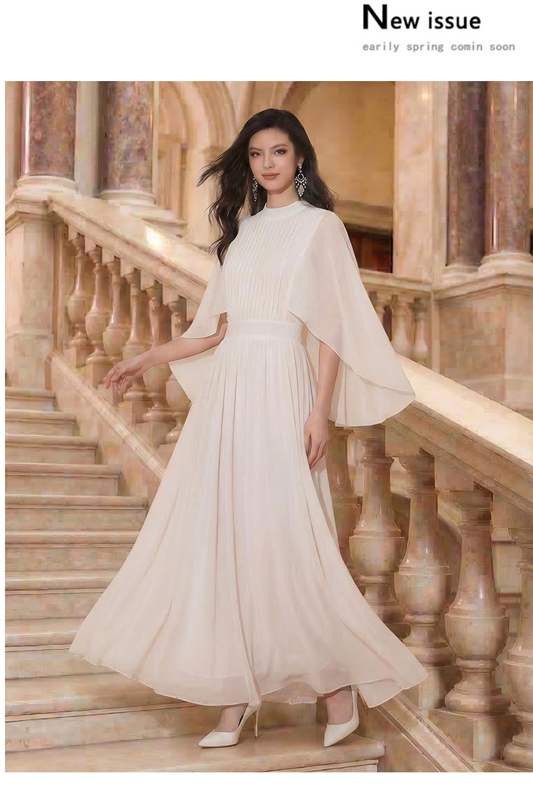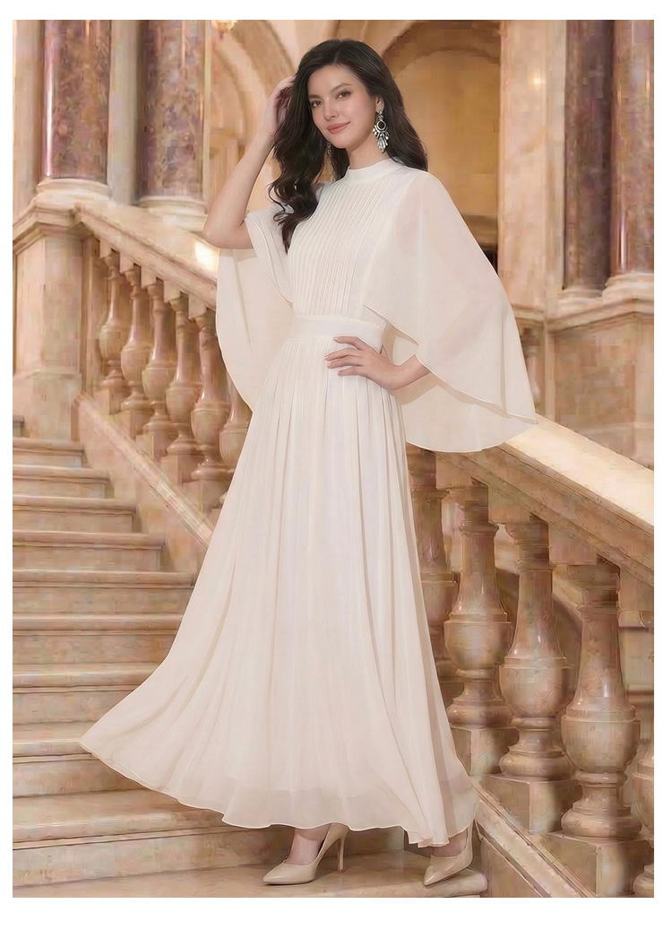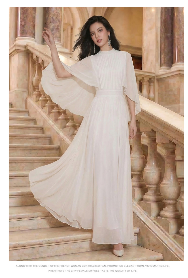 RY1345# 斗篷轻奢女装连衣裙大喇叭袖半高领白色长款裙子雪纺超长裙大摆裙