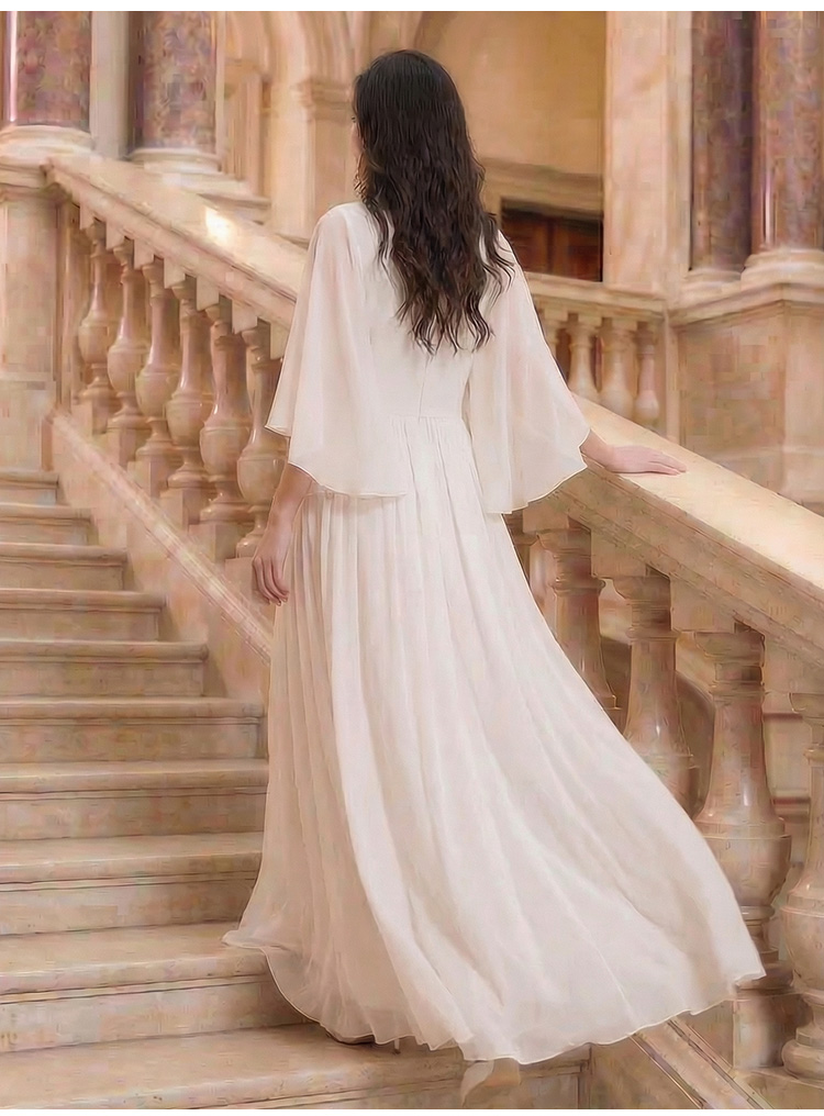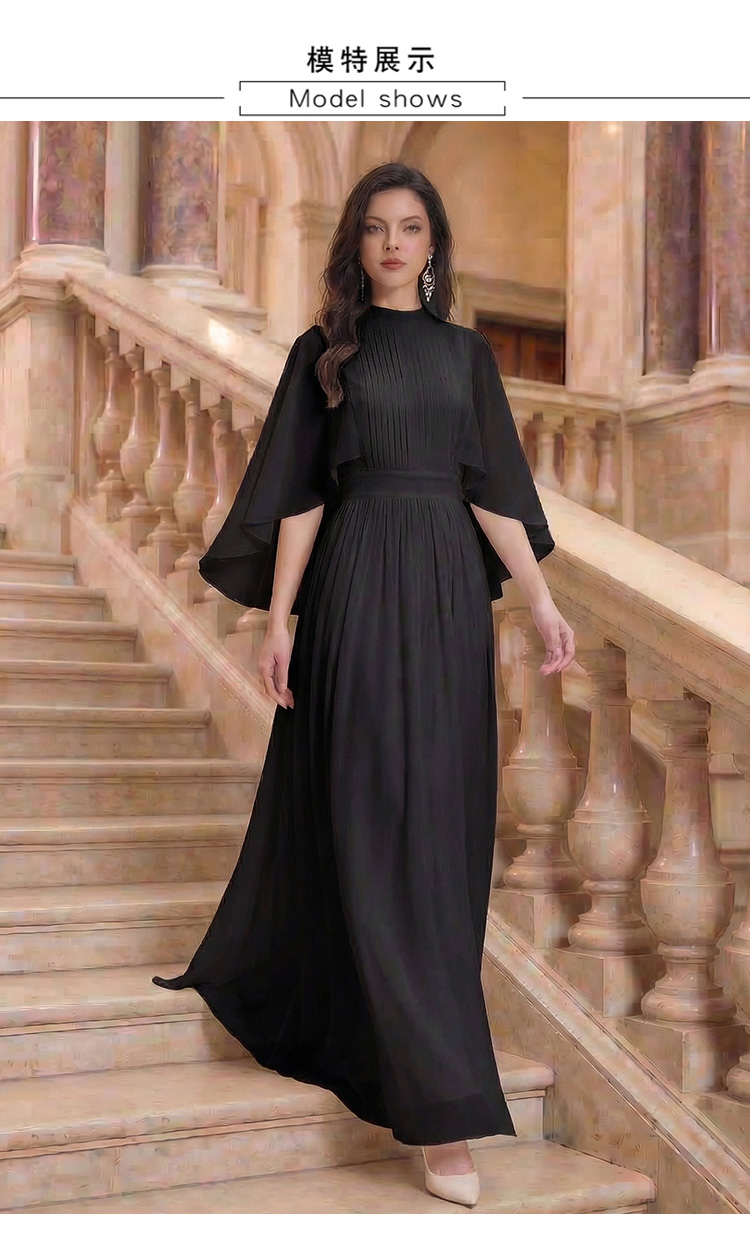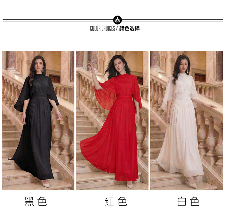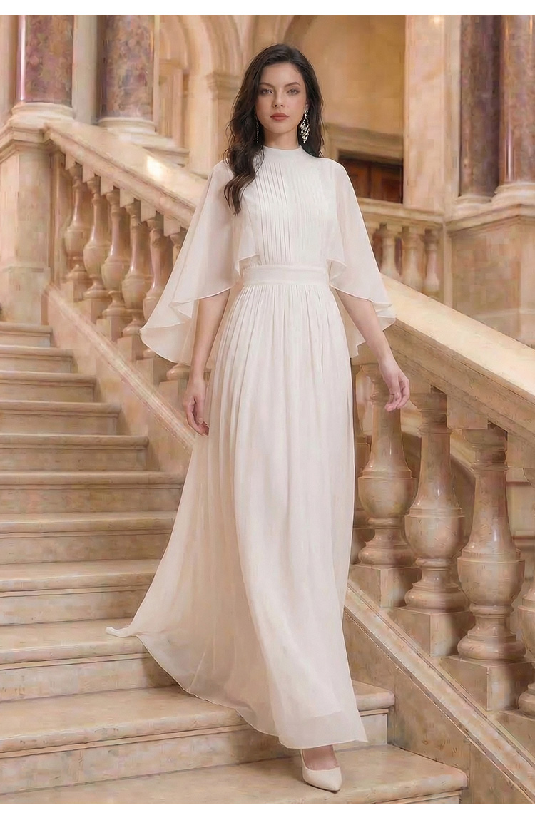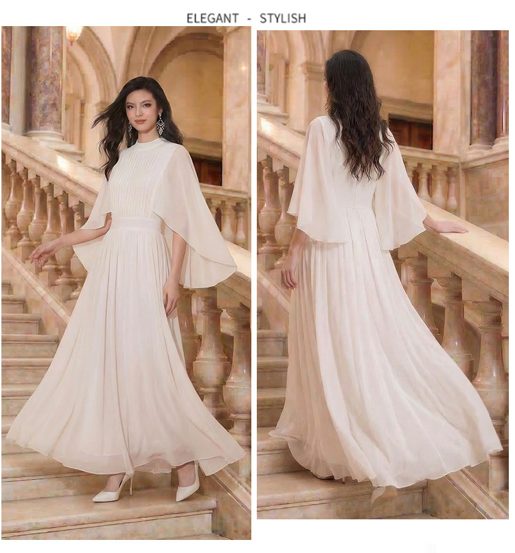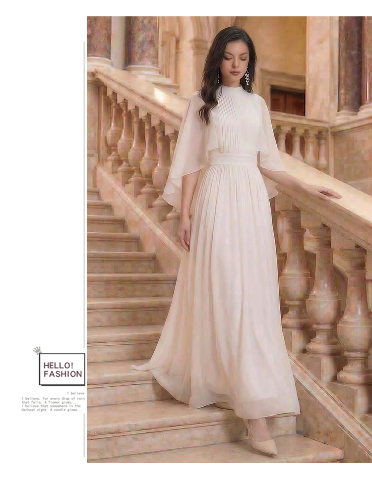 RY1345# 斗篷轻奢女装连衣裙大喇叭袖半高领白色长款裙子雪纺超长裙大摆裙