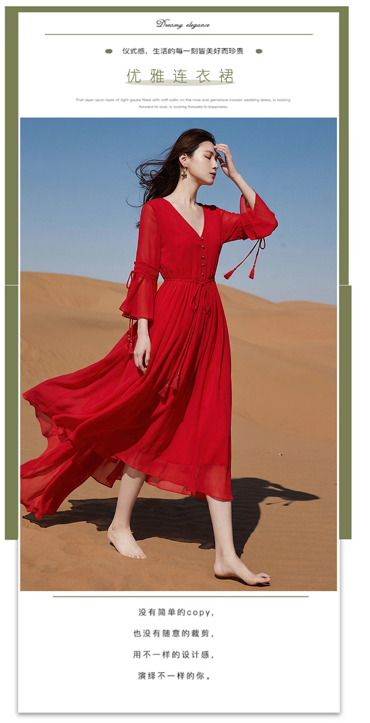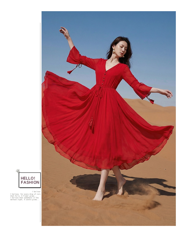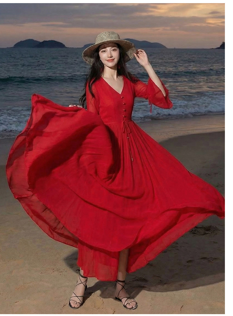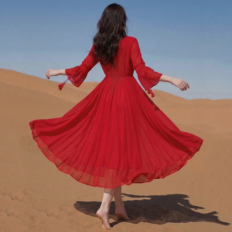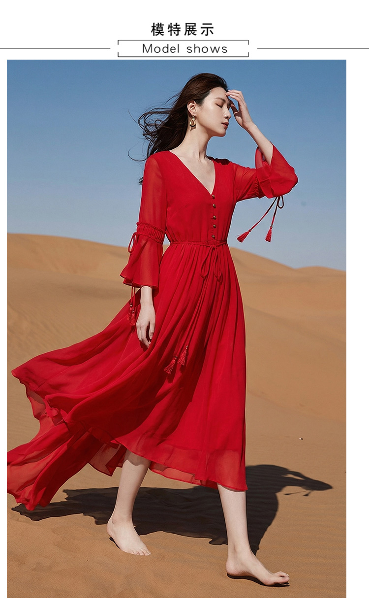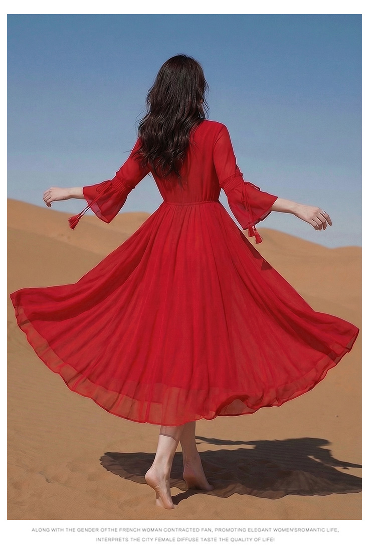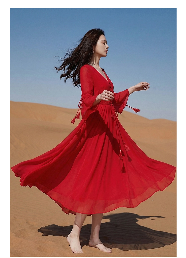 RY1346# 茶卡盐湖大红色连衣裙超仙女复古长裙新疆云南旅游拍照沙漠红裙夏