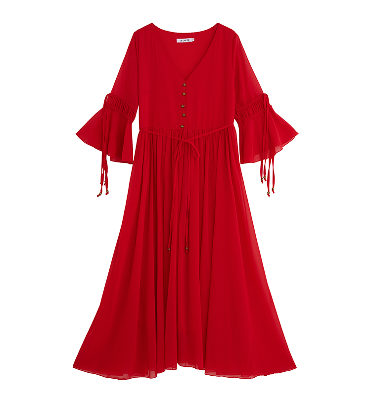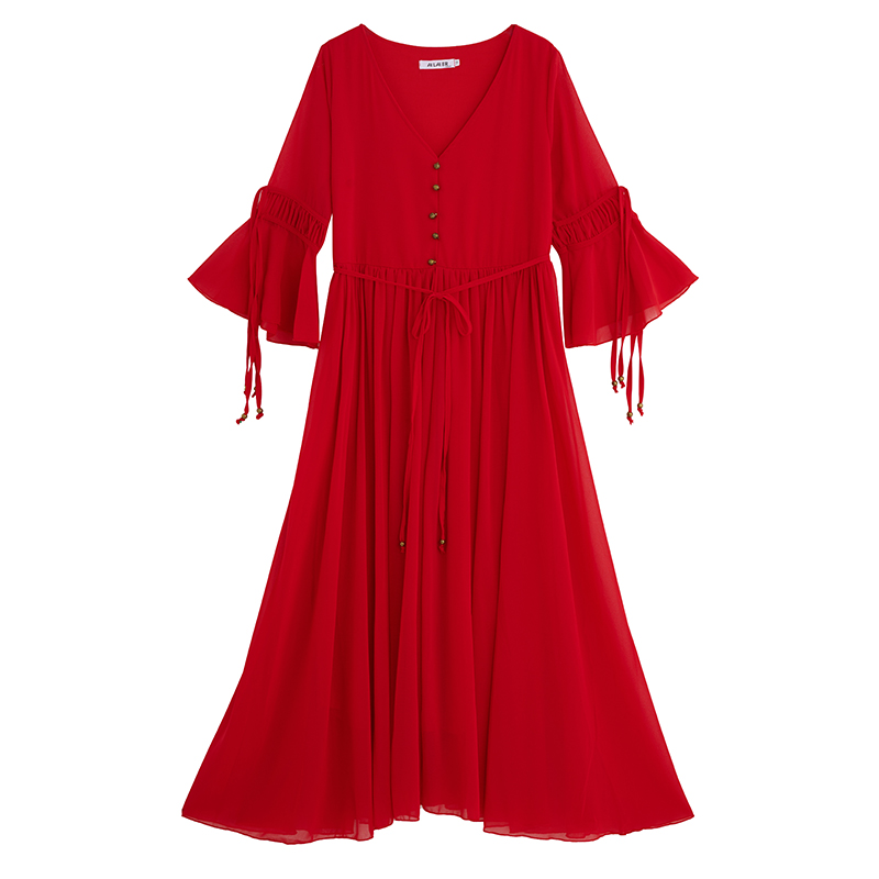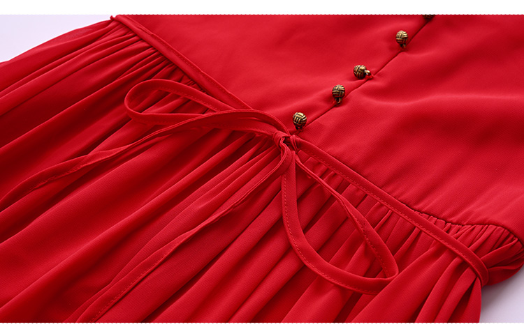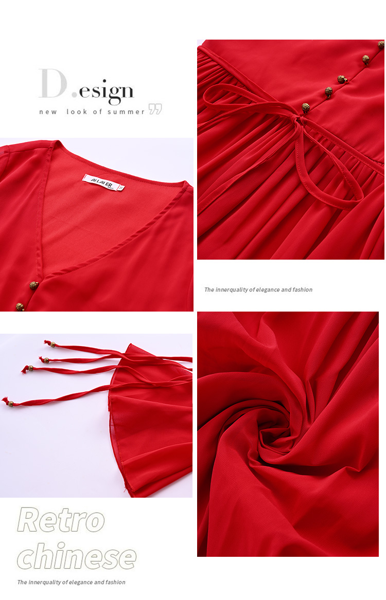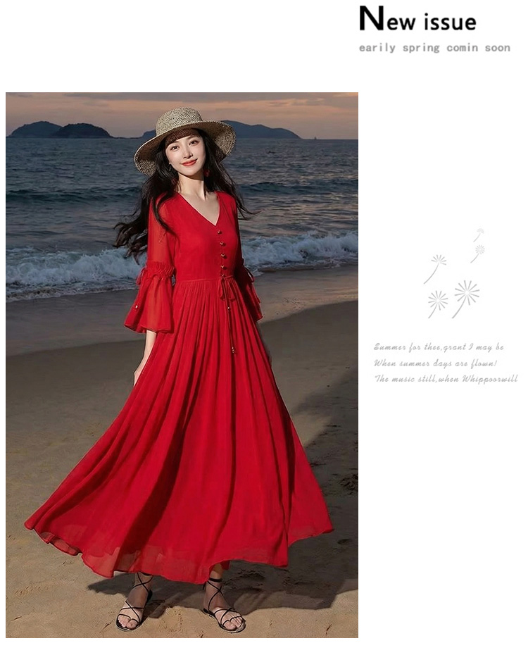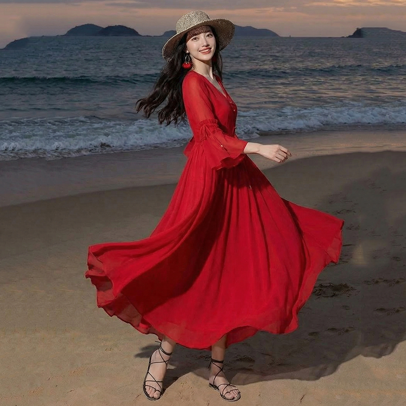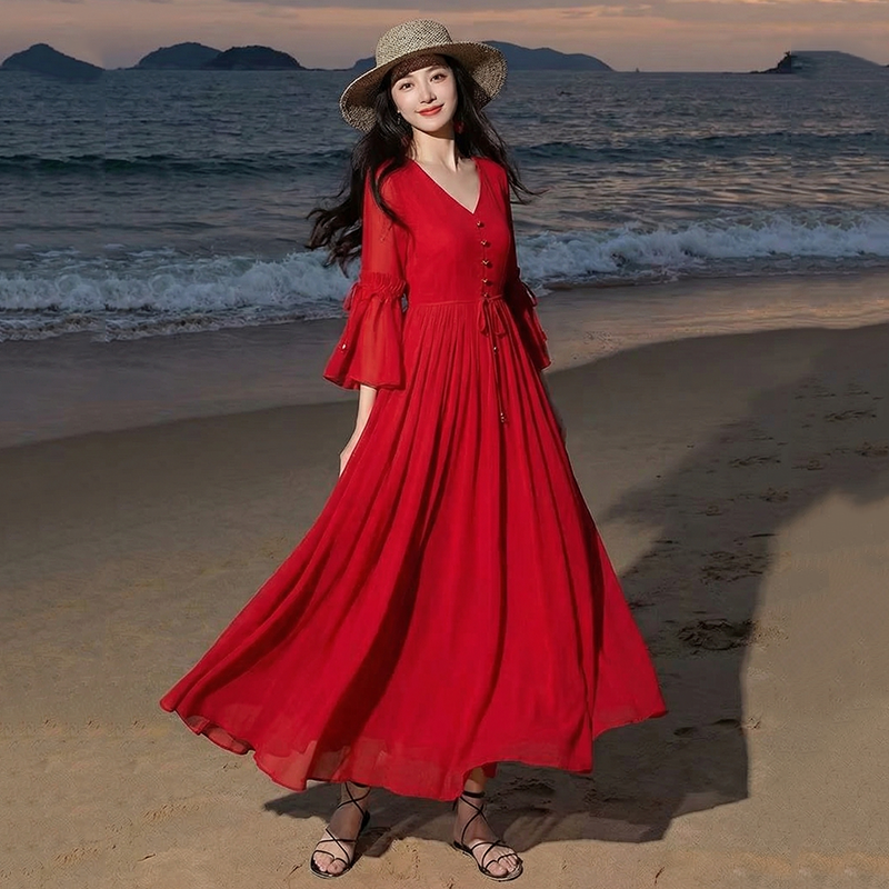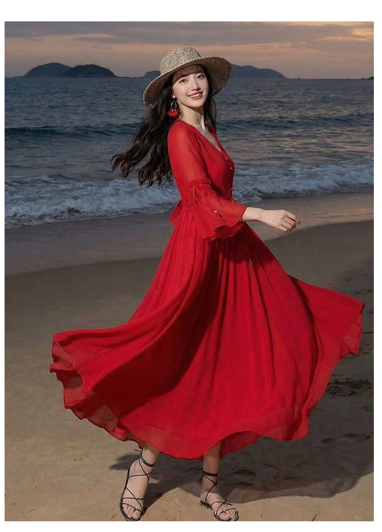RY1346# 茶卡盐湖大红色连衣裙超仙女复古长裙新疆云南旅游拍照沙漠红裙夏