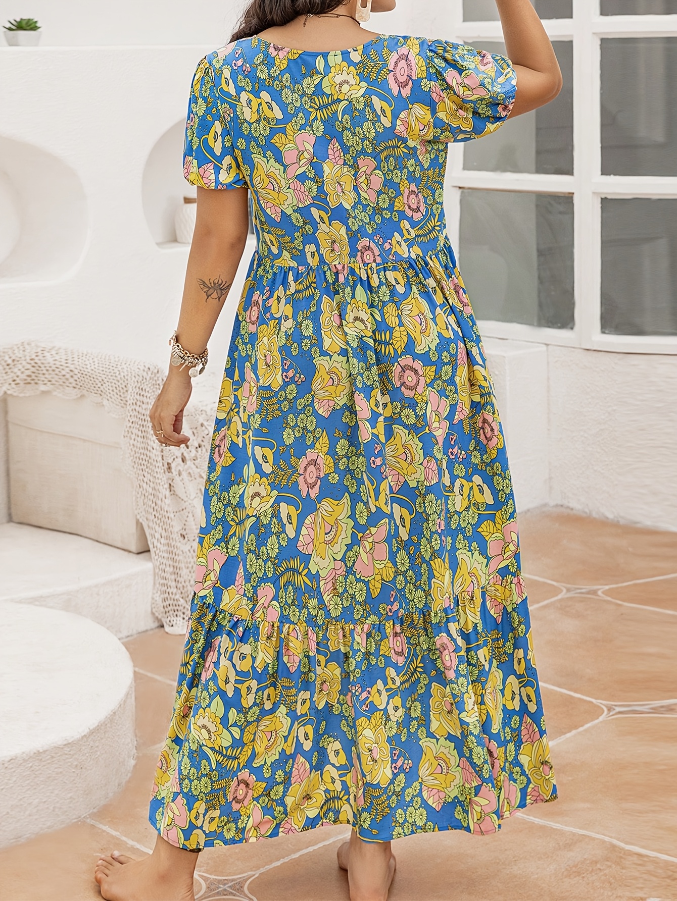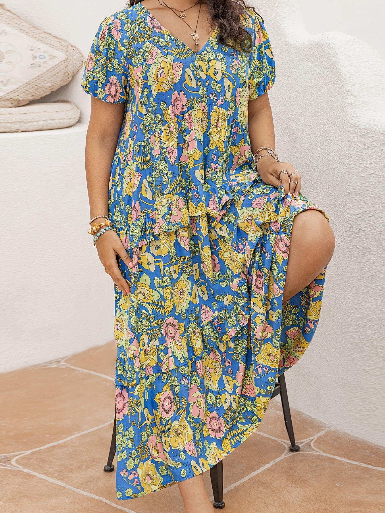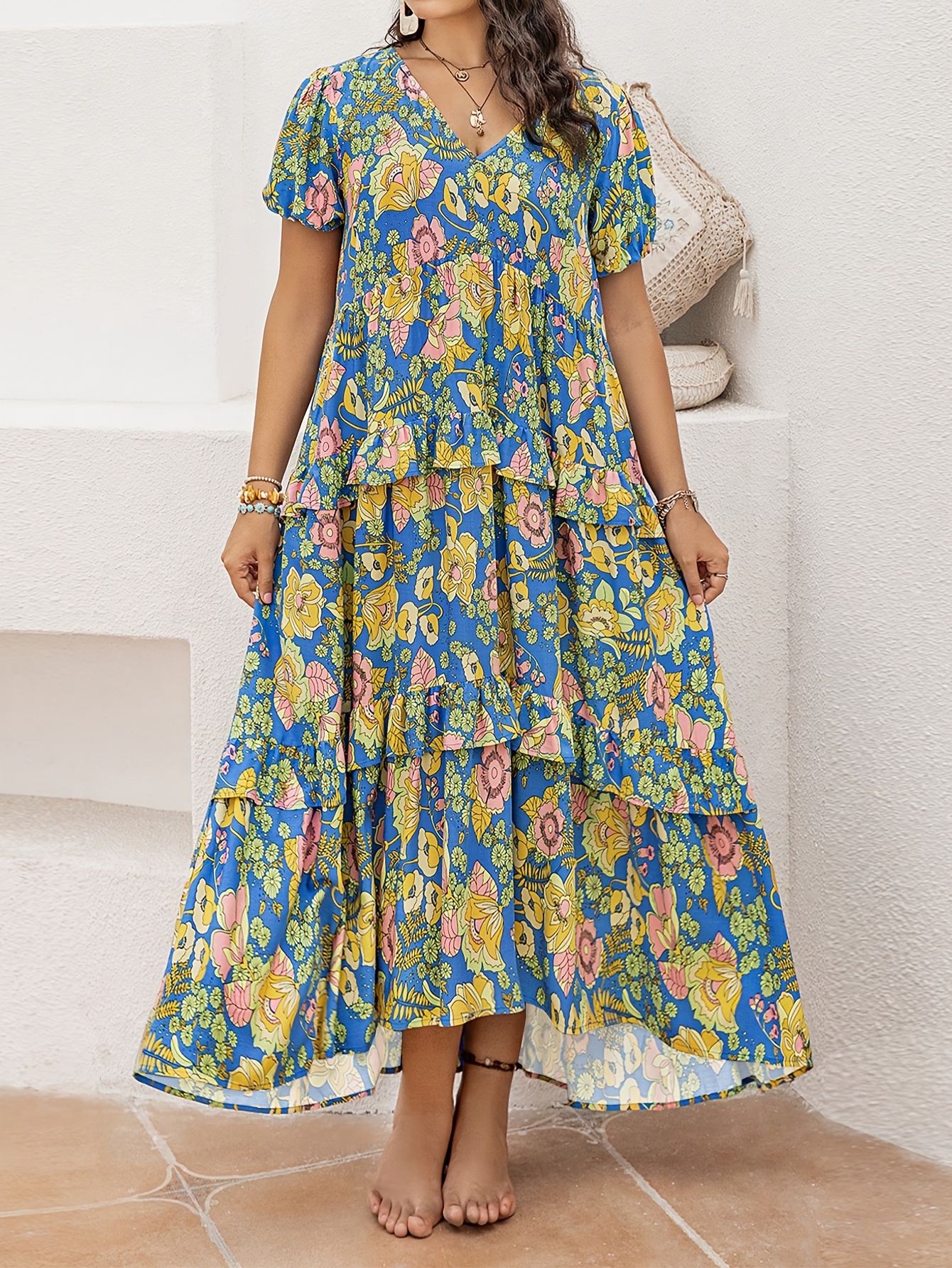 RY1352# D大码女士气质优雅夏款连衣裙V领荷叶边短袖印花宽松长裙