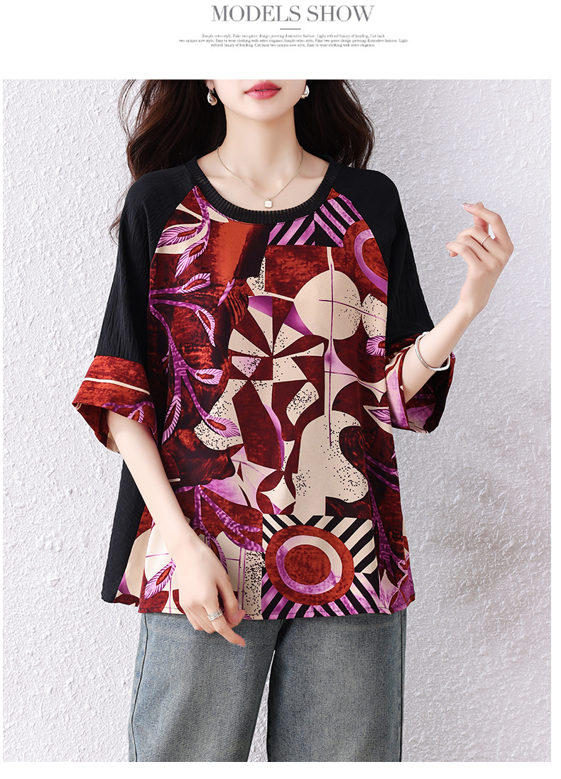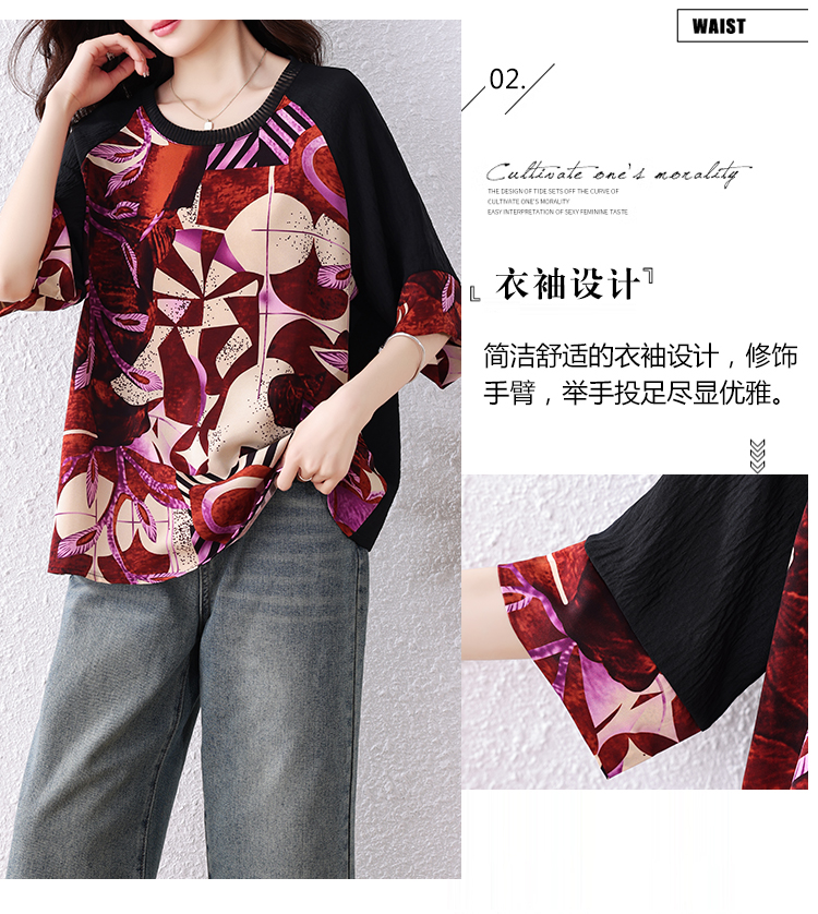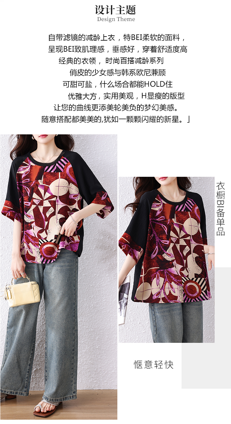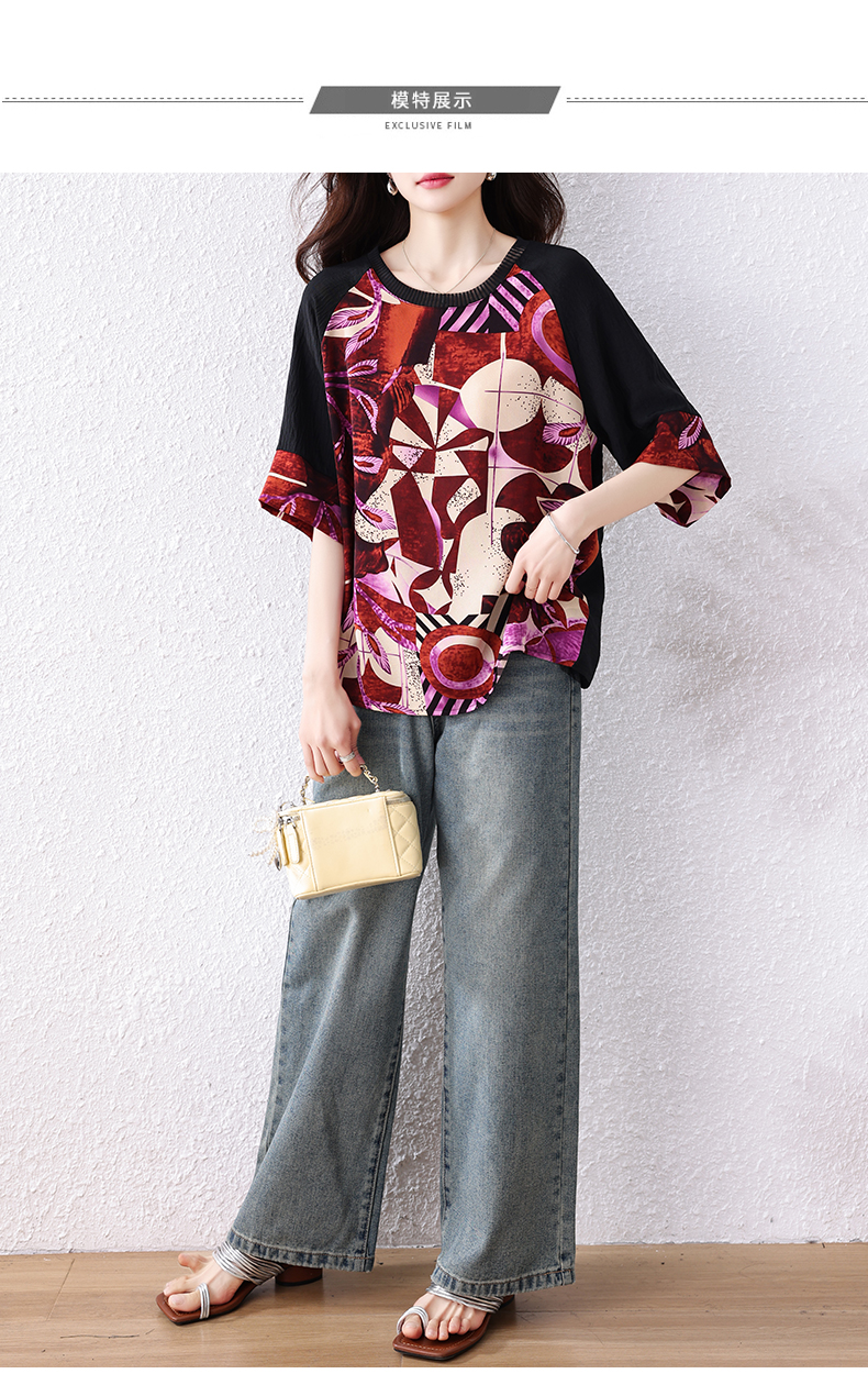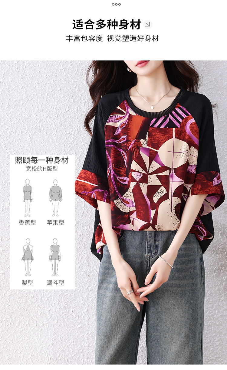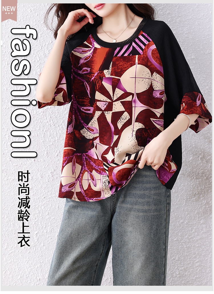 RY1353# 实拍2026夏季新款胖妹妹时尚减龄宽松遮肉显瘦拼接印花T恤上衣