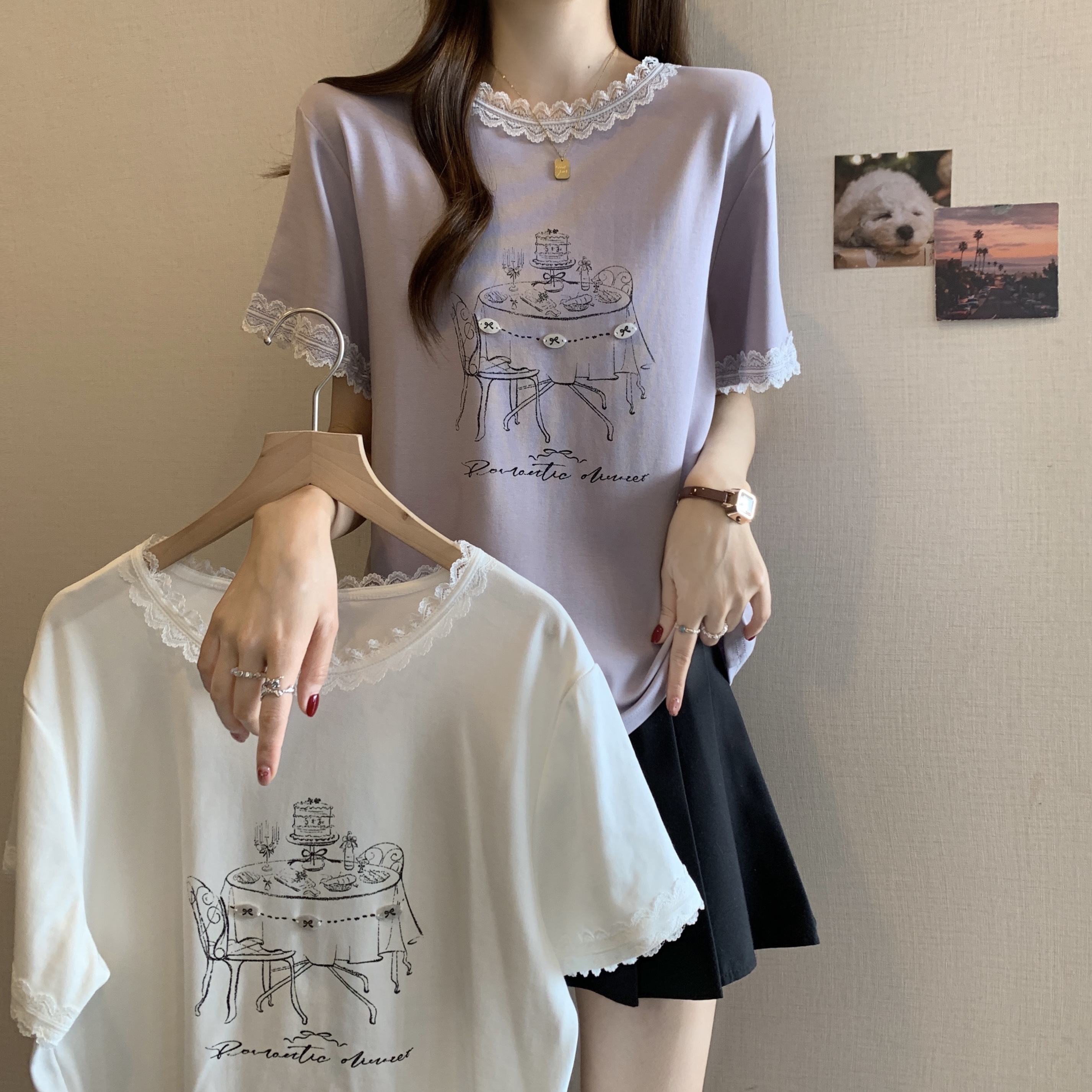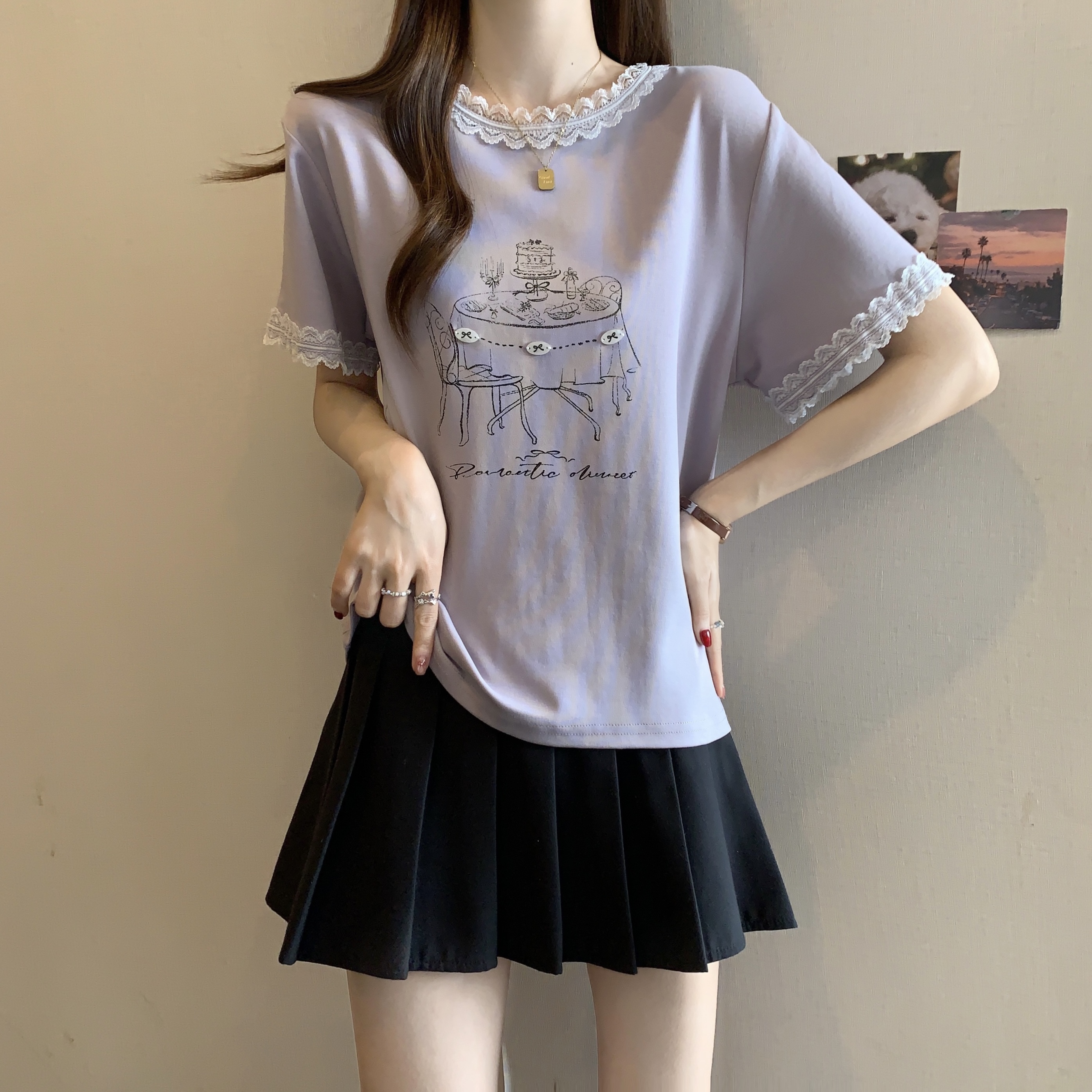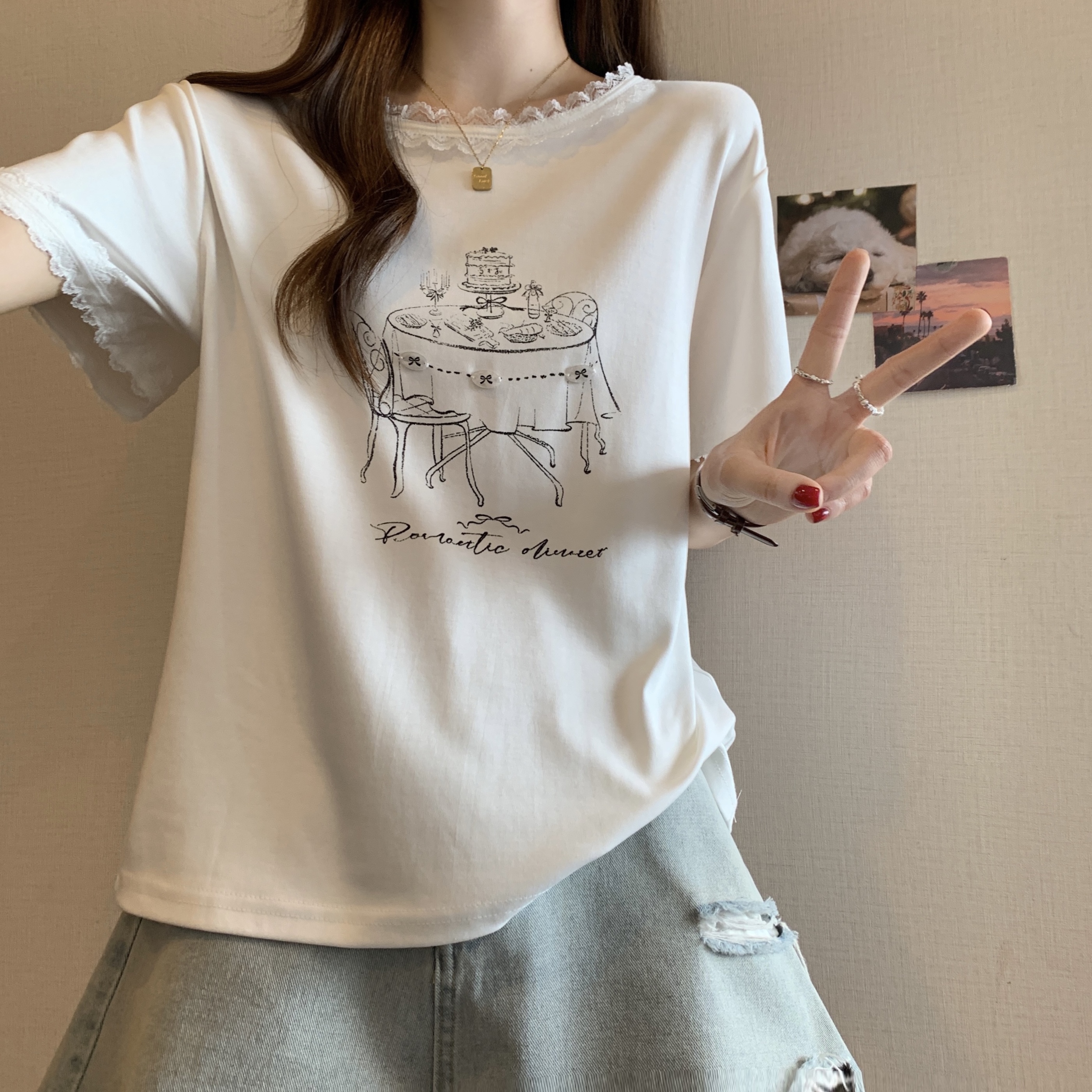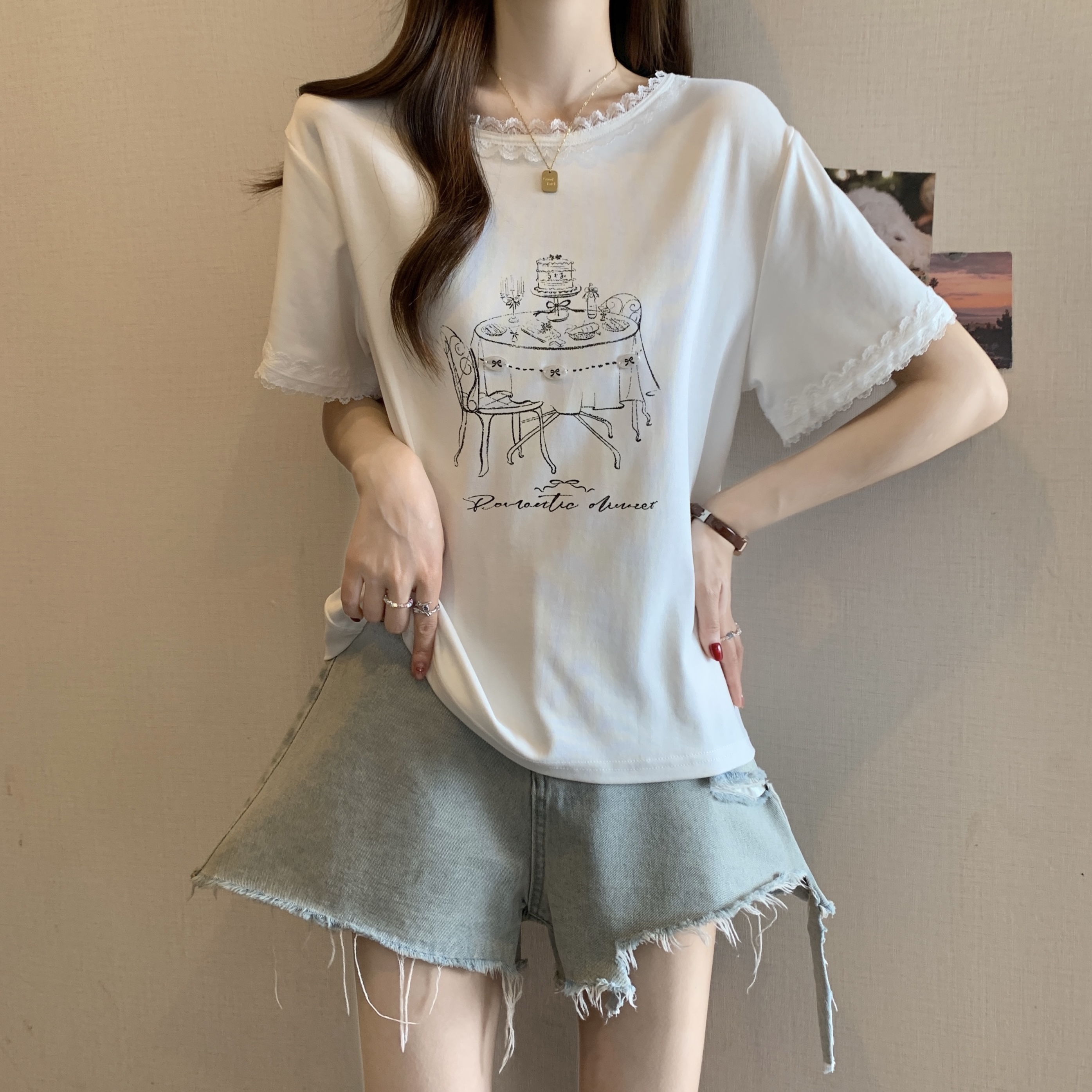 RY1367# 实拍大码~2026春夏季新款蕾丝边短袖T恤女百搭少女感甜美半袖上衣