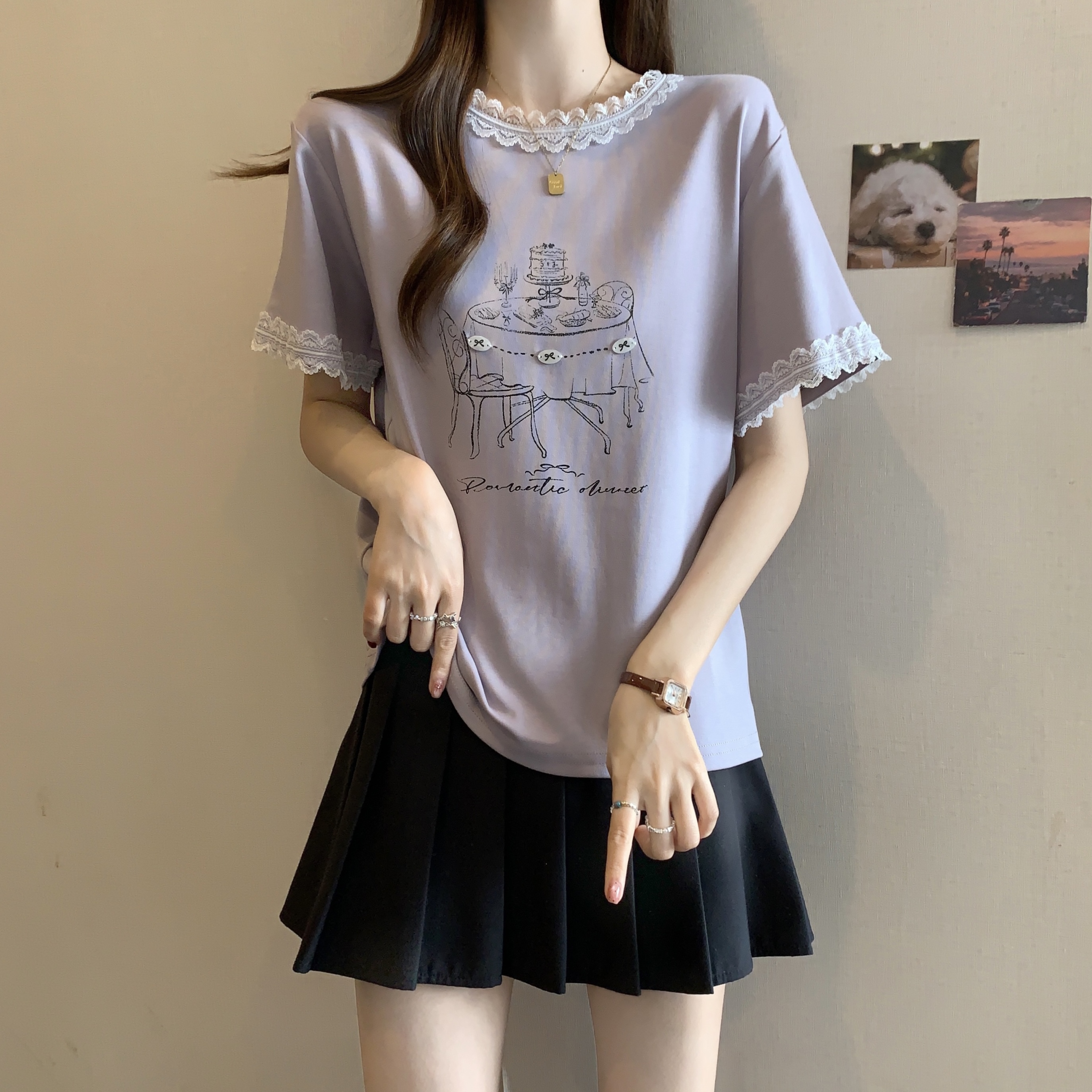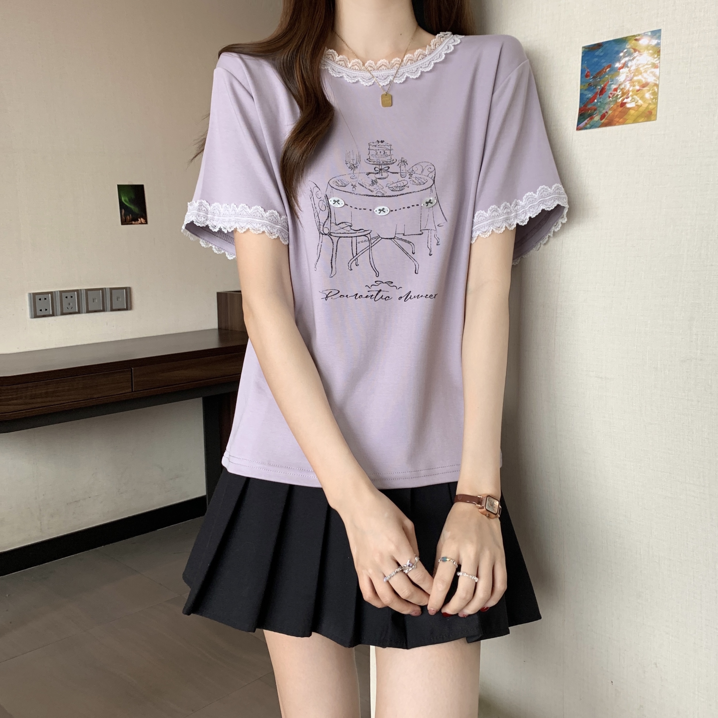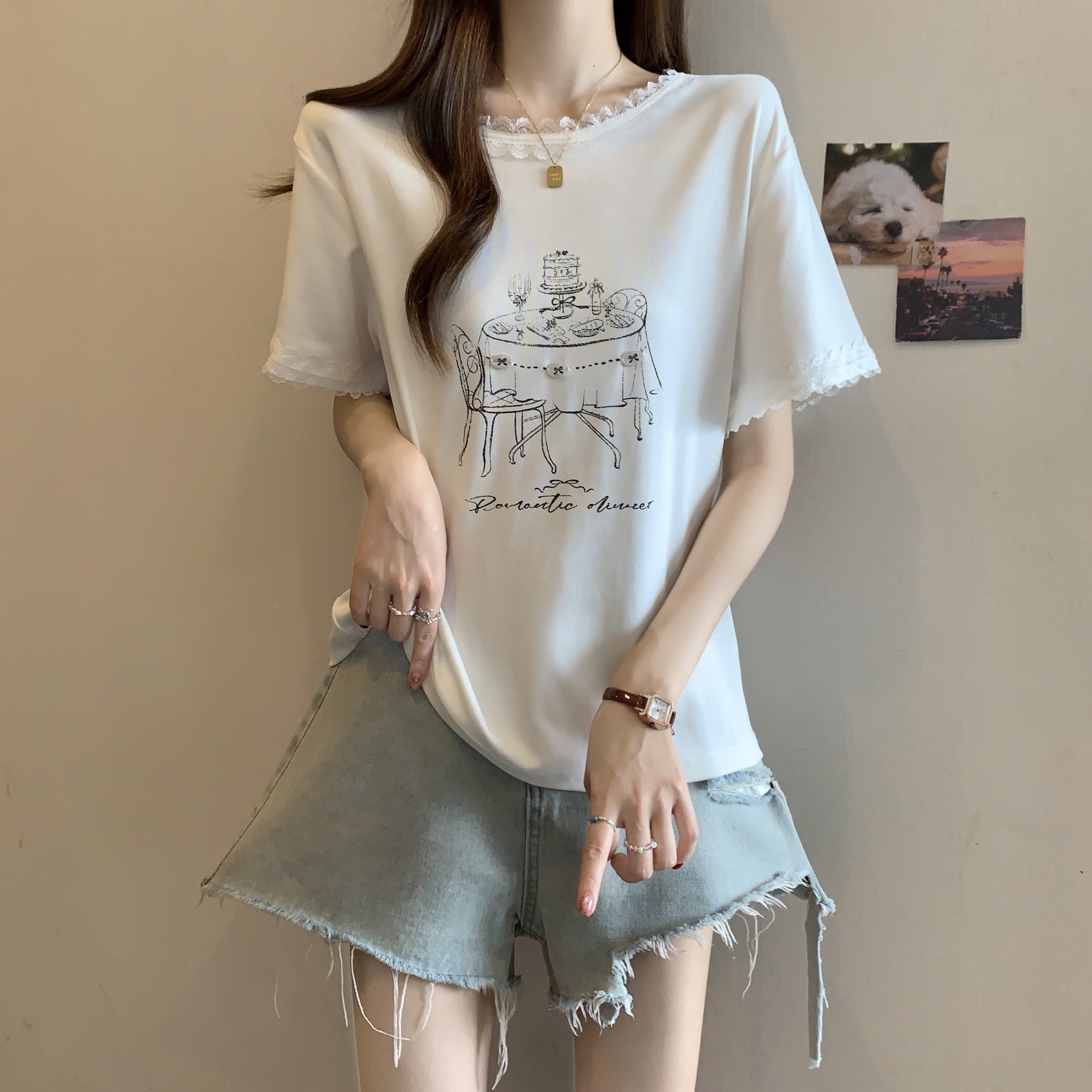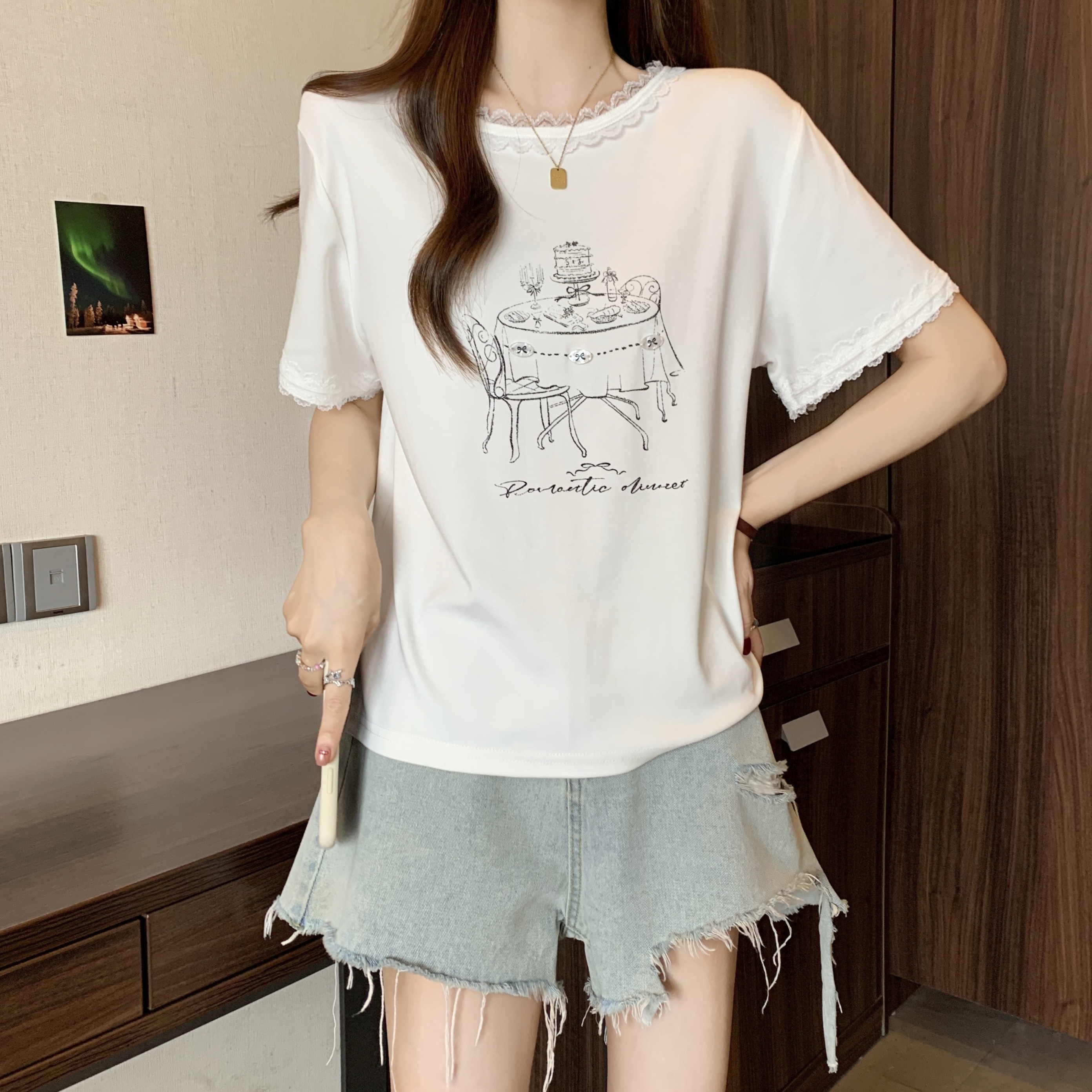 RY1367# 实拍大码~2026春夏季新款蕾丝边短袖T恤女百搭少女感甜美半袖上衣