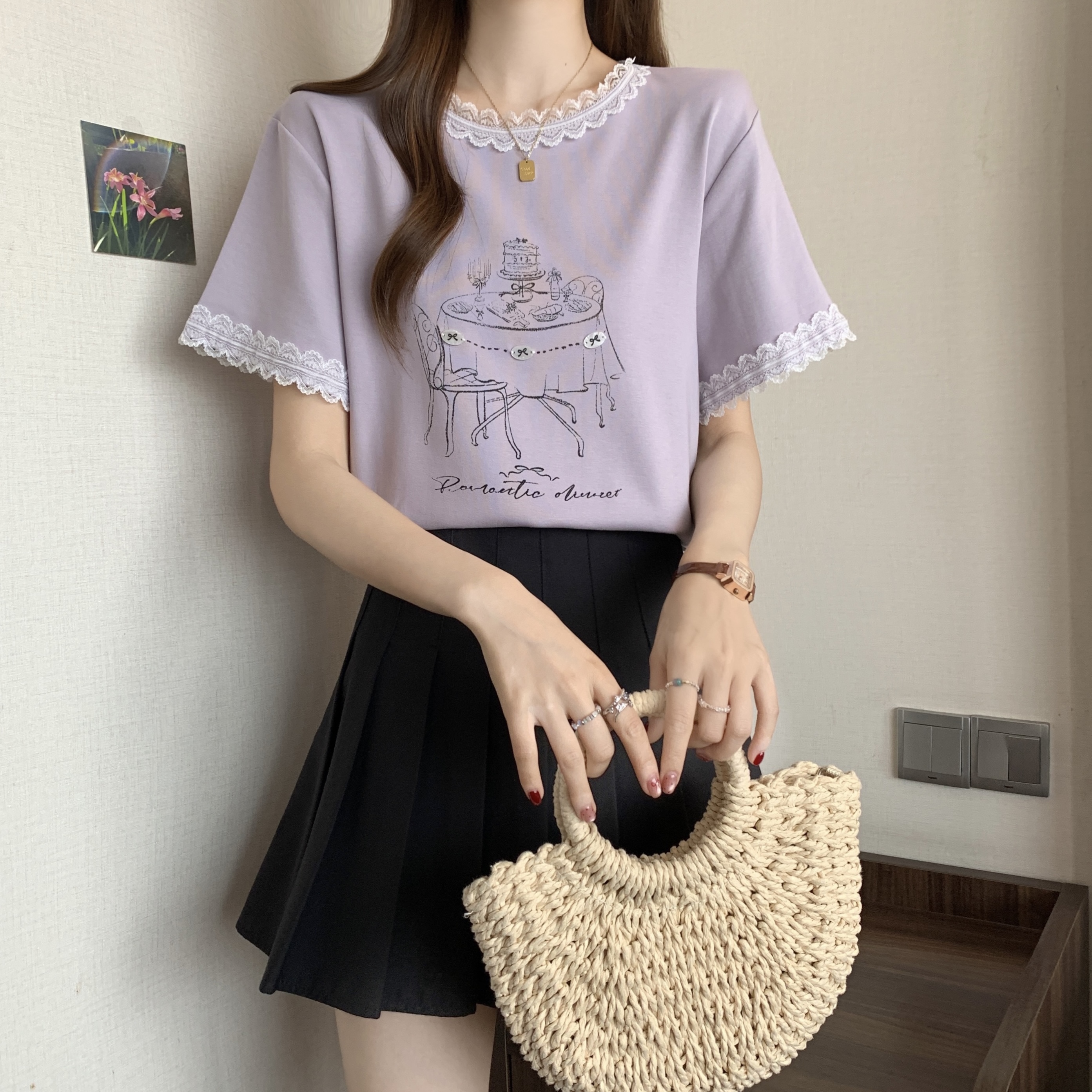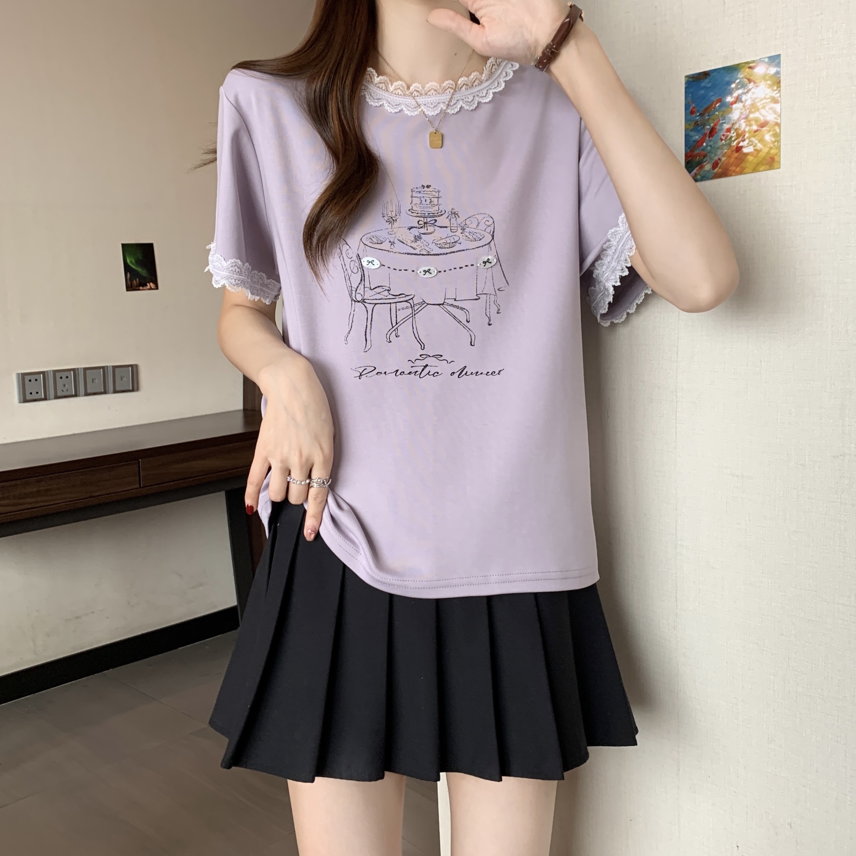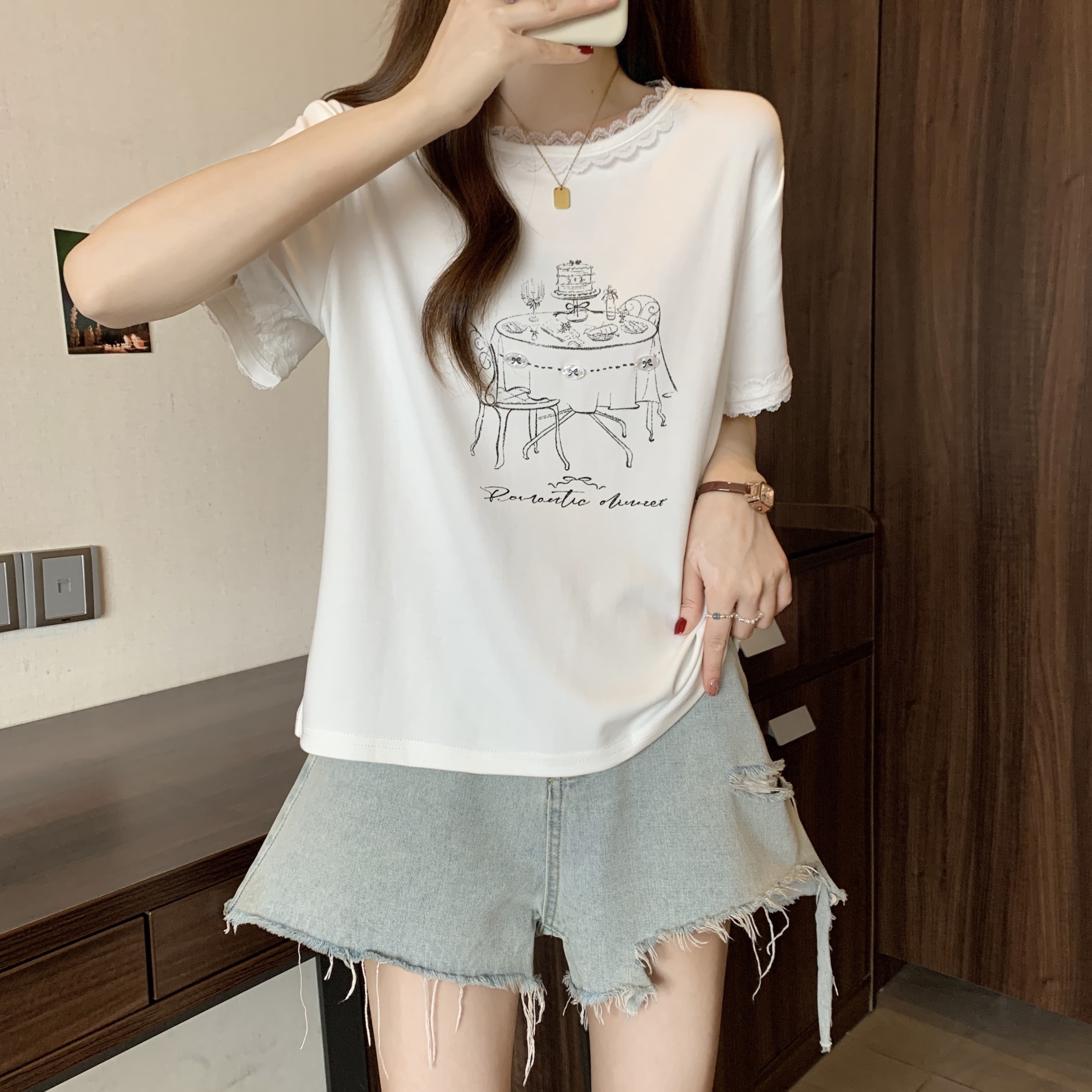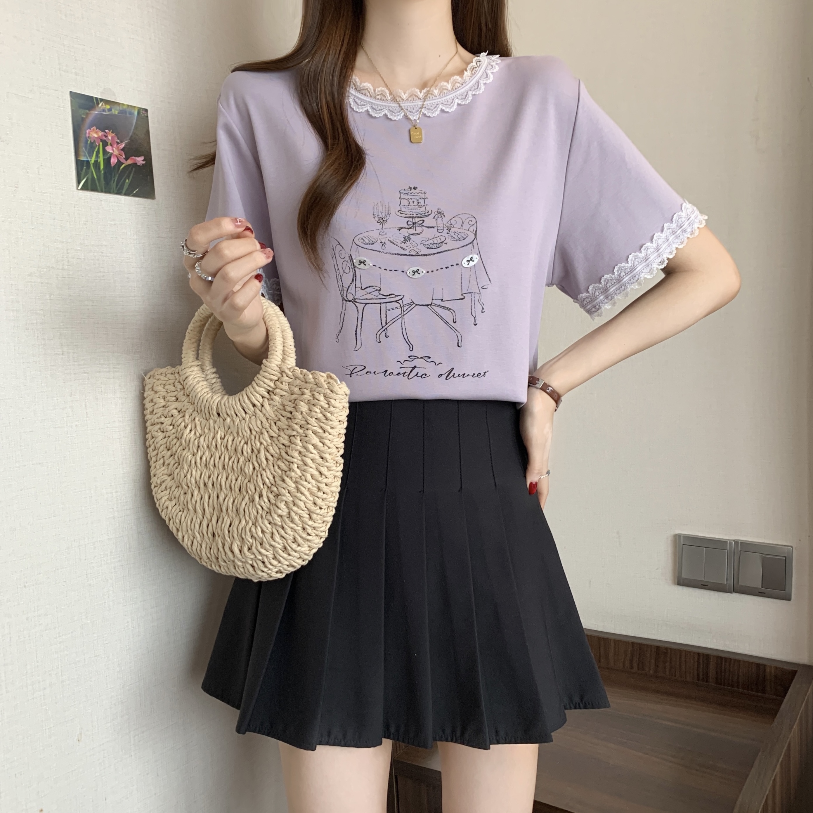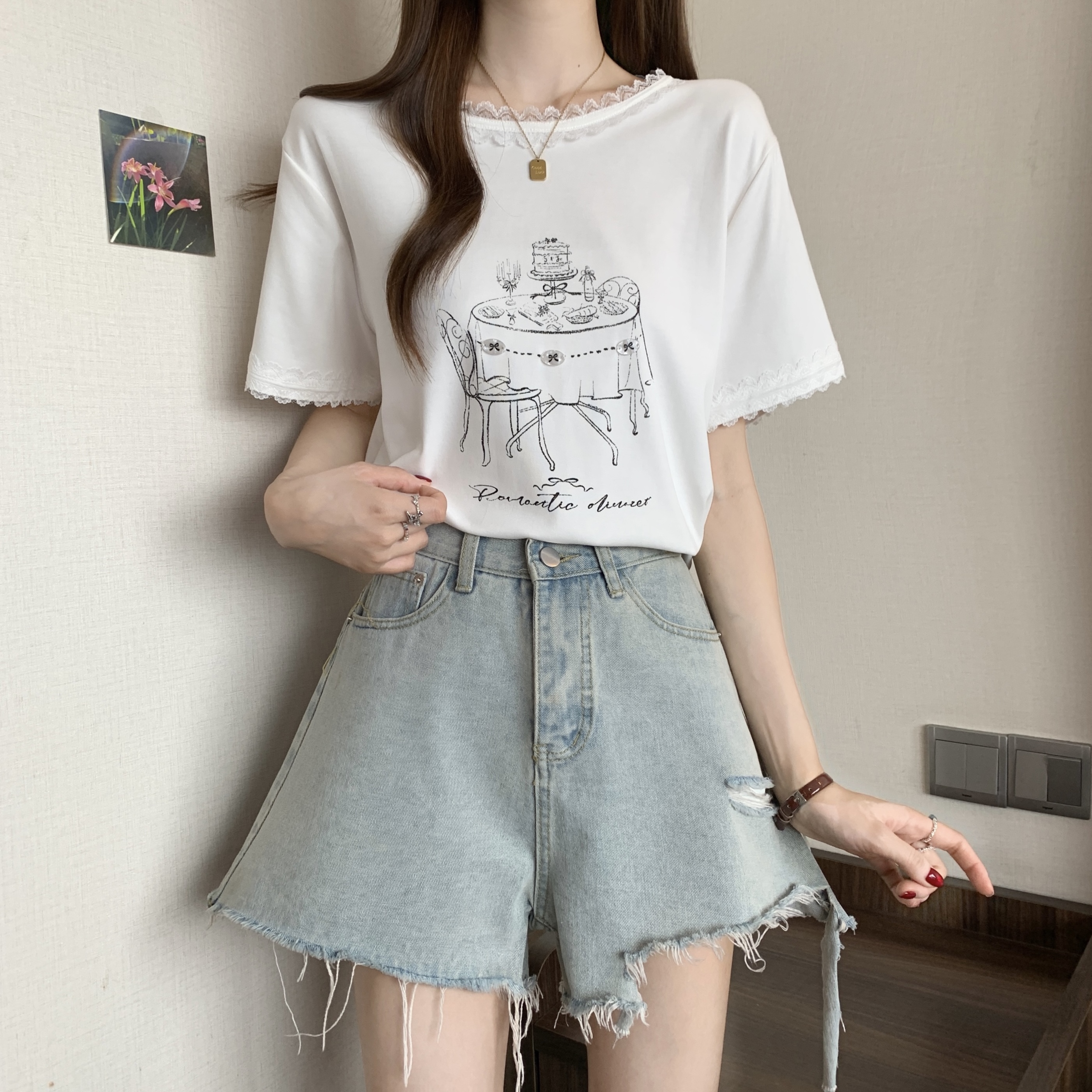 RY1367# 实拍大码~2026春夏季新款蕾丝边短袖T恤女百搭少女感甜美半袖上衣