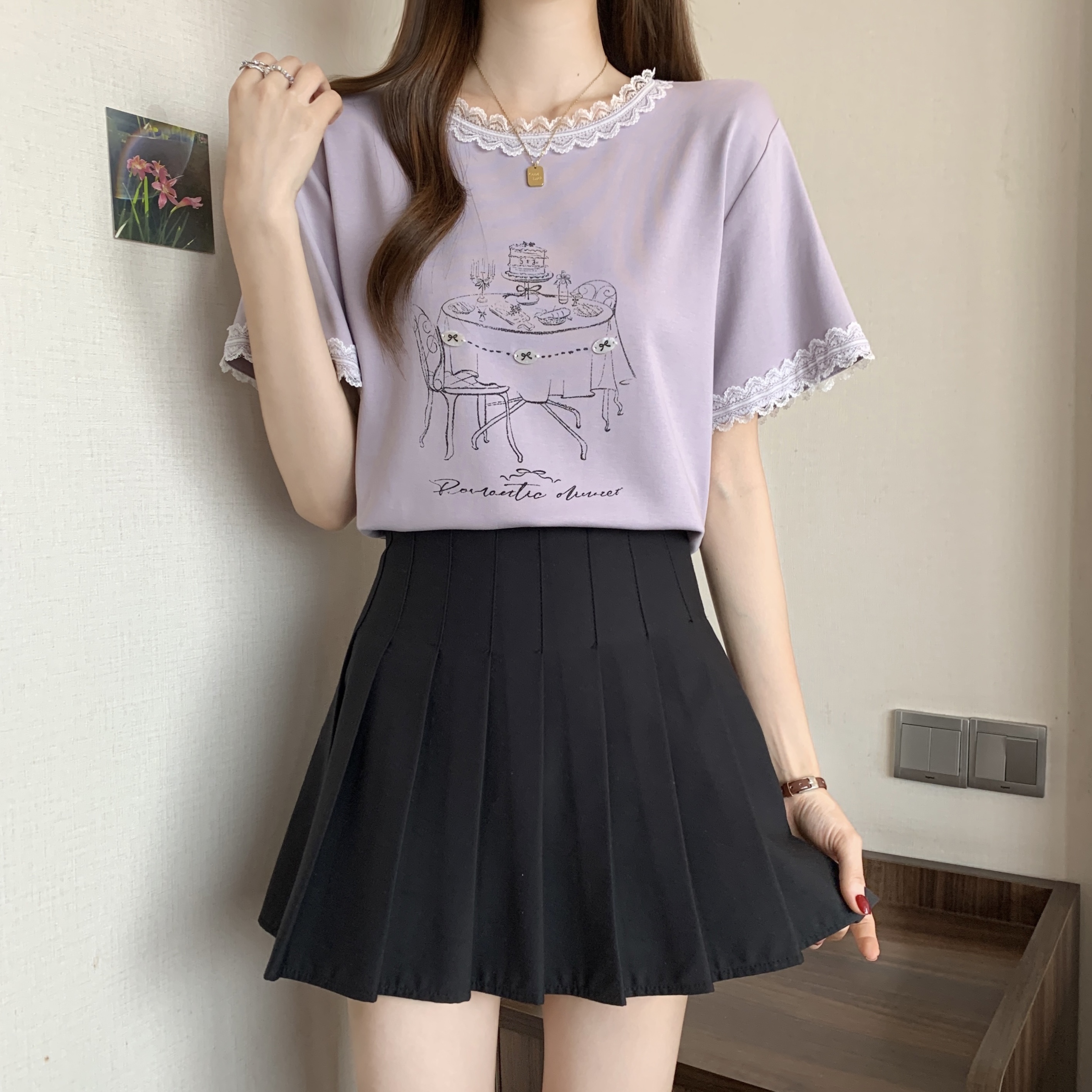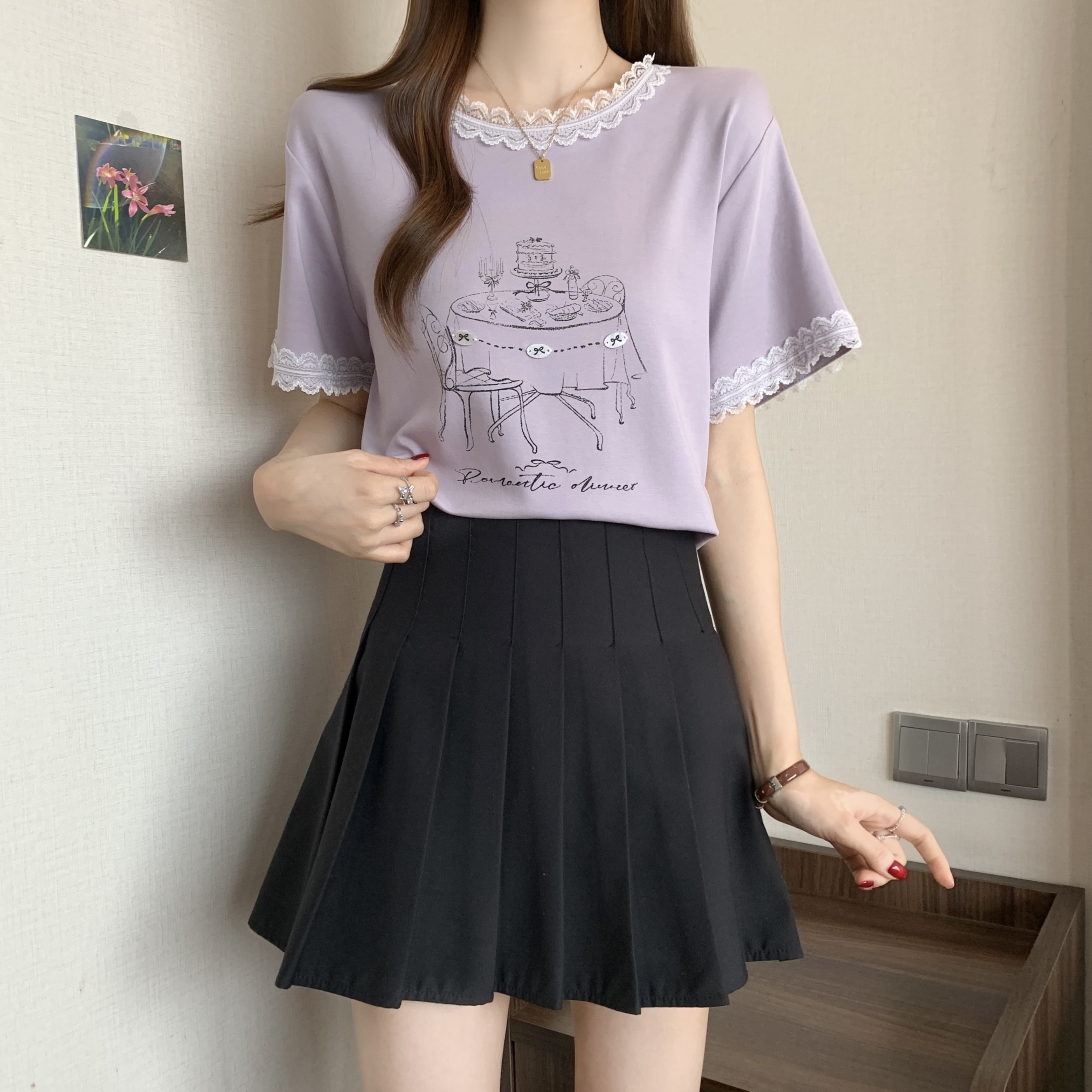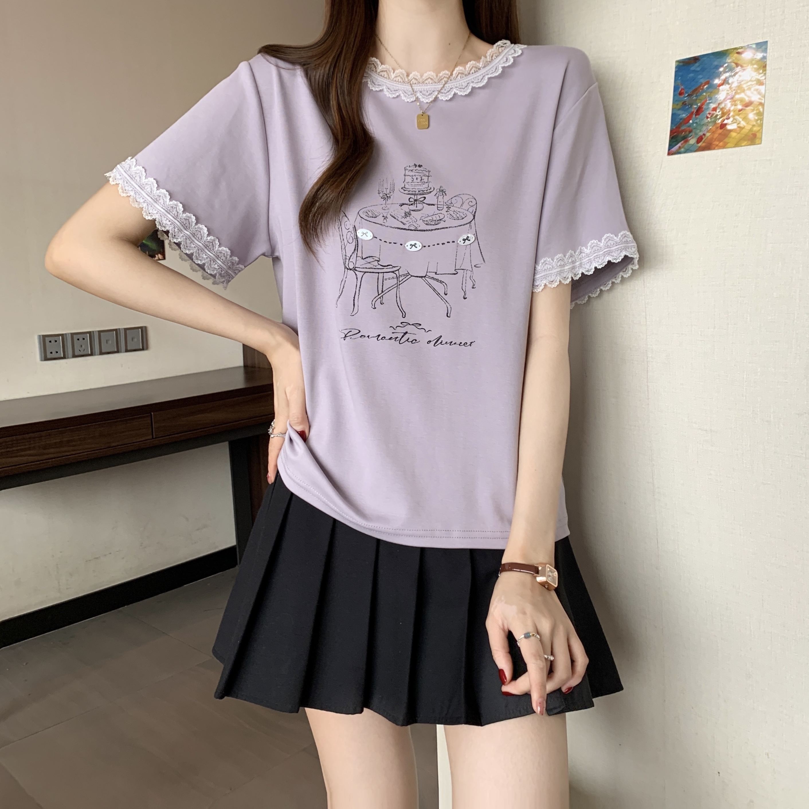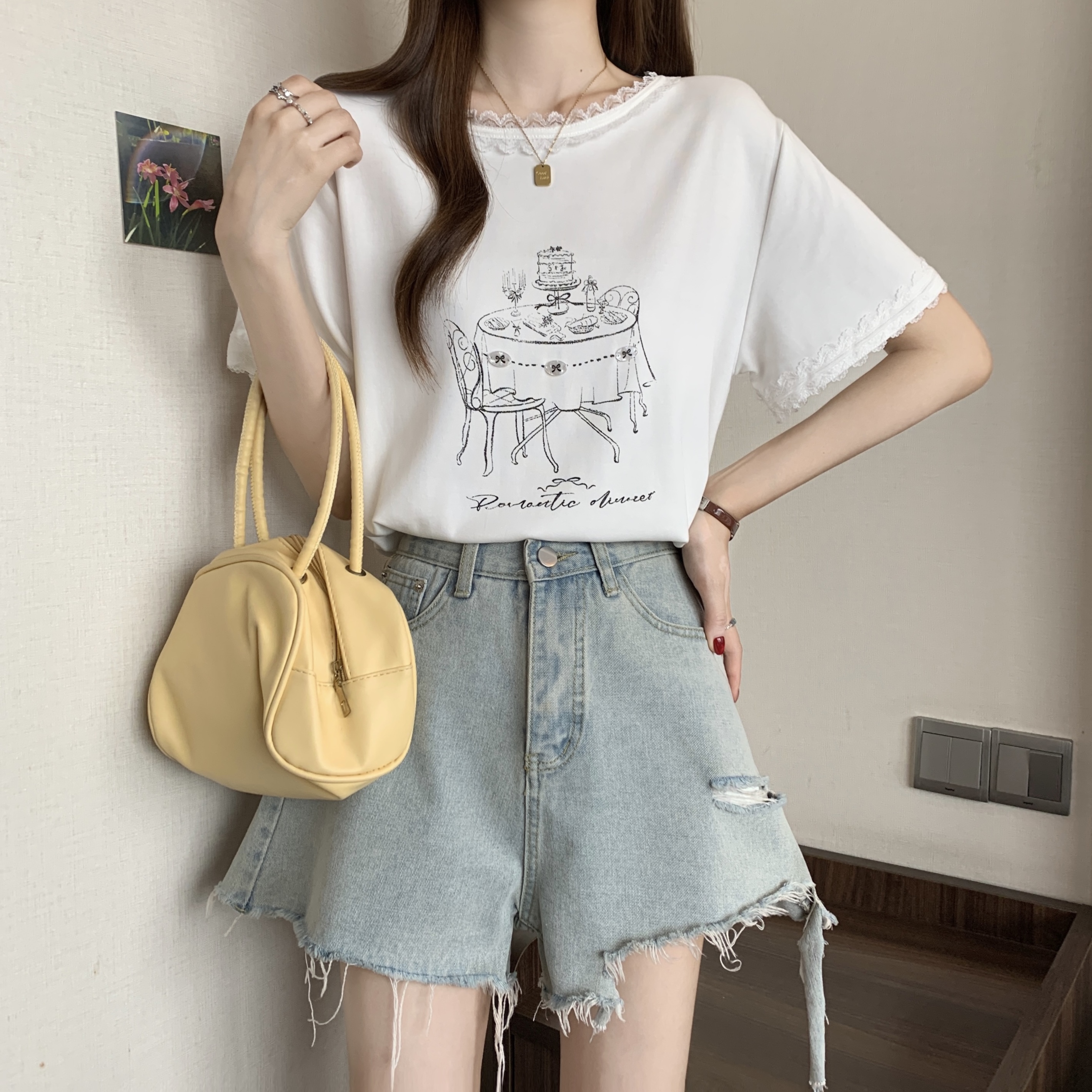 RY1367# 实拍大码~2026春夏季新款蕾丝边短袖T恤女百搭少女感甜美半袖上衣