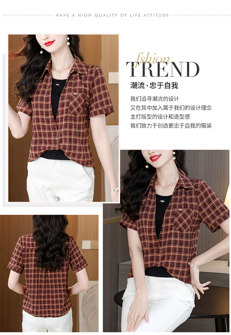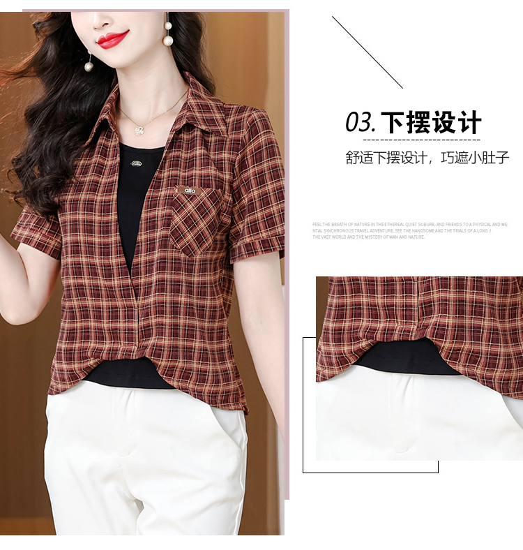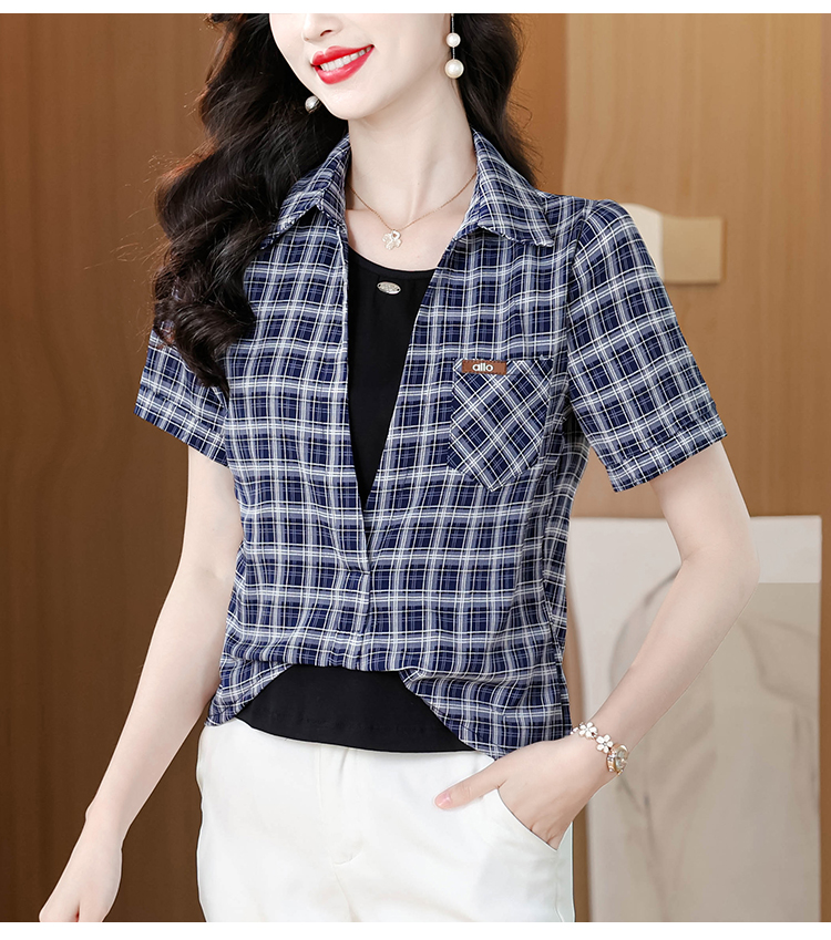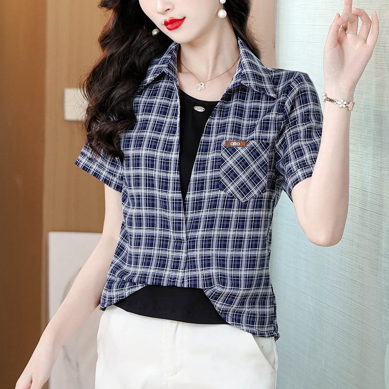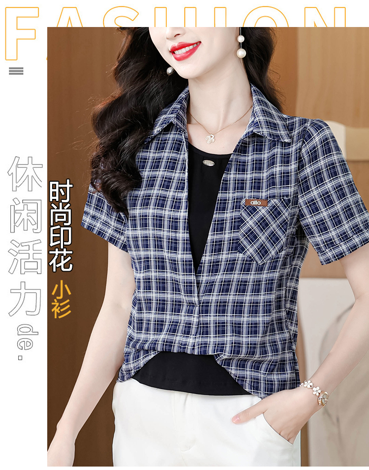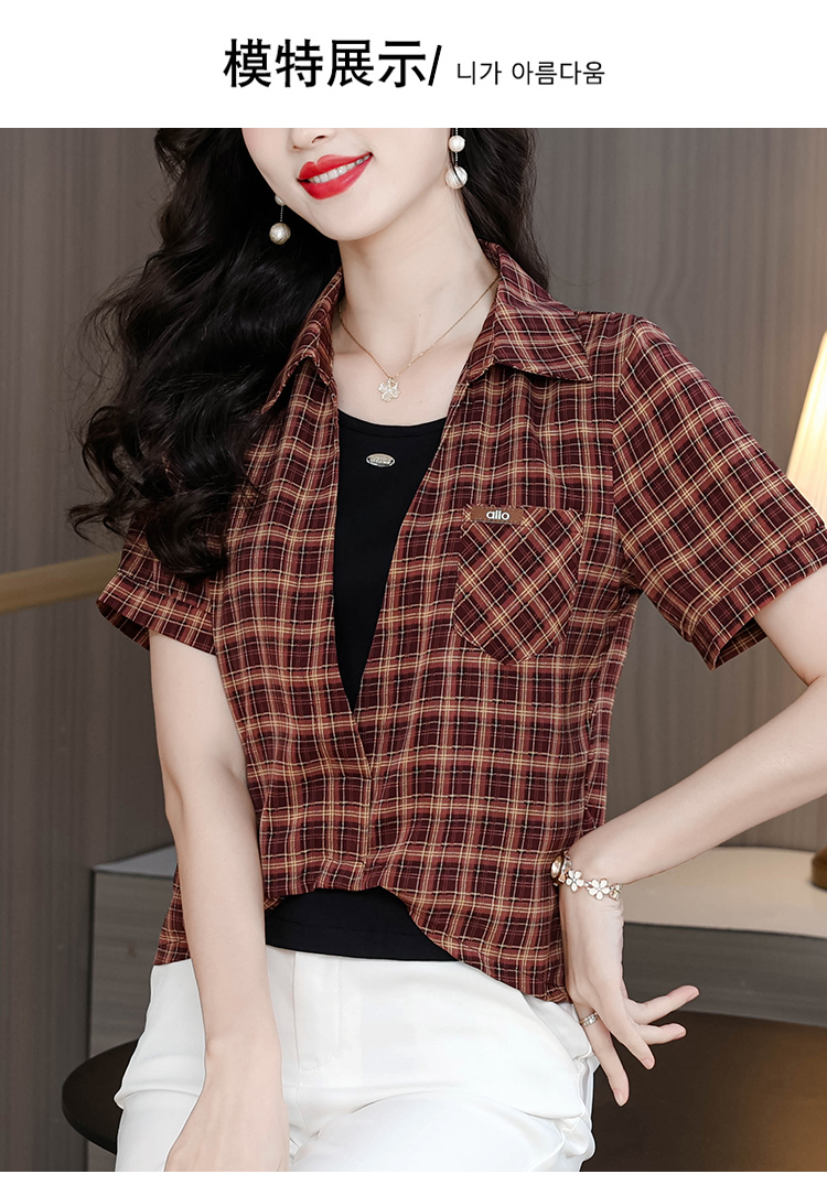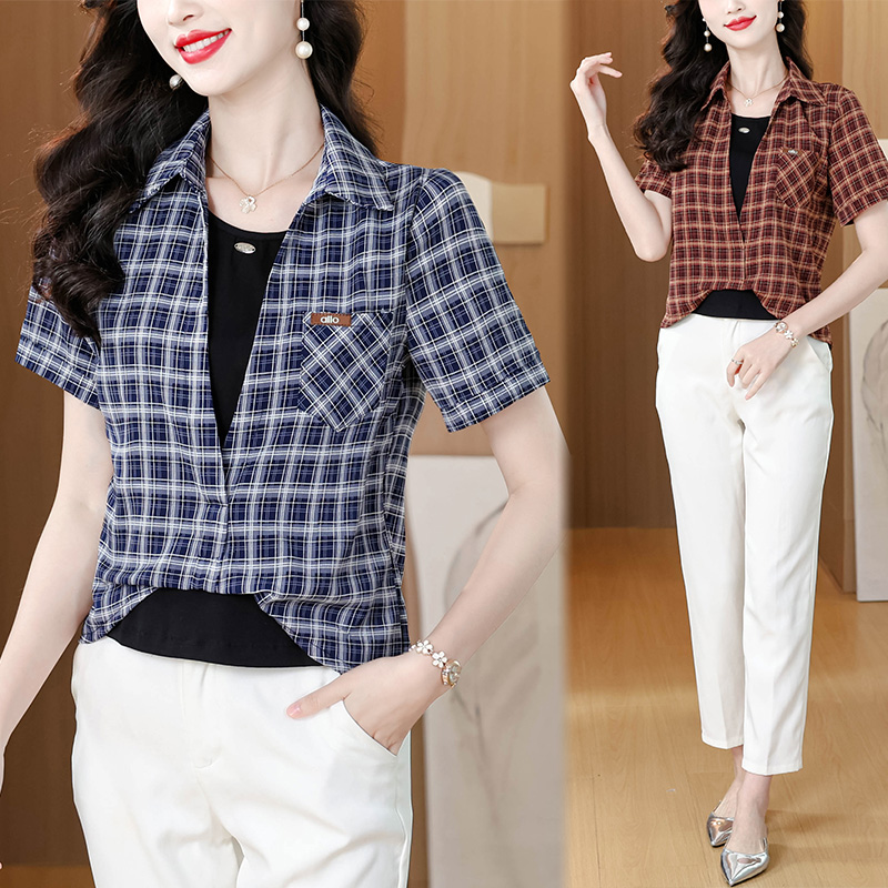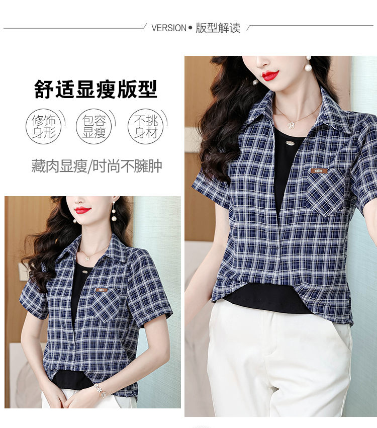 RY1403# 时尚衬衫女2026新款洋气显瘦减龄百搭格子拼接假两件短袖上衣