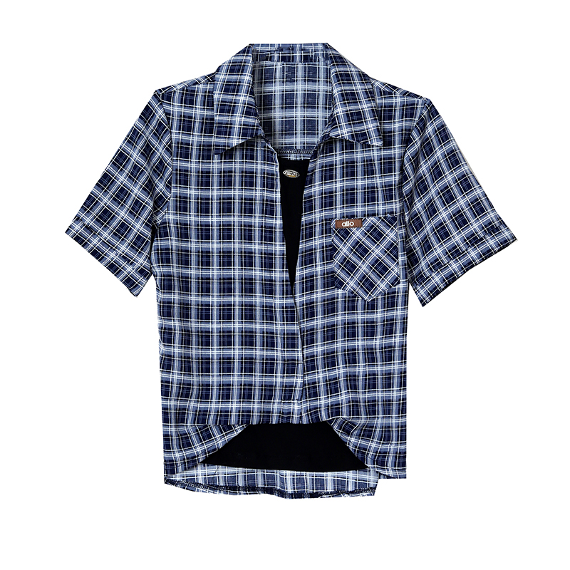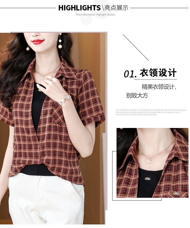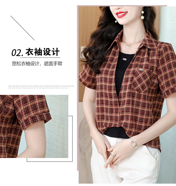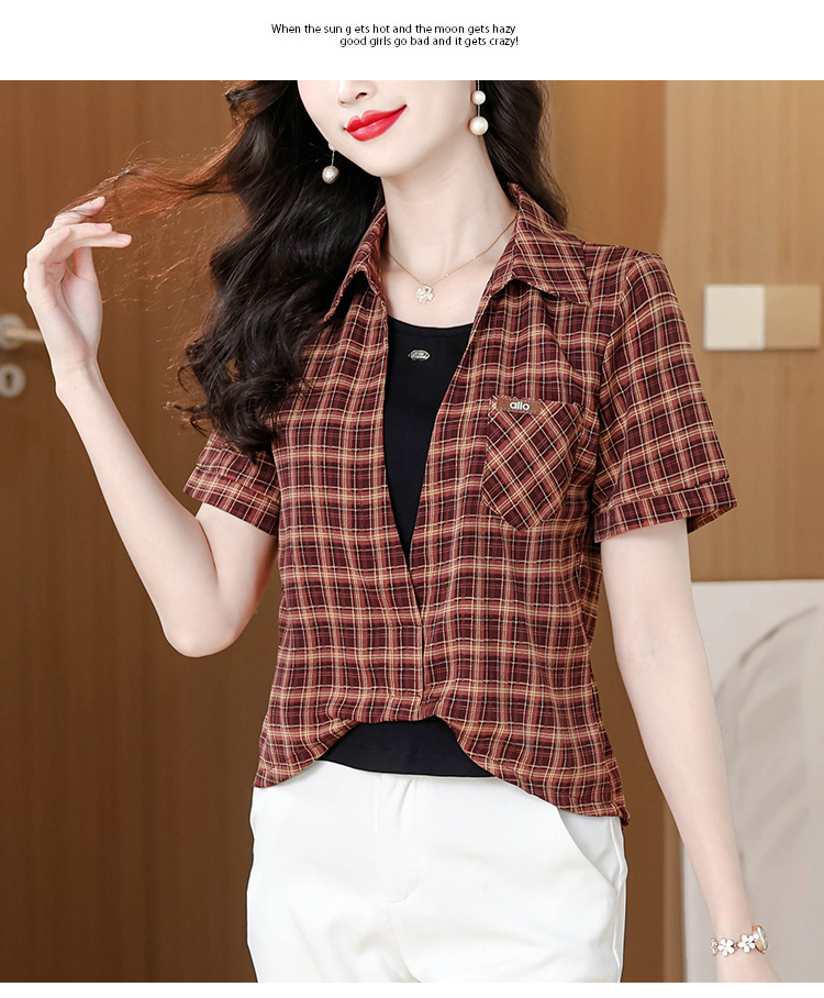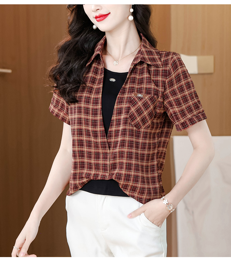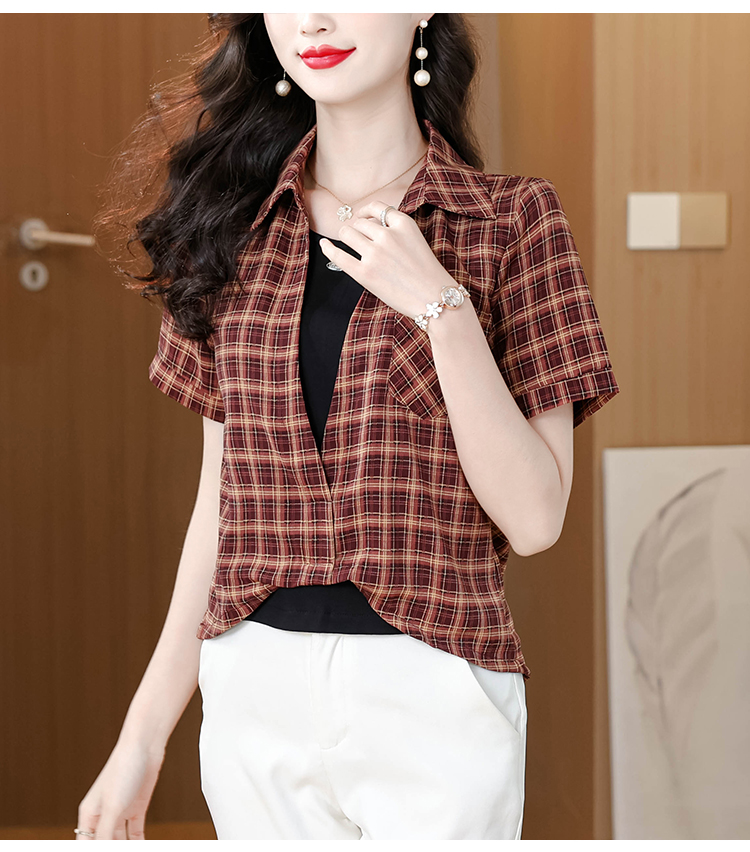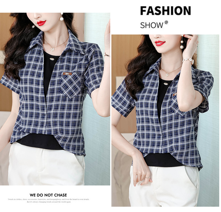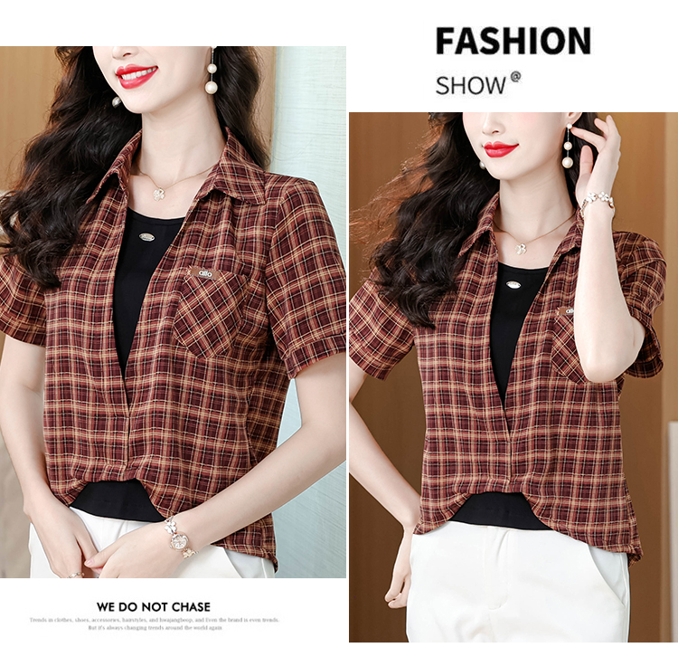 RY1403# 时尚衬衫女2026新款洋气显瘦减龄百搭格子拼接假两件短袖上衣