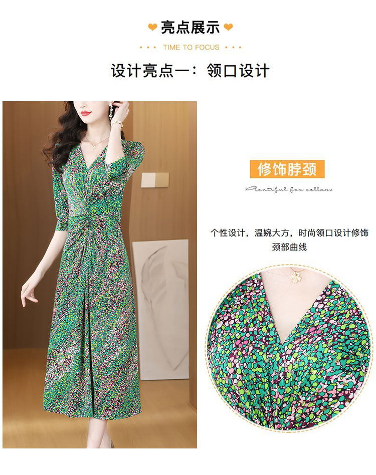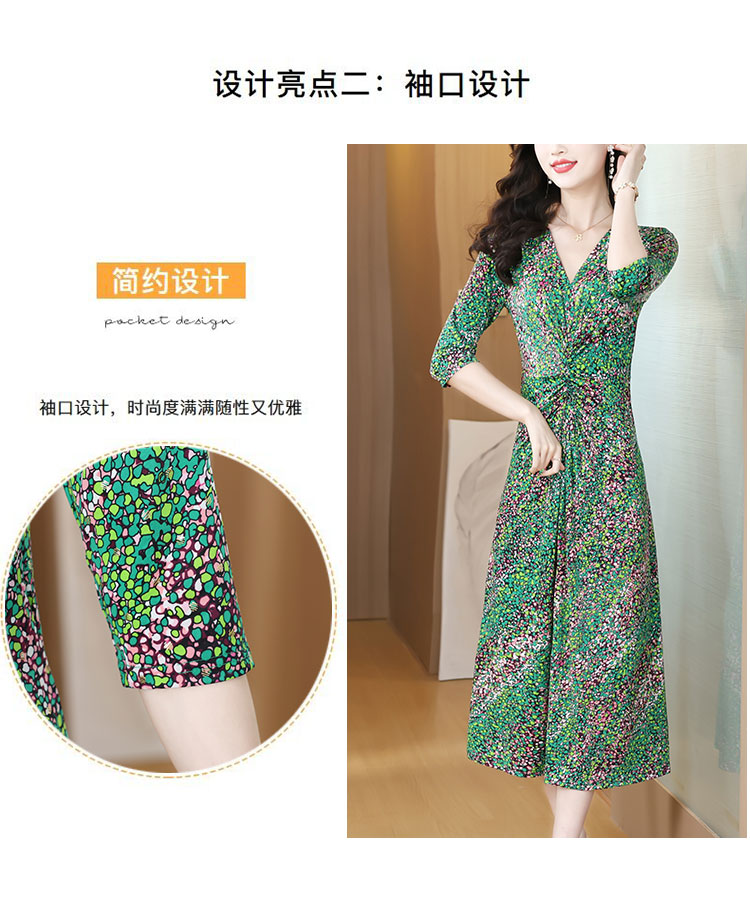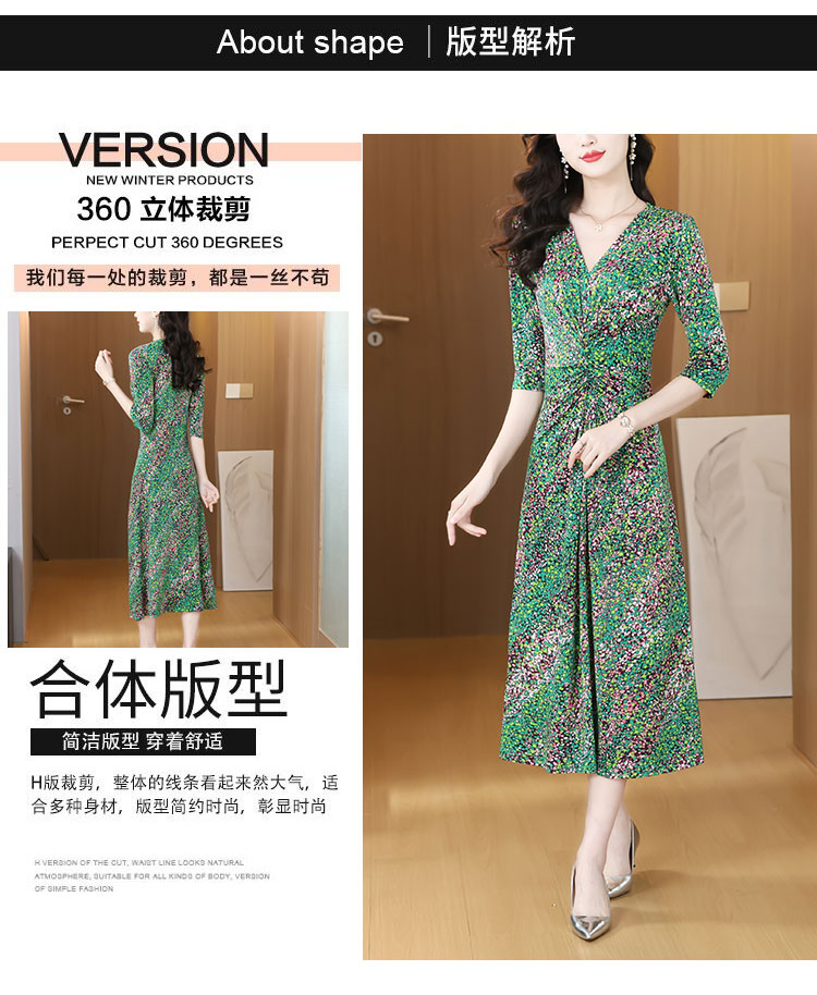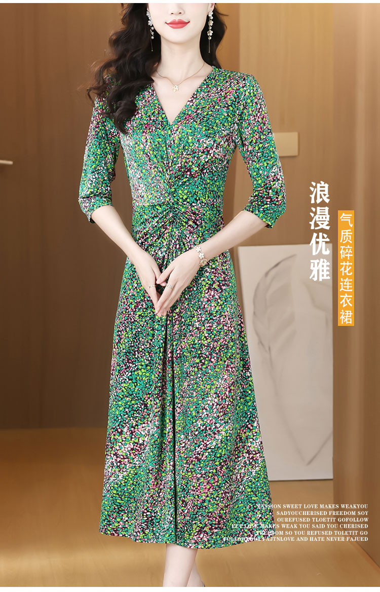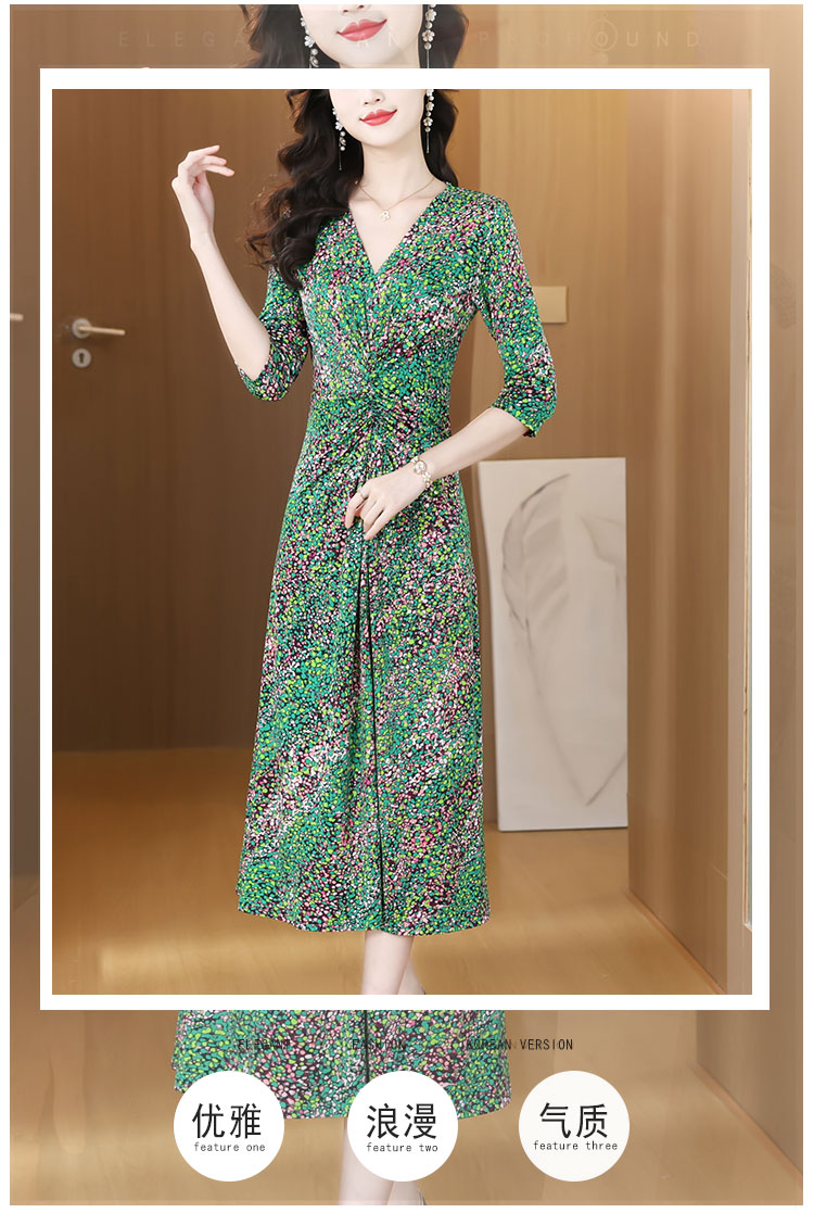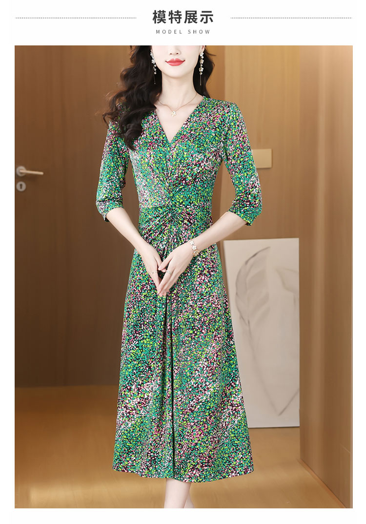 RY1406# 时尚V领妈妈大码七分袖春上新高级显瘦连衣裙收腰女
