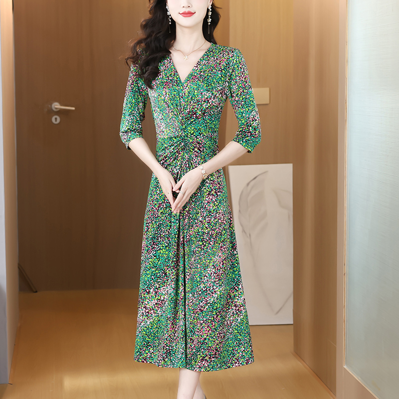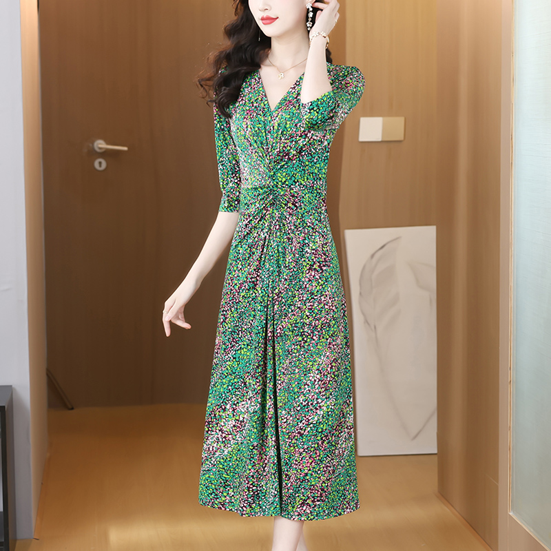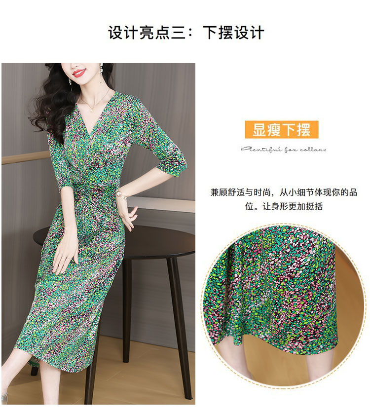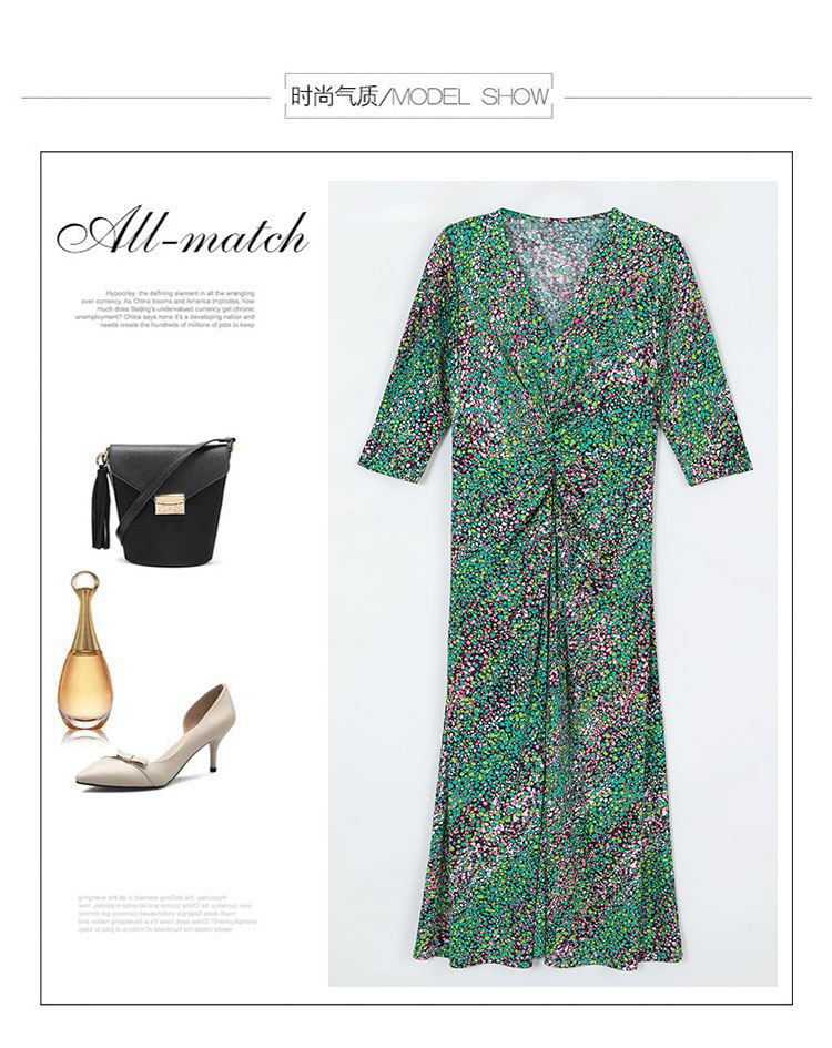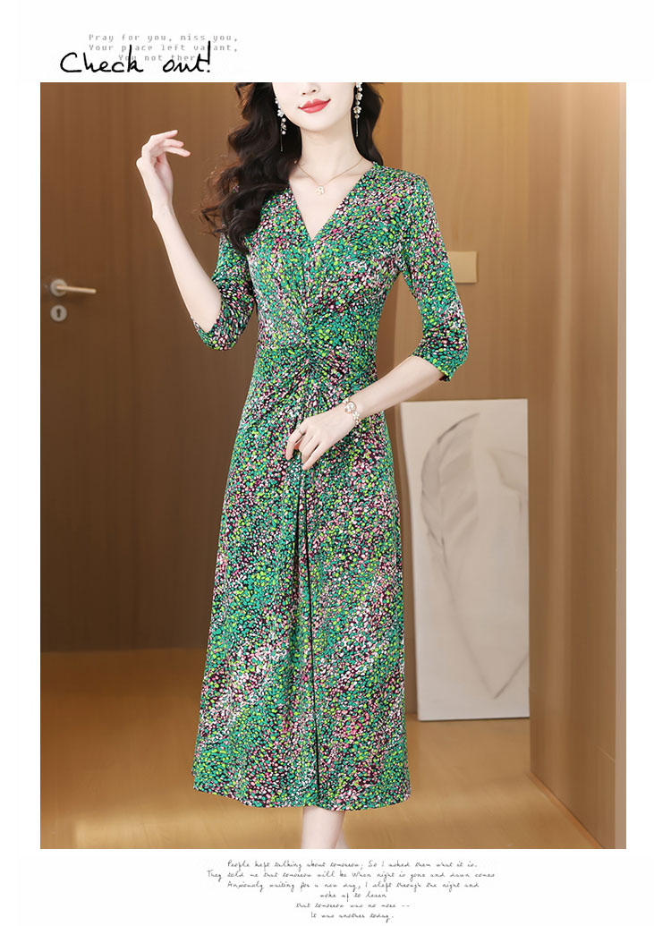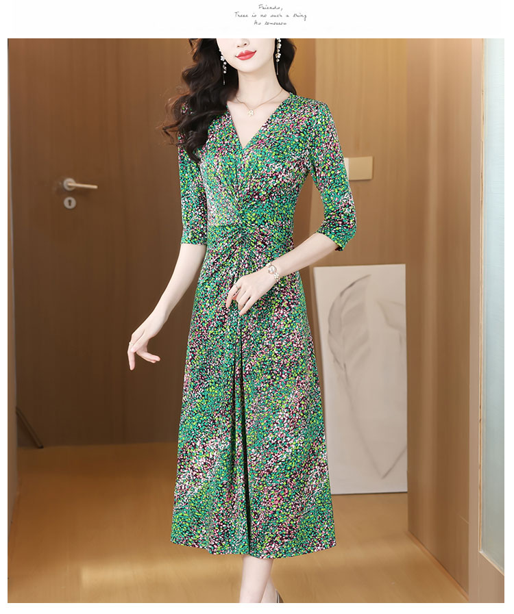 RY1406# 时尚V领妈妈大码七分袖春上新高级显瘦连衣裙收腰女