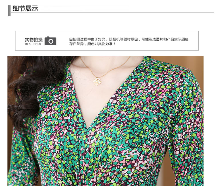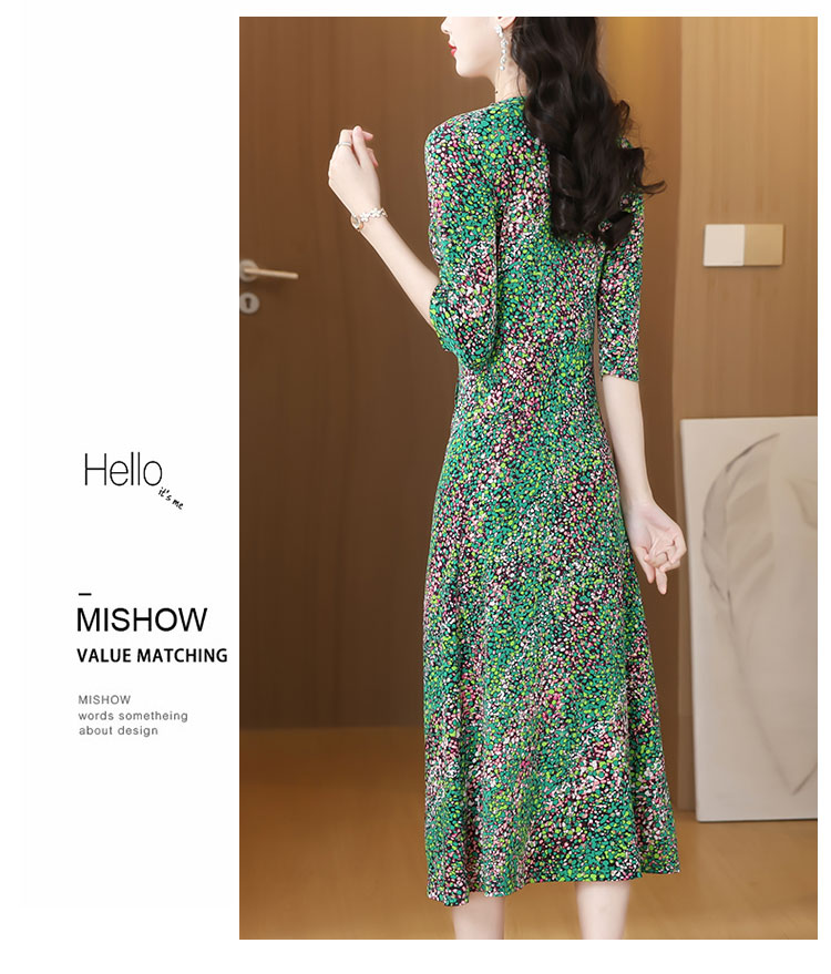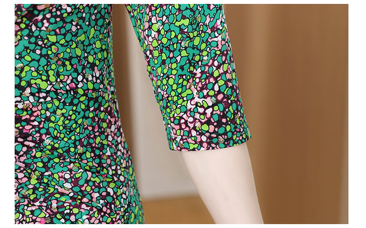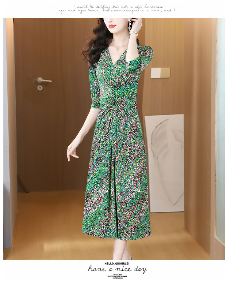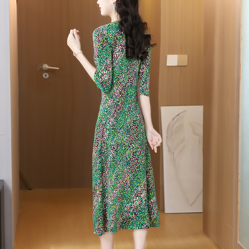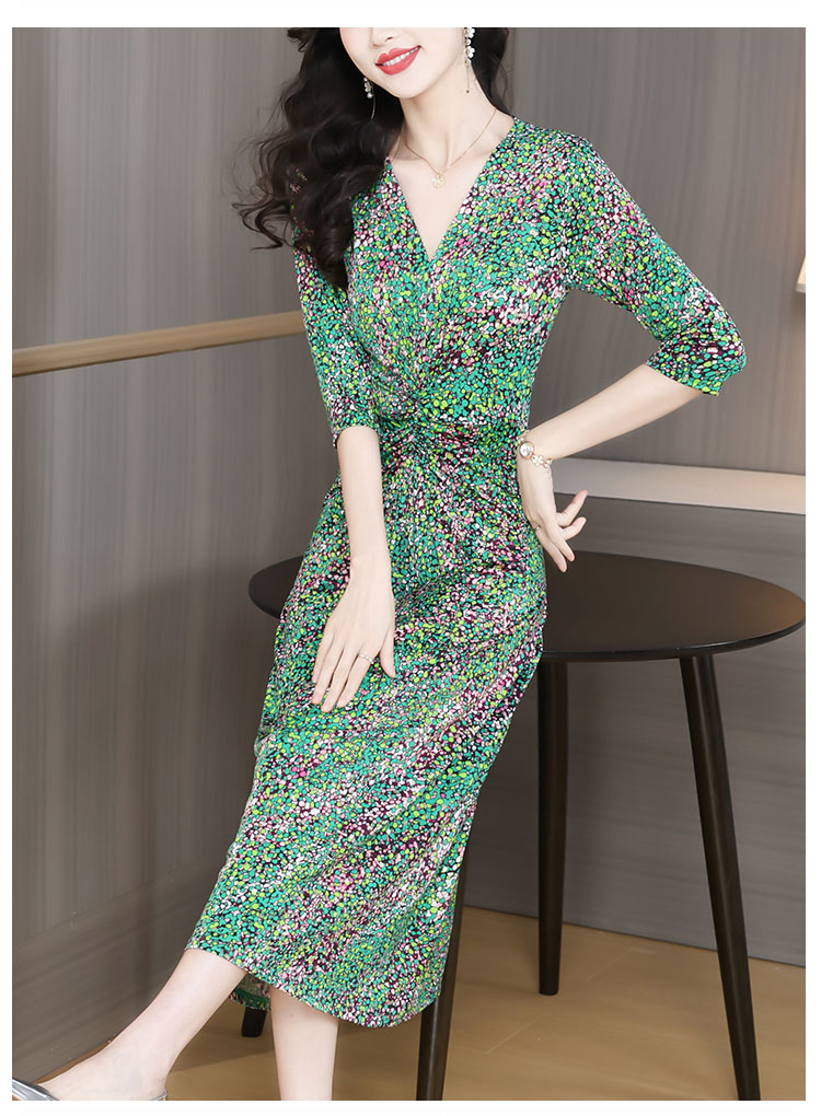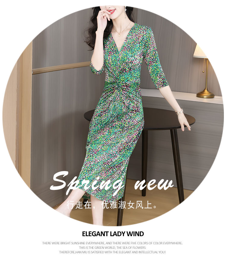 RY1406# 时尚V领妈妈大码七分袖春上新高级显瘦连衣裙收腰女