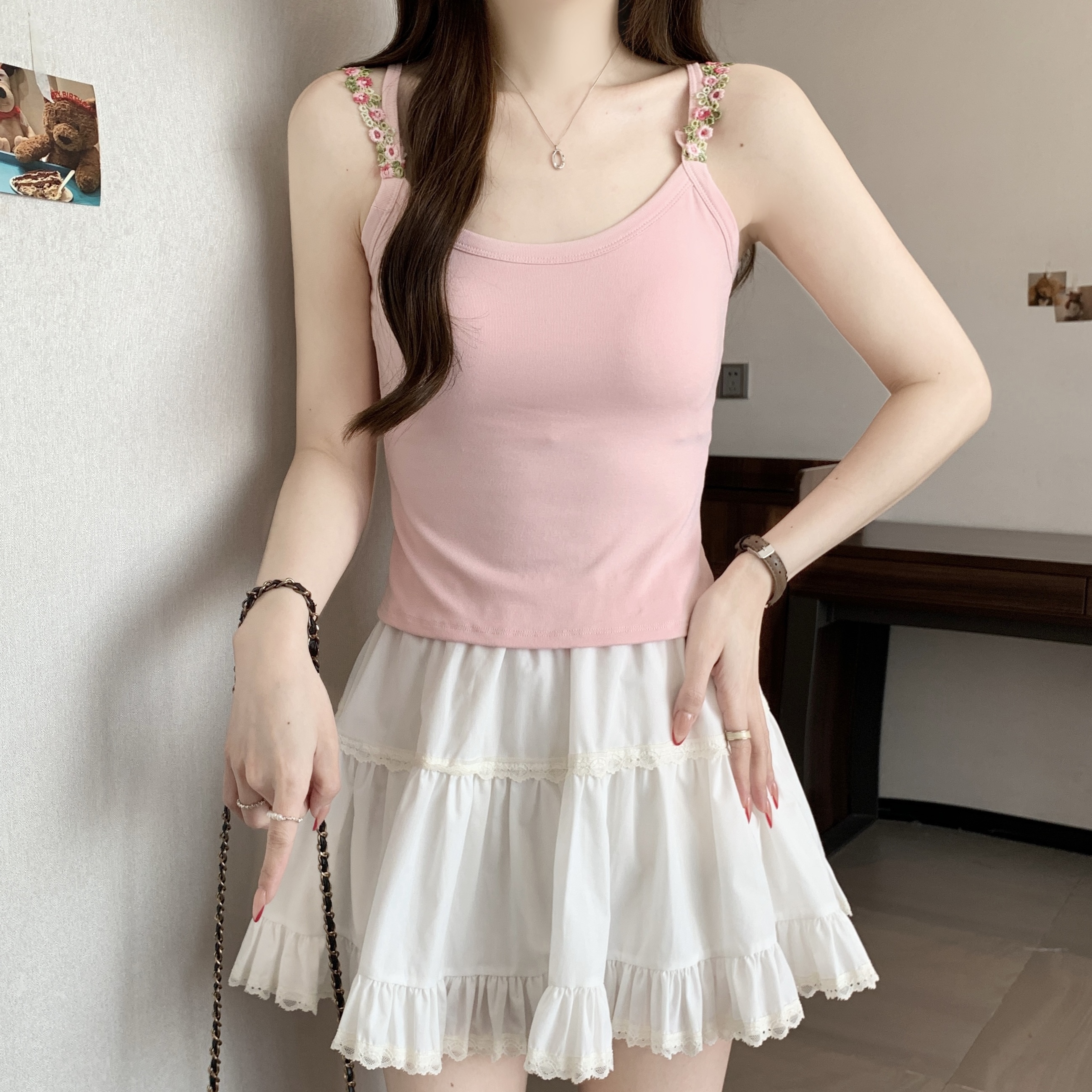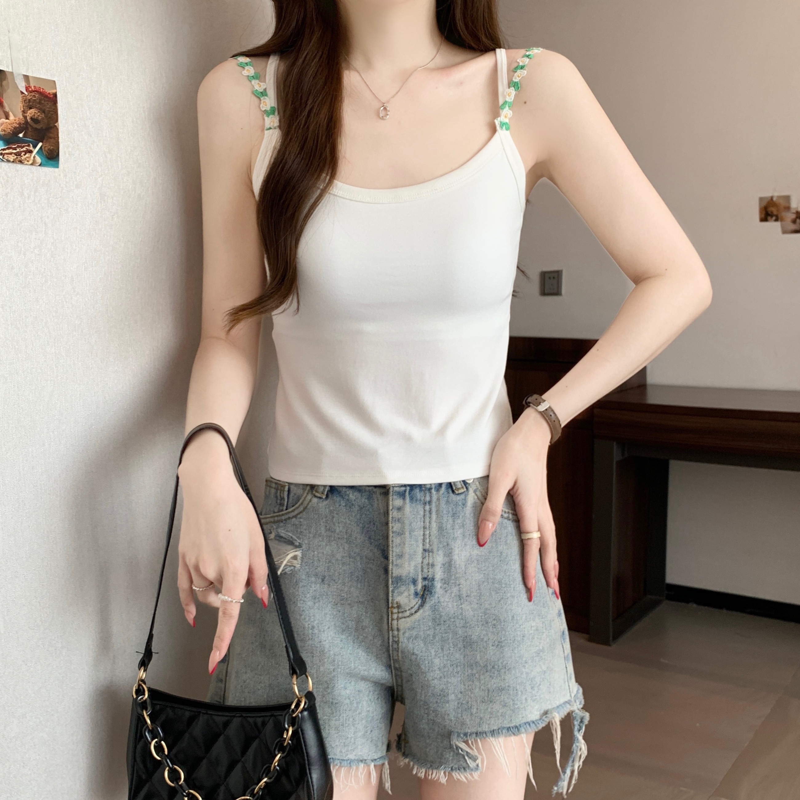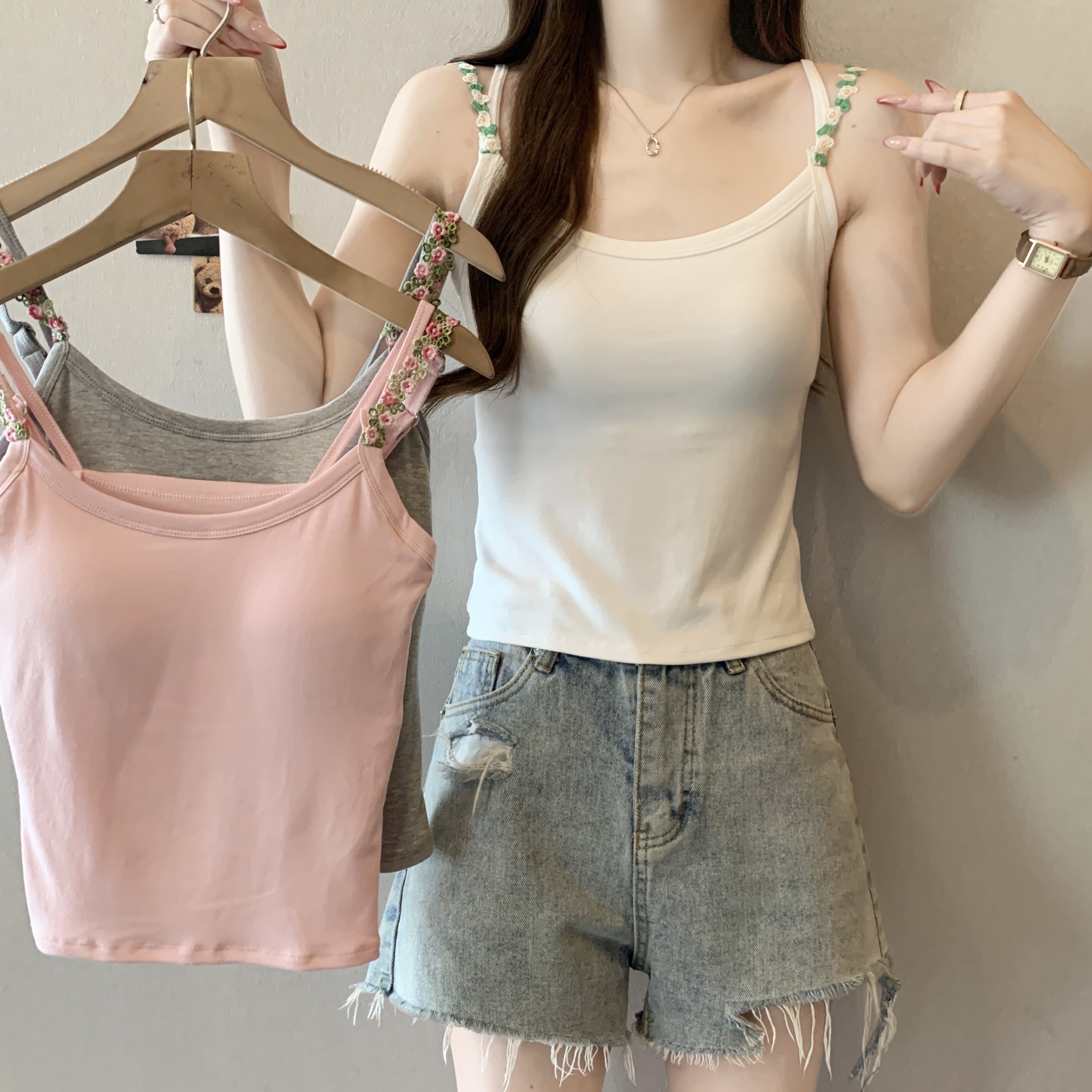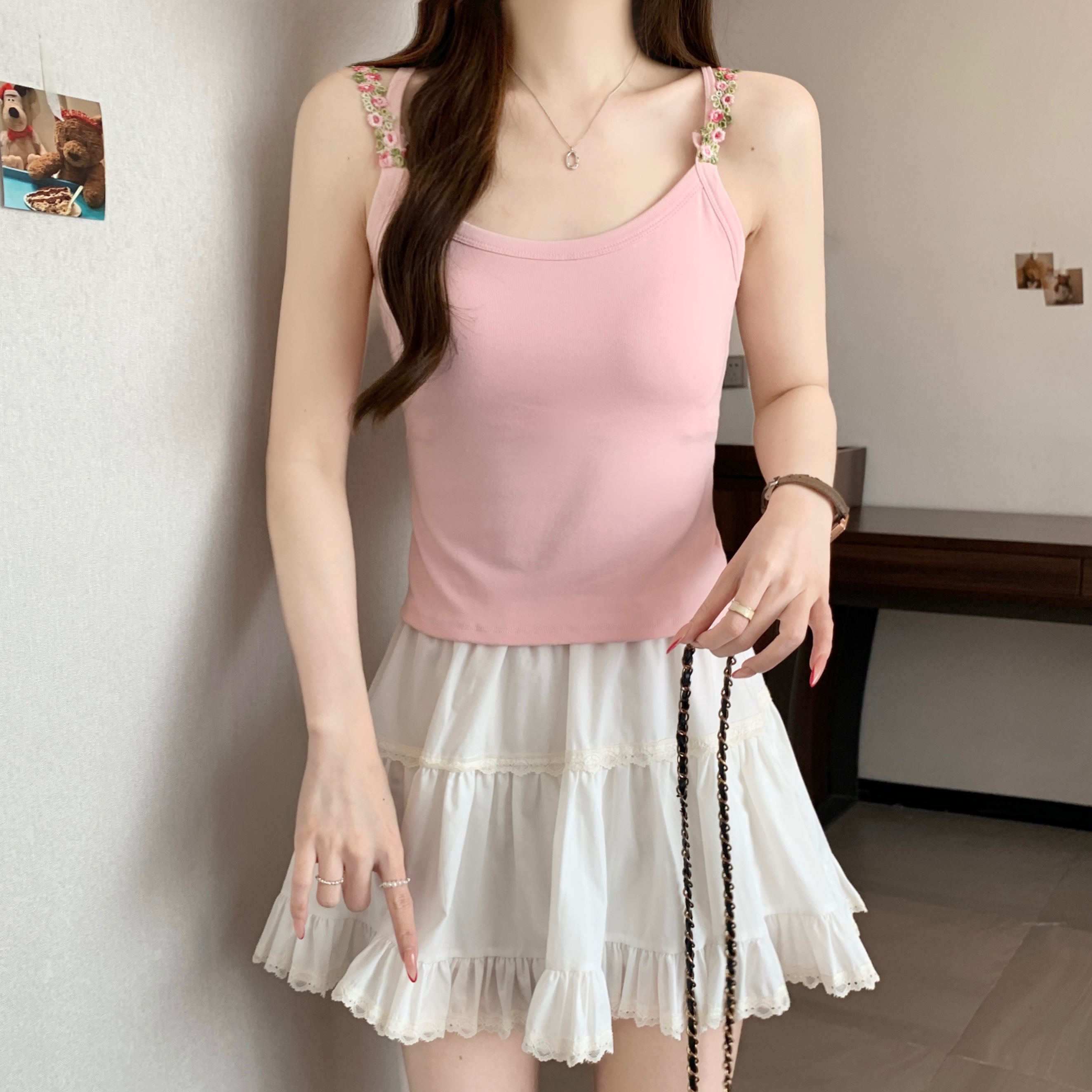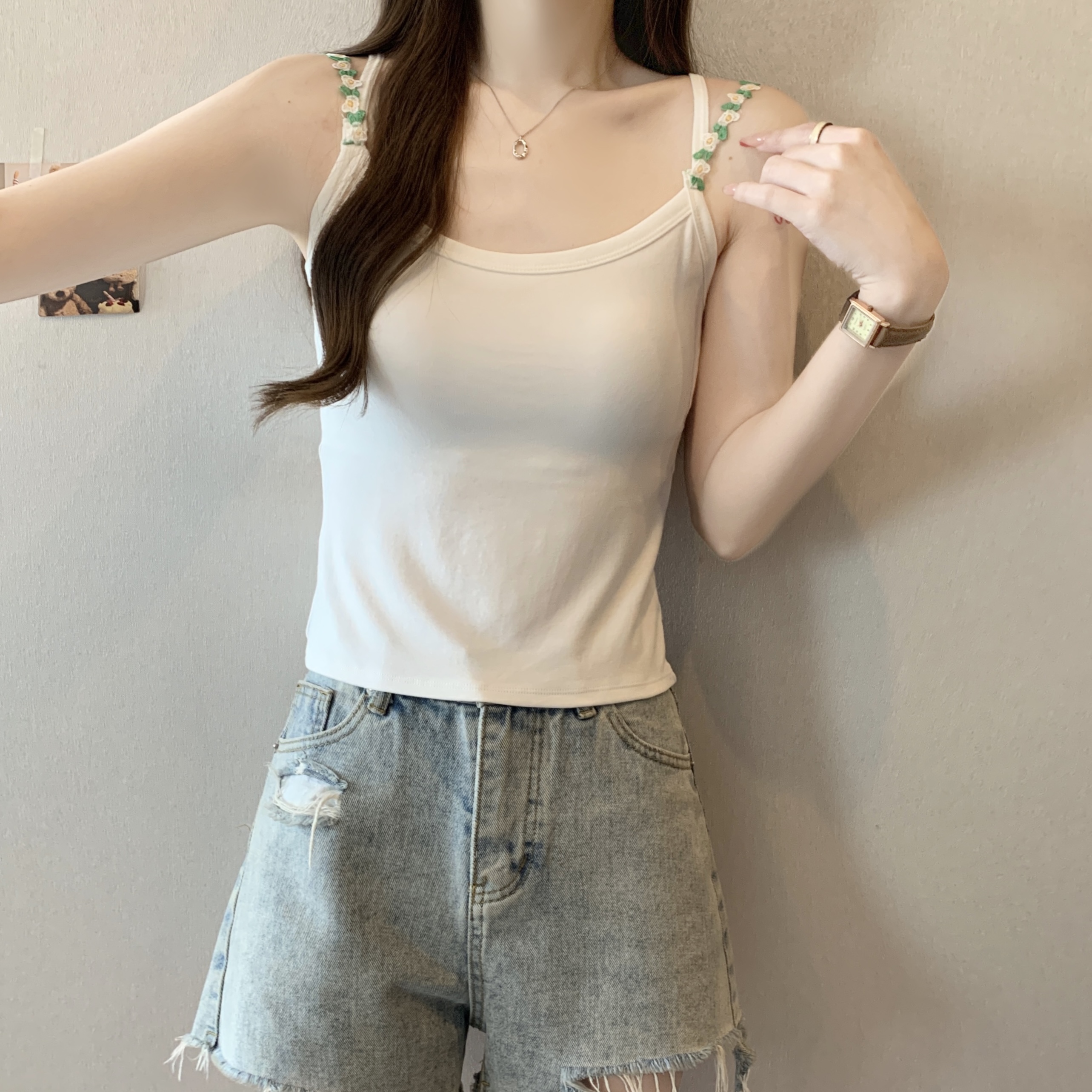 RY1409# 大码胖mm夏季新款纯欲花朵小吊带背心外穿美背带胸垫文胸一体上衣