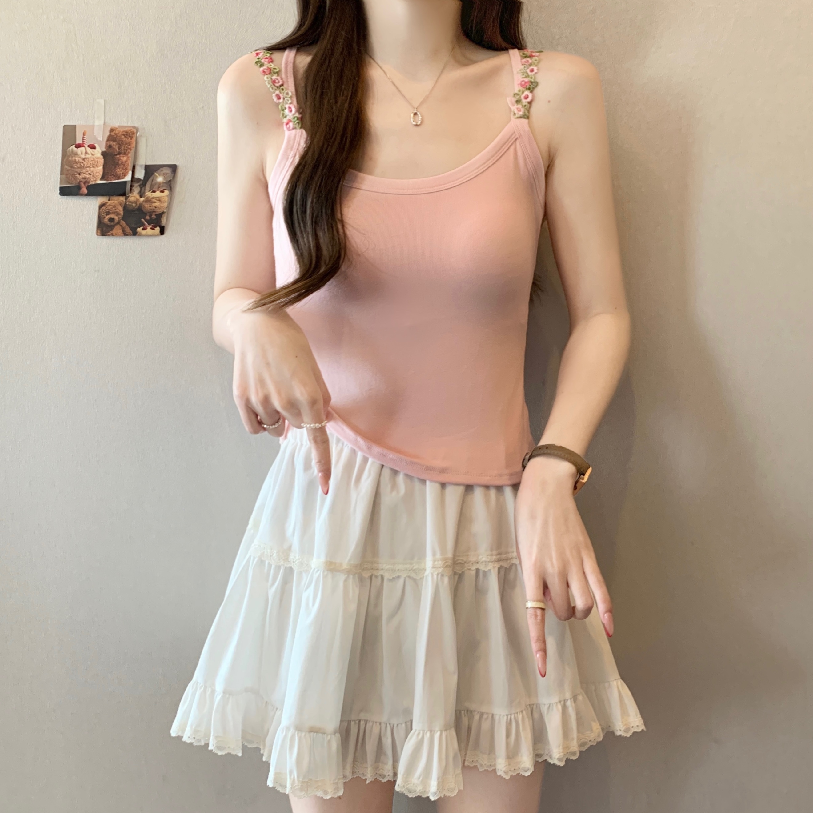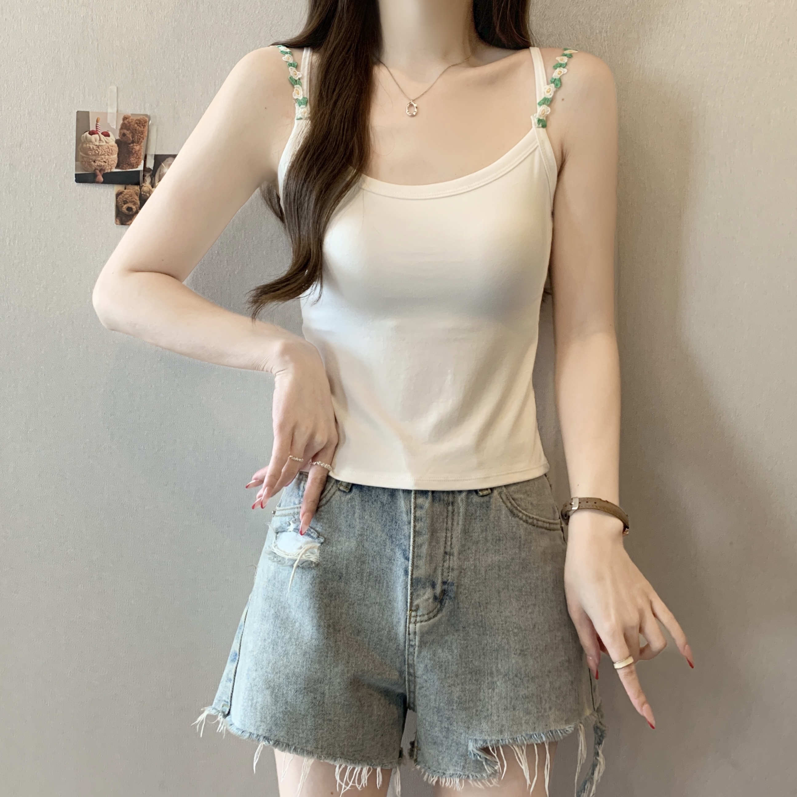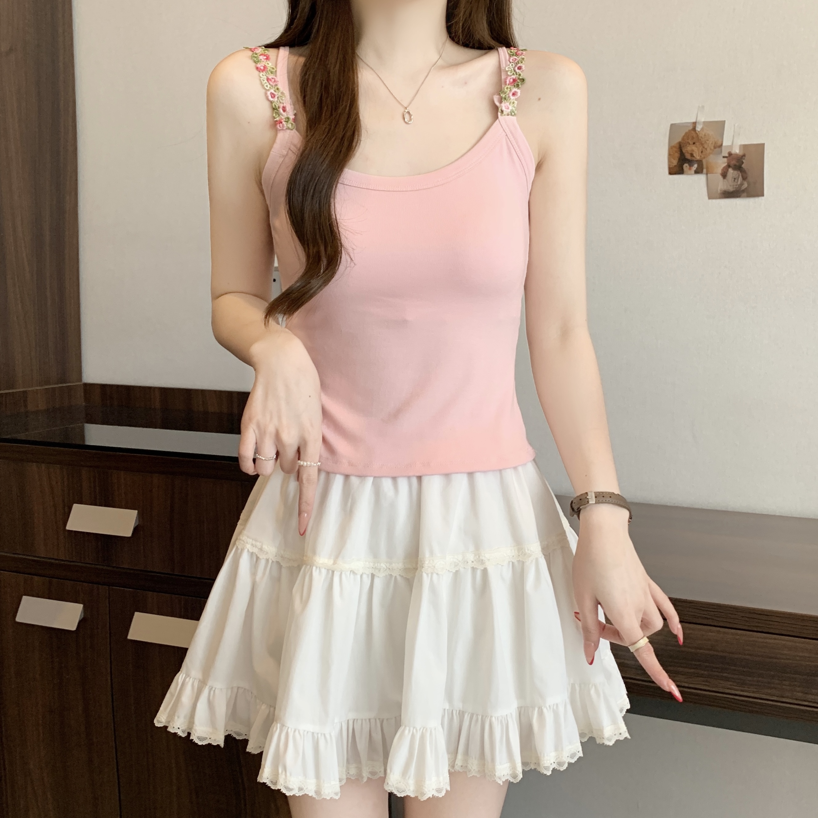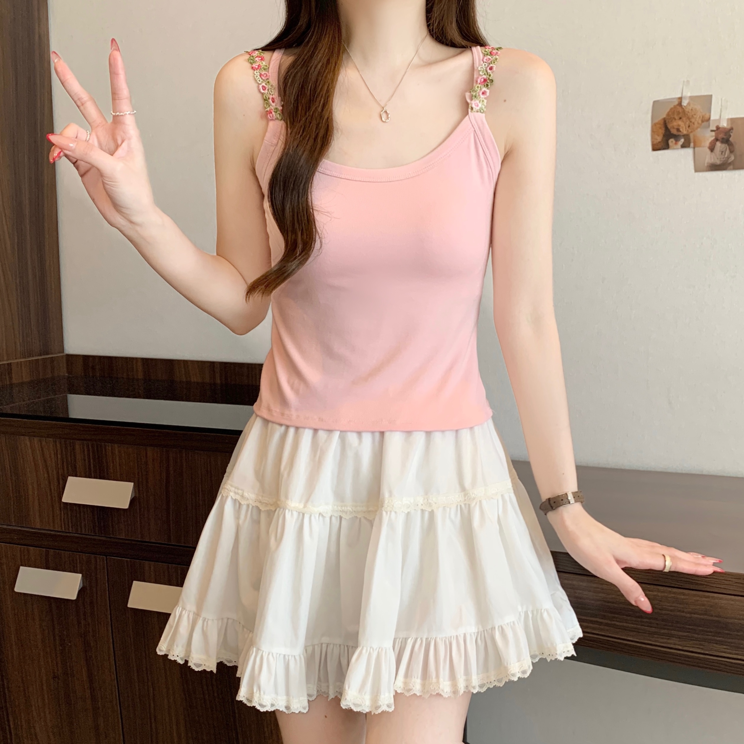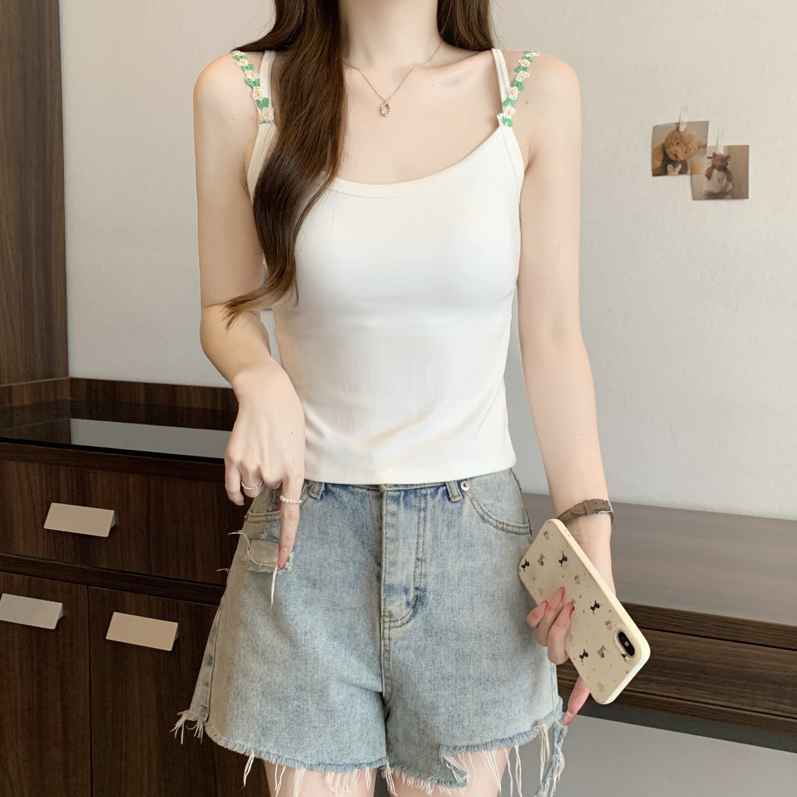 RY1409# 大码胖mm夏季新款纯欲花朵小吊带背心外穿美背带胸垫文胸一体上衣