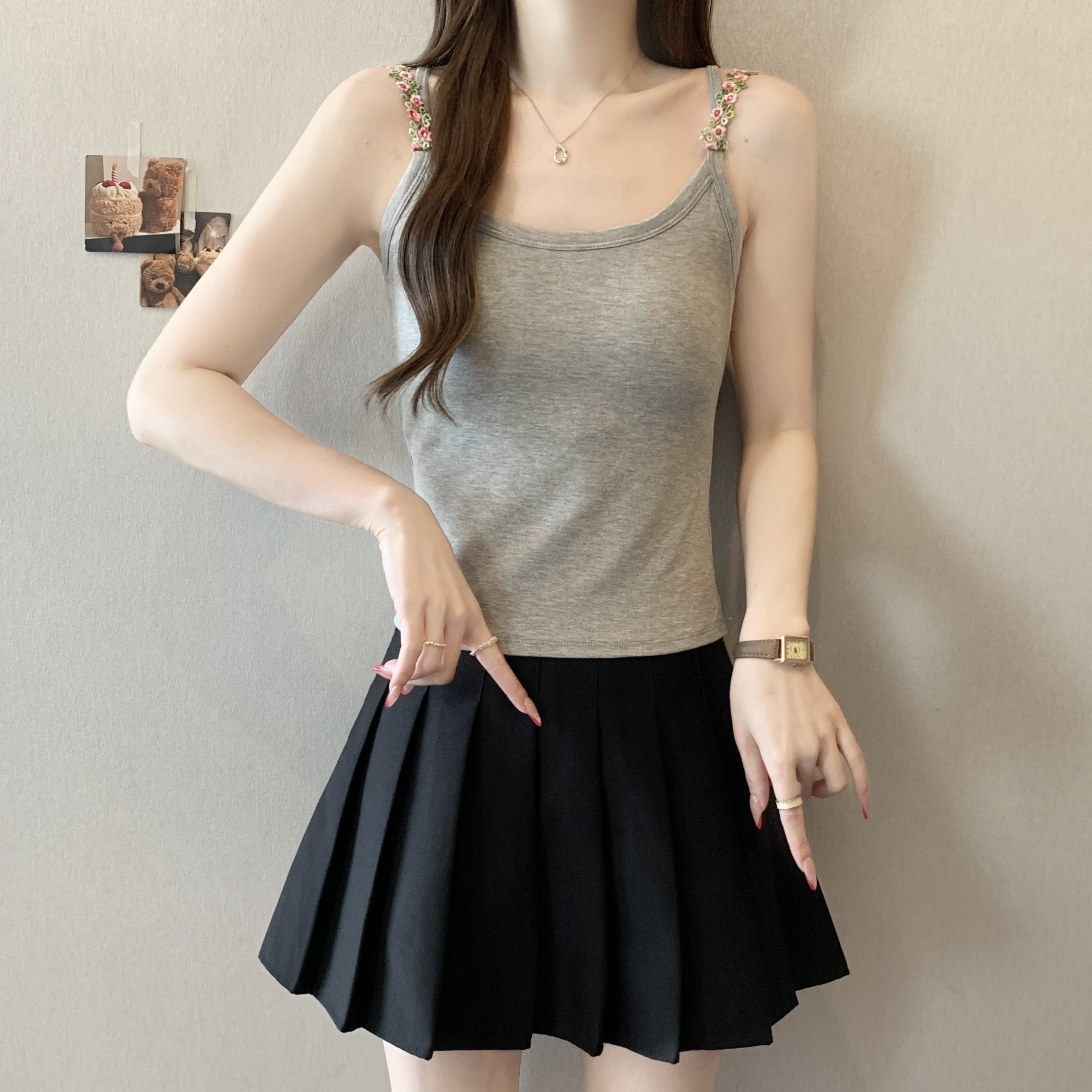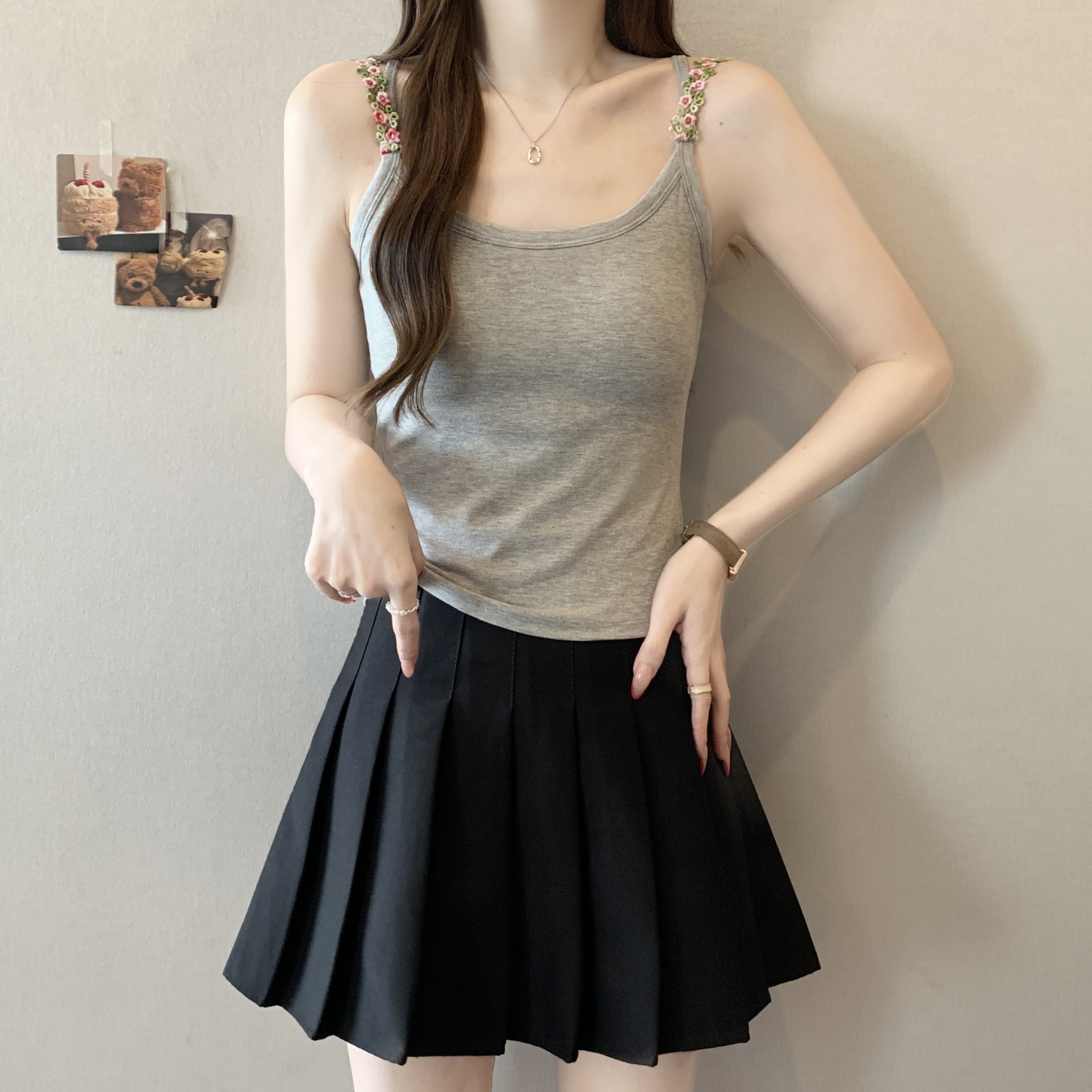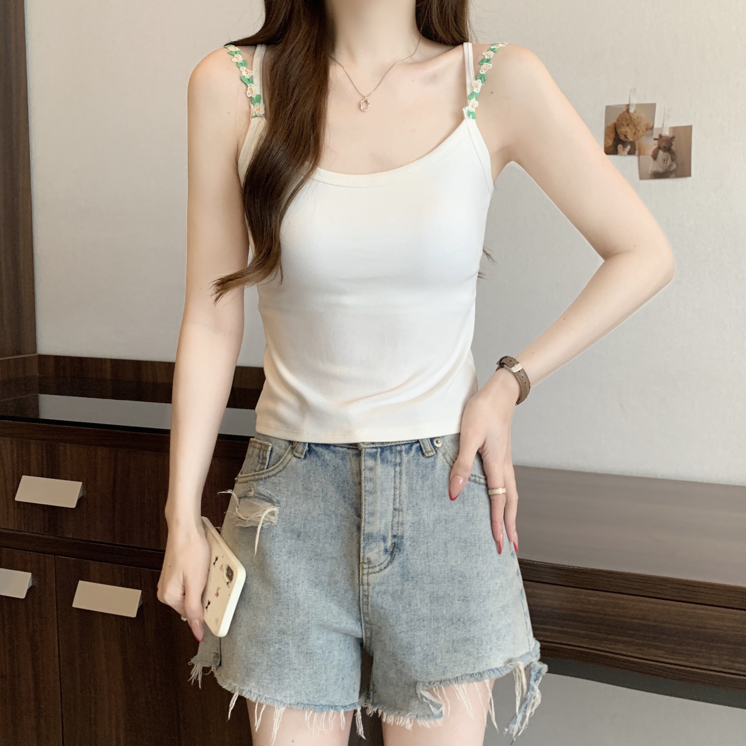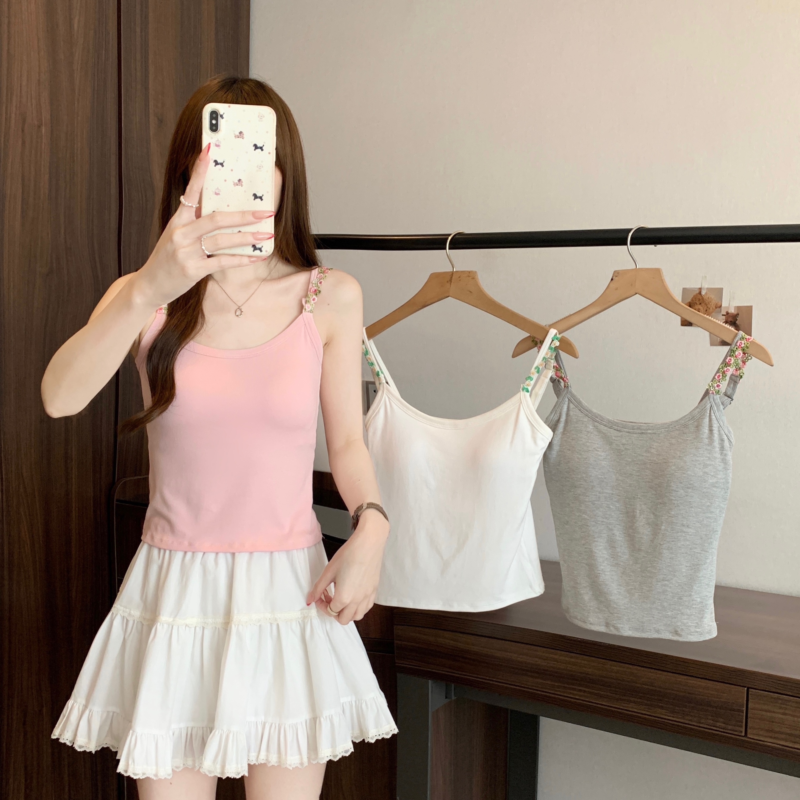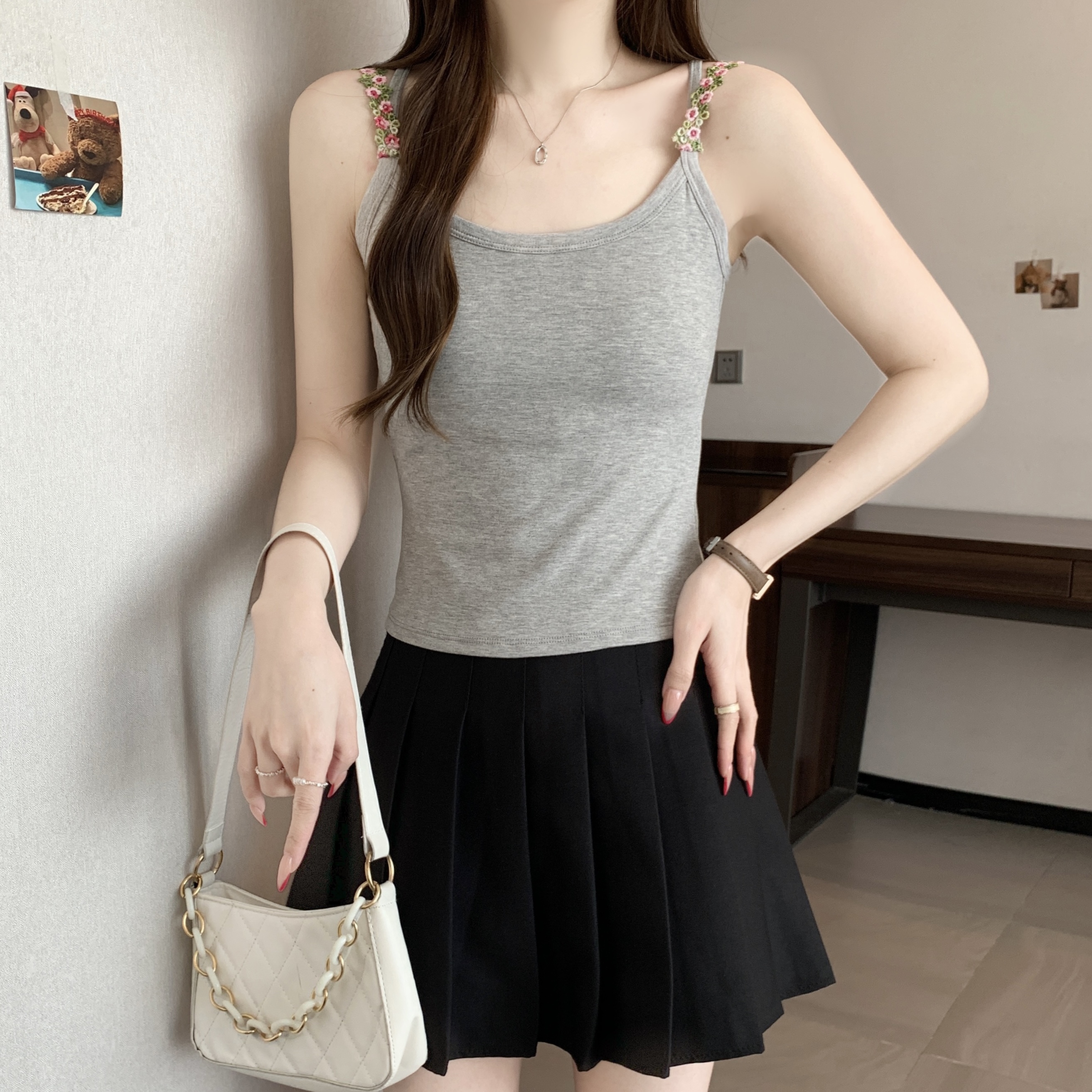 RY1409# 大码胖mm夏季新款纯欲花朵小吊带背心外穿美背带胸垫文胸一体上衣