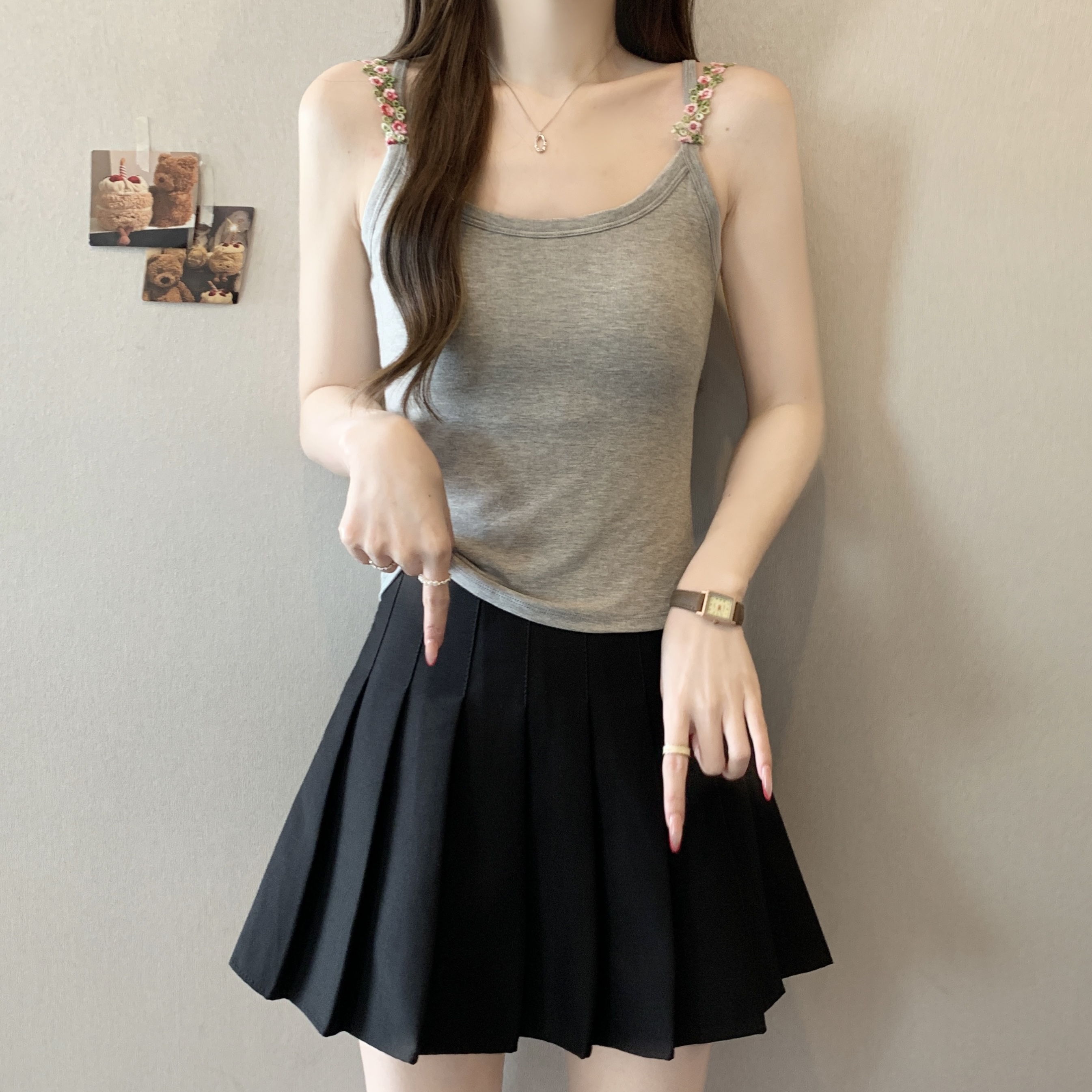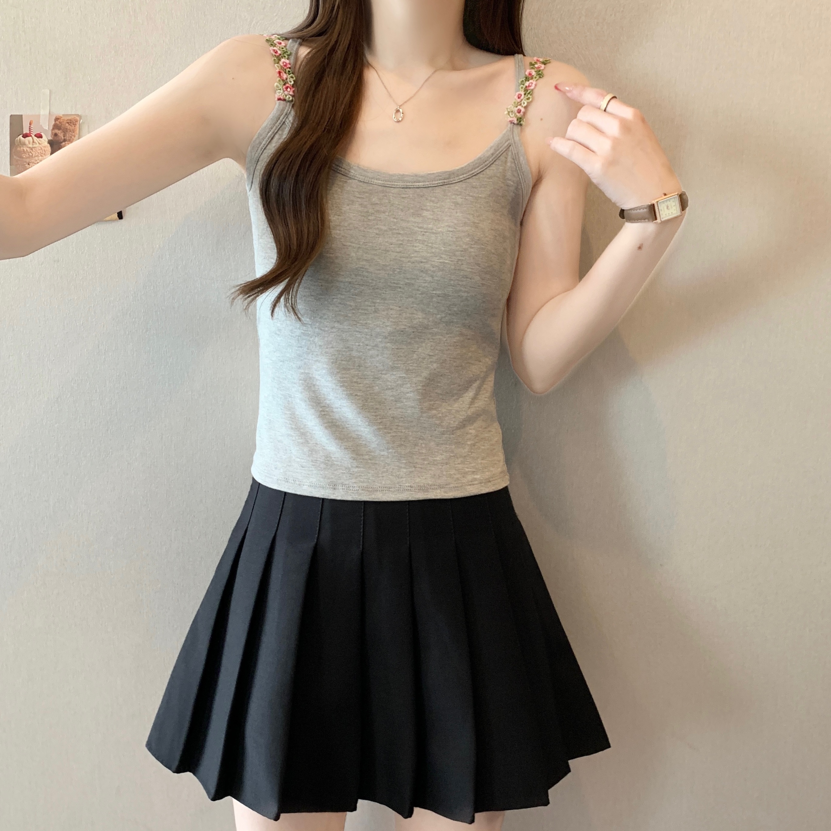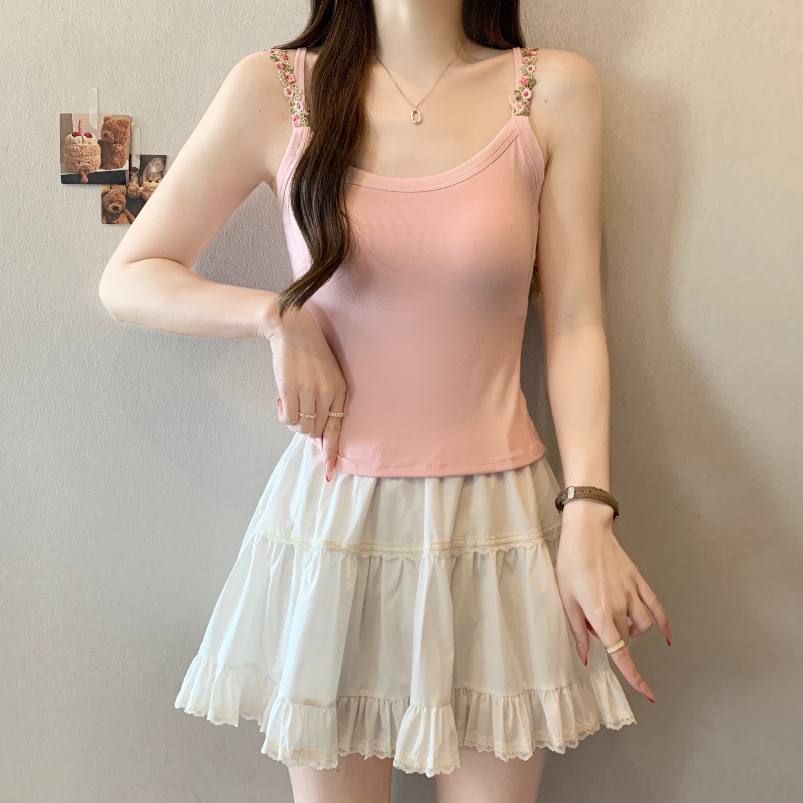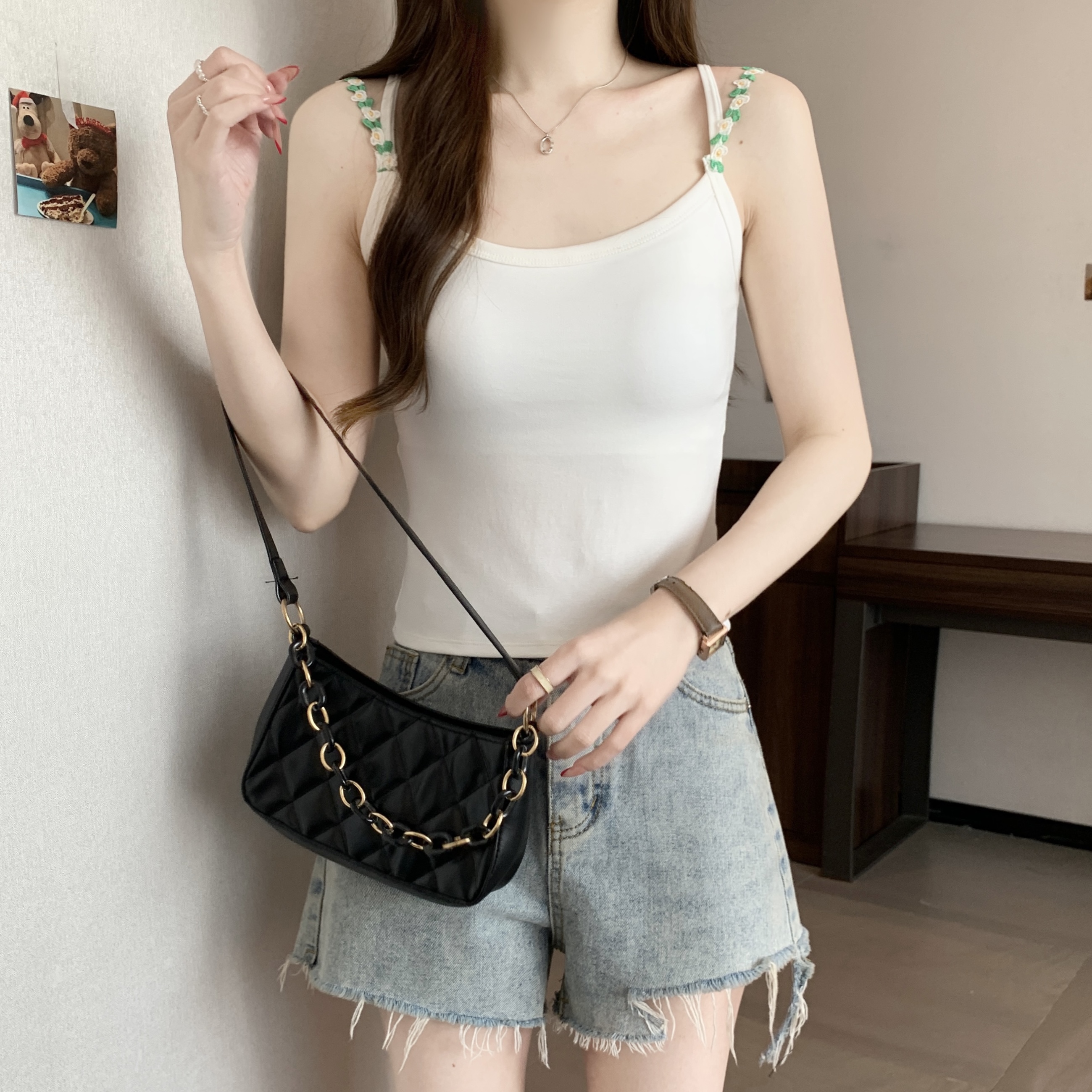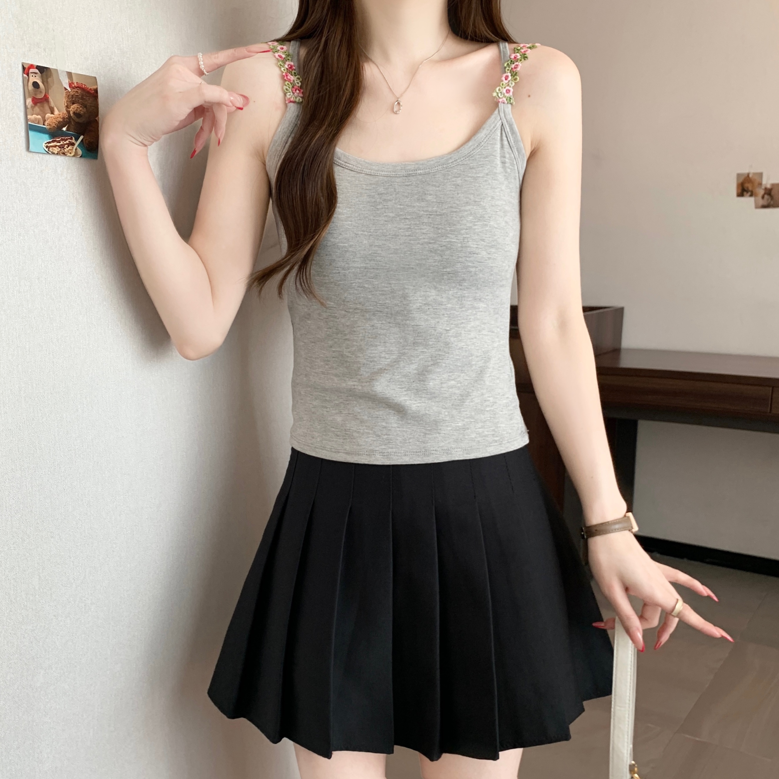 RY1409# 大码胖mm夏季新款纯欲花朵小吊带背心外穿美背带胸垫文胸一体上衣