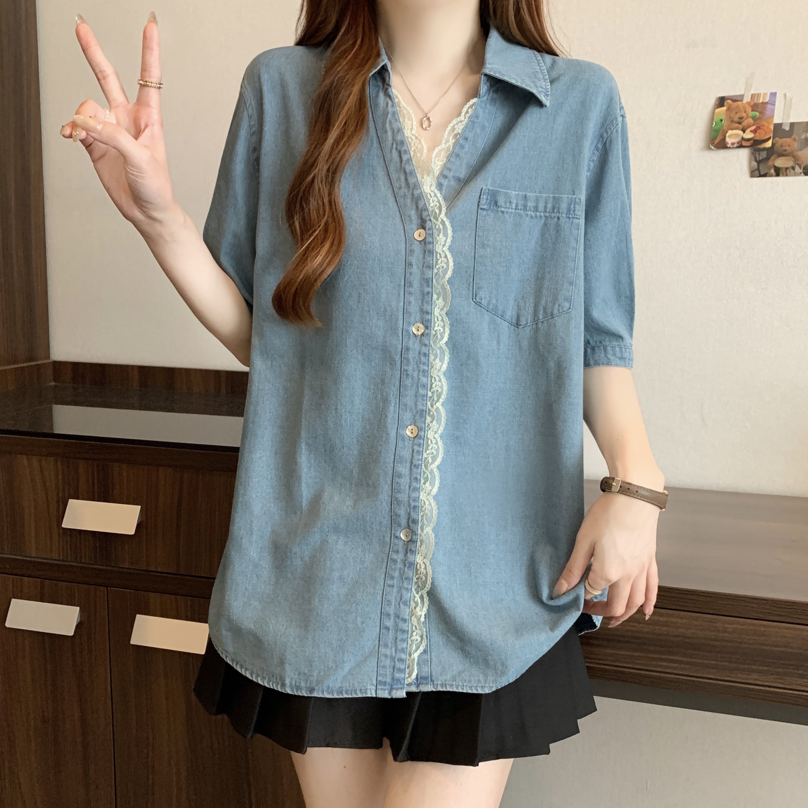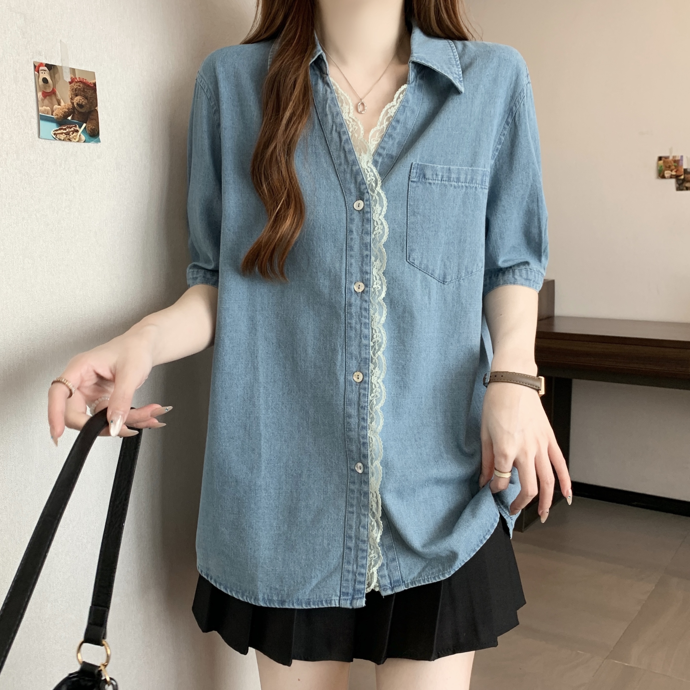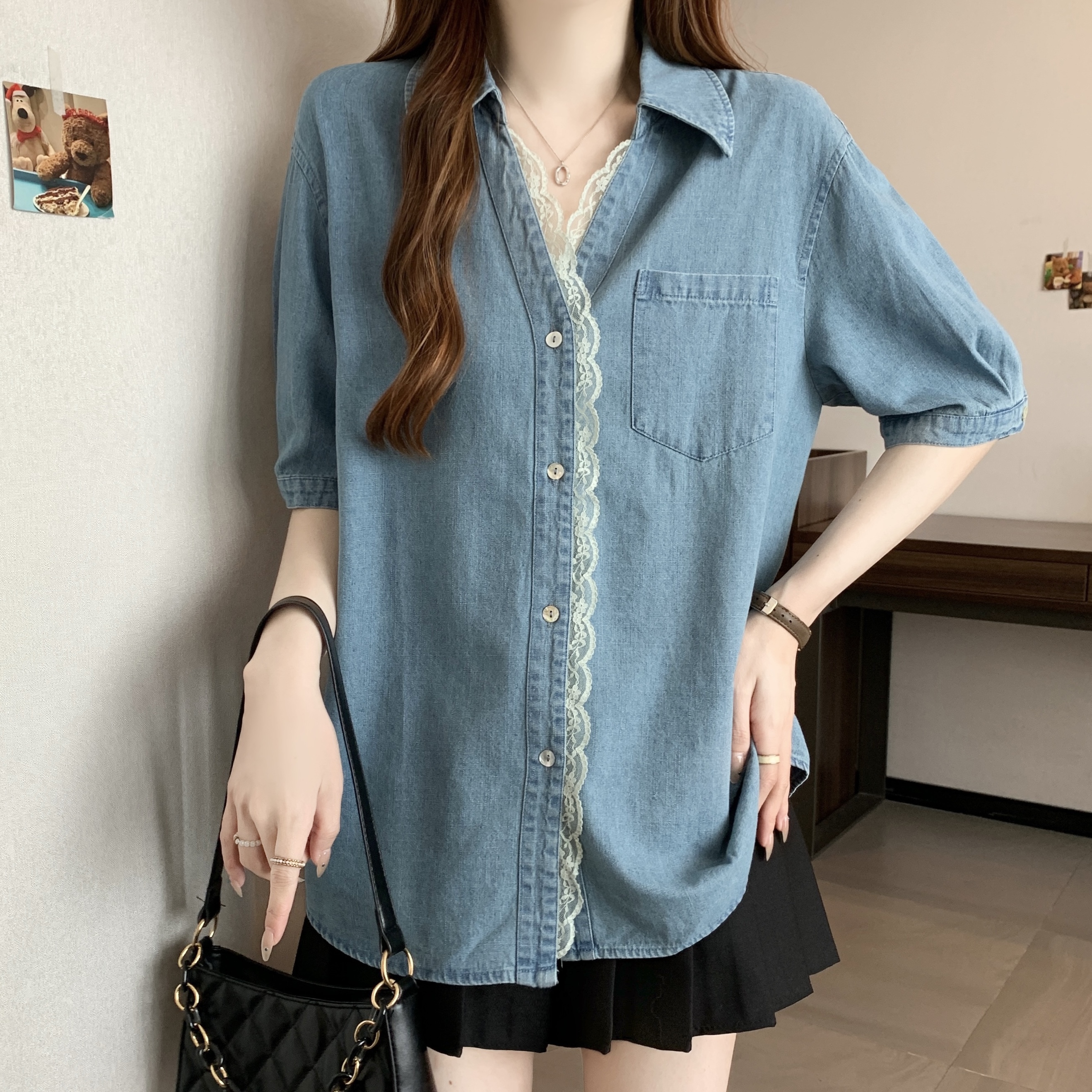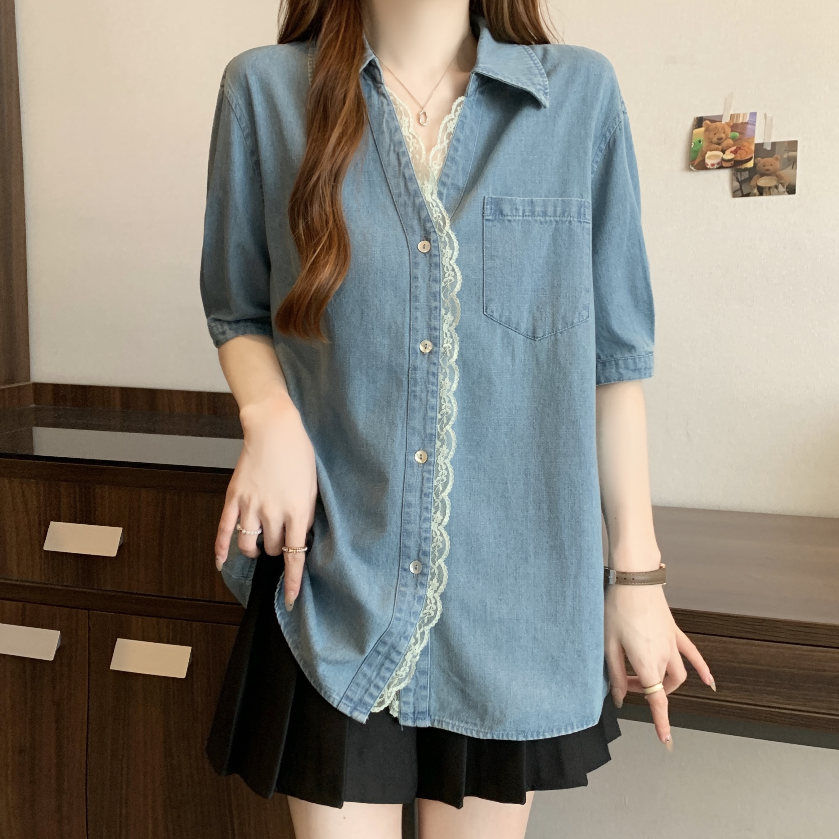 RY1416# 大码胖mm夏季新款设计感拼接蕾丝花边休闲衬衫遮肚显瘦上衣