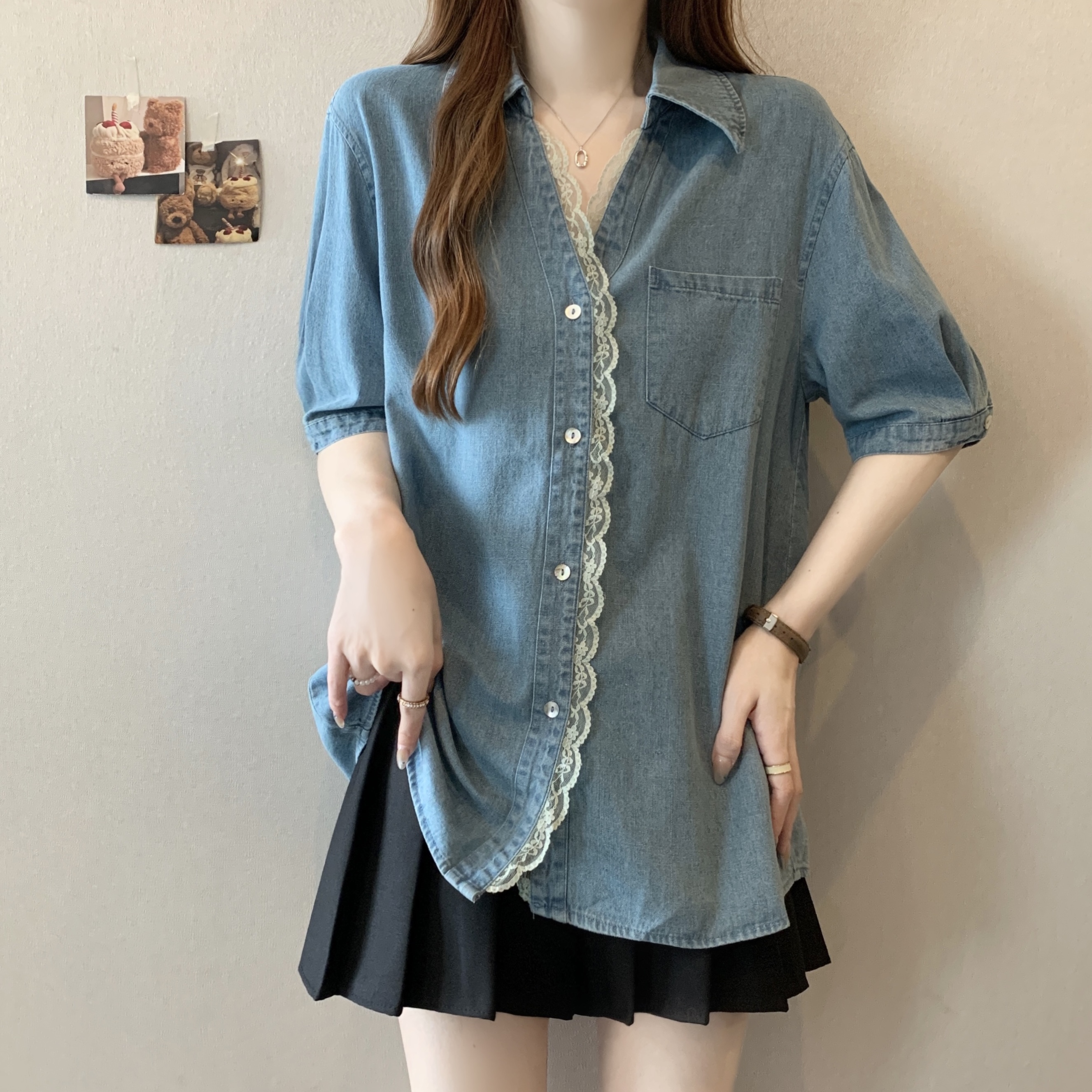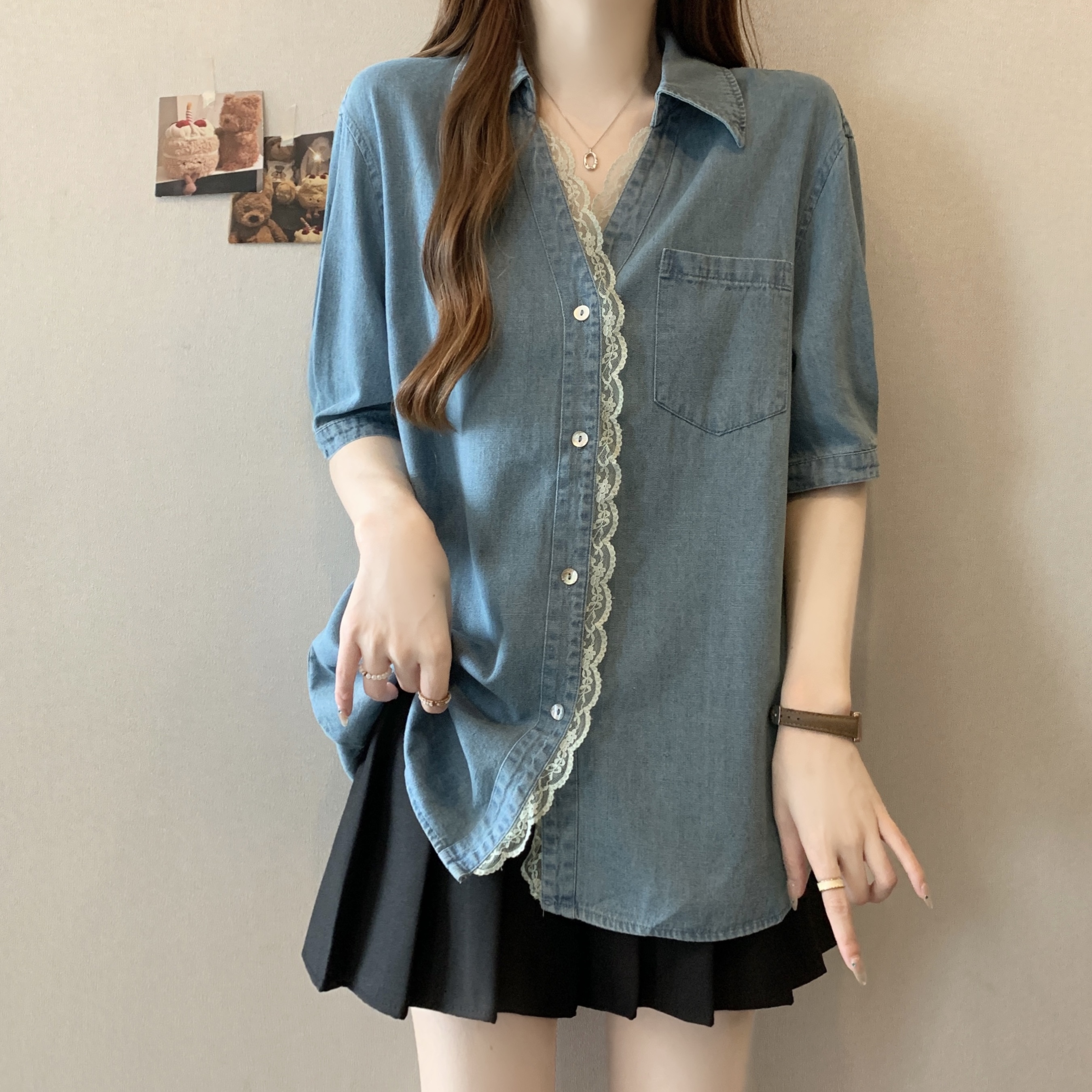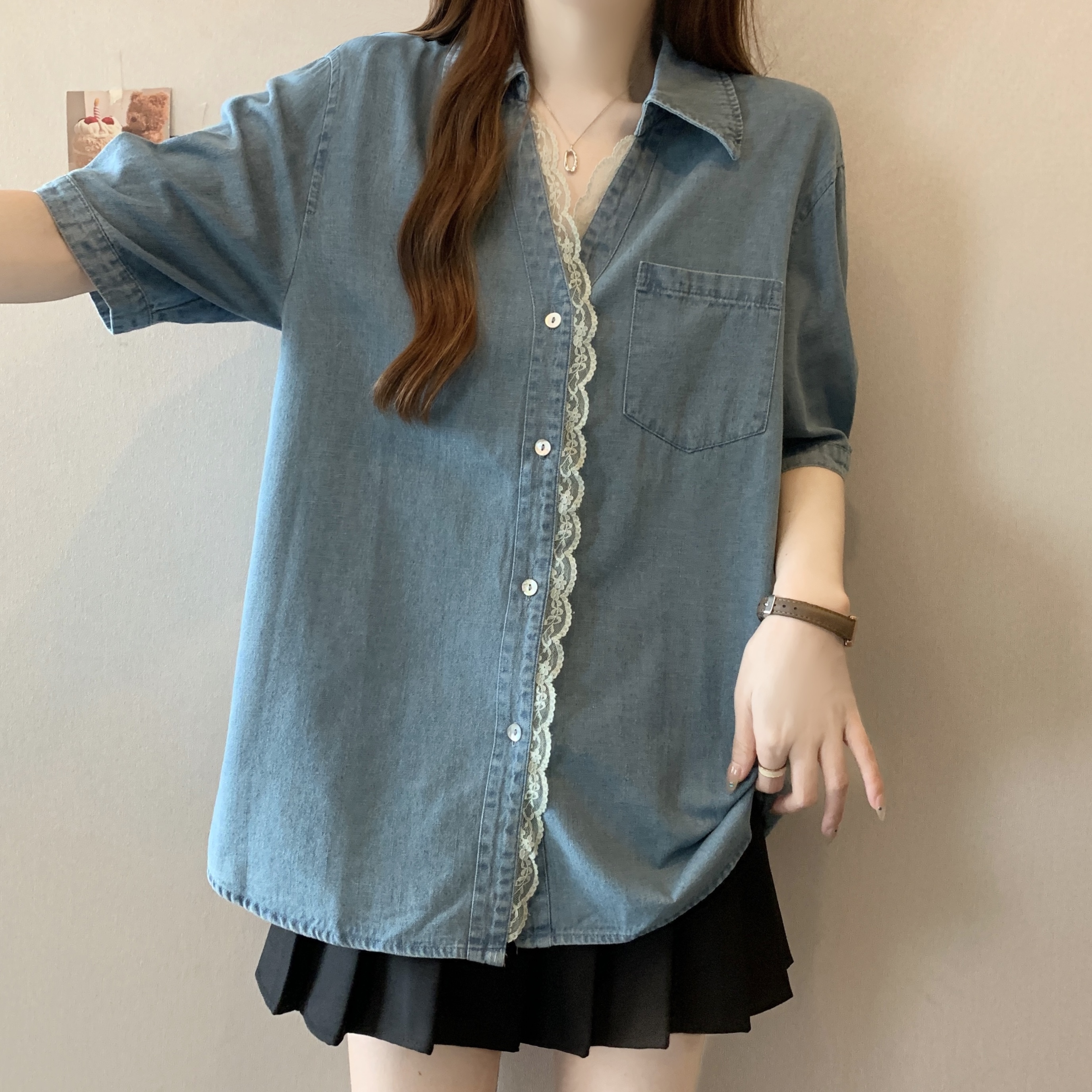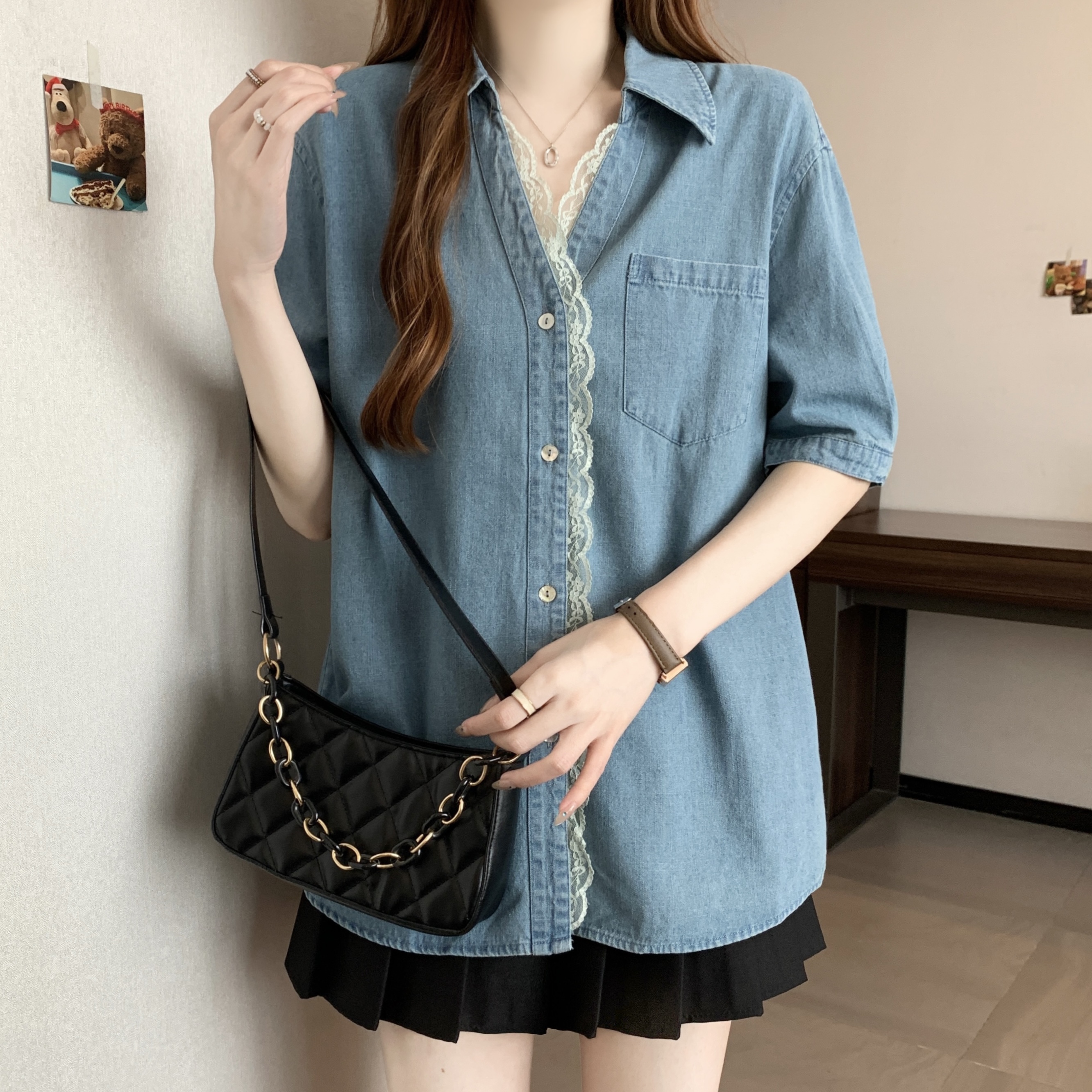 RY1416# 大码胖mm夏季新款设计感拼接蕾丝花边休闲衬衫遮肚显瘦上衣