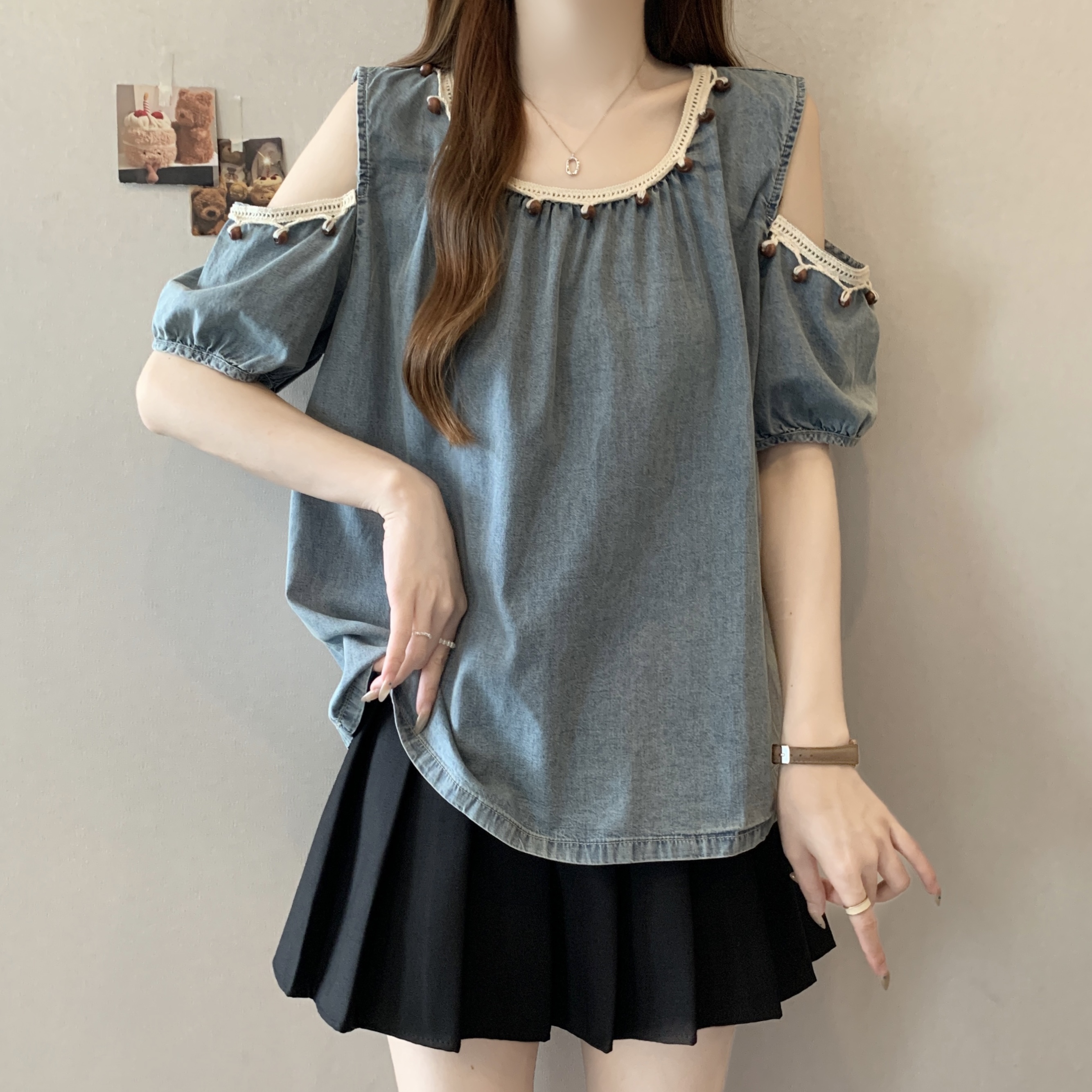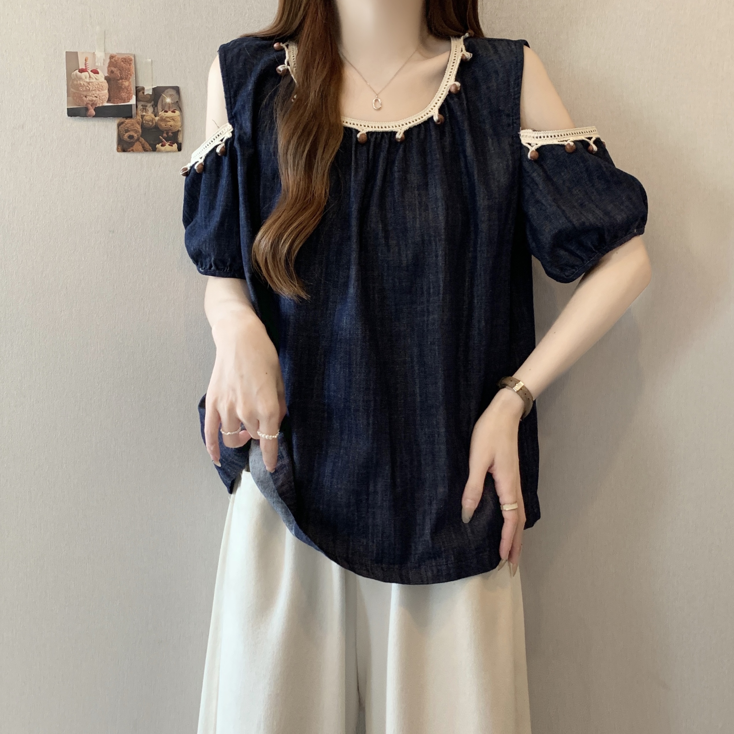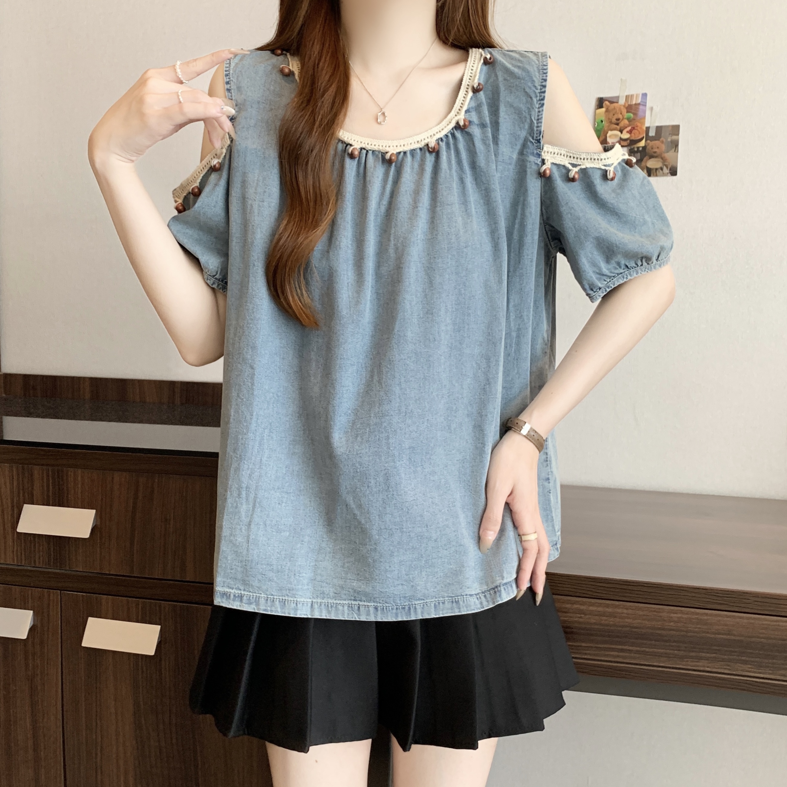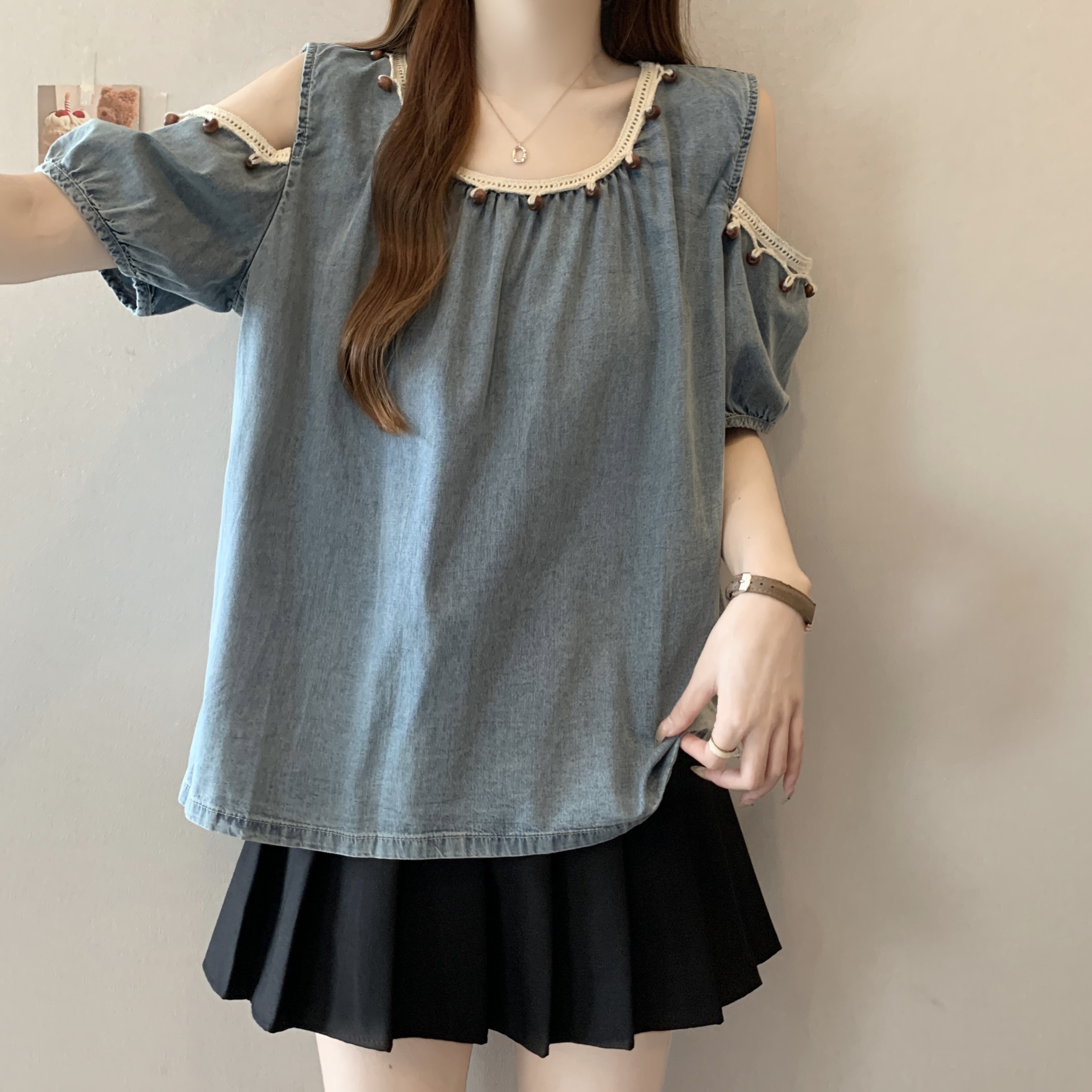 RY1417# 大码胖mm夏季新款时尚百搭圆领拼接蕾丝短袖遮肚显瘦牛仔上衣衬衫
