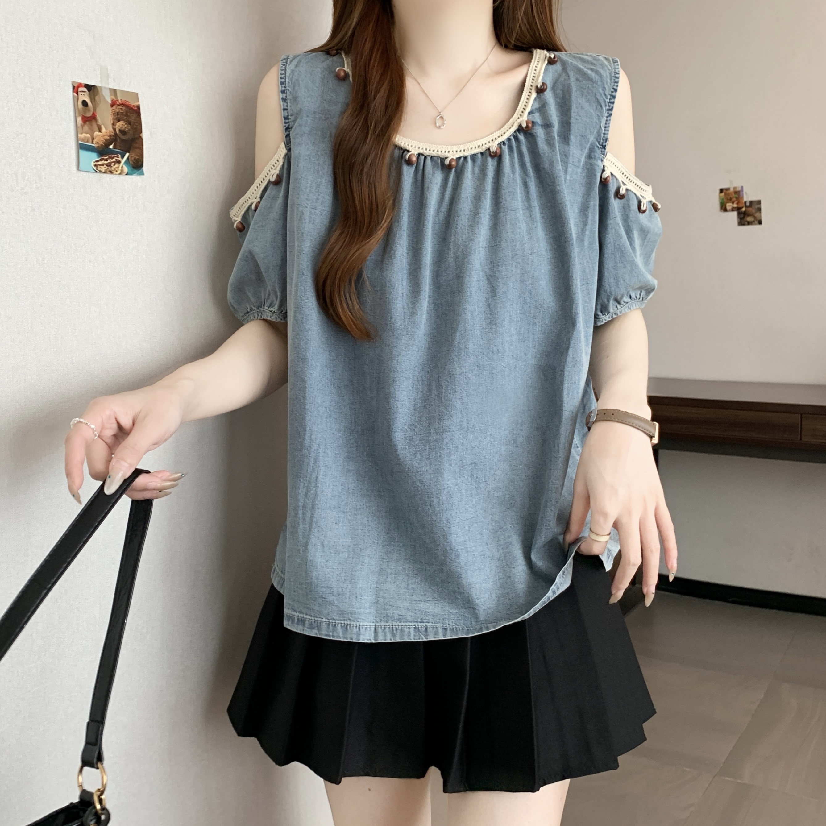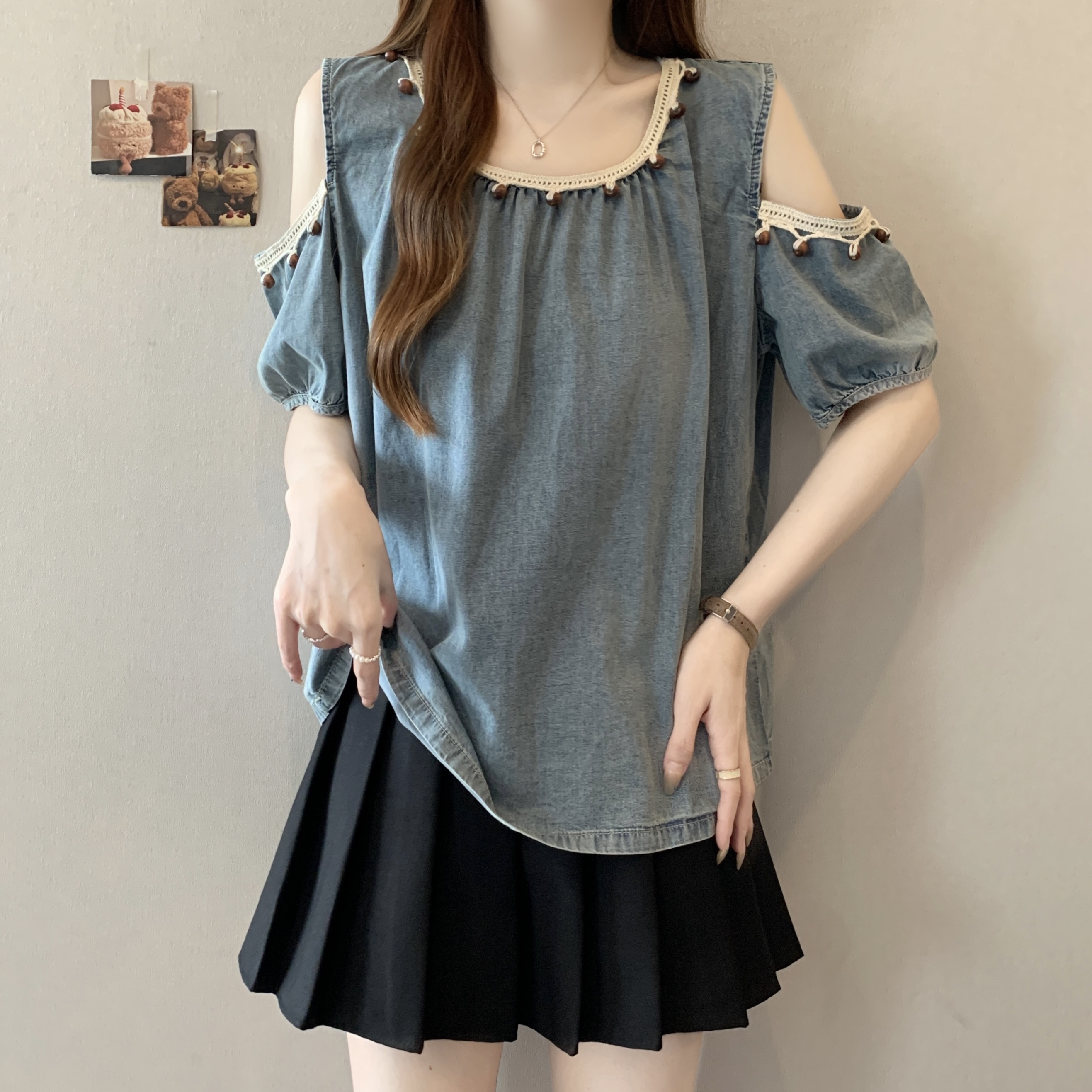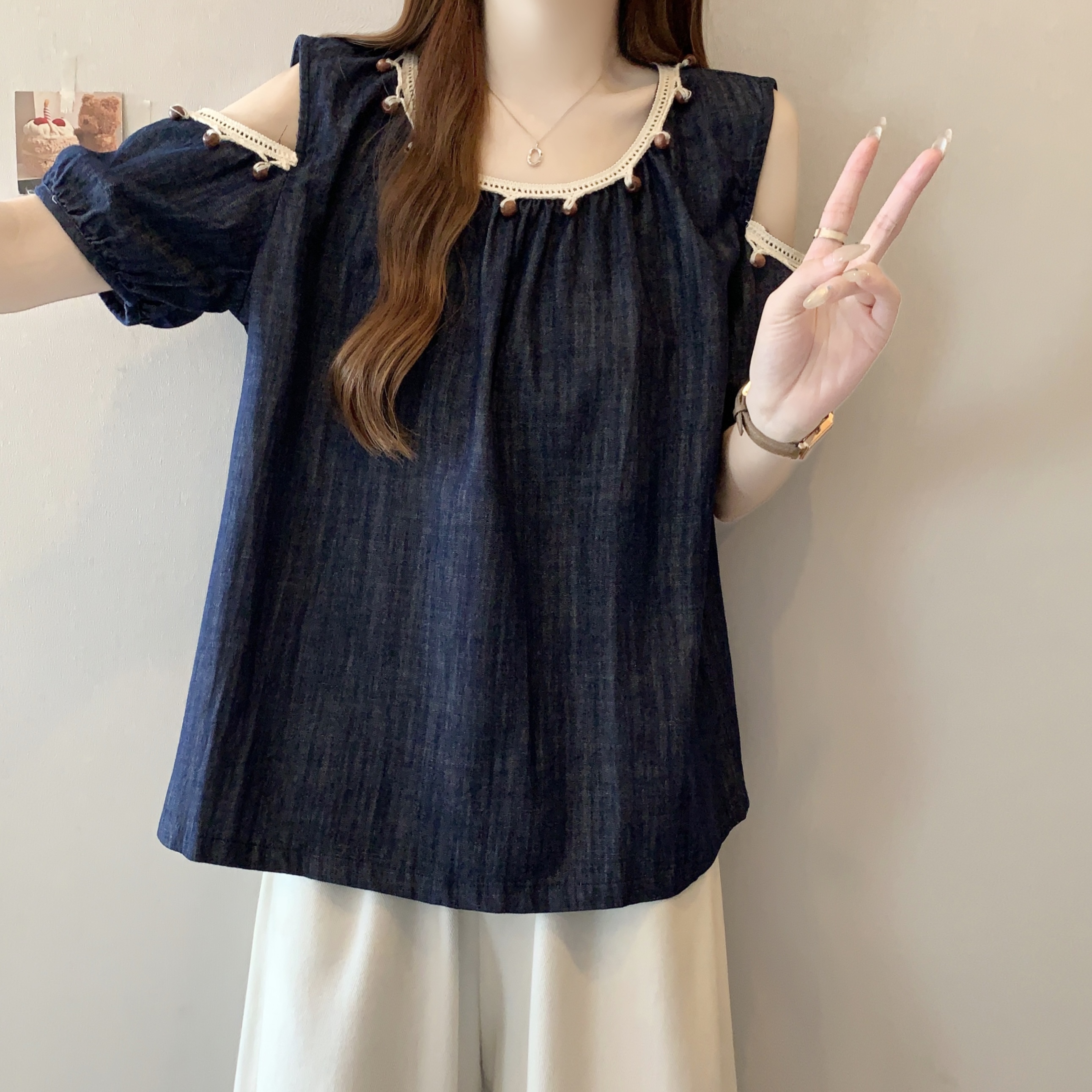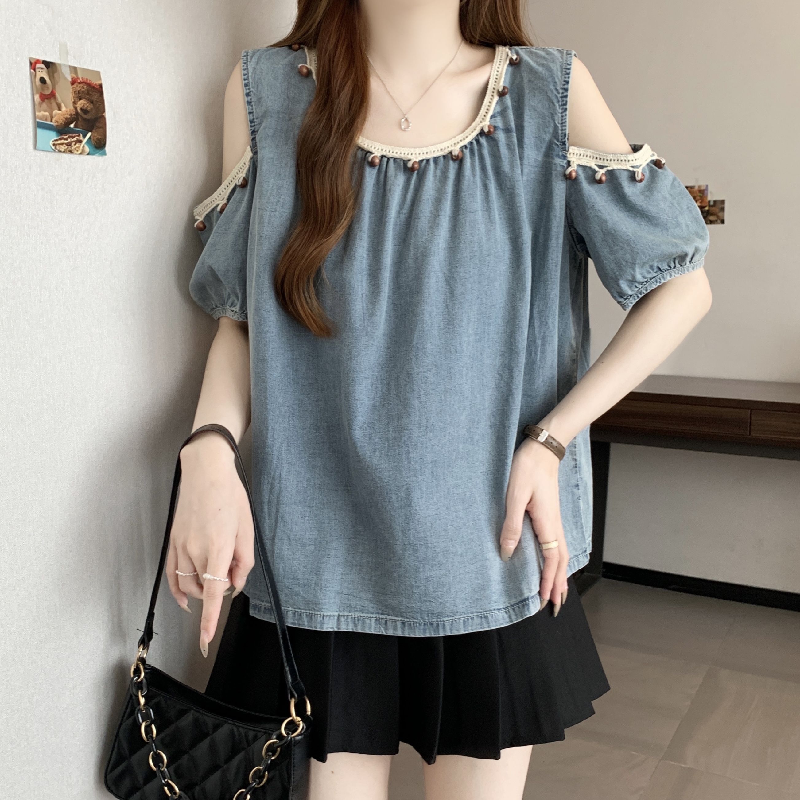 RY1417# 大码胖mm夏季新款时尚百搭圆领拼接蕾丝短袖遮肚显瘦牛仔上衣衬衫