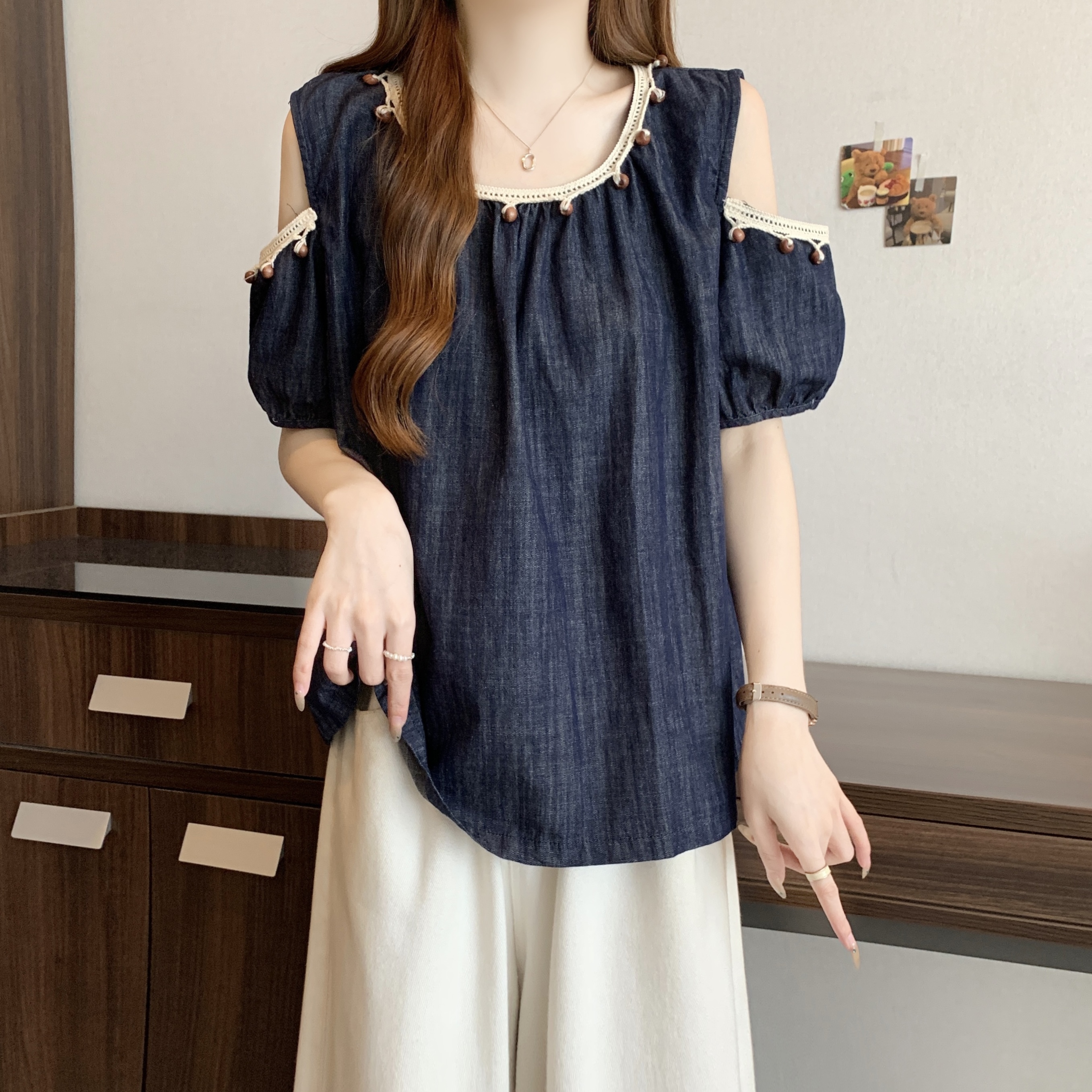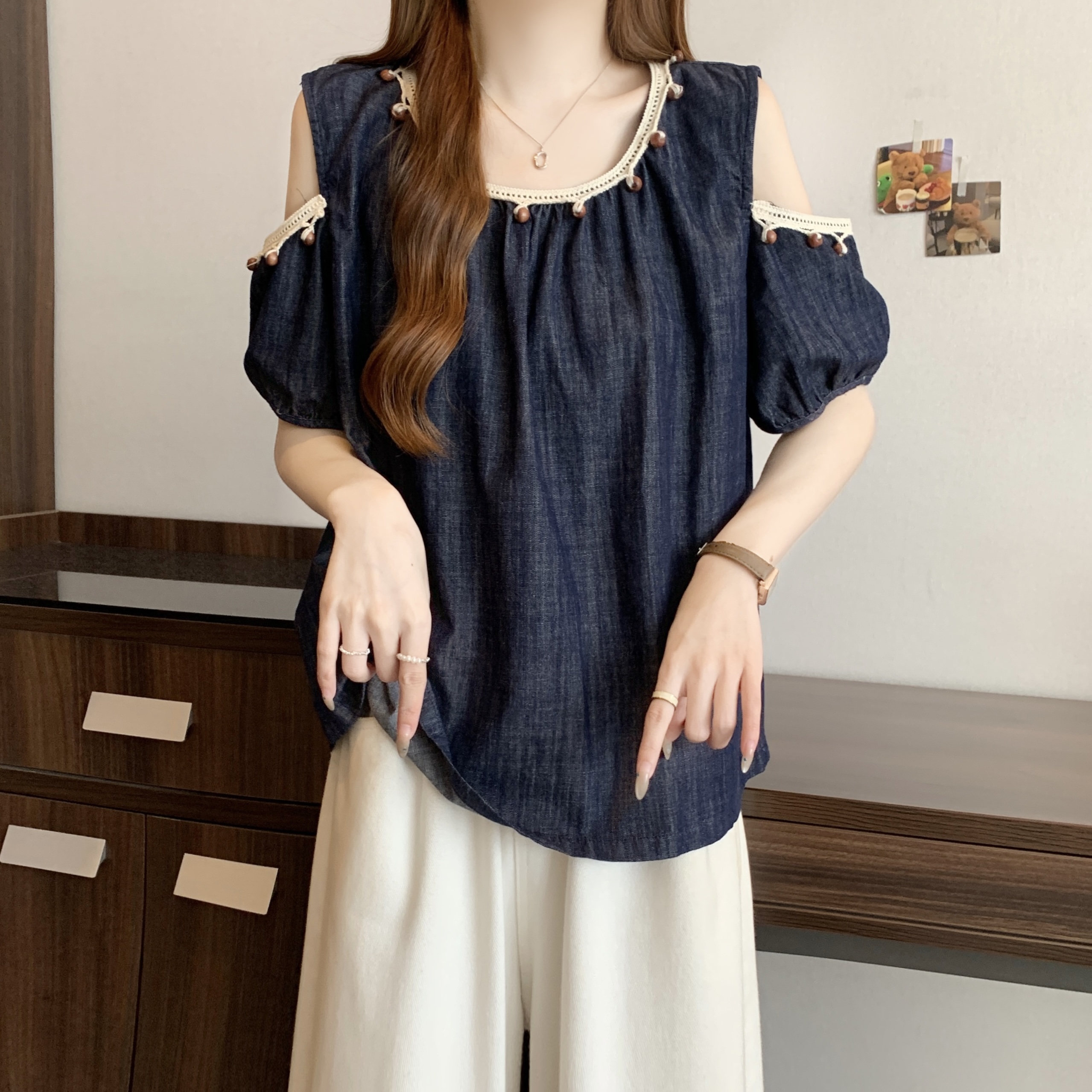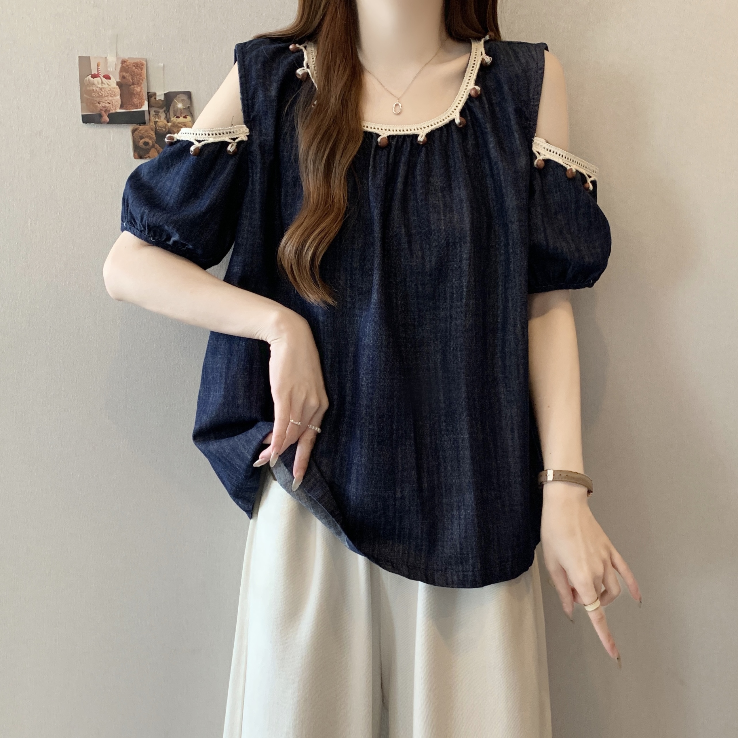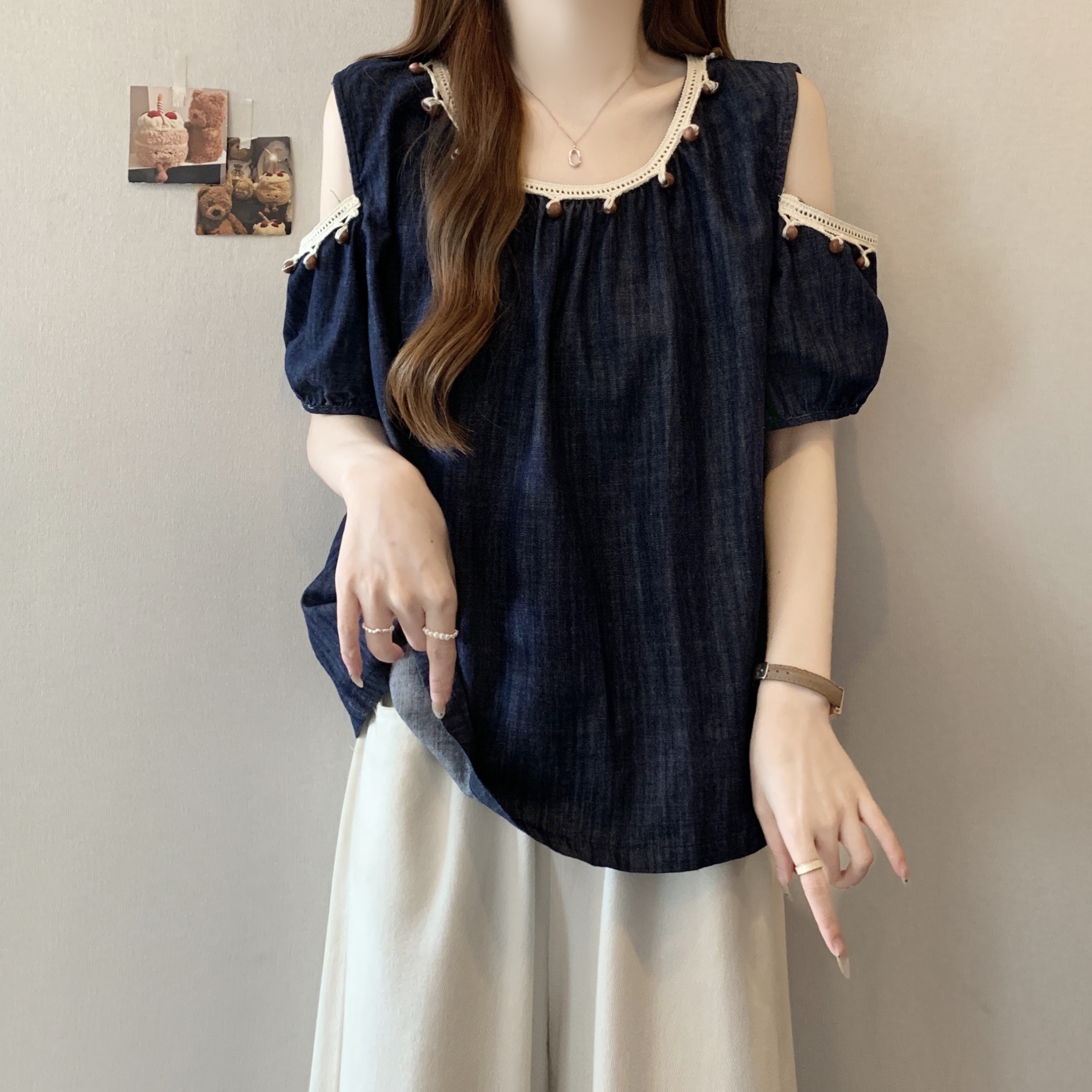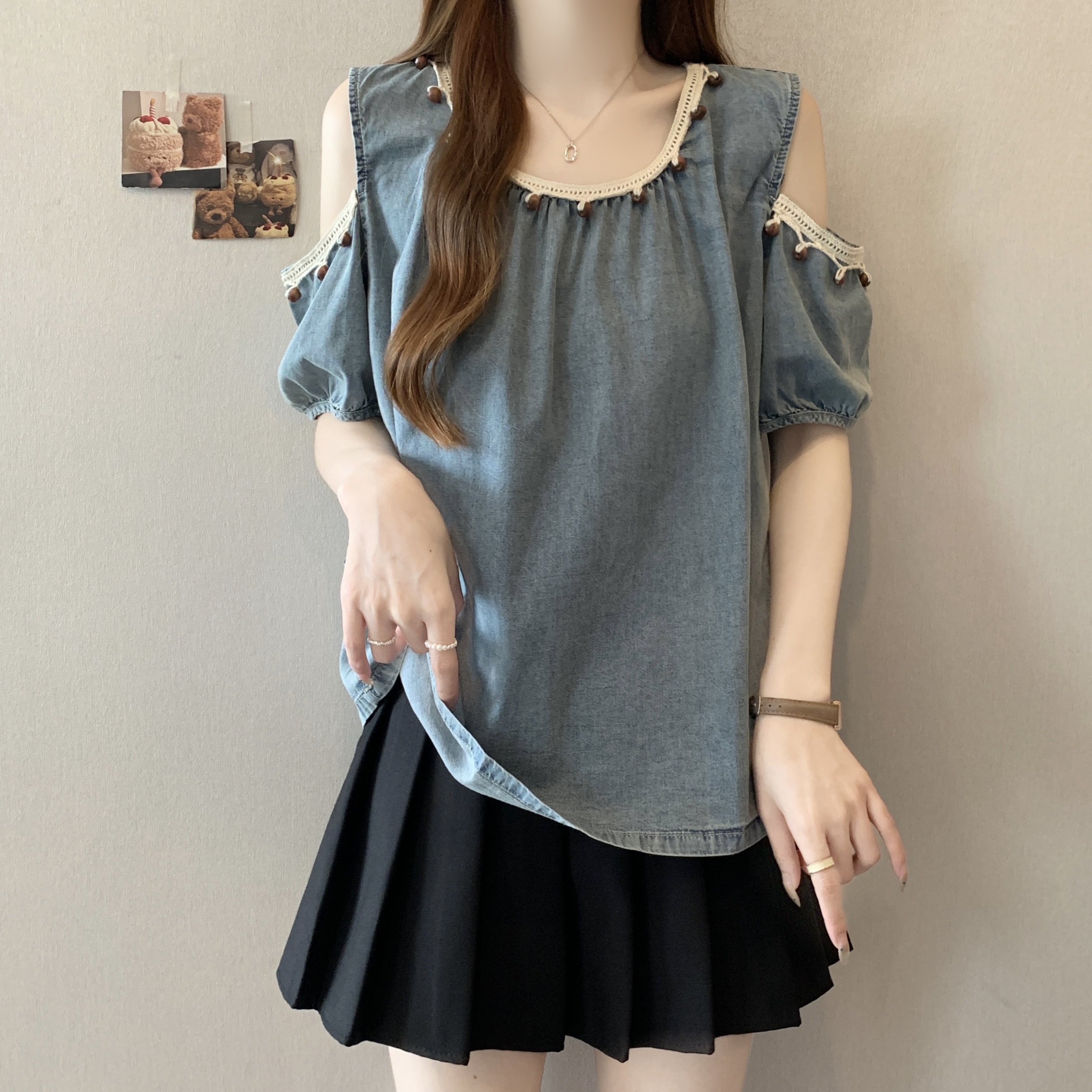 RY1417# 大码胖mm夏季新款时尚百搭圆领拼接蕾丝短袖遮肚显瘦牛仔上衣衬衫