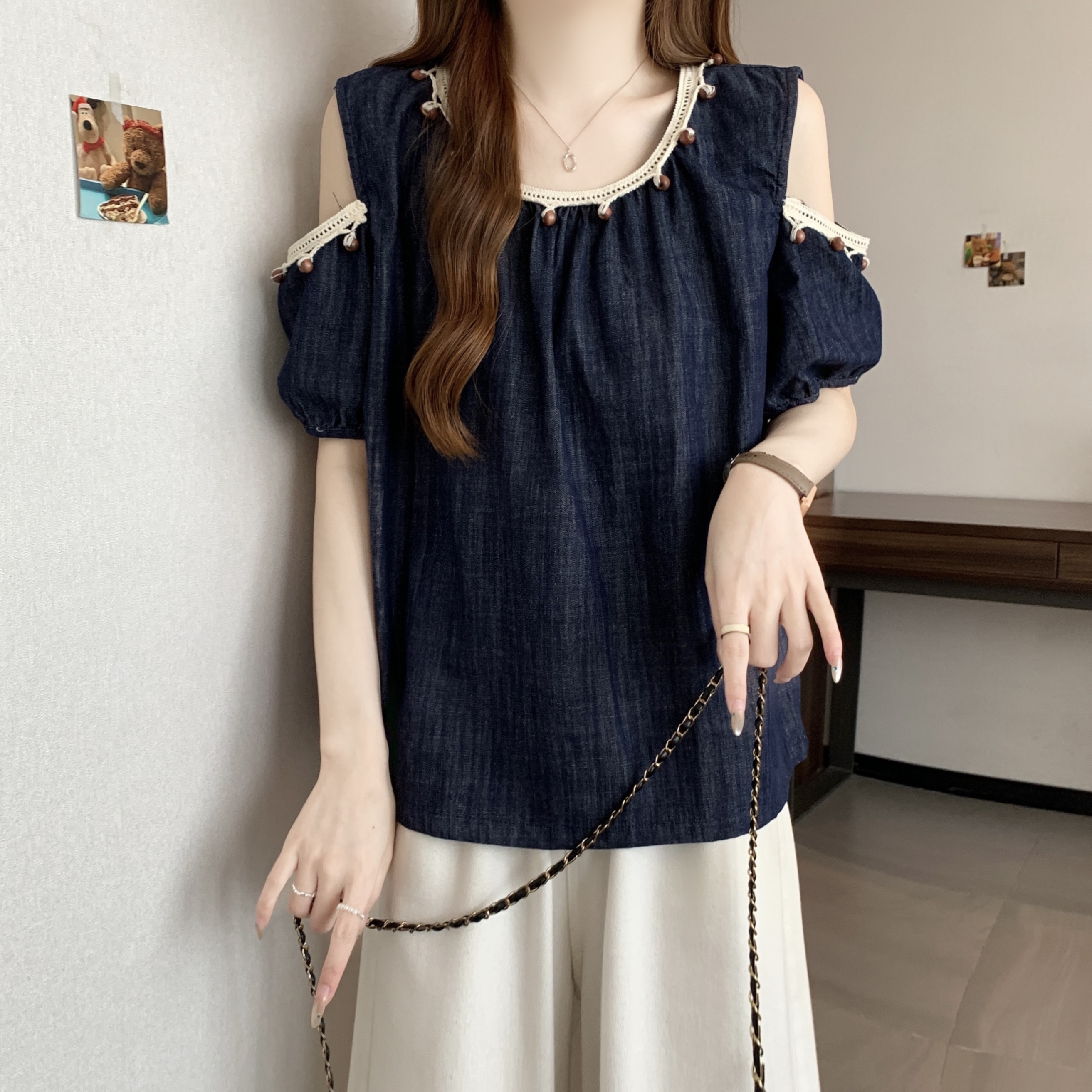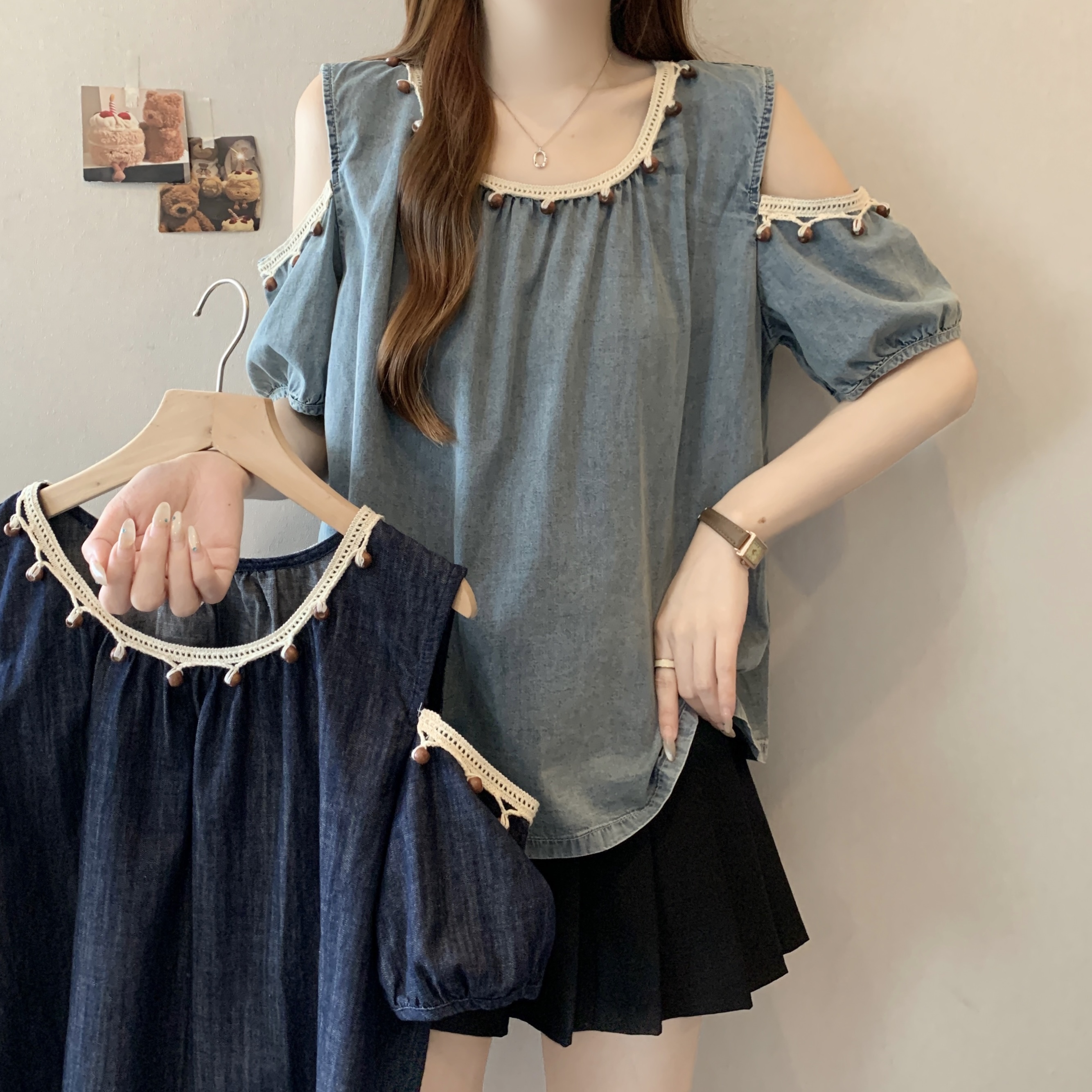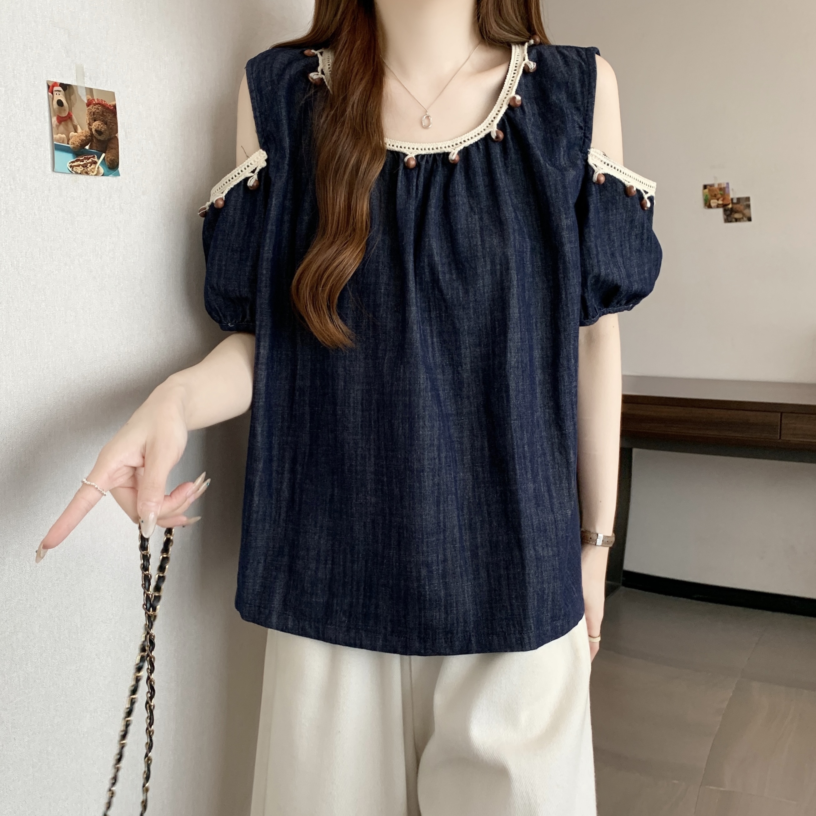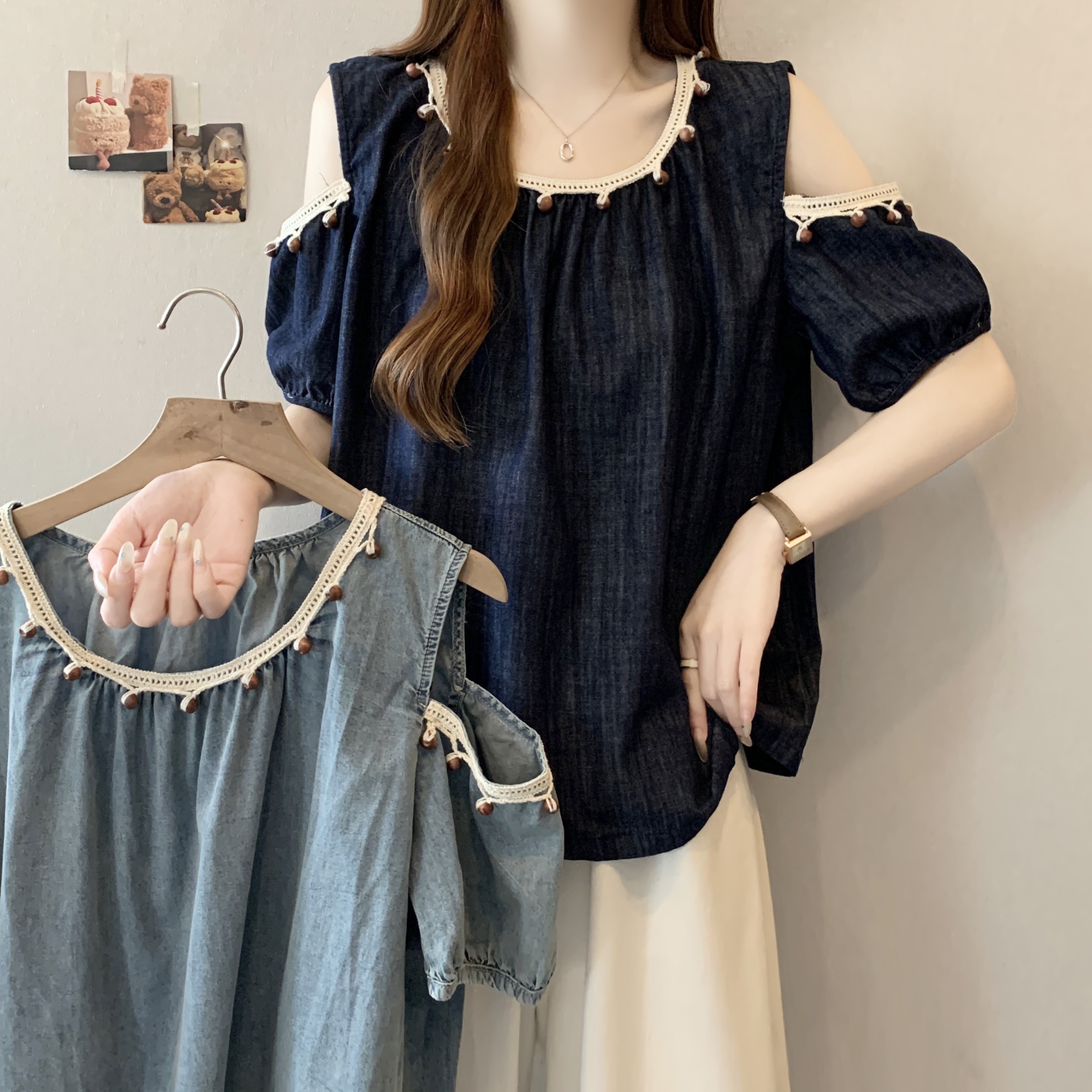 RY1417# 大码胖mm夏季新款时尚百搭圆领拼接蕾丝短袖遮肚显瘦牛仔上衣衬衫