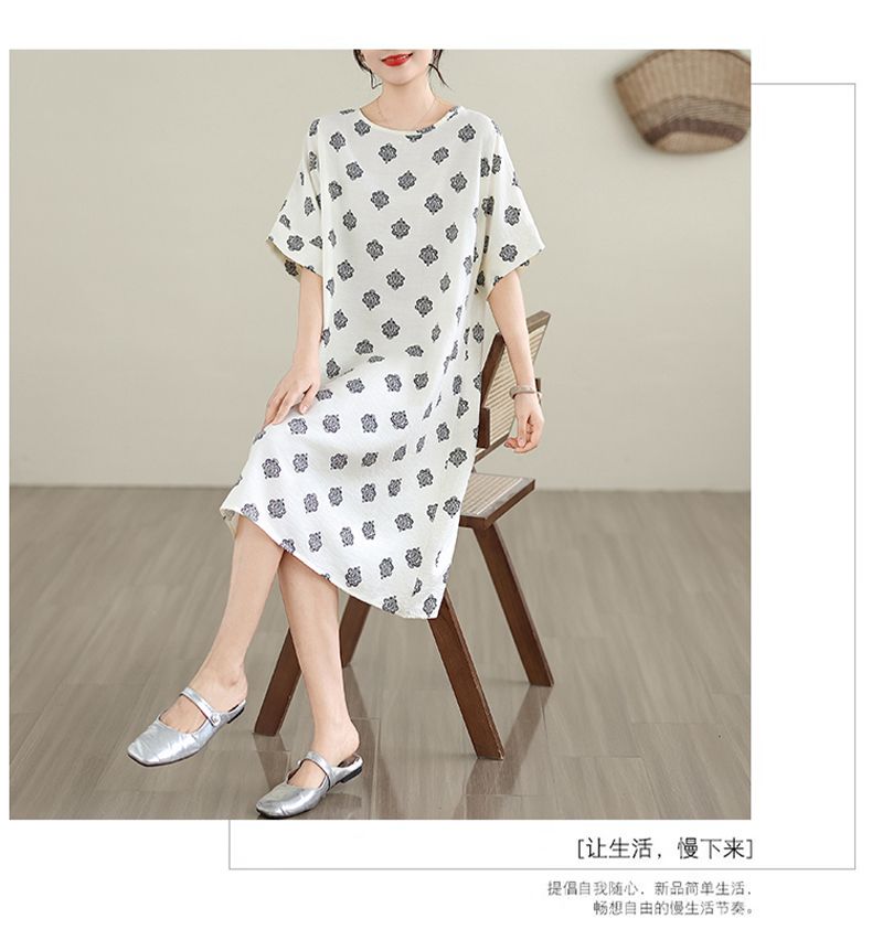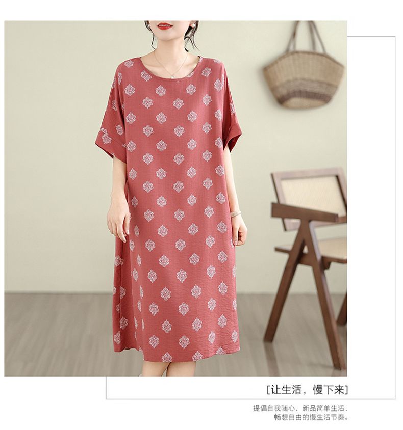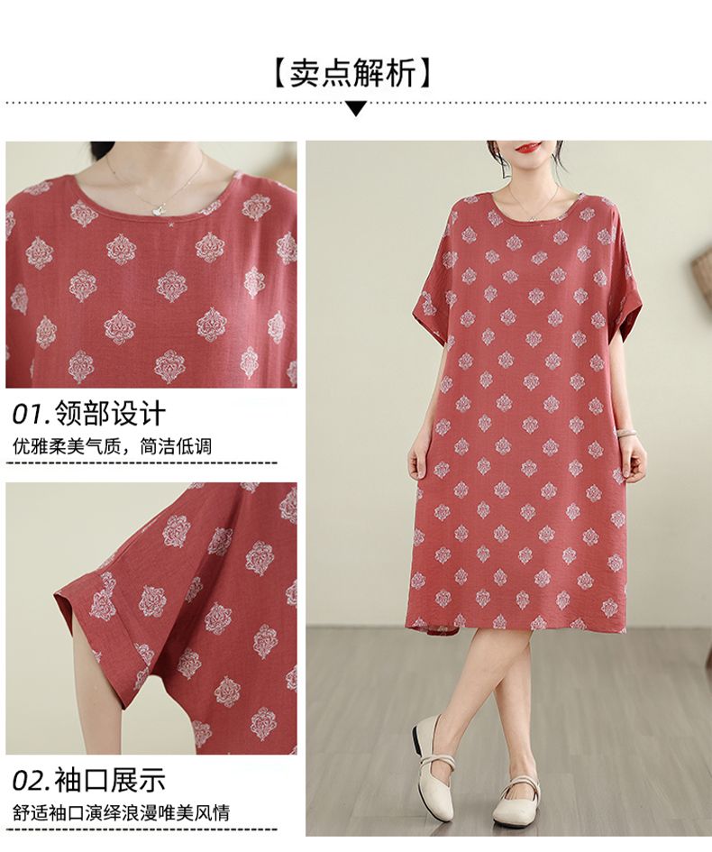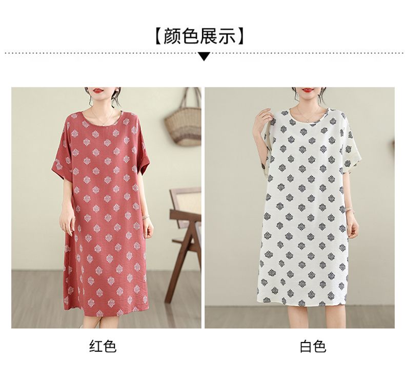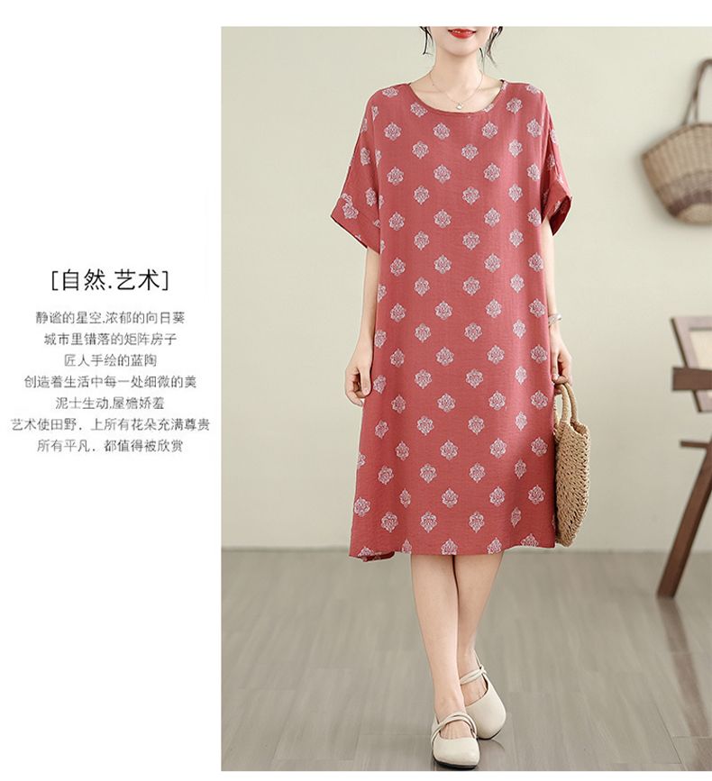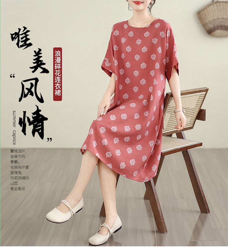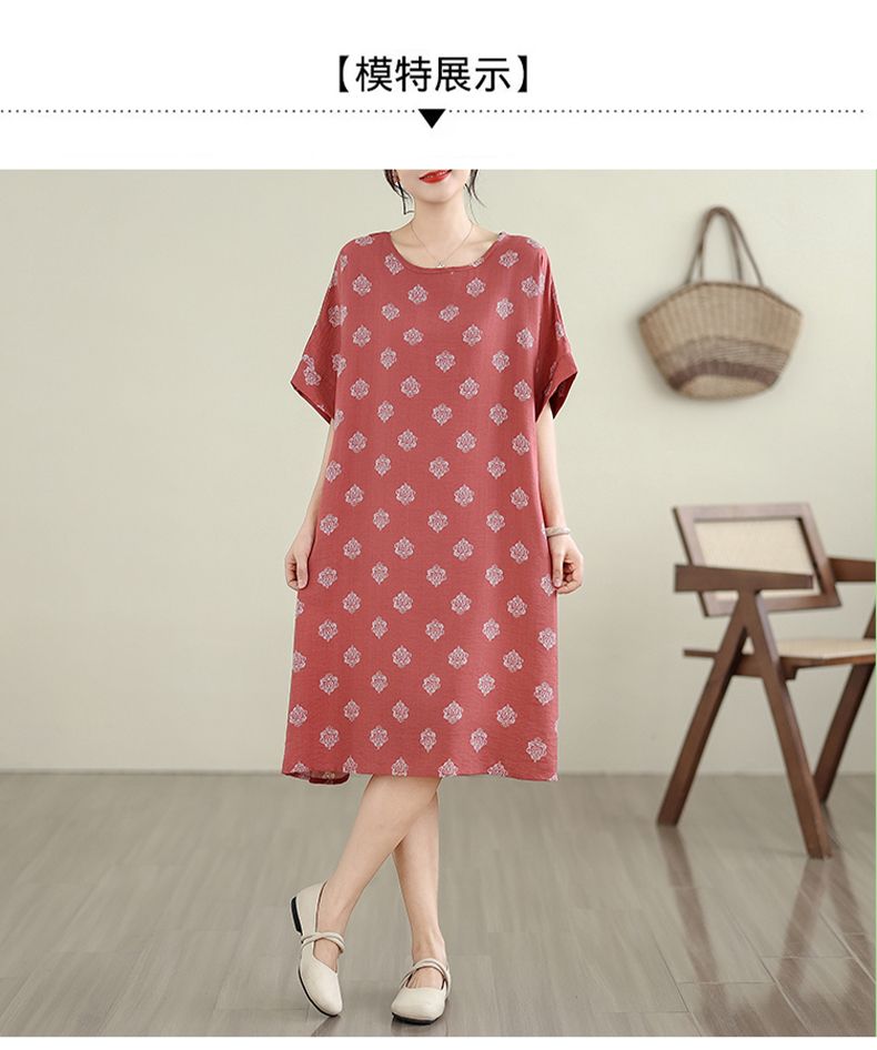 RY1429# 棉麻大码胖MM连衣裙夏季新款宽松显瘦休闲慵懒过膝印花裙