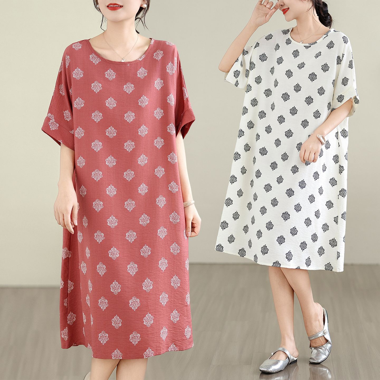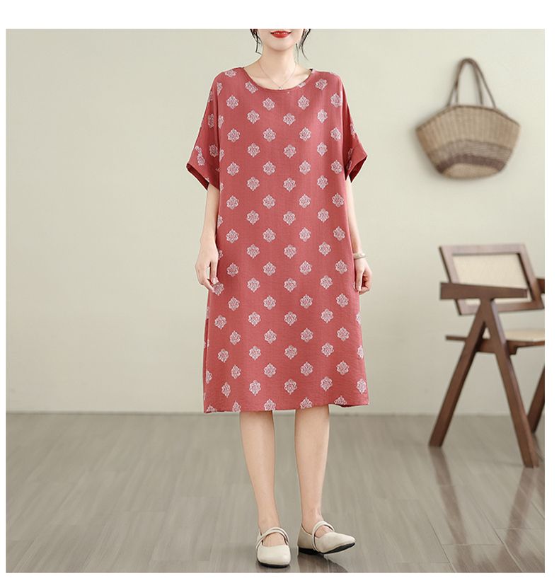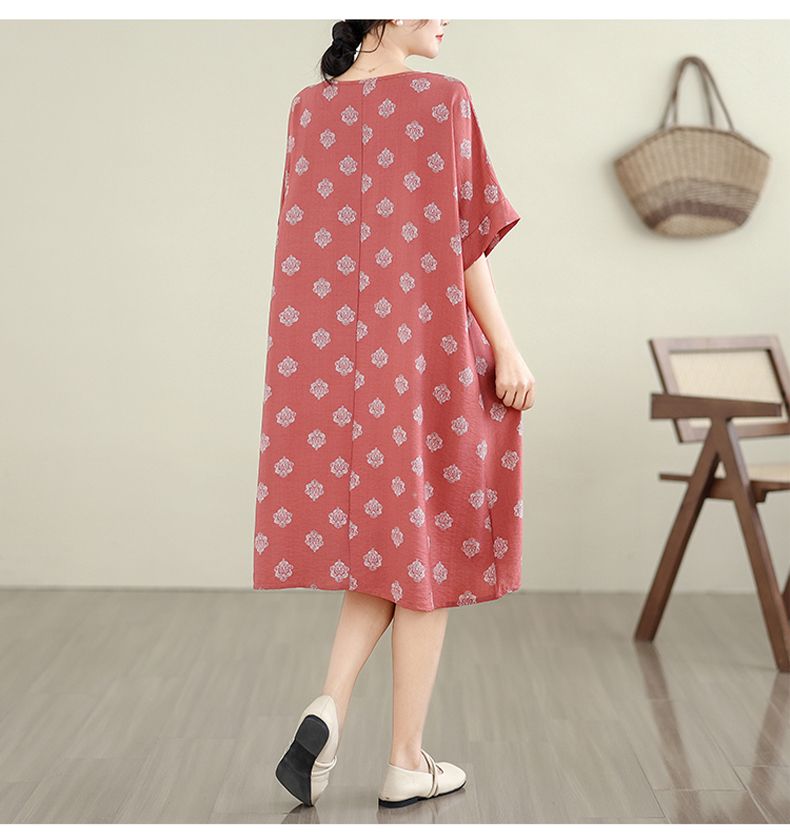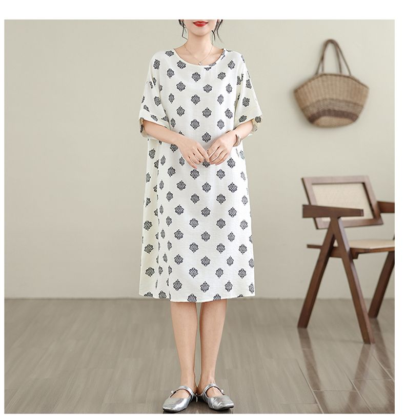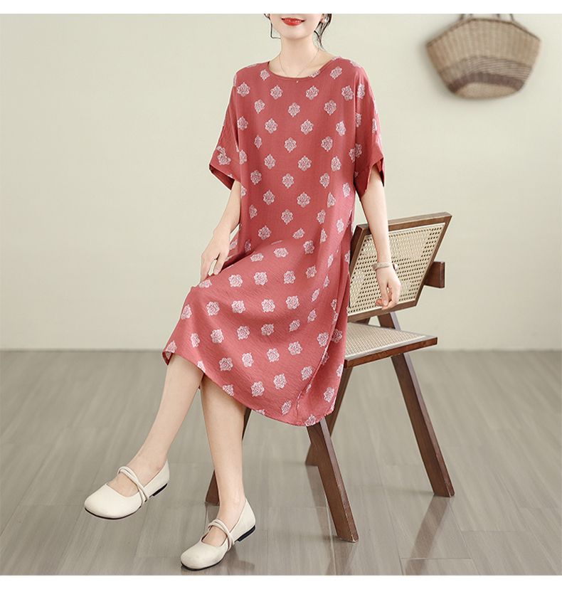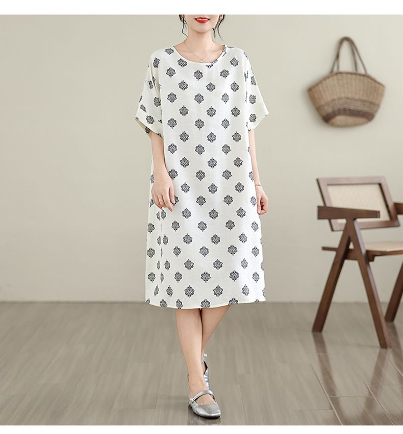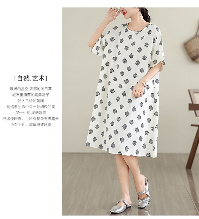 RY1429# 棉麻大码胖MM连衣裙夏季新款宽松显瘦休闲慵懒过膝印花裙