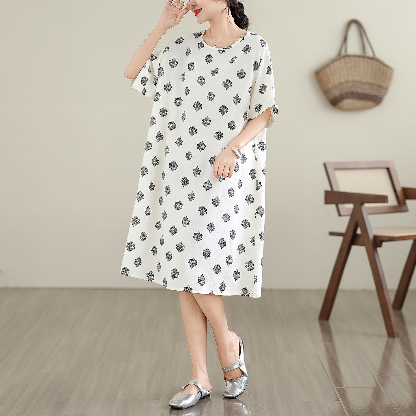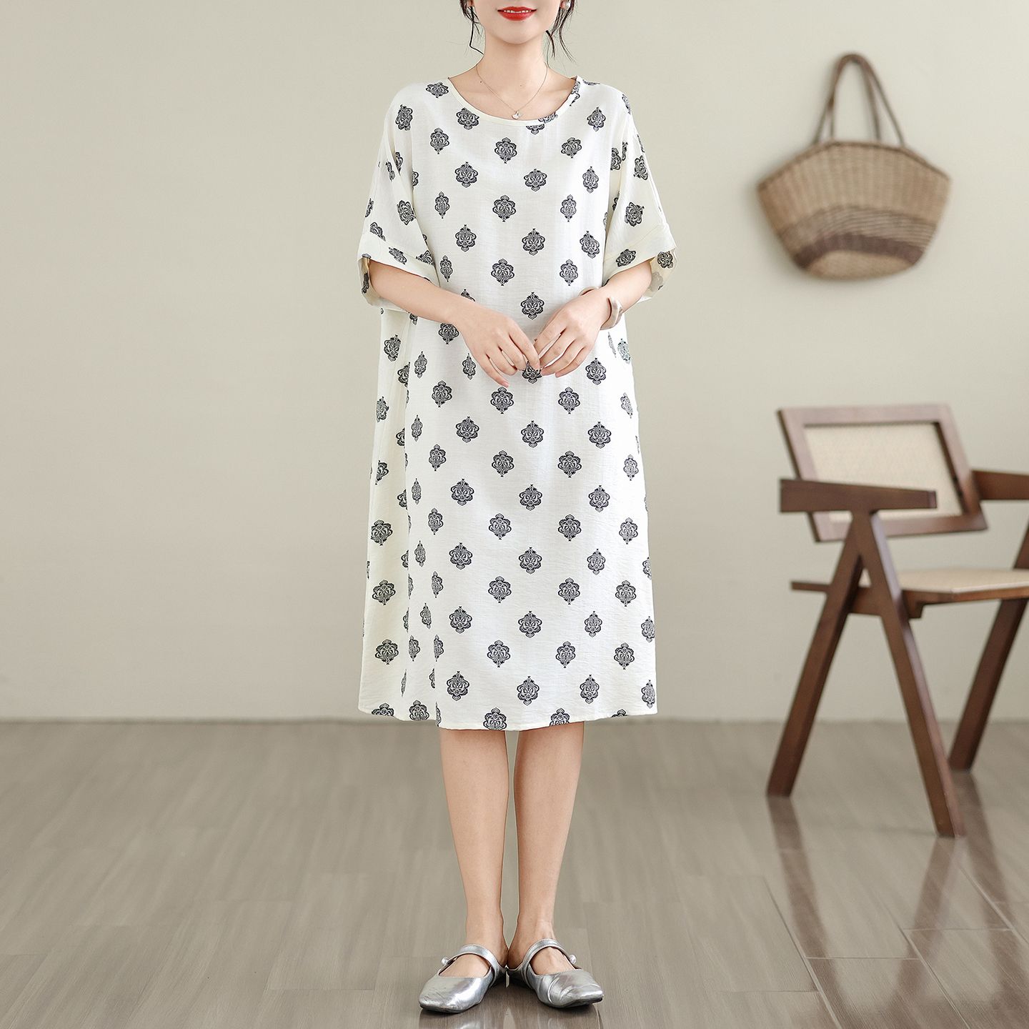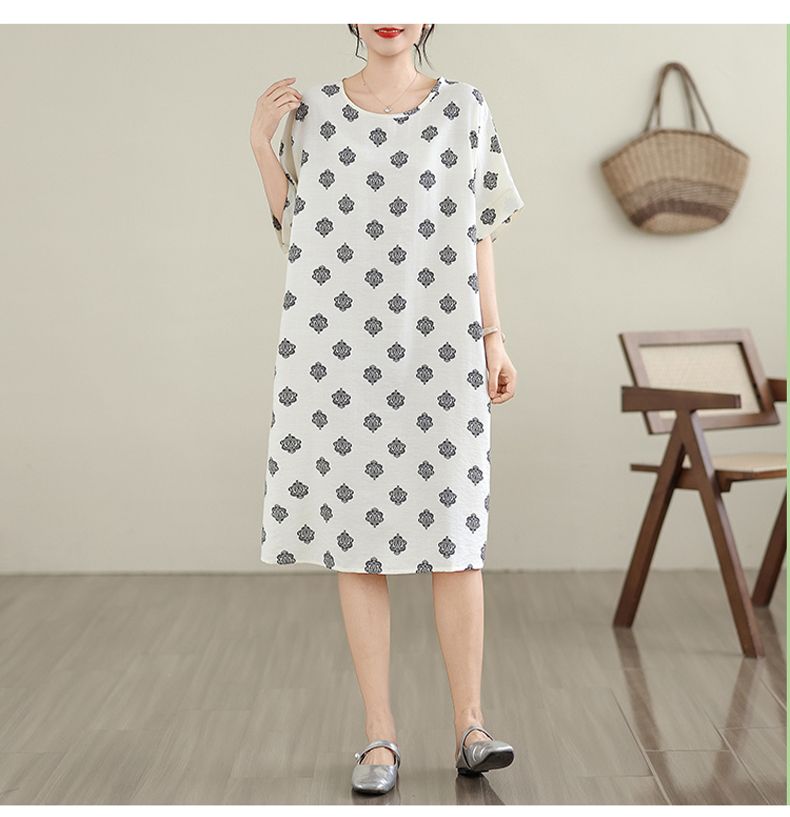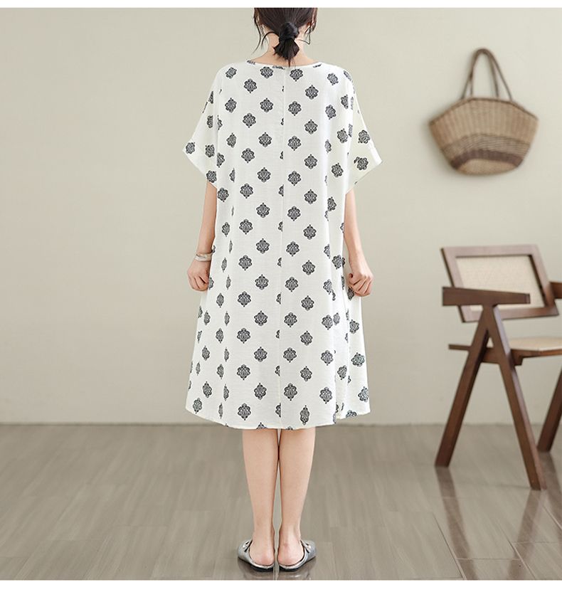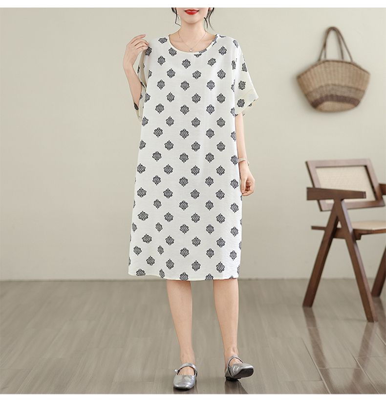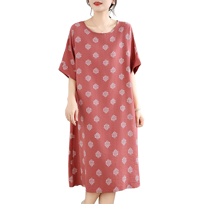 RY1429# 棉麻大码胖MM连衣裙夏季新款宽松显瘦休闲慵懒过膝印花裙