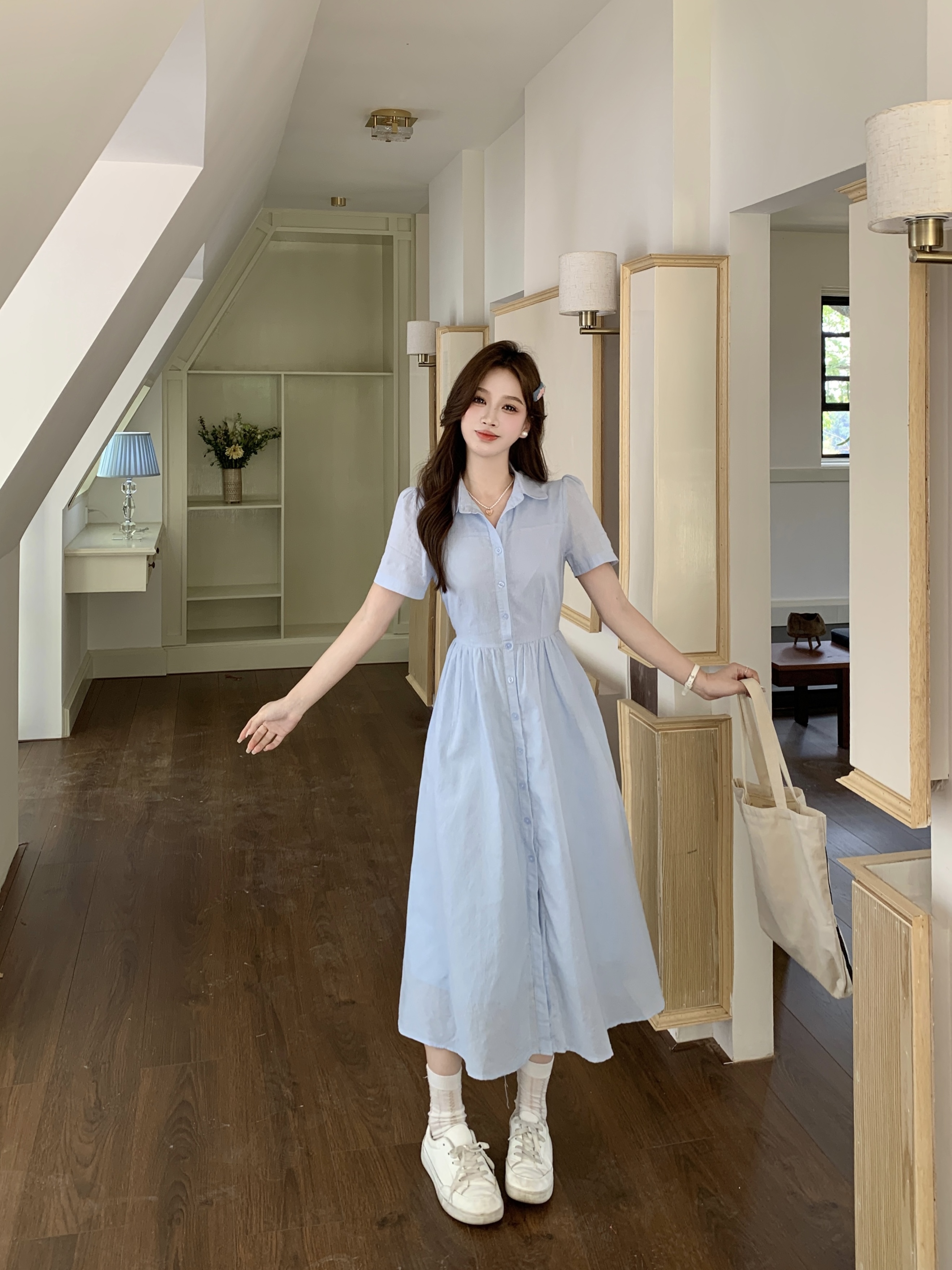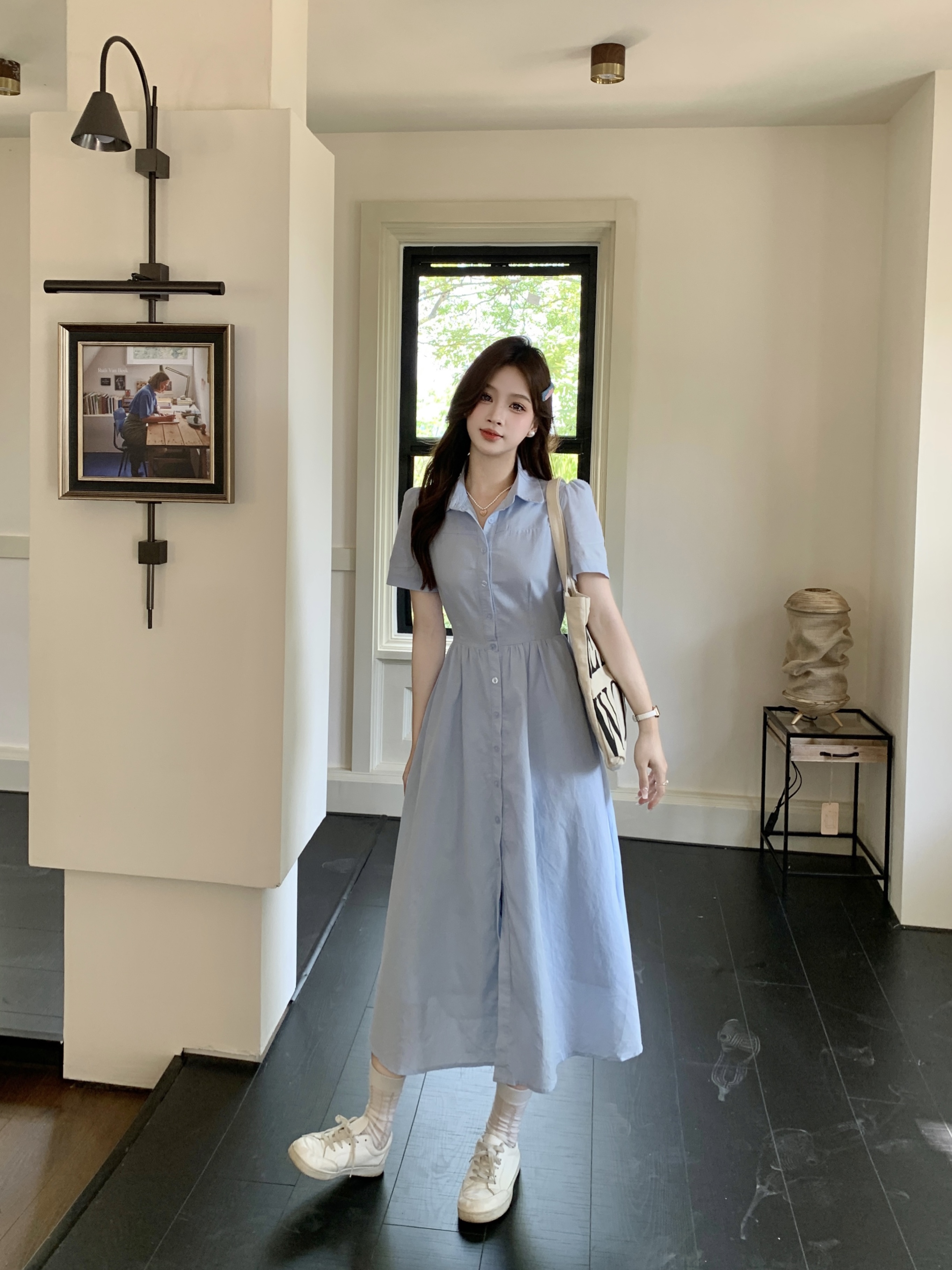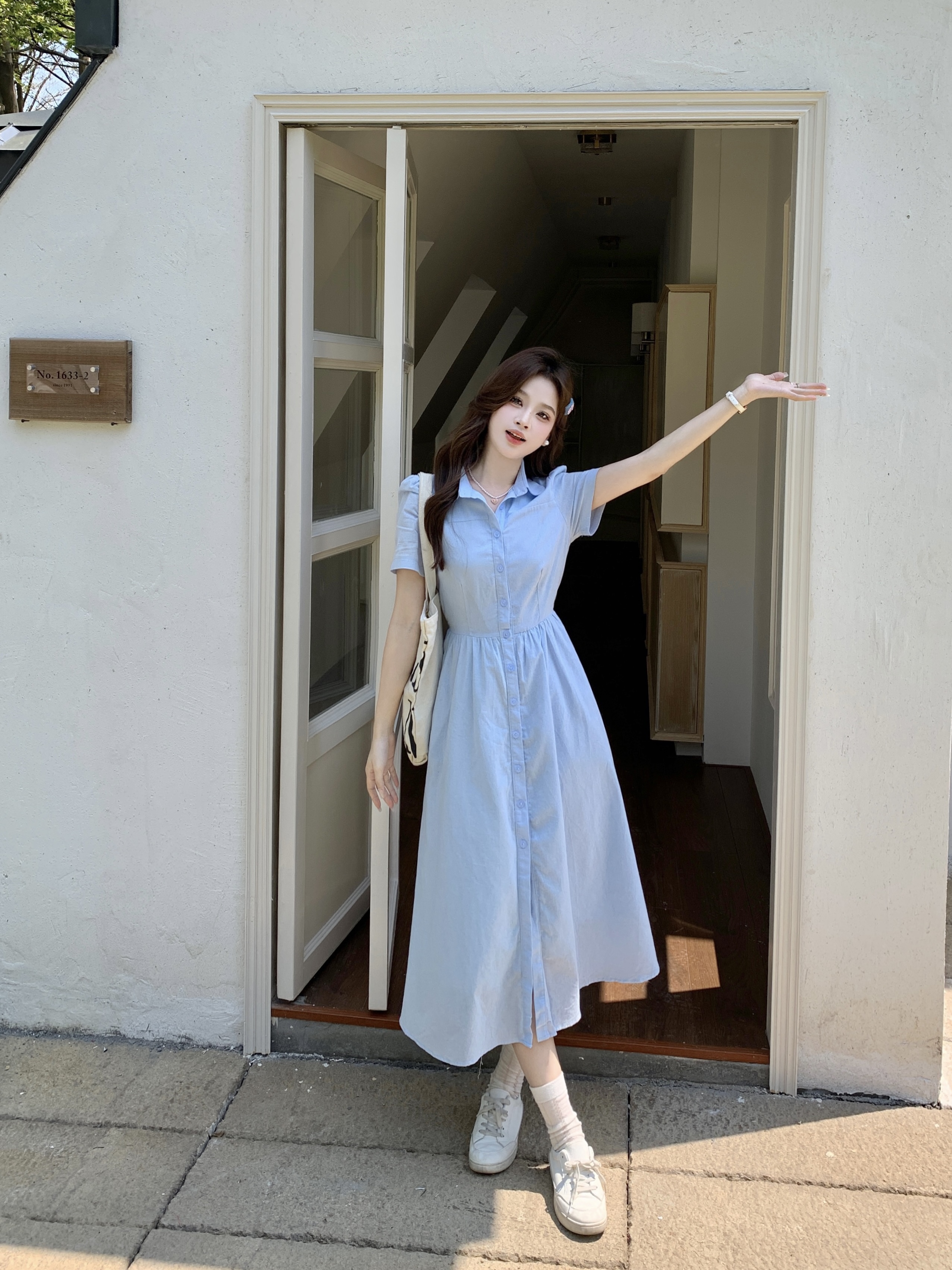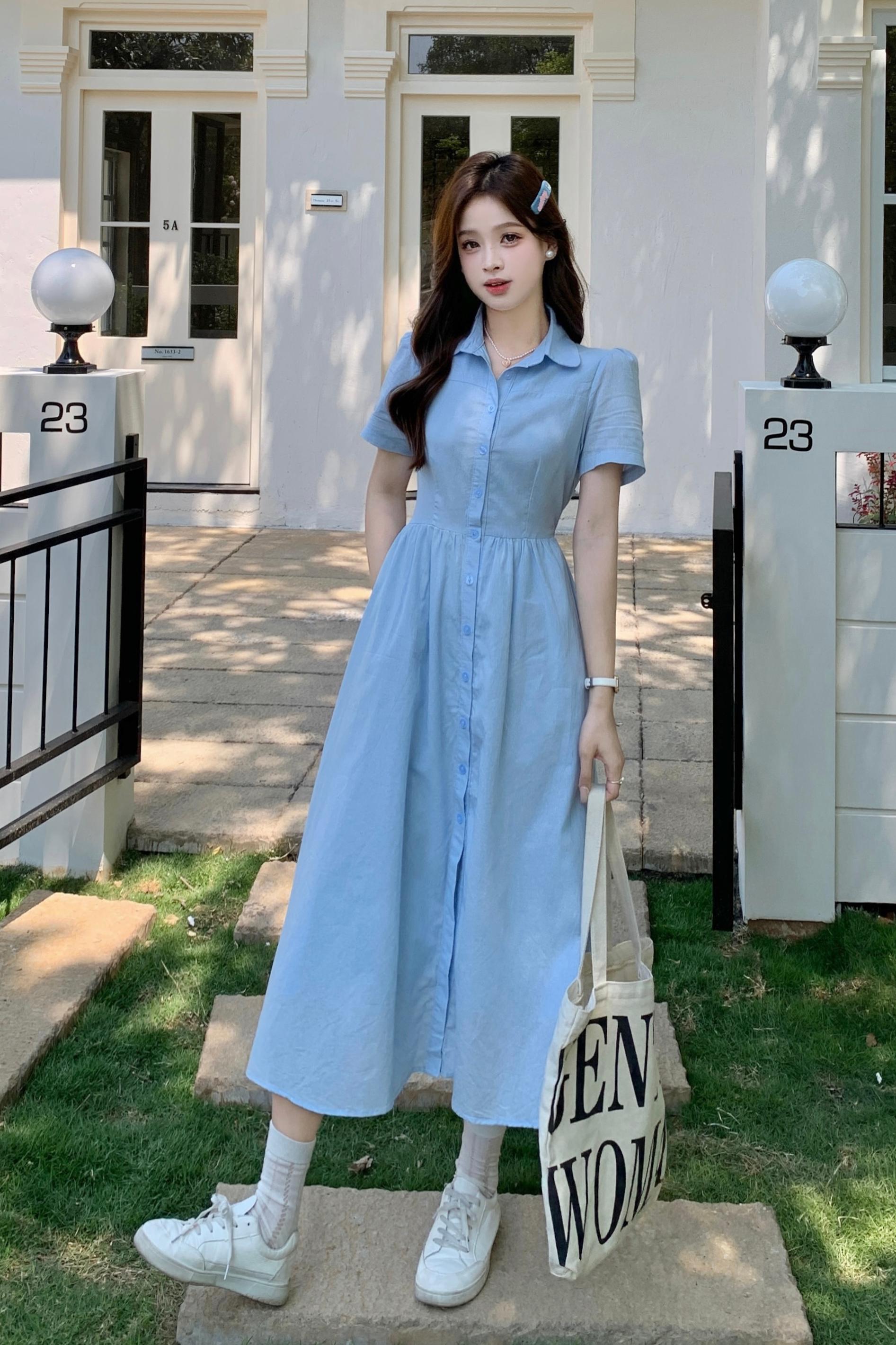 RY1468# 实拍大码蓝色法式娃娃领短袖2025夏季新款高级感百搭小个子中长裙