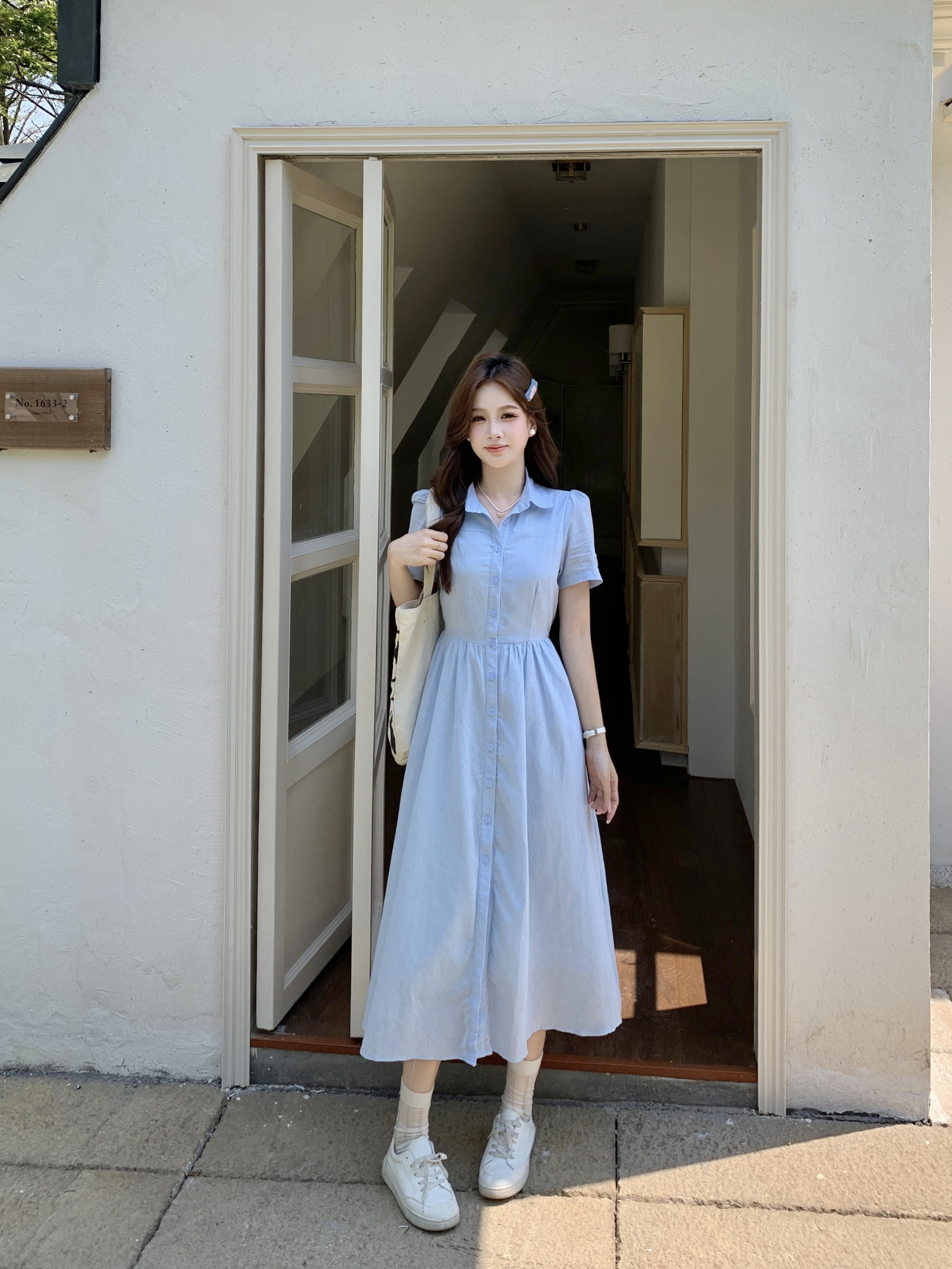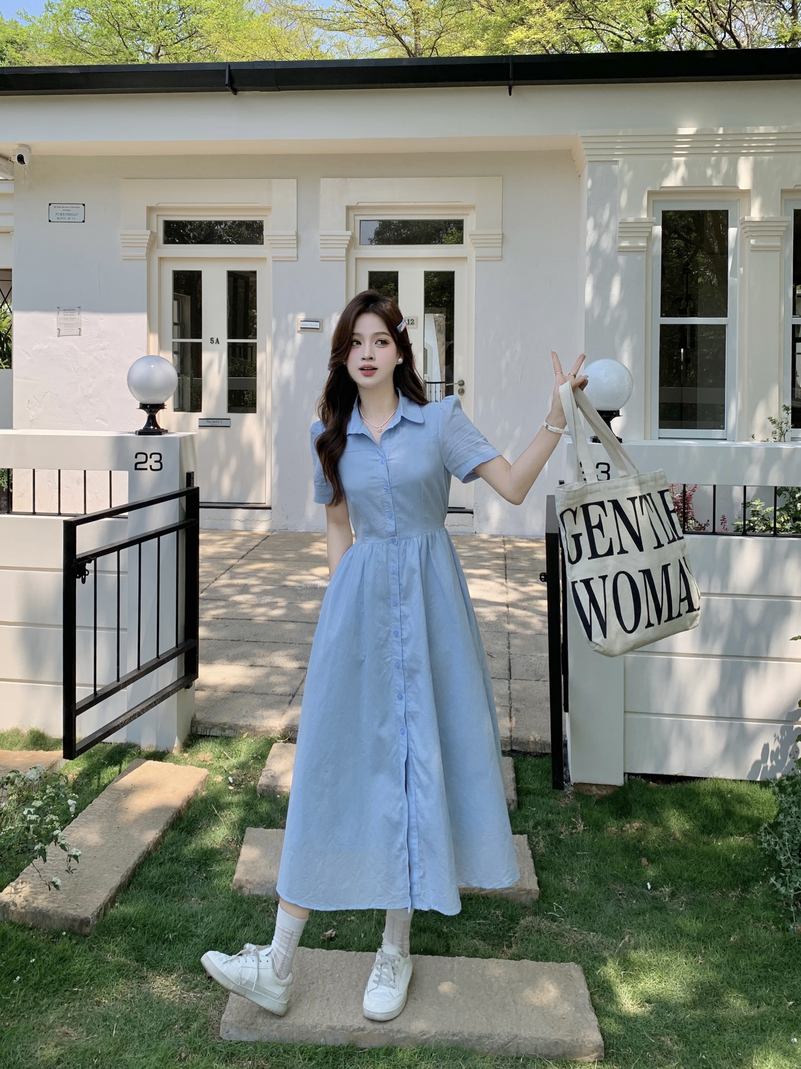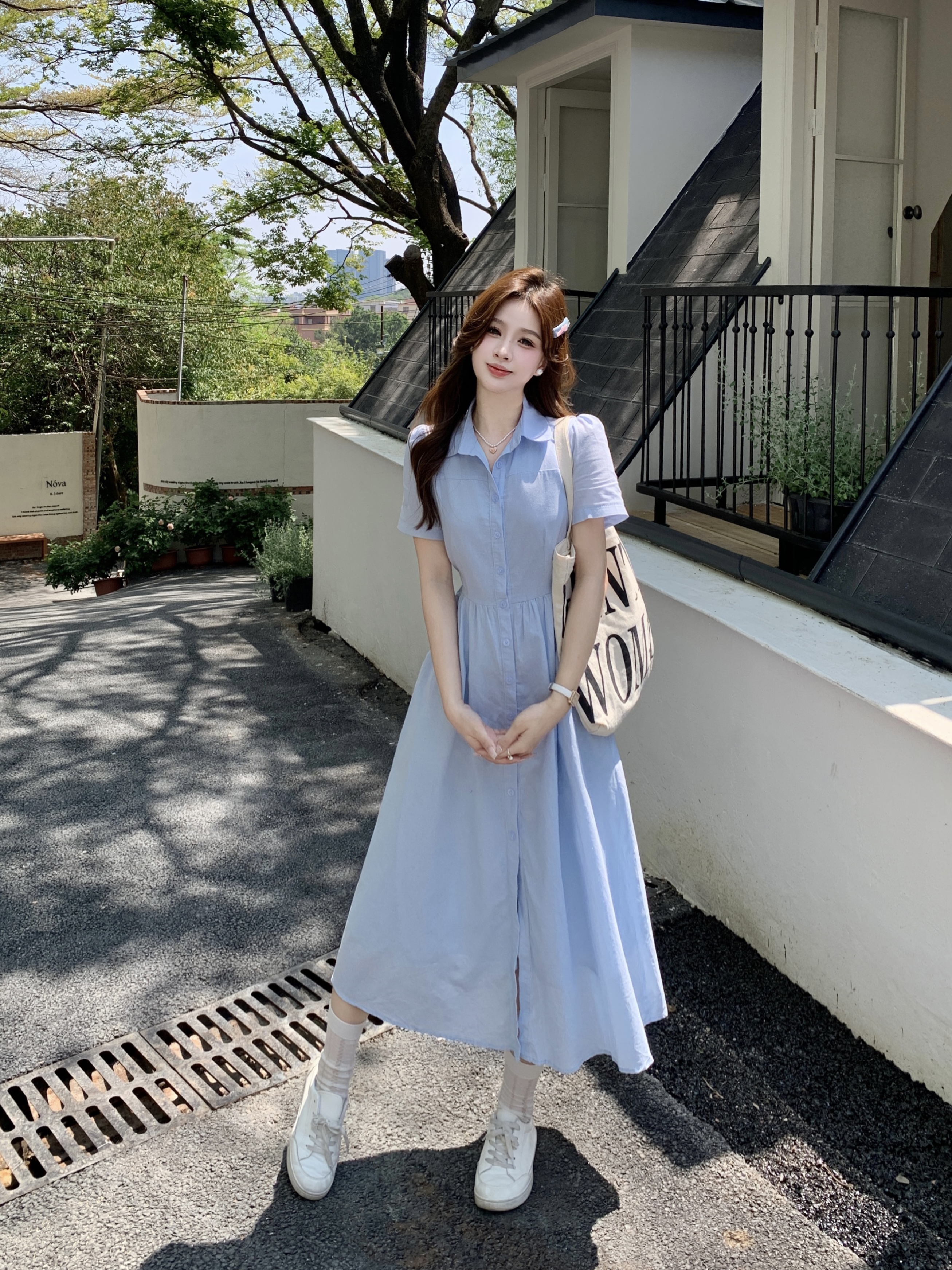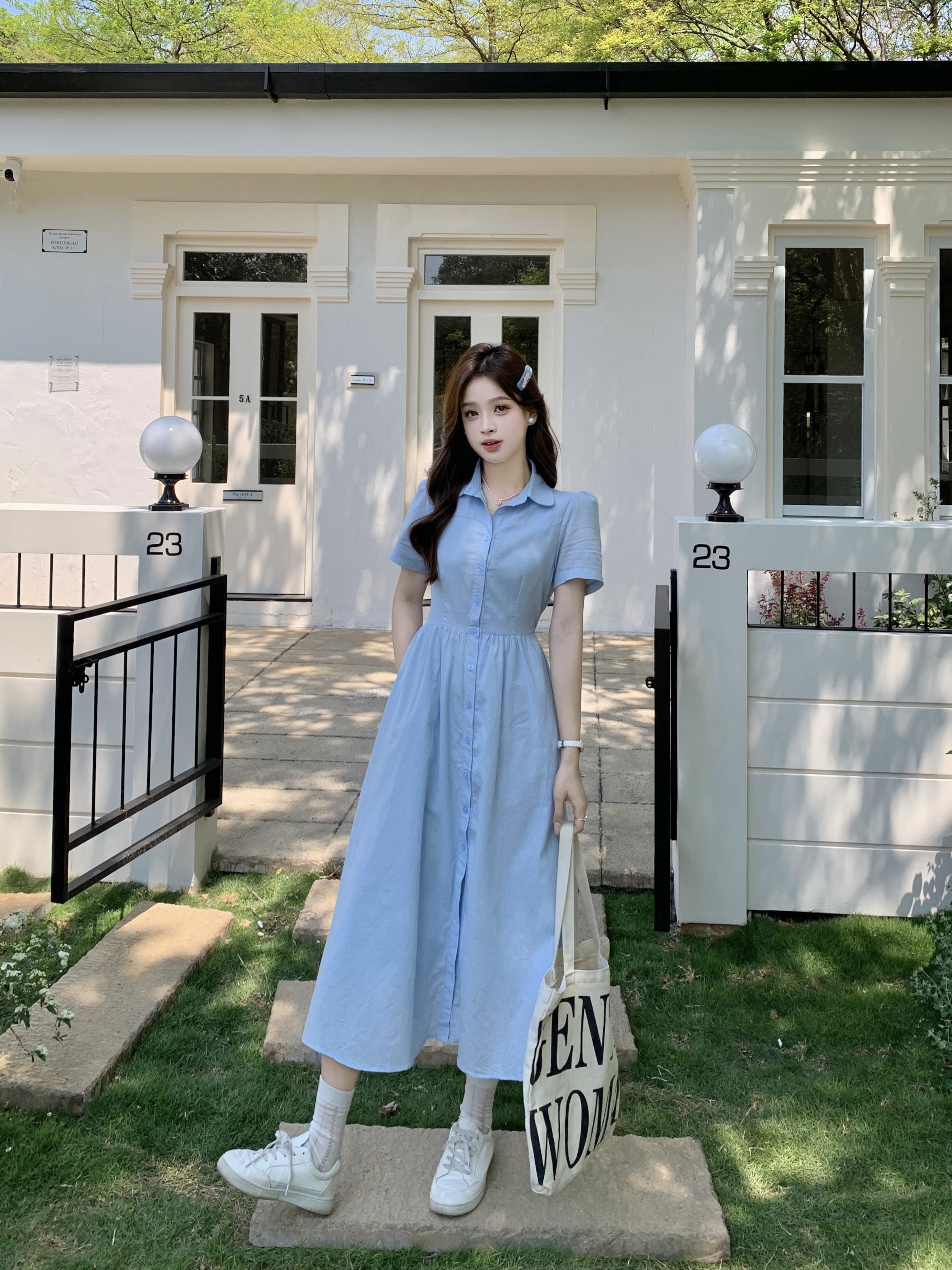 RY1468# 实拍大码蓝色法式娃娃领短袖2025夏季新款高级感百搭小个子中长裙