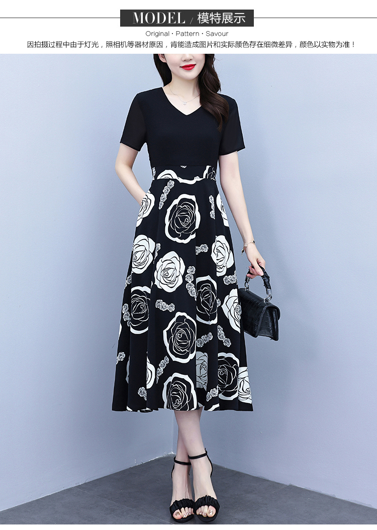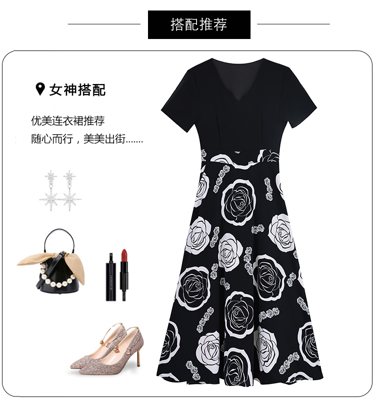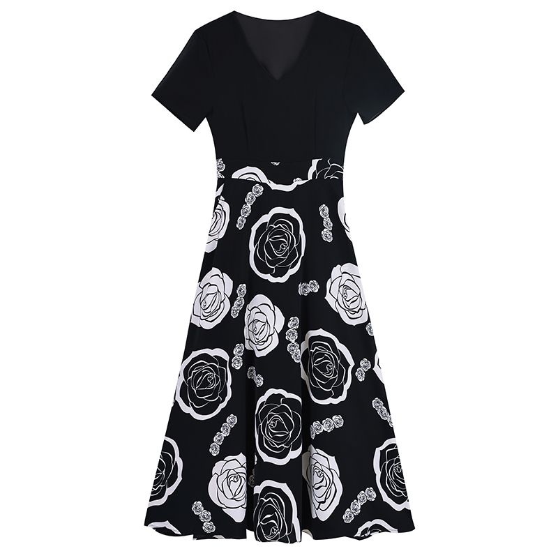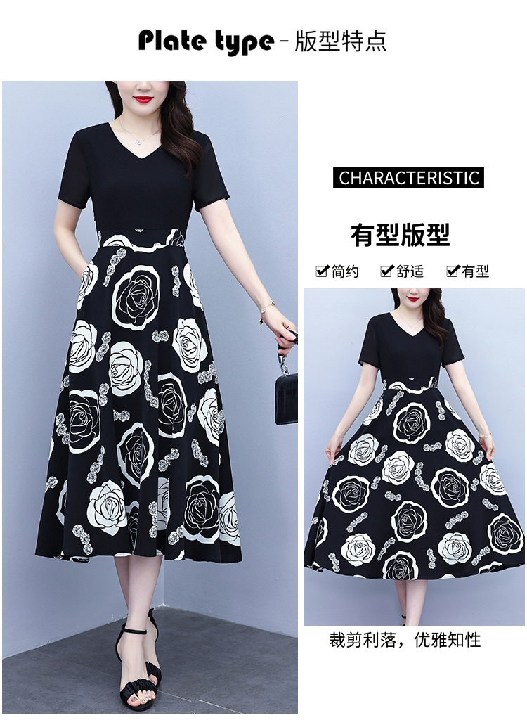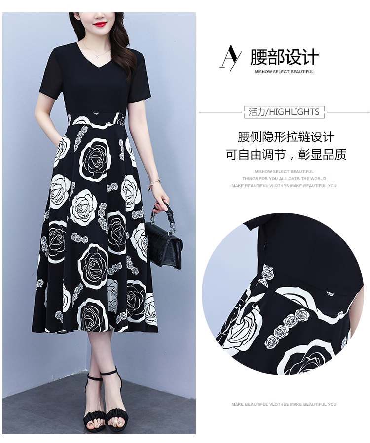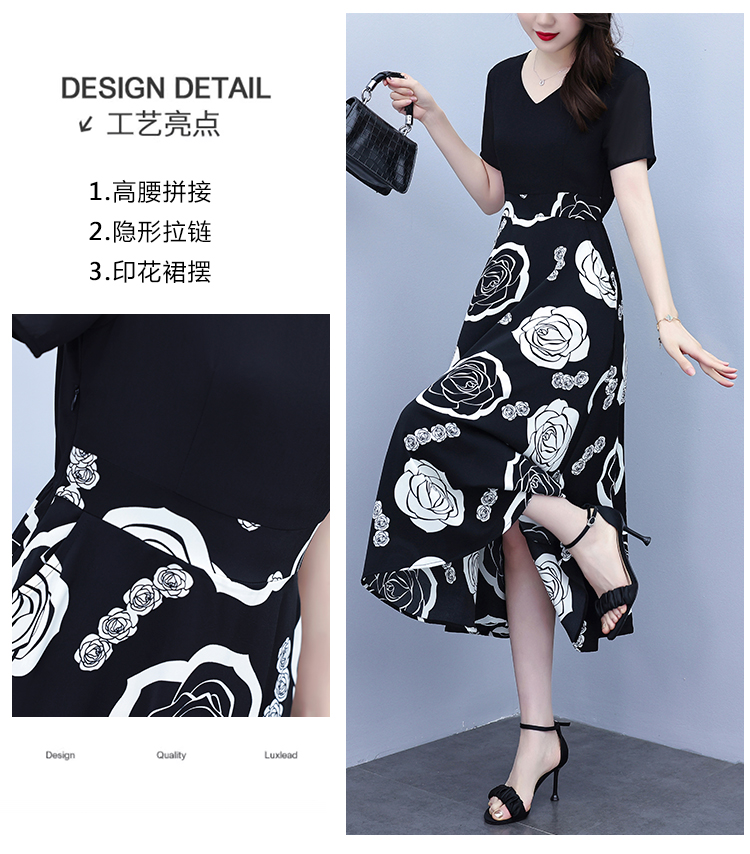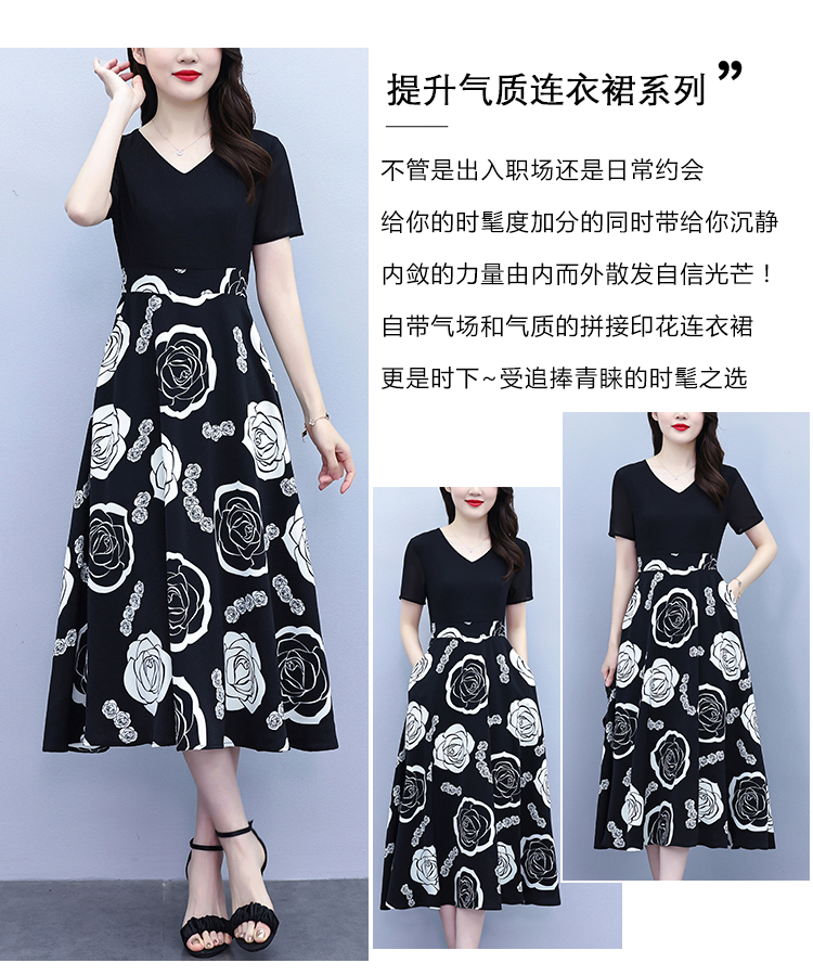 RY1474# 2026新款大码时尚拼接印花连衣裙女夏收腰遮肚子显瘦气质长裙