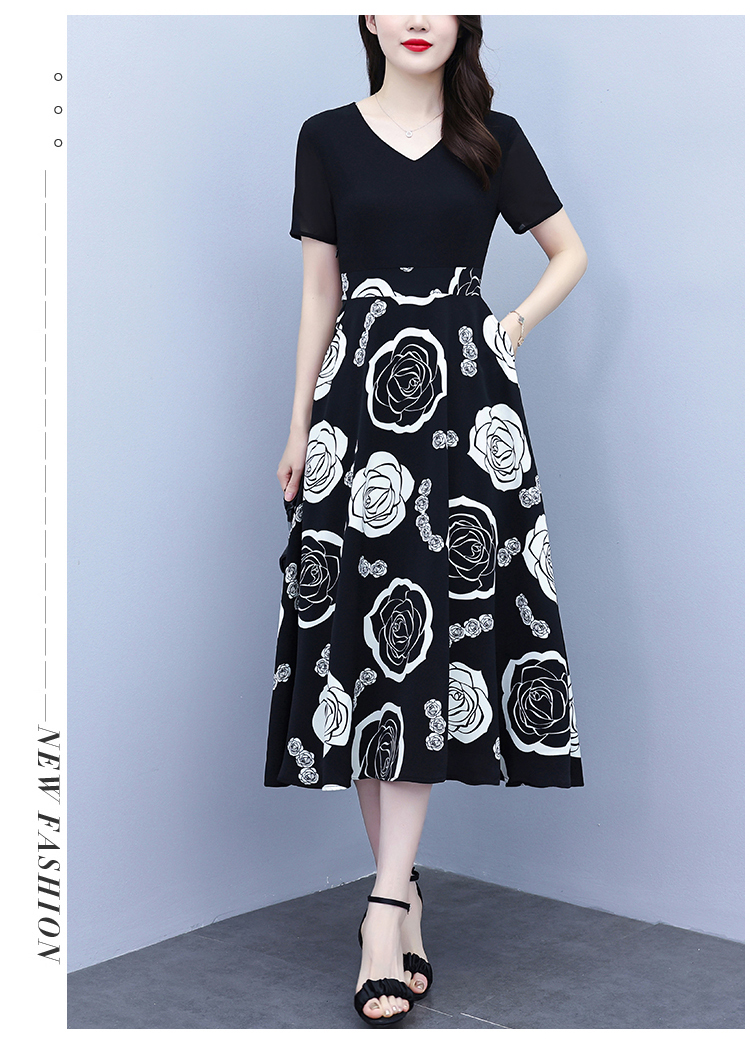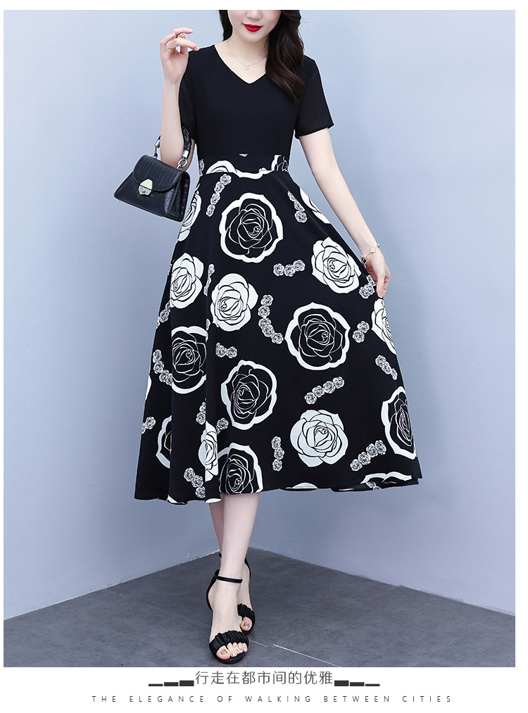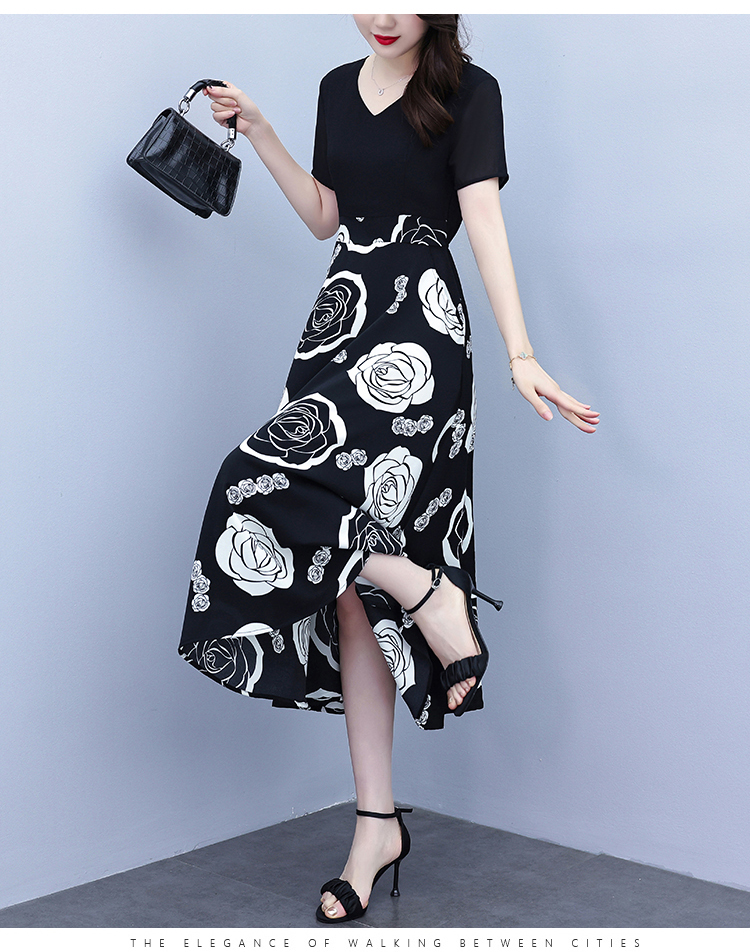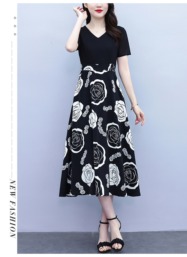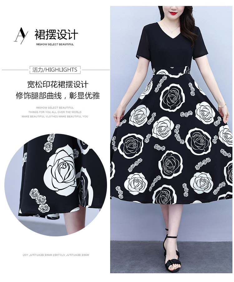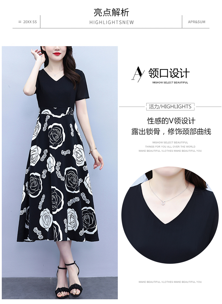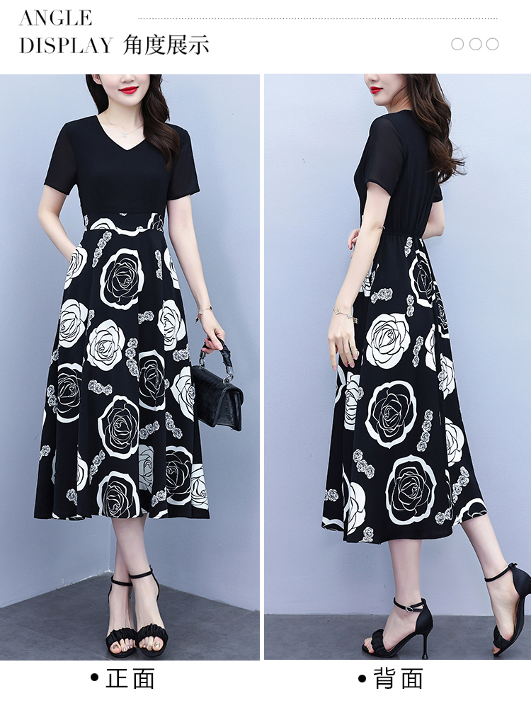 RY1474# 2026新款大码时尚拼接印花连衣裙女夏收腰遮肚子显瘦气质长裙
