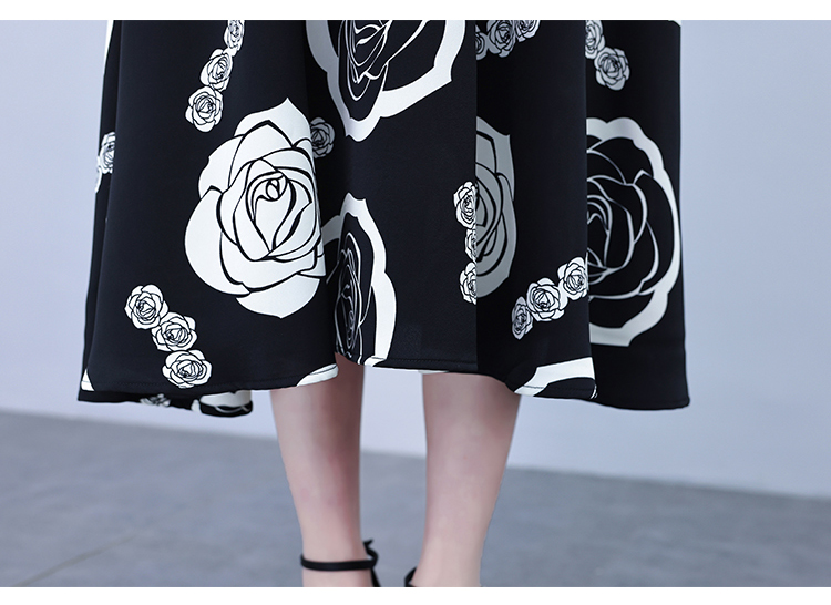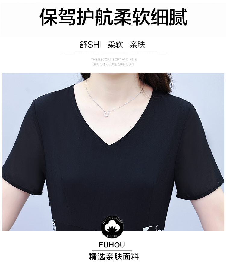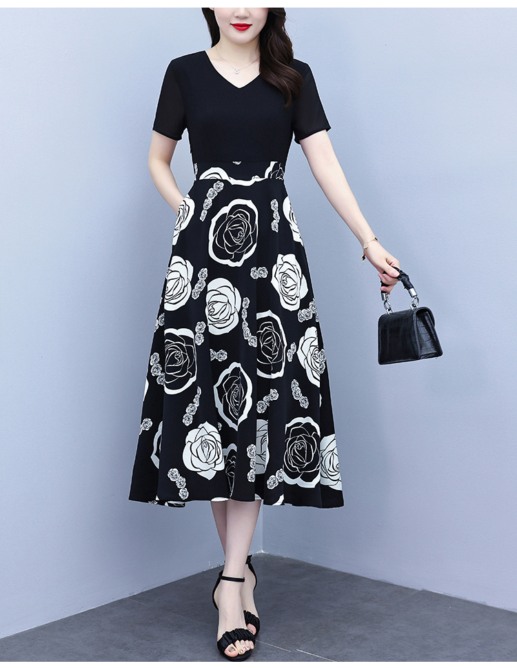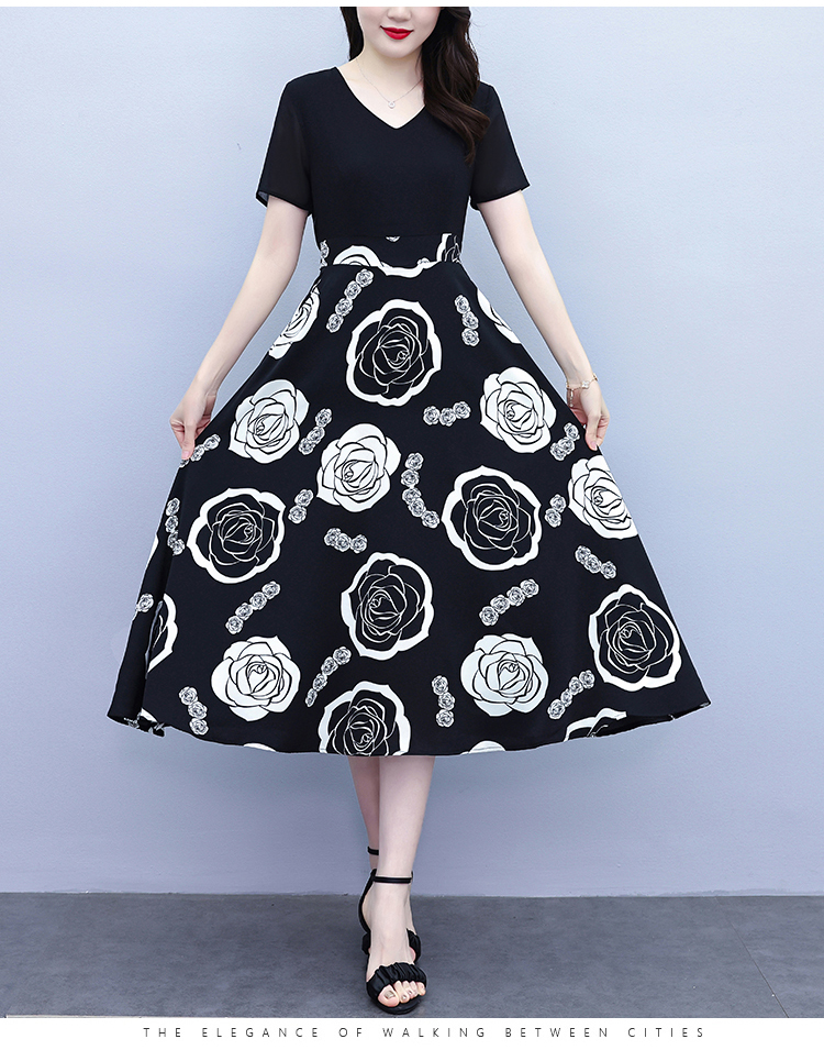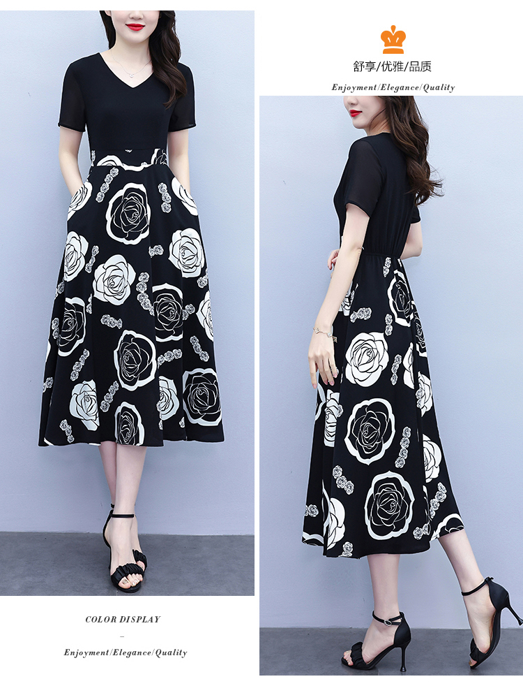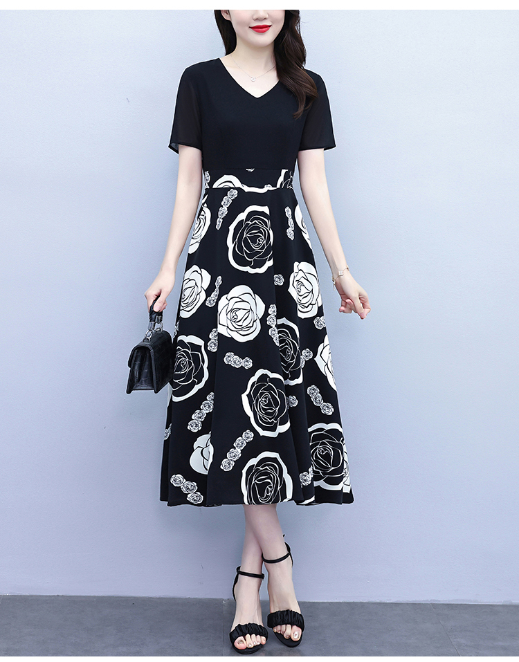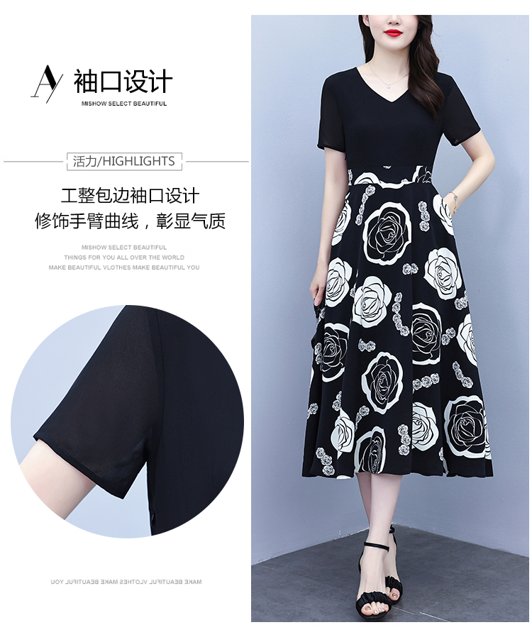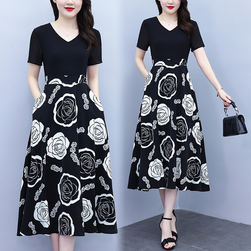 RY1474# 2026新款大码时尚拼接印花连衣裙女夏收腰遮肚子显瘦气质长裙