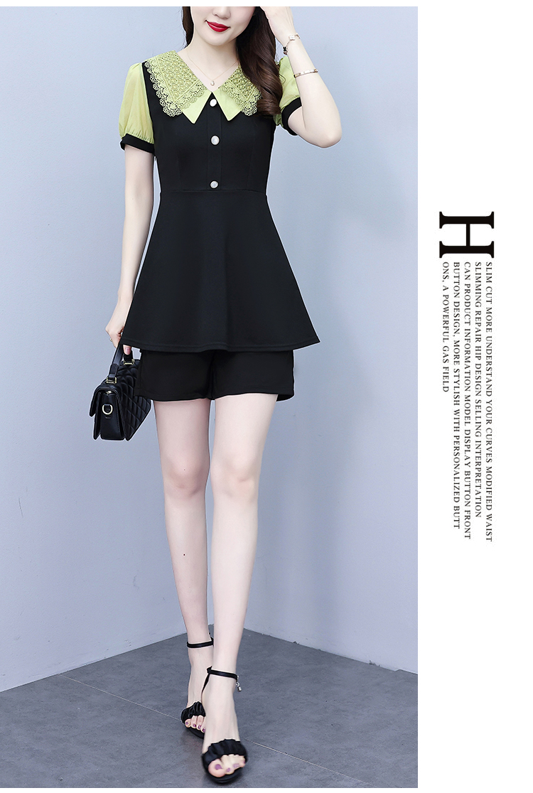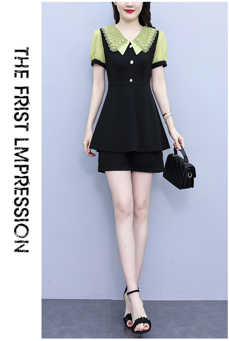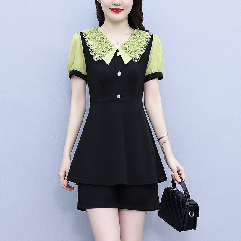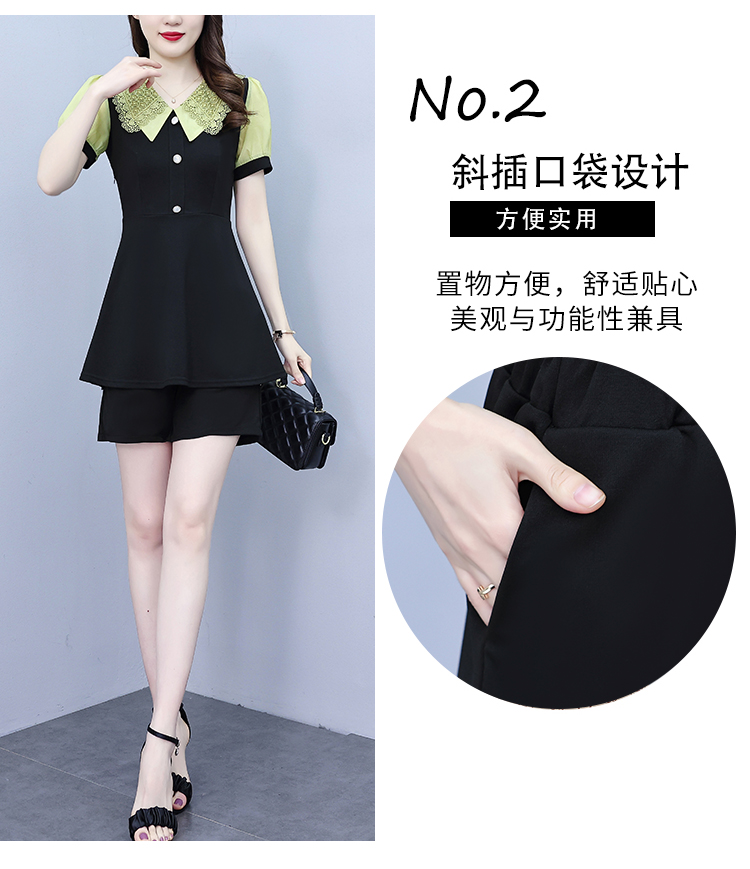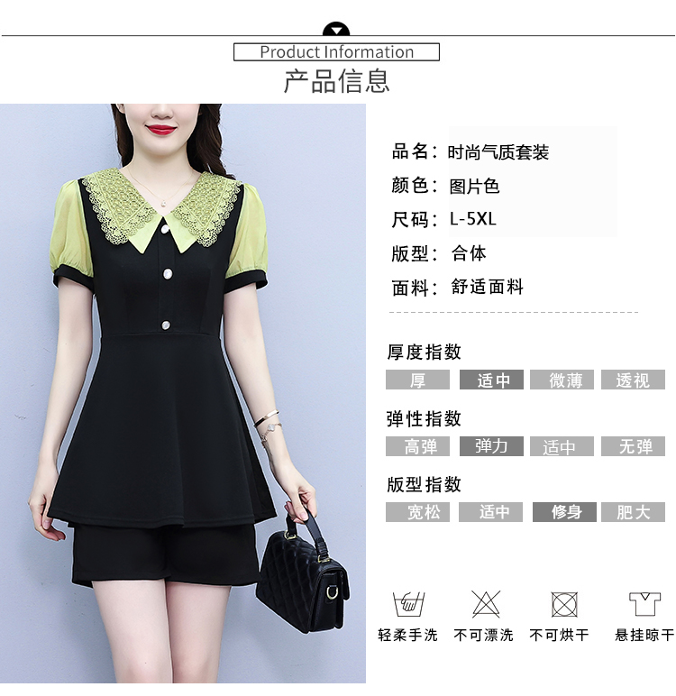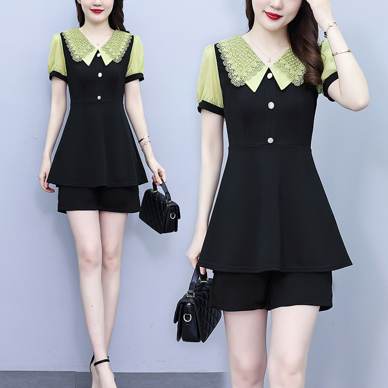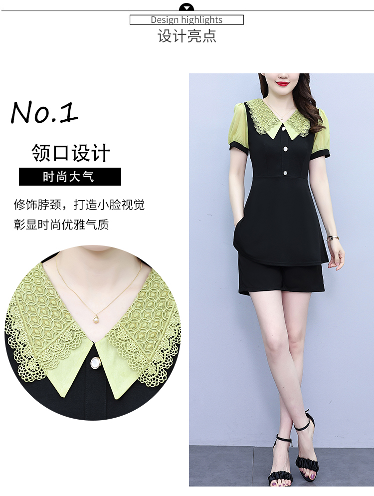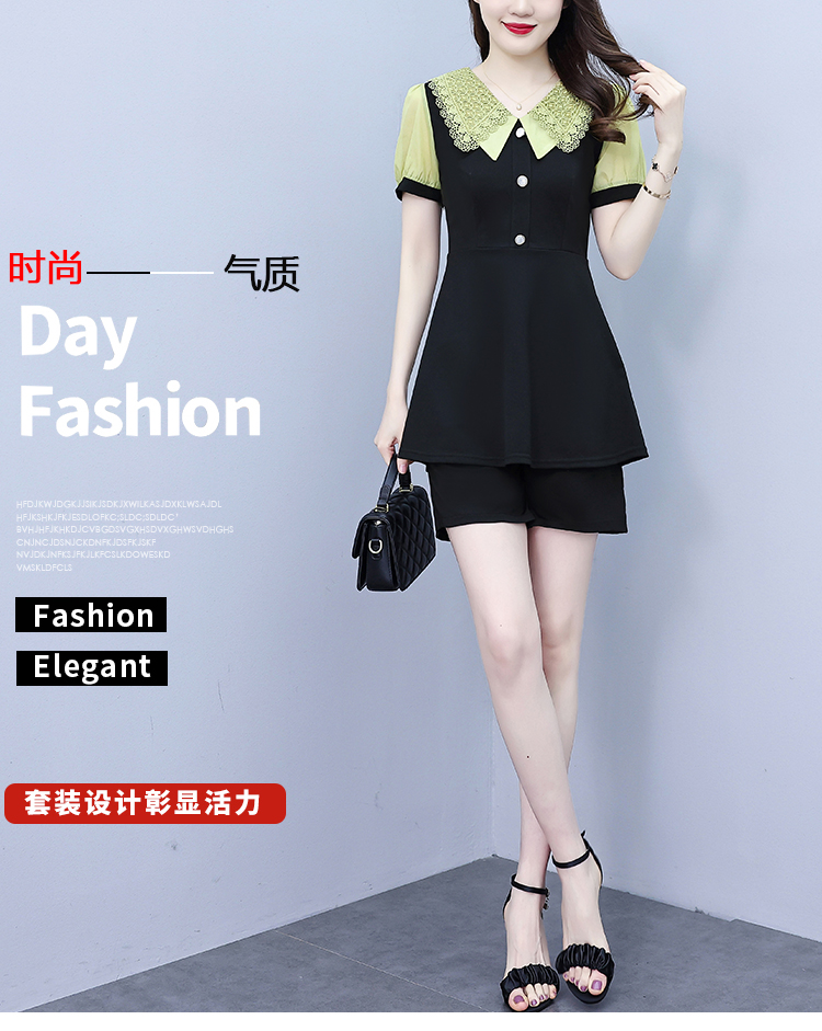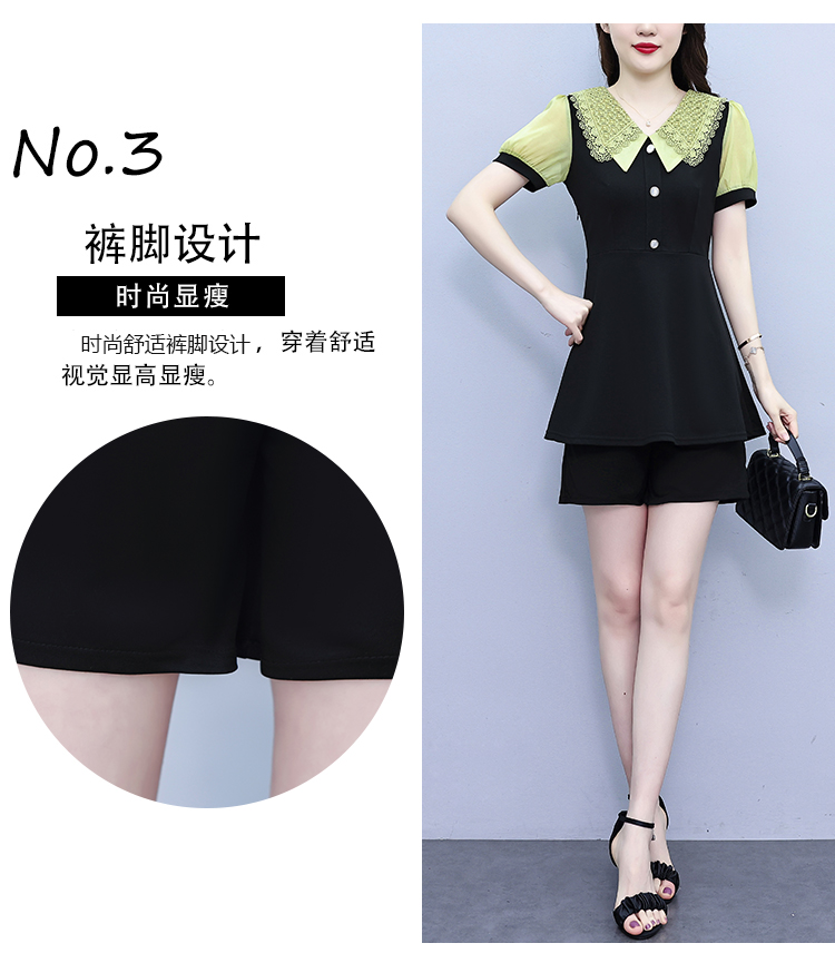 RY1578# 大码女装2026夏季胖mm娃娃领气质拼接修身上衣+短裤两件套套装女