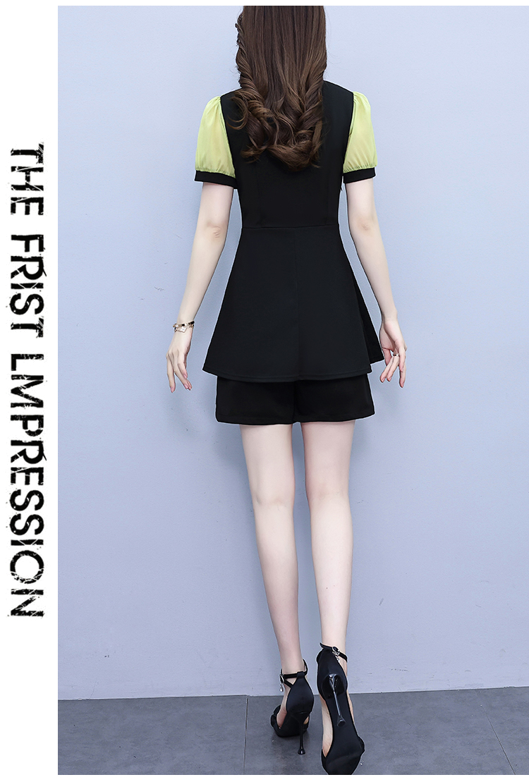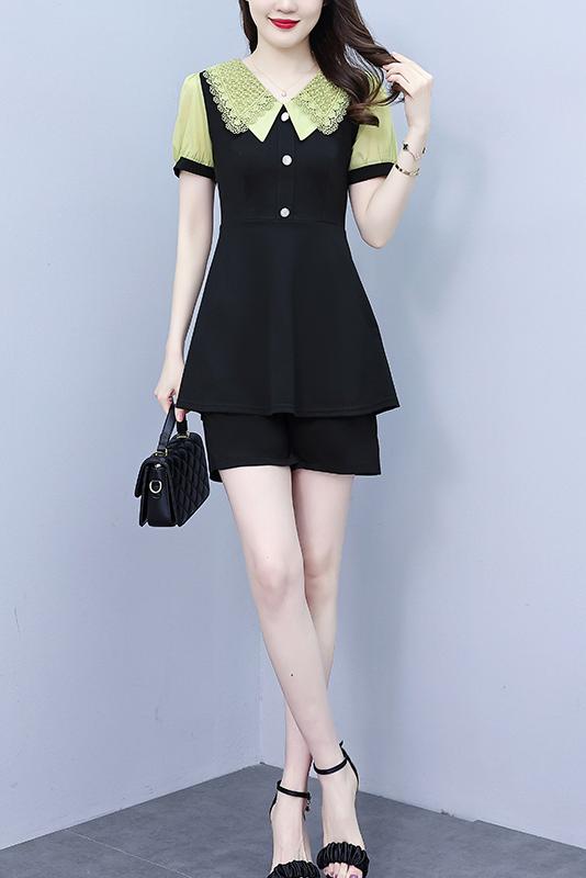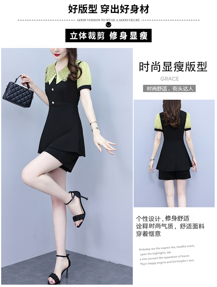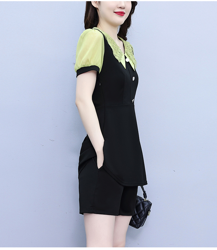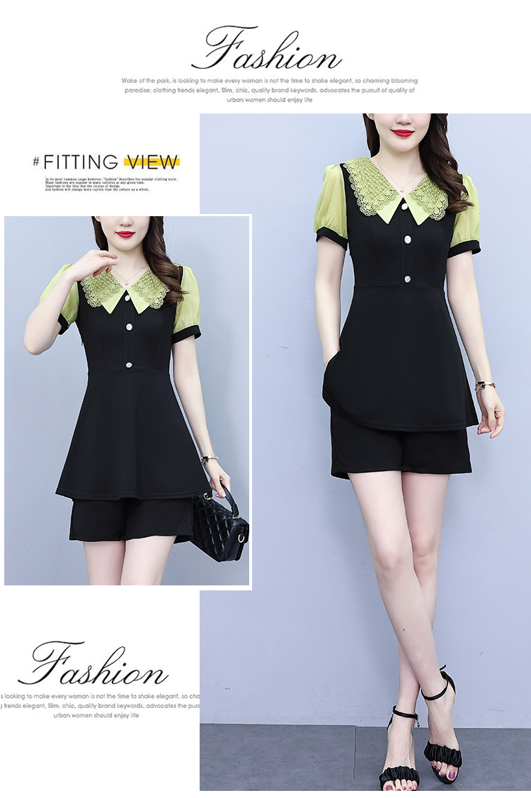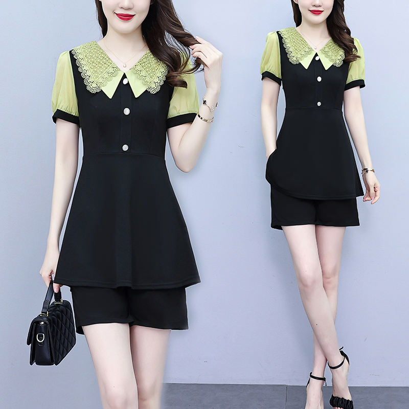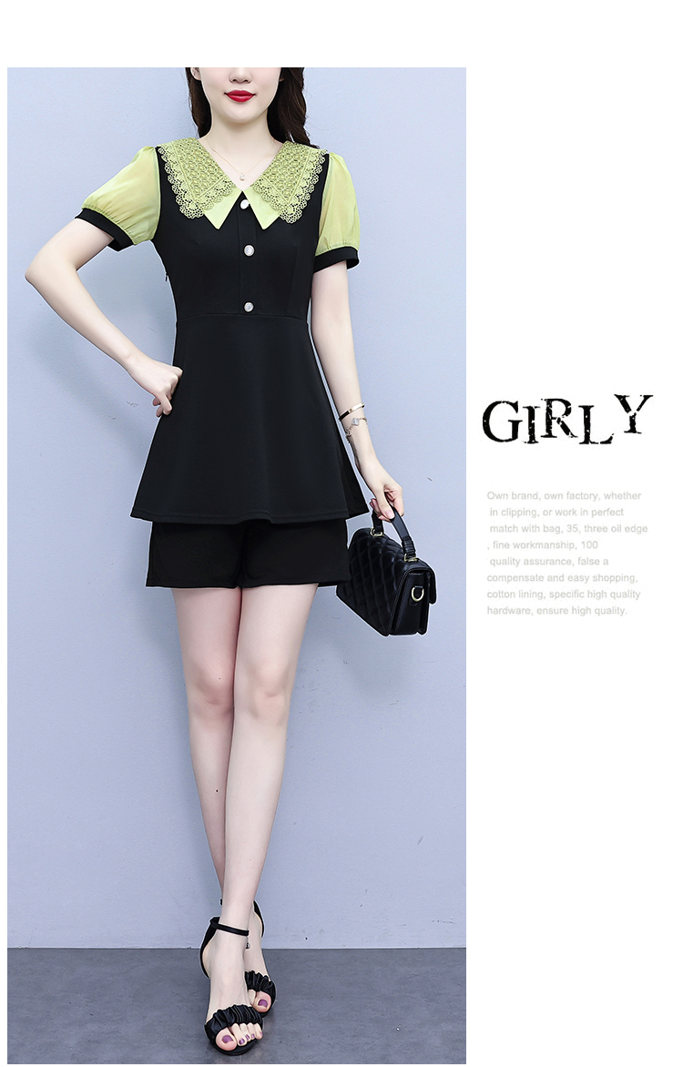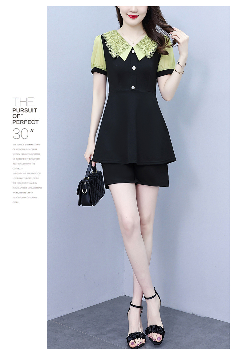 RY1578# 大码女装2026夏季胖mm娃娃领气质拼接修身上衣+短裤两件套套装女