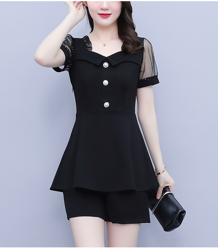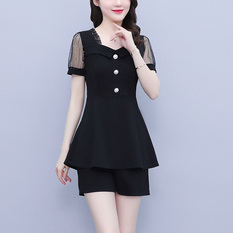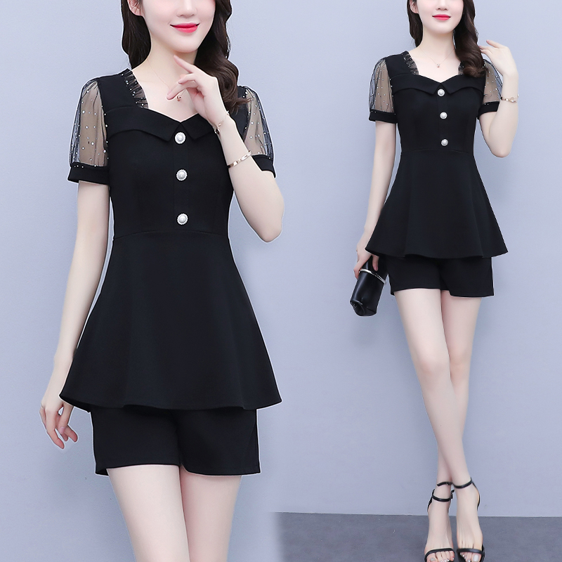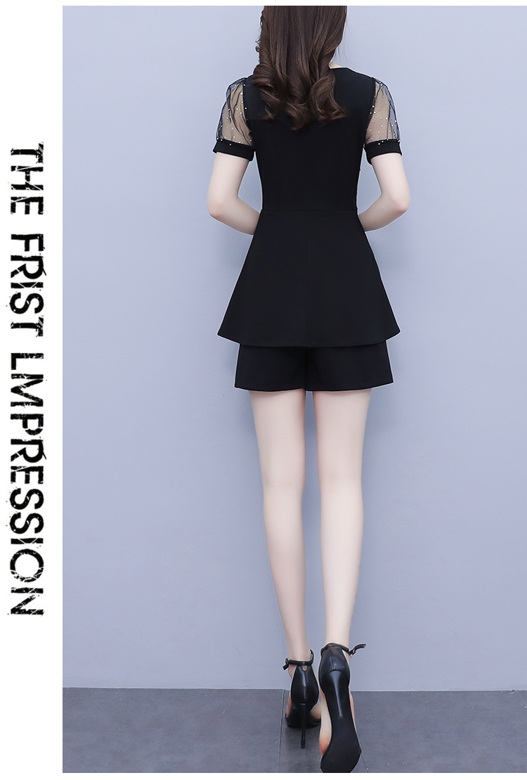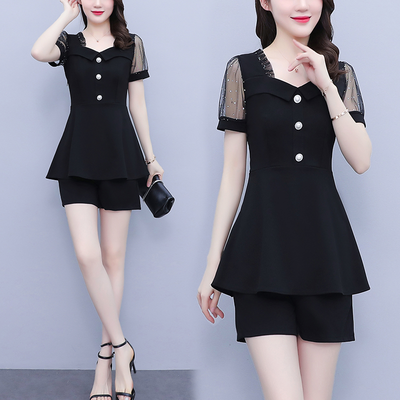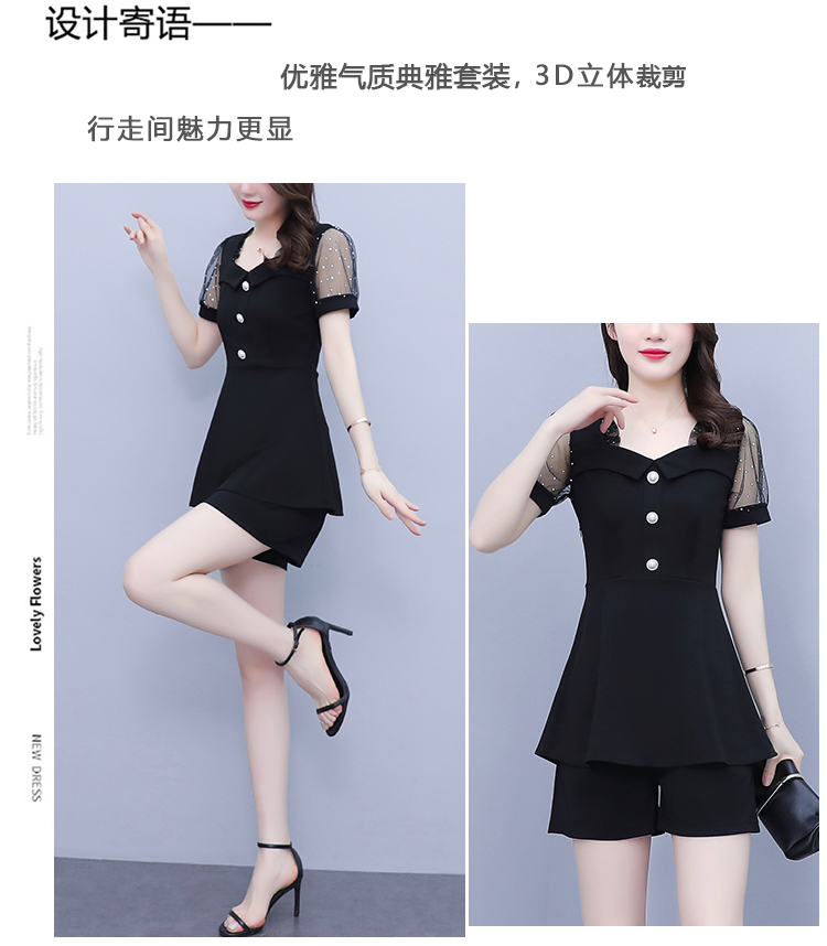 RY1579# 大码女装2026夏季新款胖mm亮片网纱拼接修身上衣+短裤两件套套装
