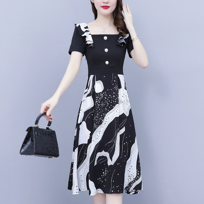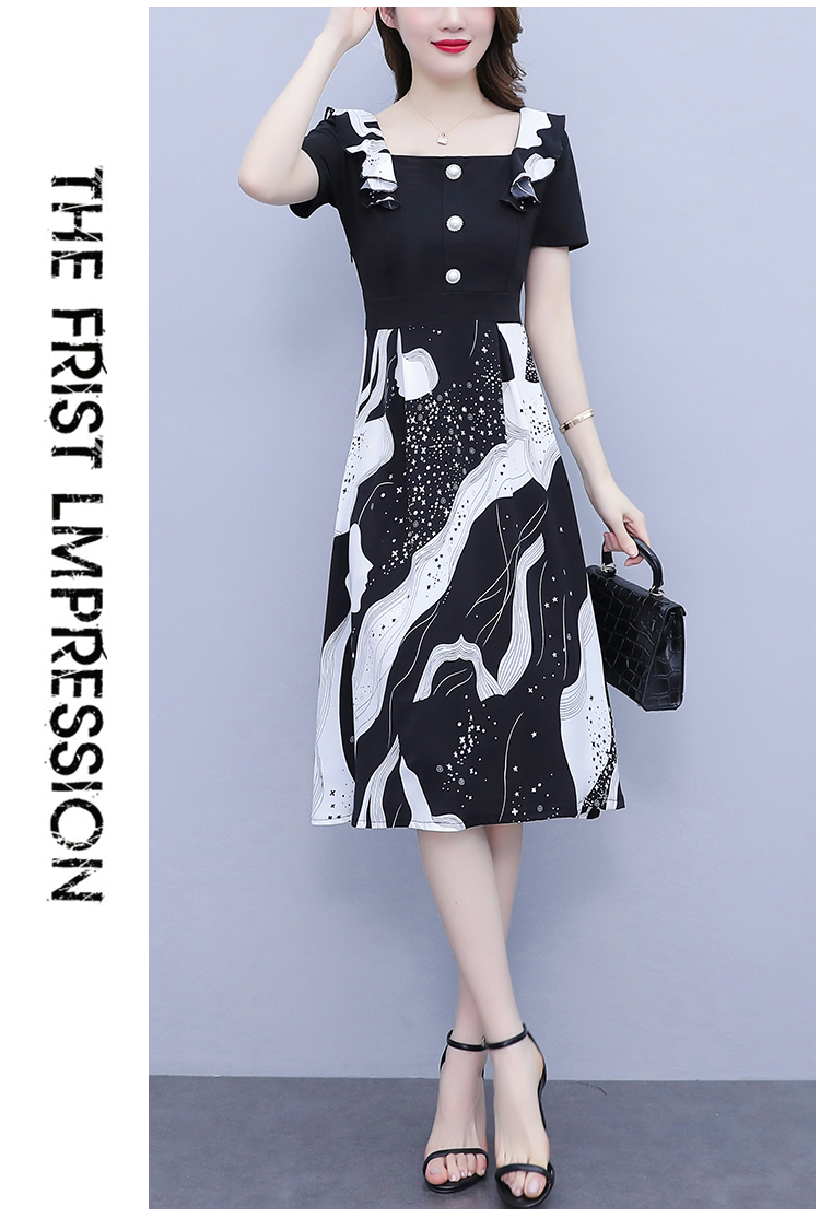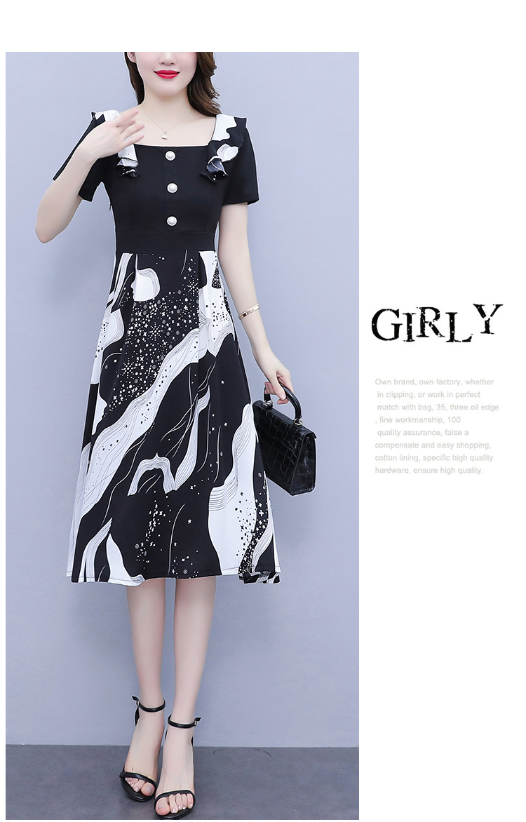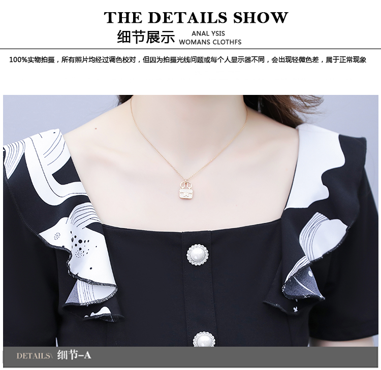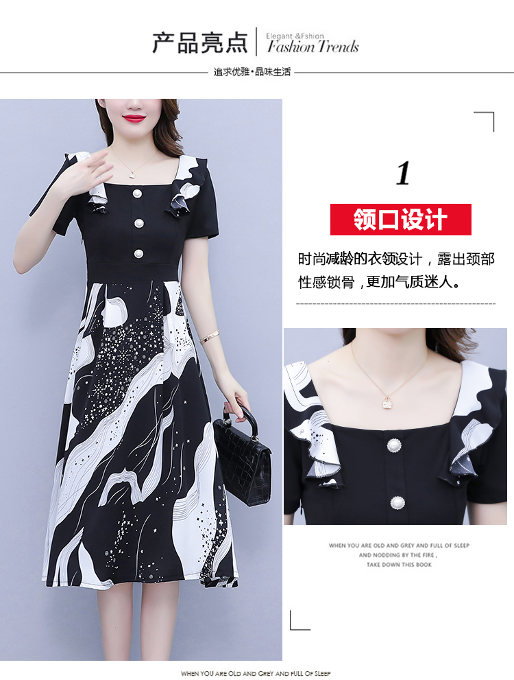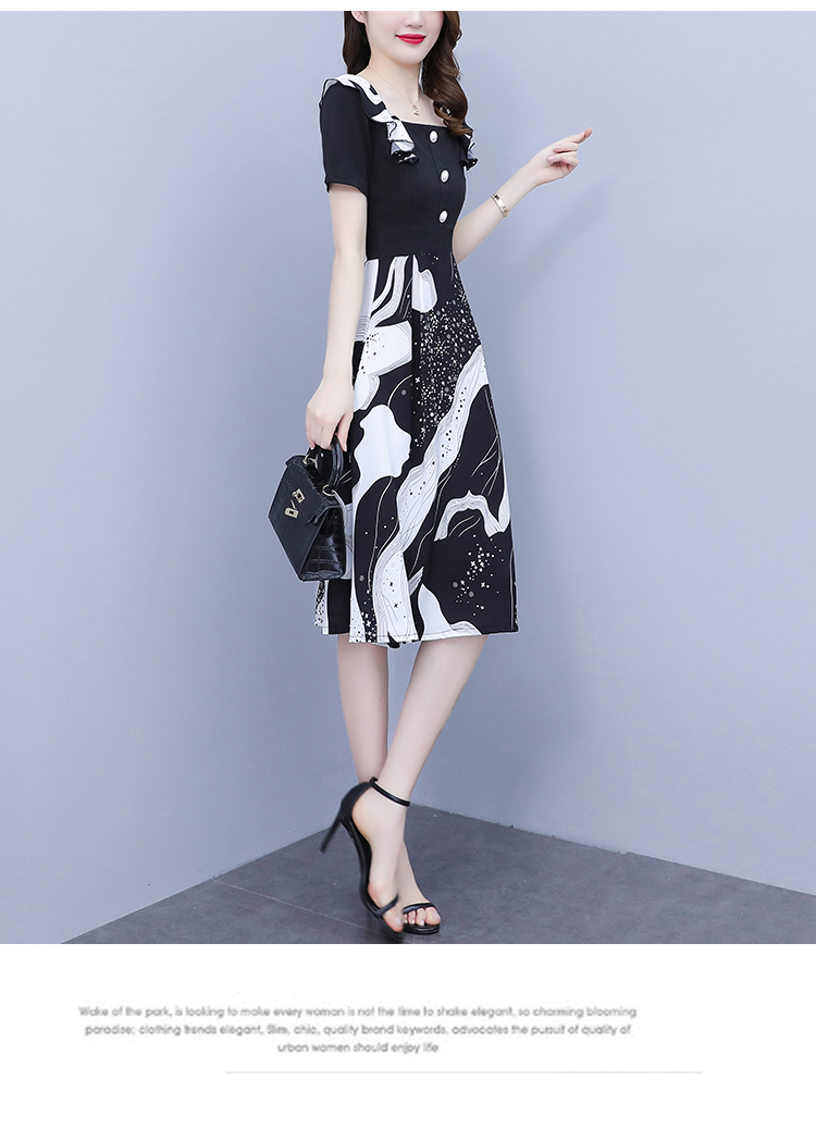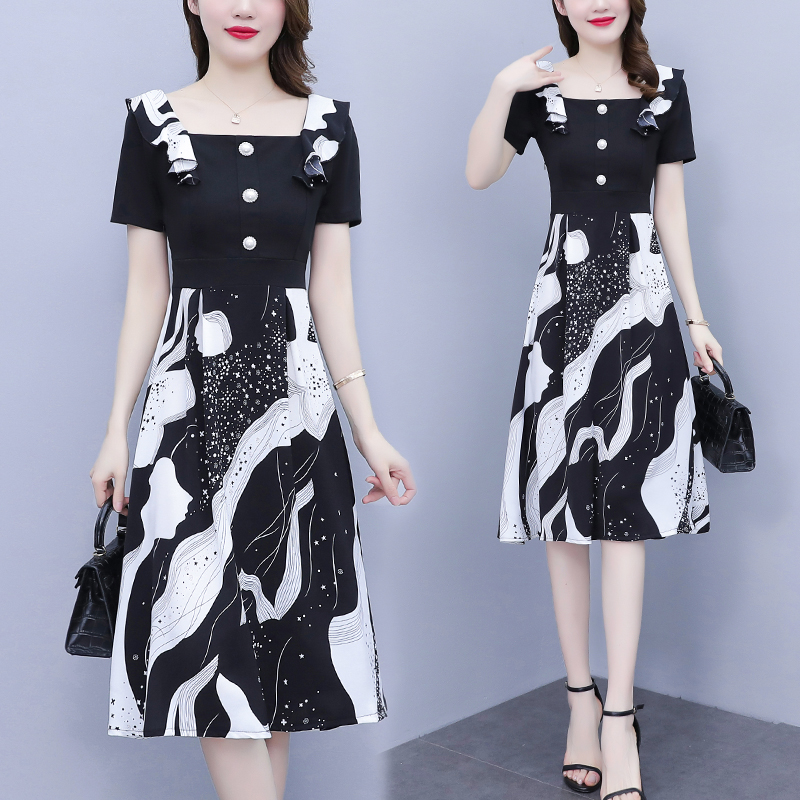 RY1581# 大码女装2026夏韩版季胖mm印花拼接荷叶领简约修身洋气连衣裙女