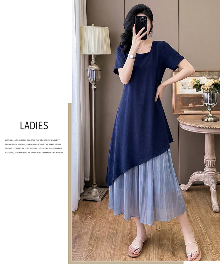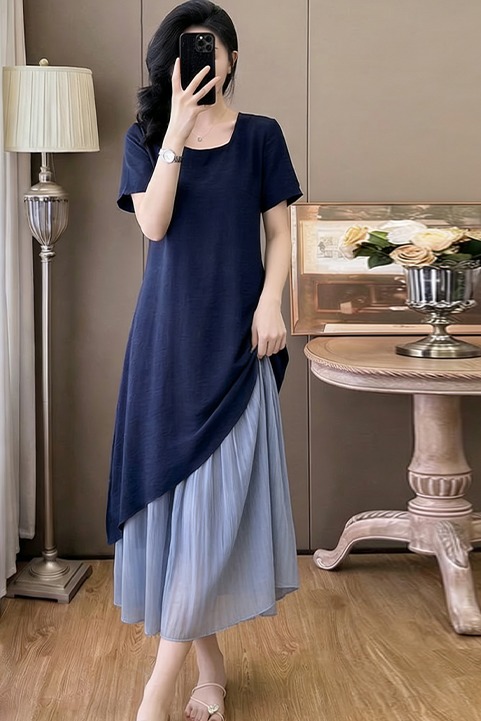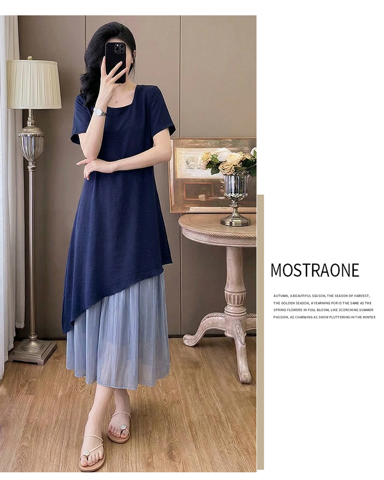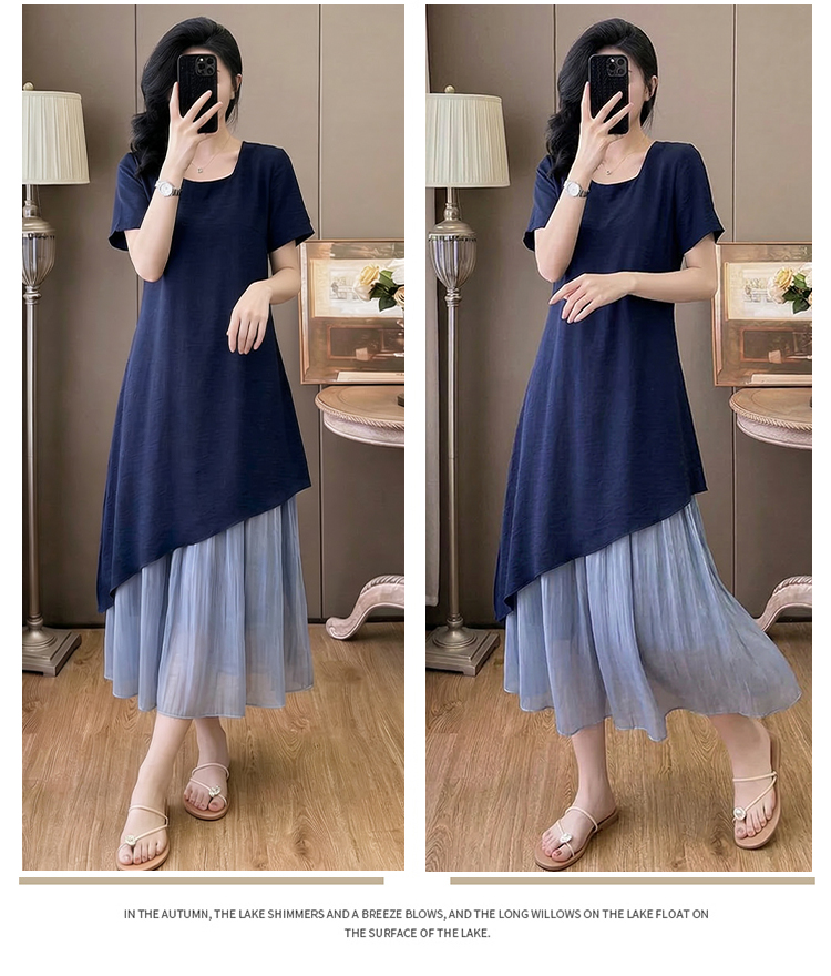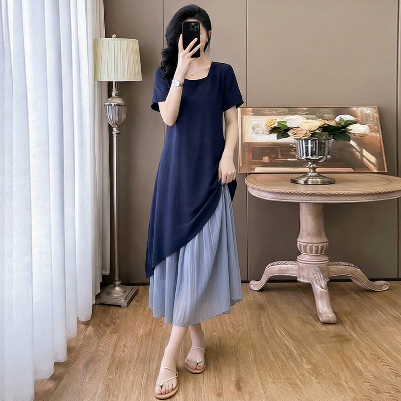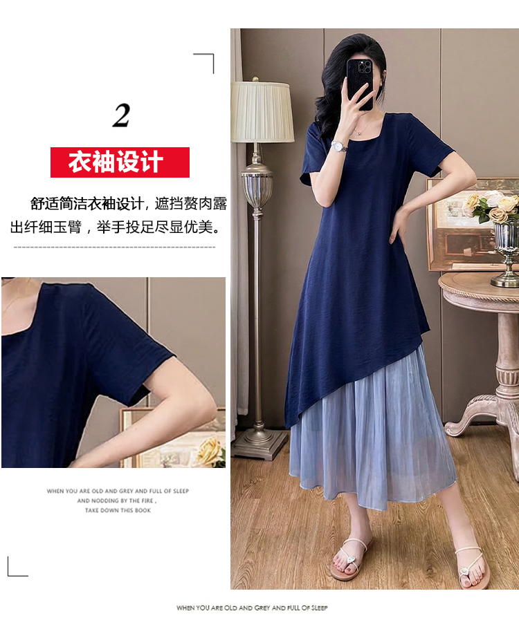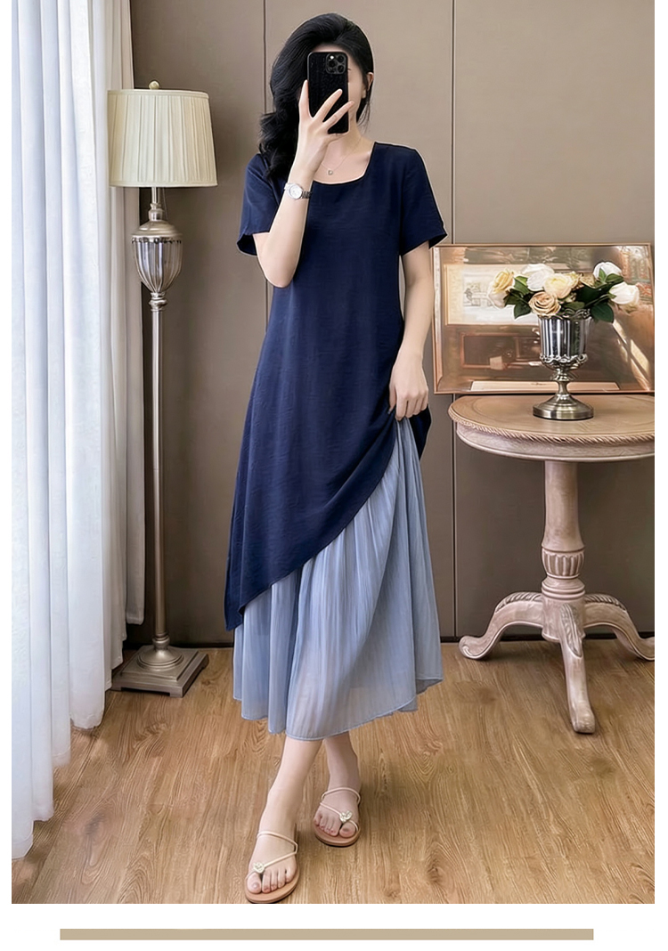 RY1606# 2026夏季新款法式高级感时尚拼接假两件显瘦中长款连衣裙女