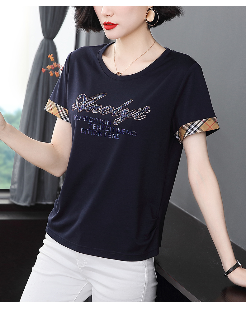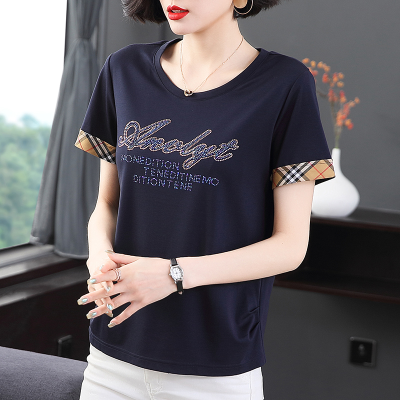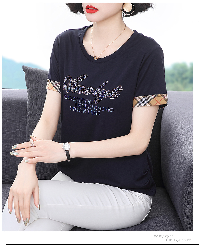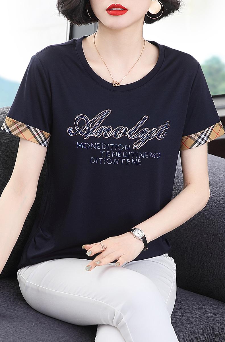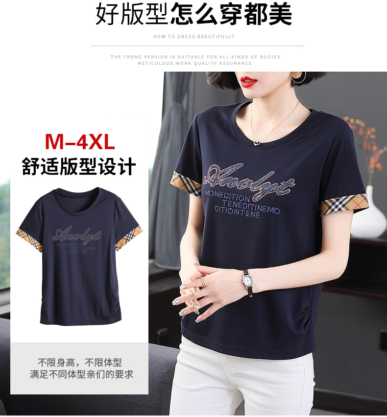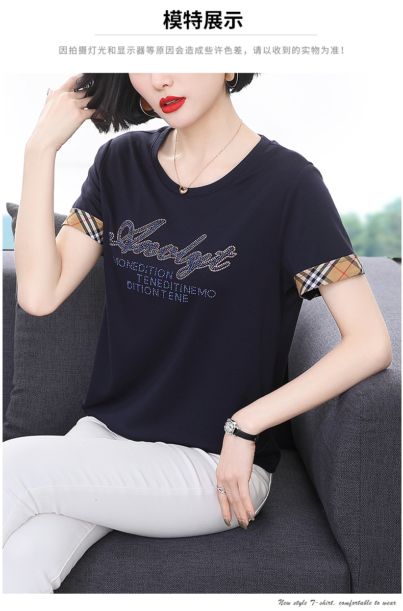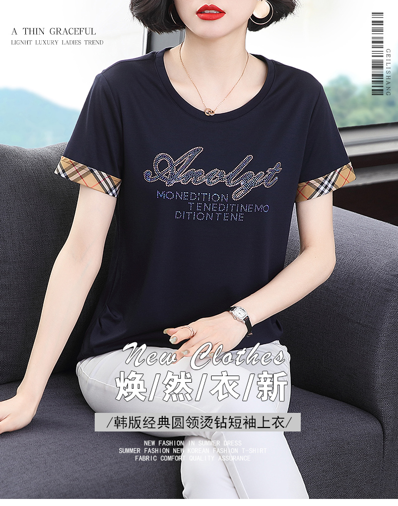 RY1612# 妈妈烫钻字母短袖上衣夏装洋气减龄小衫百搭大码宽松圆领t恤女潮