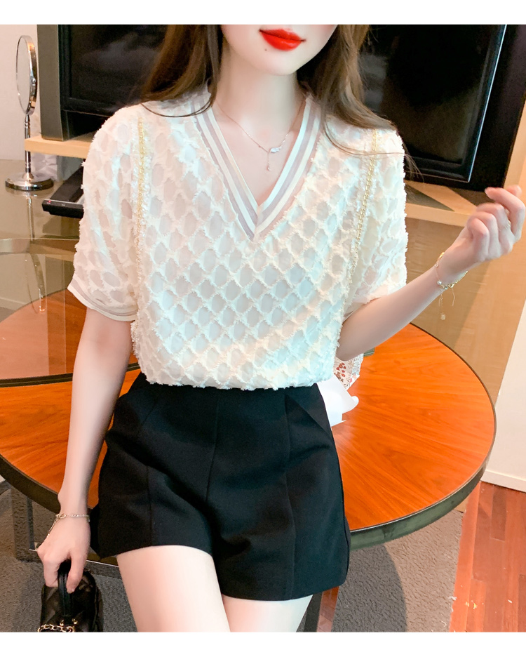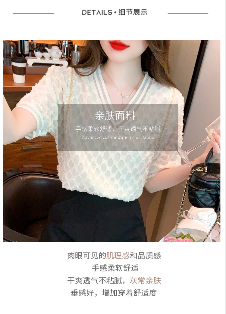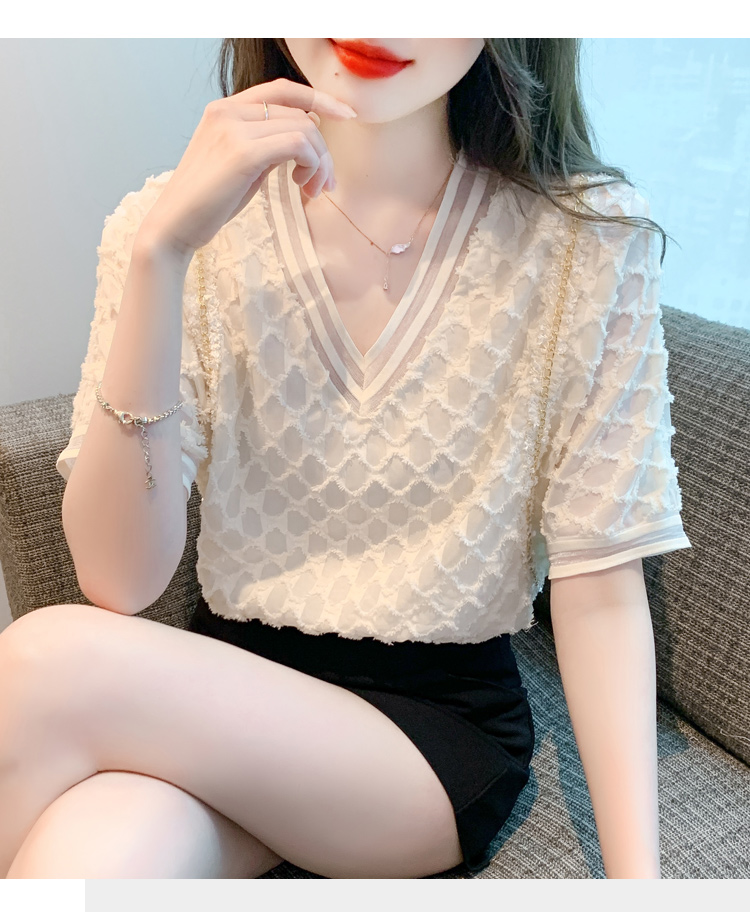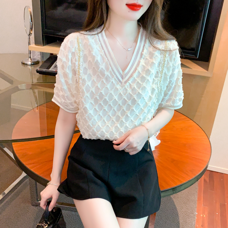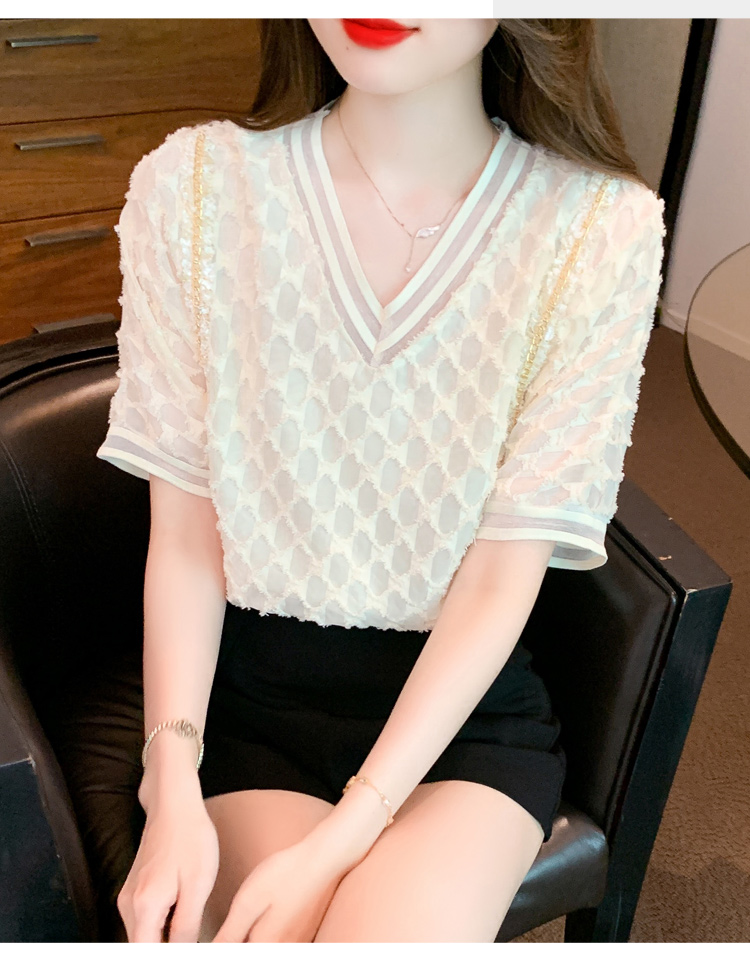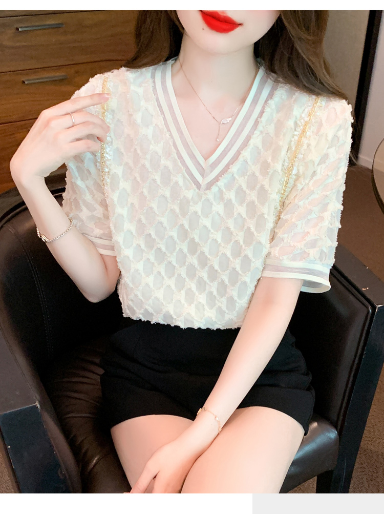 RY1666# 已出货2026夏季新款V领套头蕾丝衫雪纺衫格纹短袖洋气小衫气质女