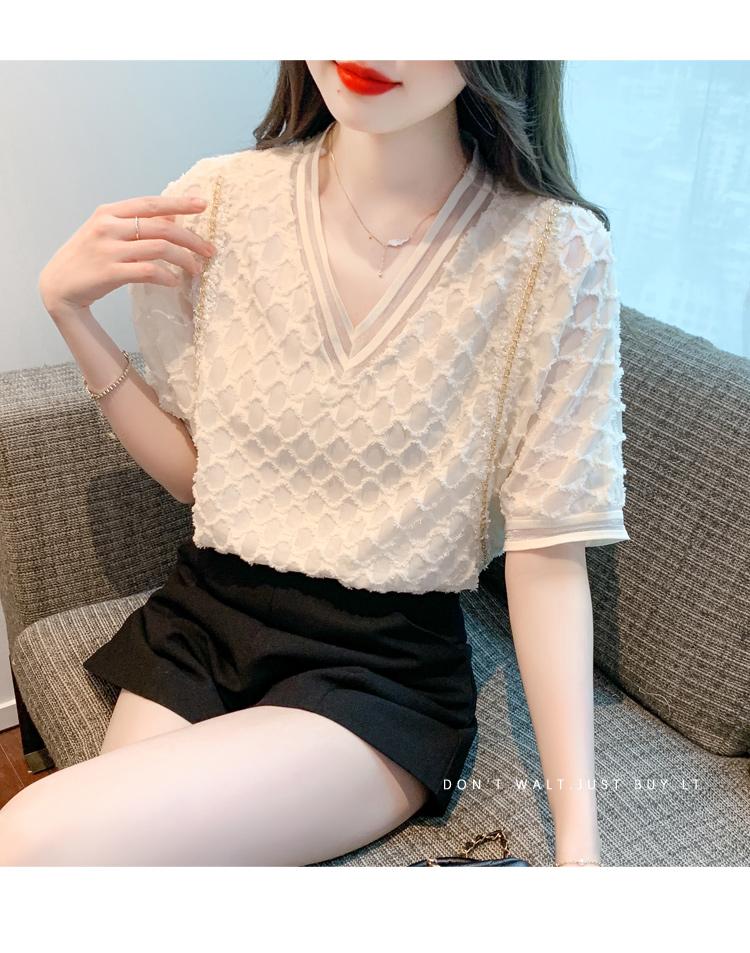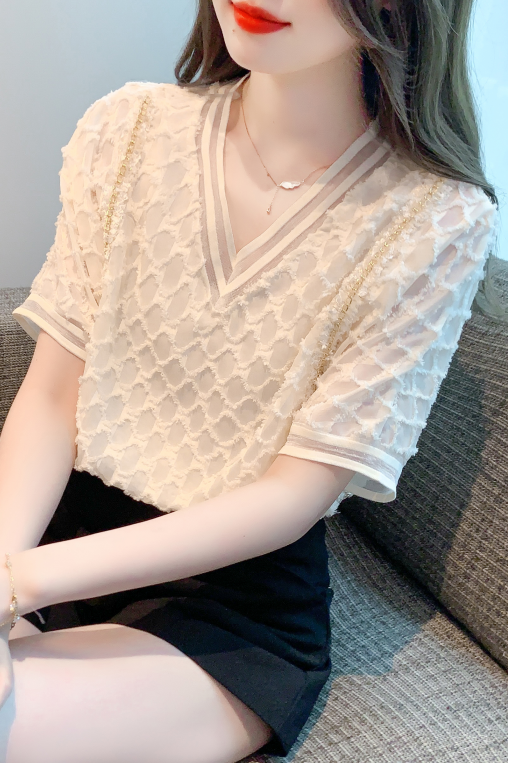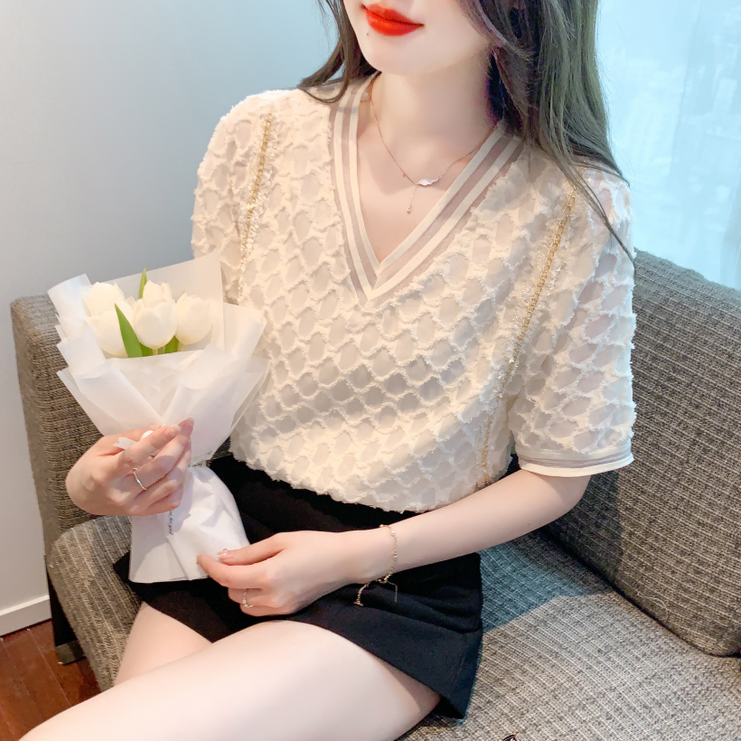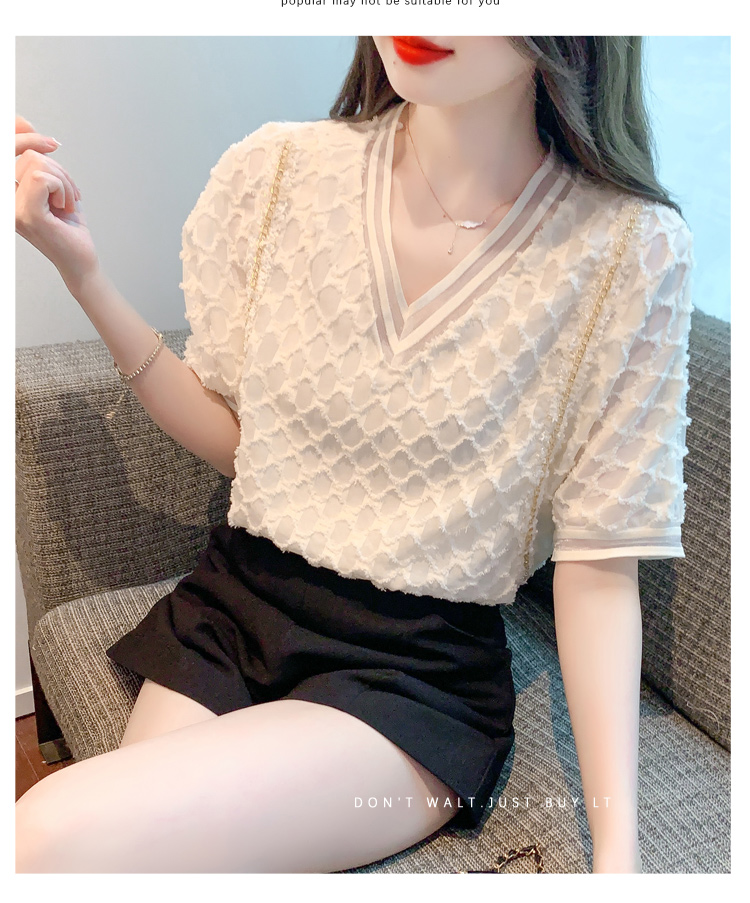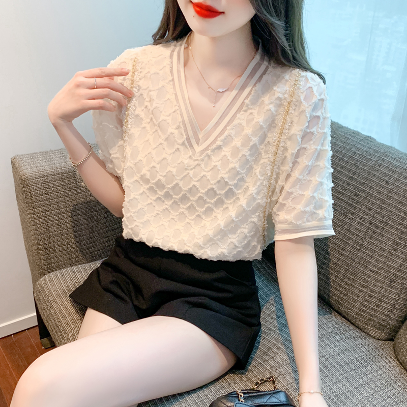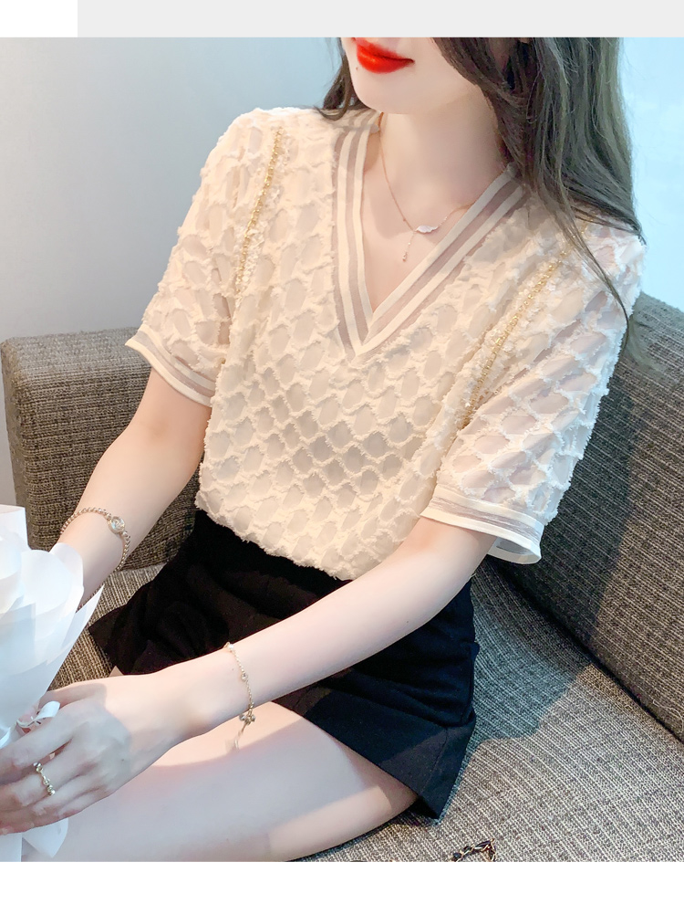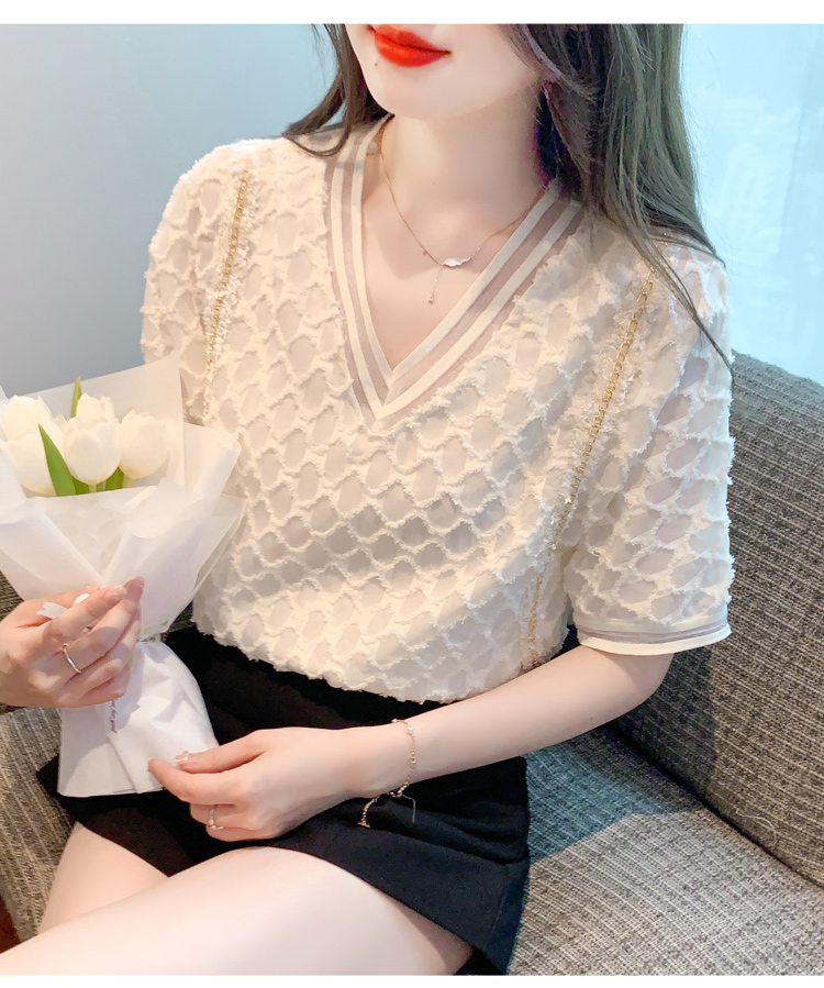 RY1666# 已出货2026夏季新款V领套头蕾丝衫雪纺衫格纹短袖洋气小衫气质女