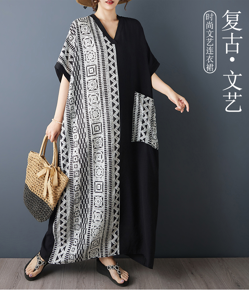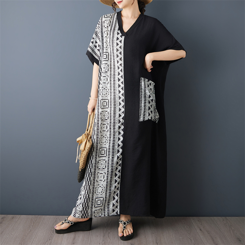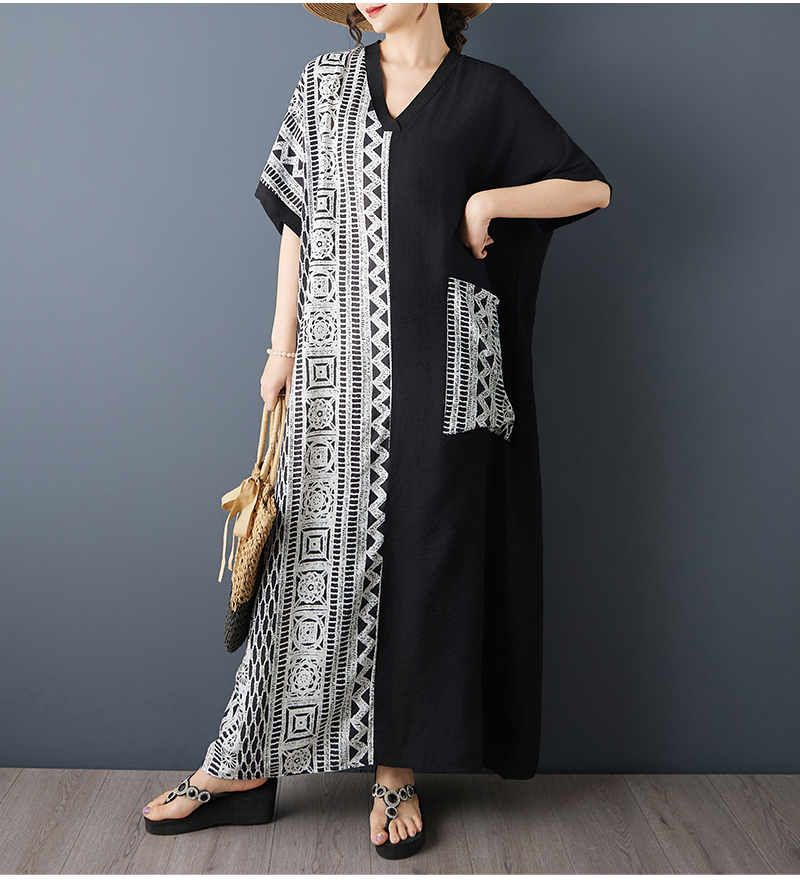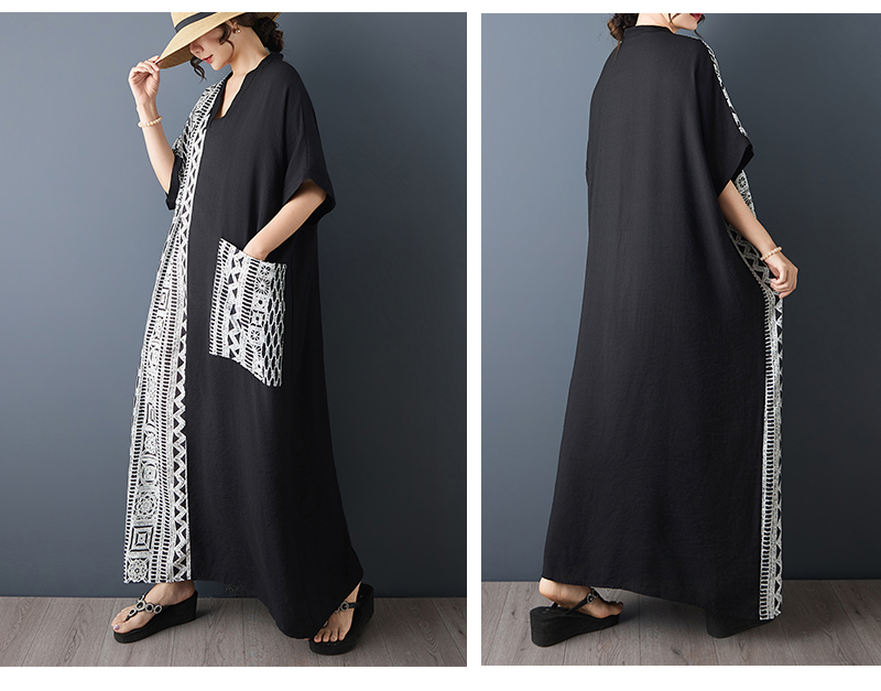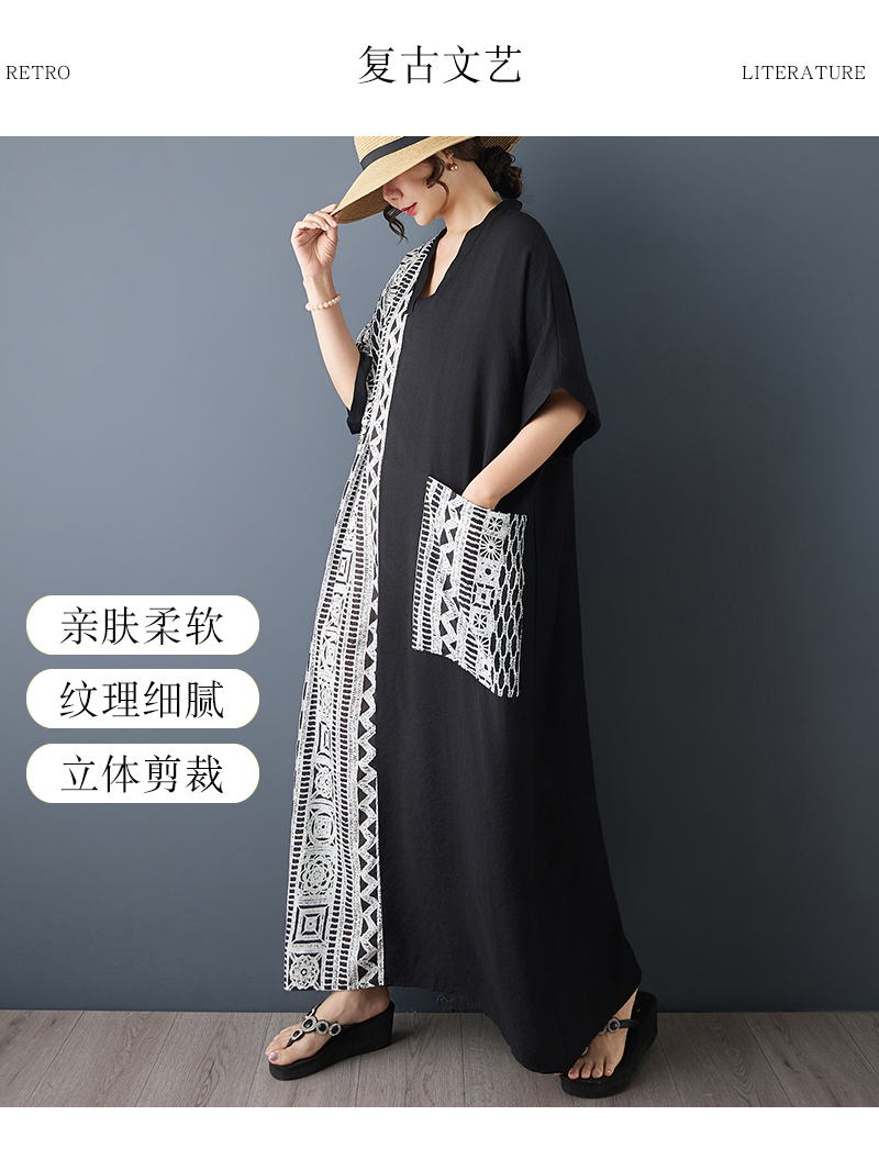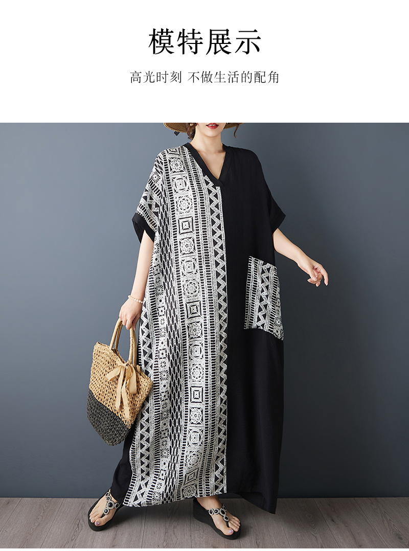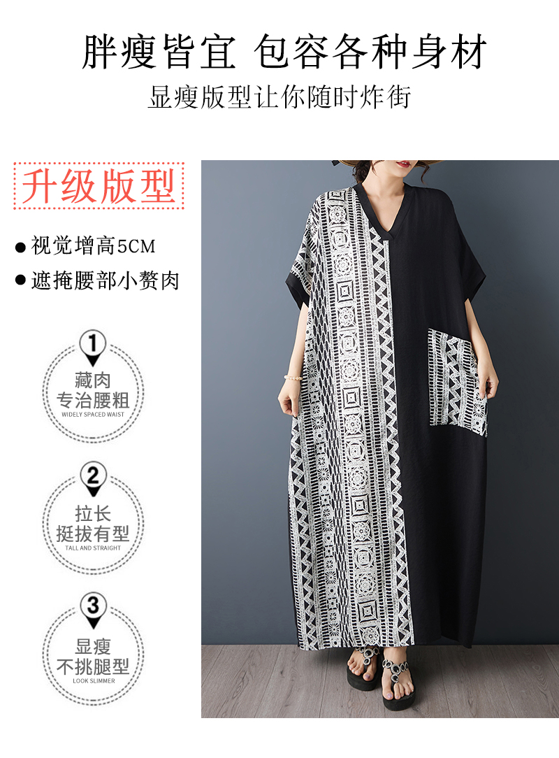 RY3349# 实拍26夏新款胖MM薄棉麻遮肉显瘦v领短袖撞色拼接黑色长款连衣裙