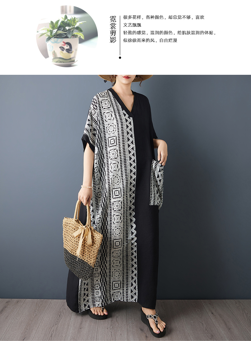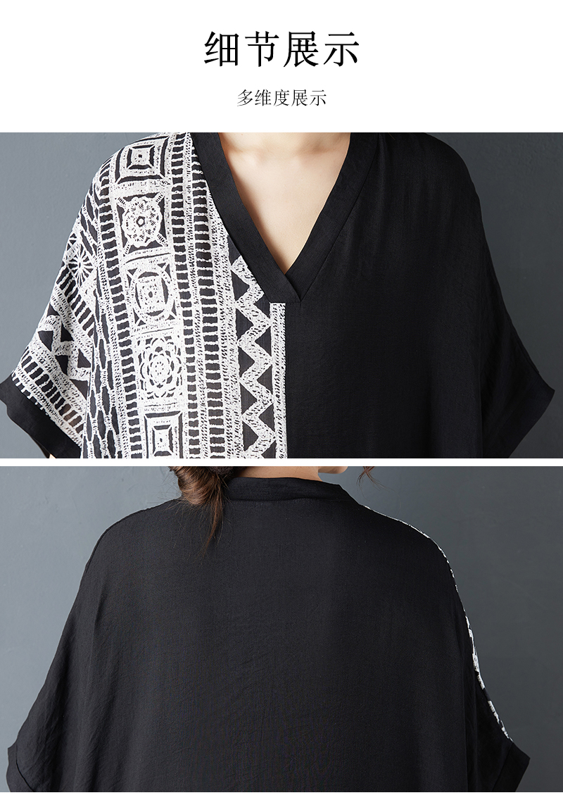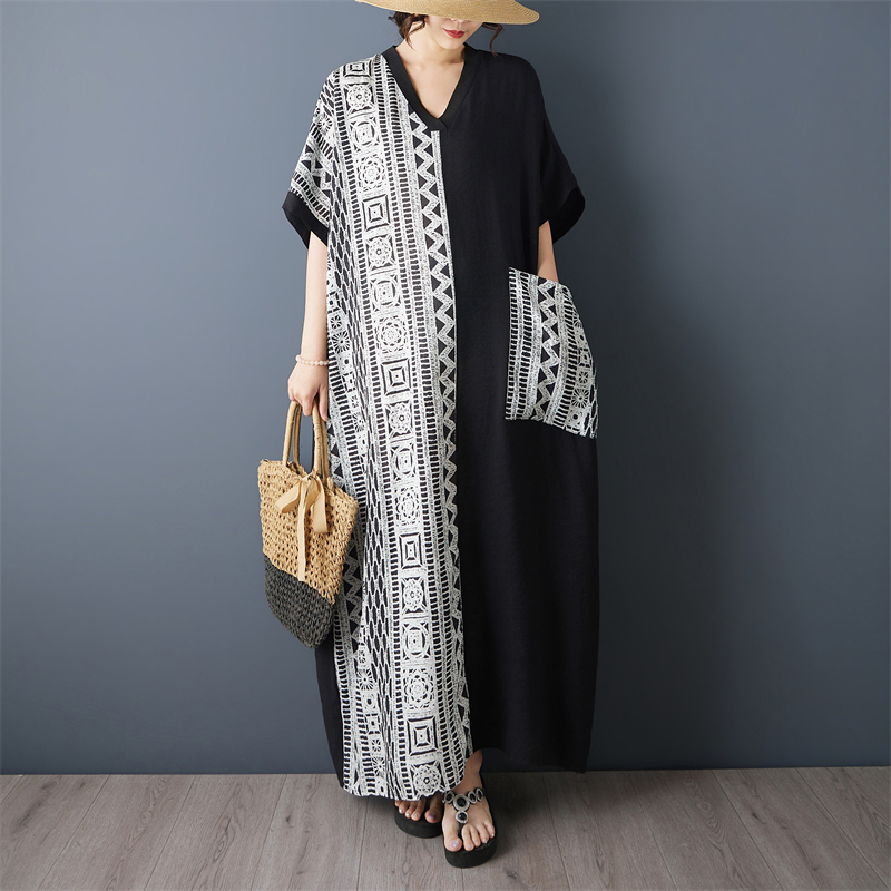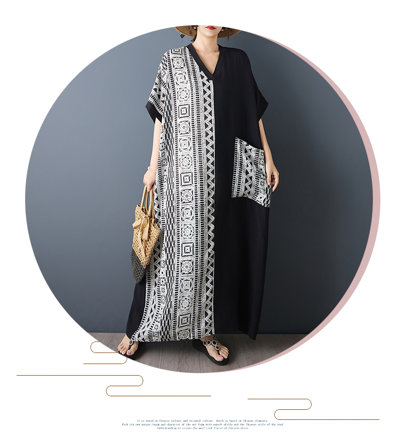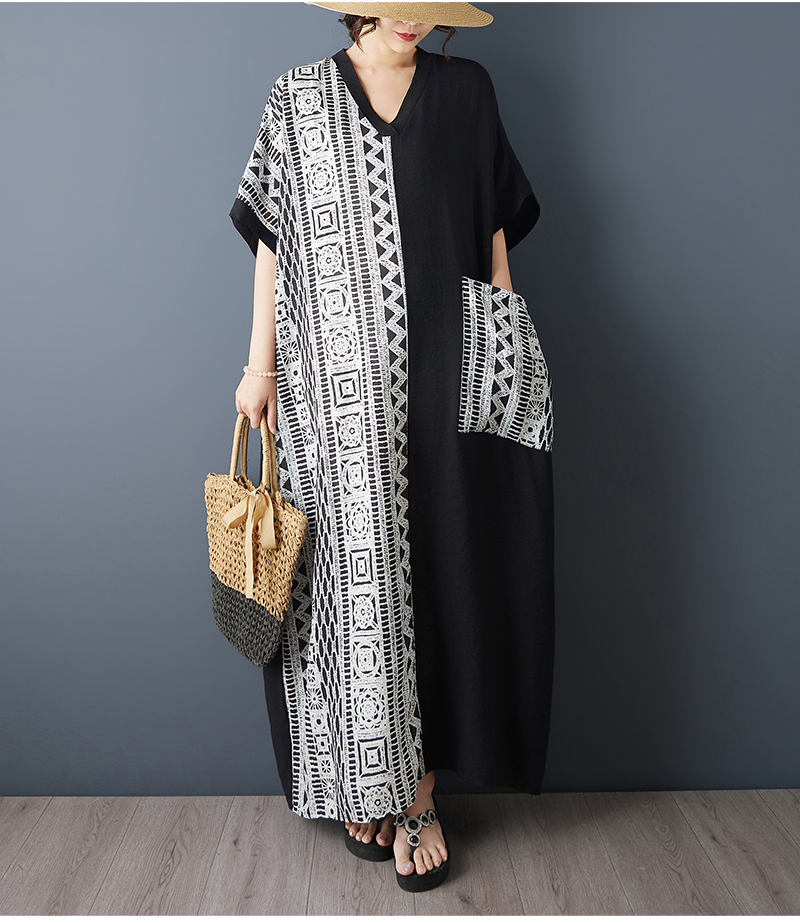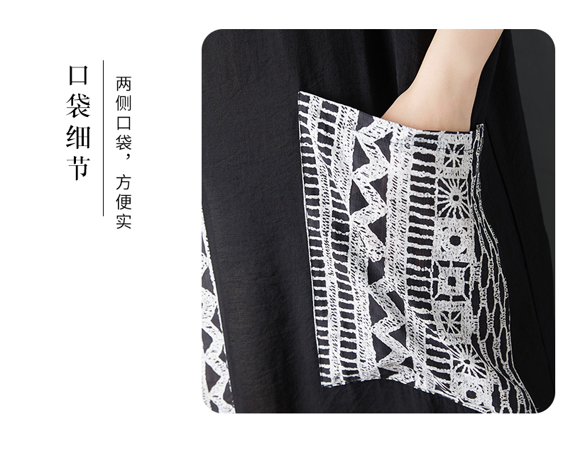 RY3349# 实拍26夏新款胖MM薄棉麻遮肉显瘦v领短袖撞色拼接黑色长款连衣裙