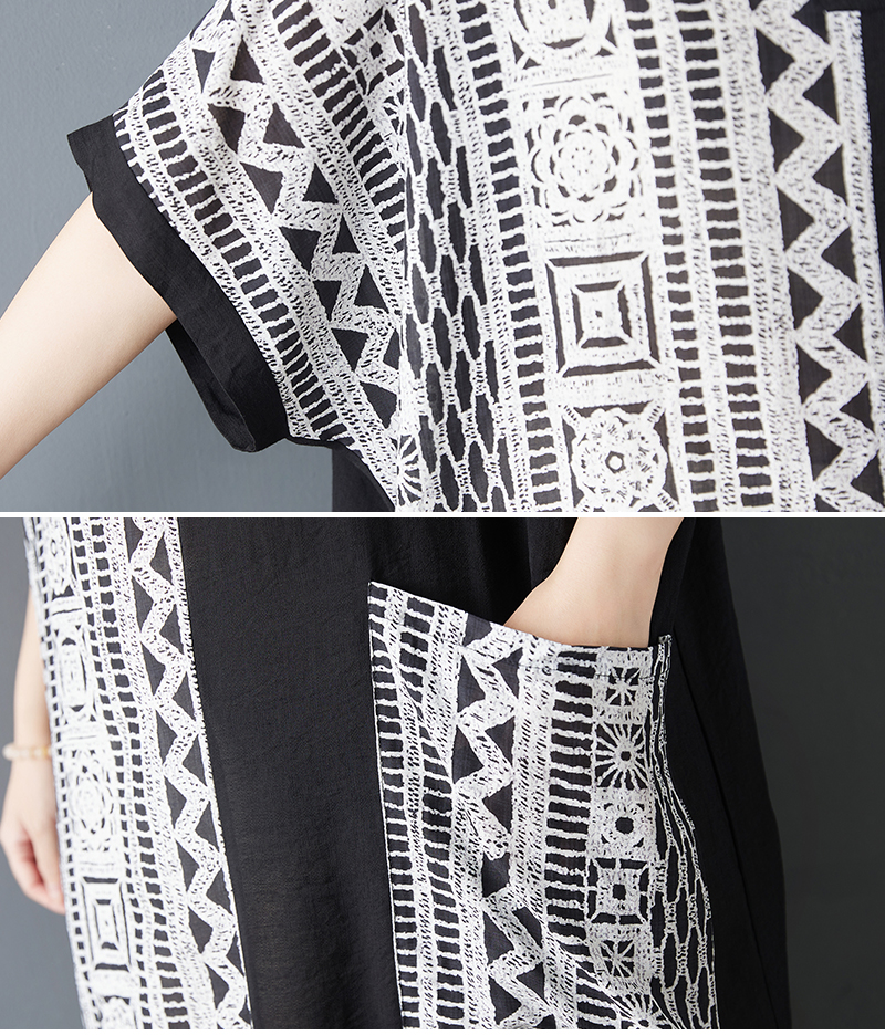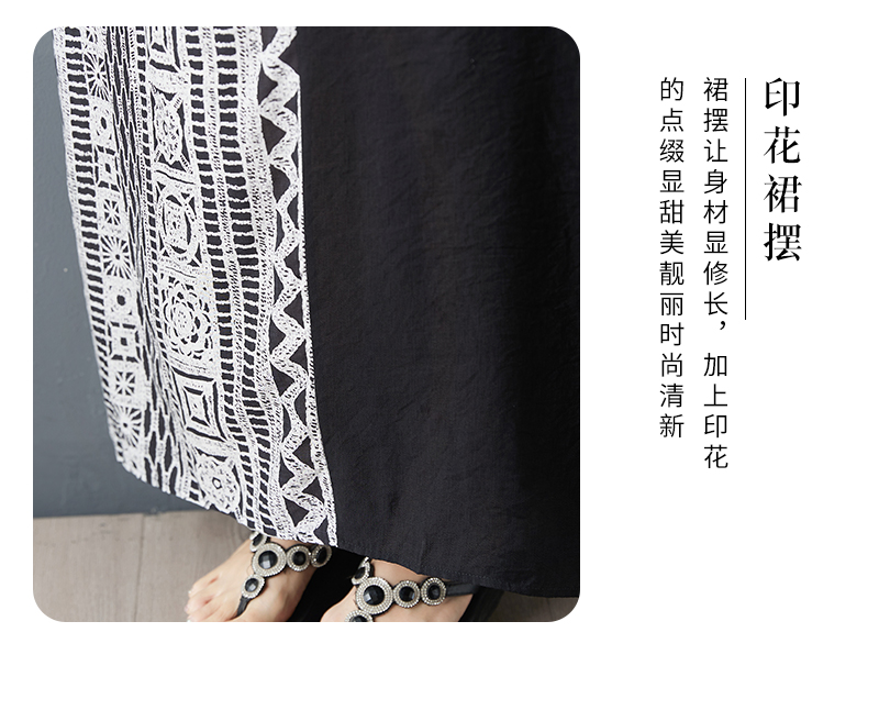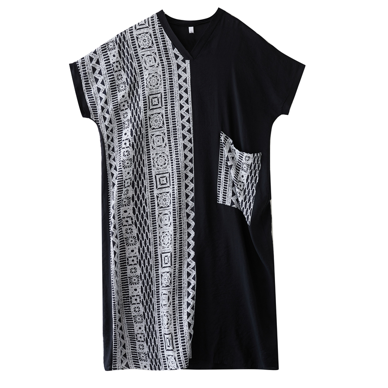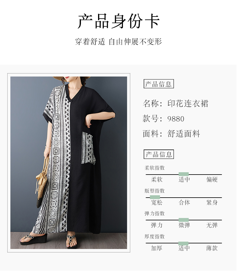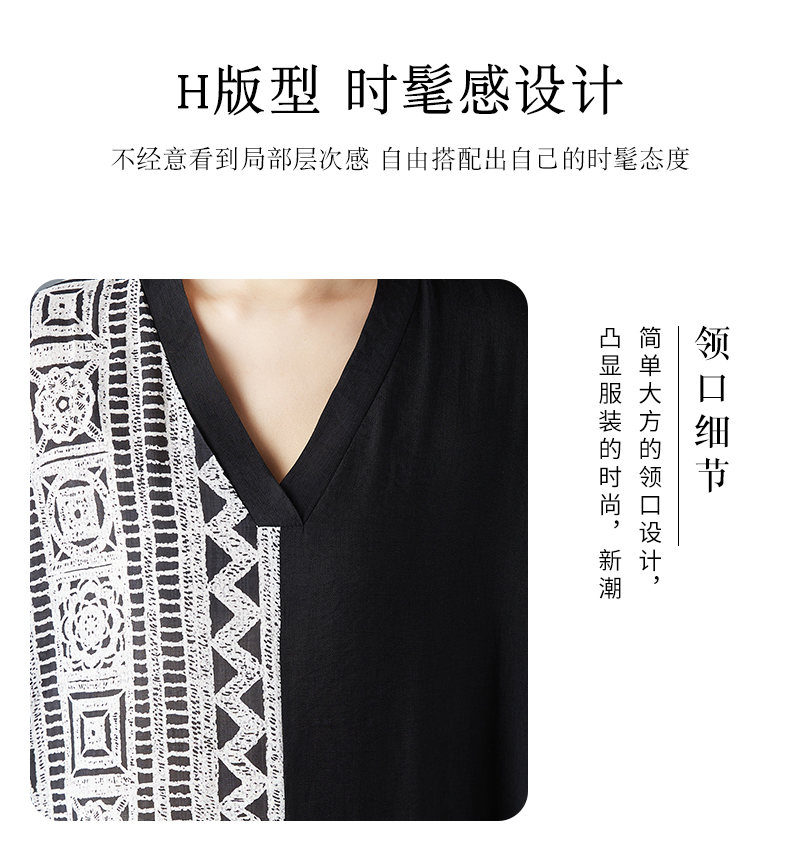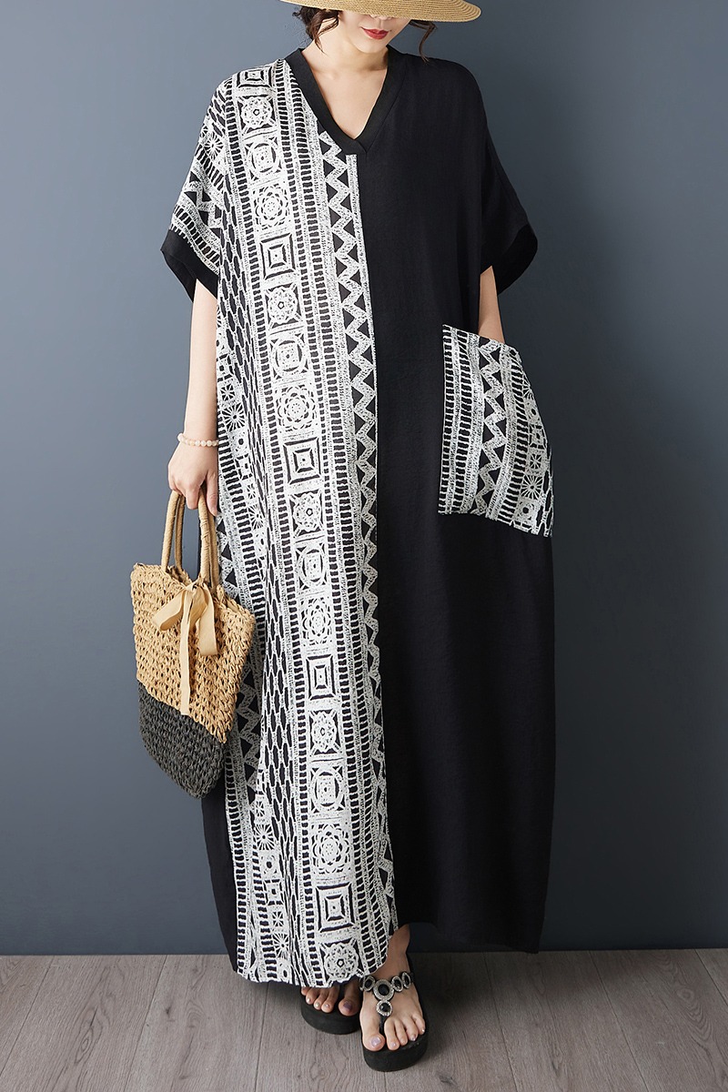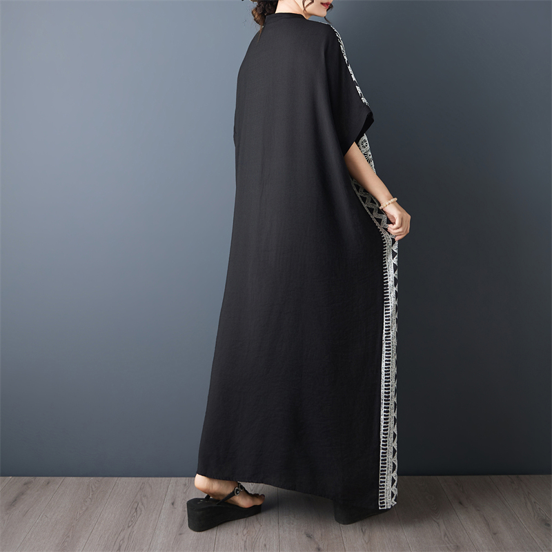 RY3349# 实拍26夏新款胖MM薄棉麻遮肉显瘦v领短袖撞色拼接黑色长款连衣裙