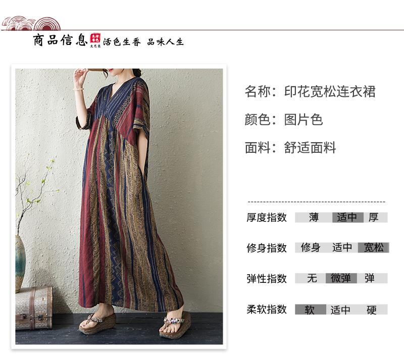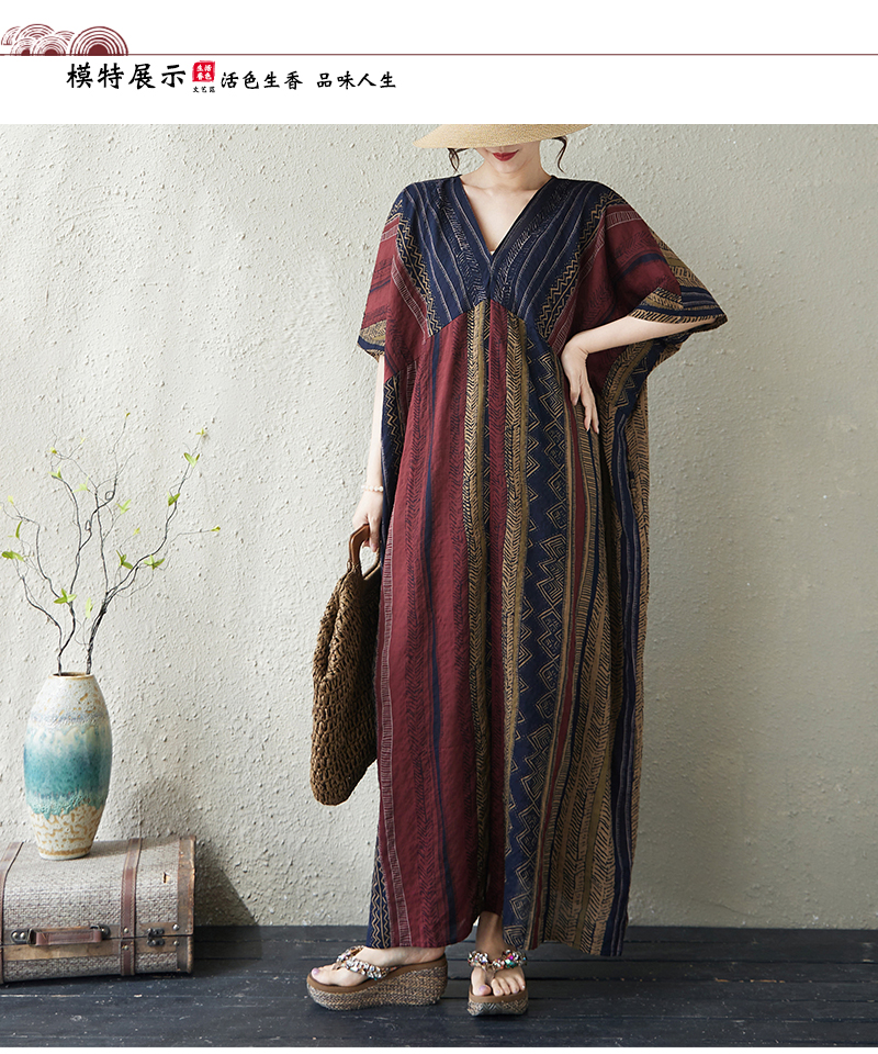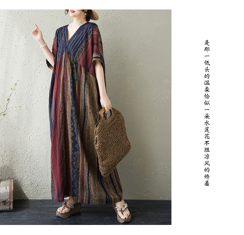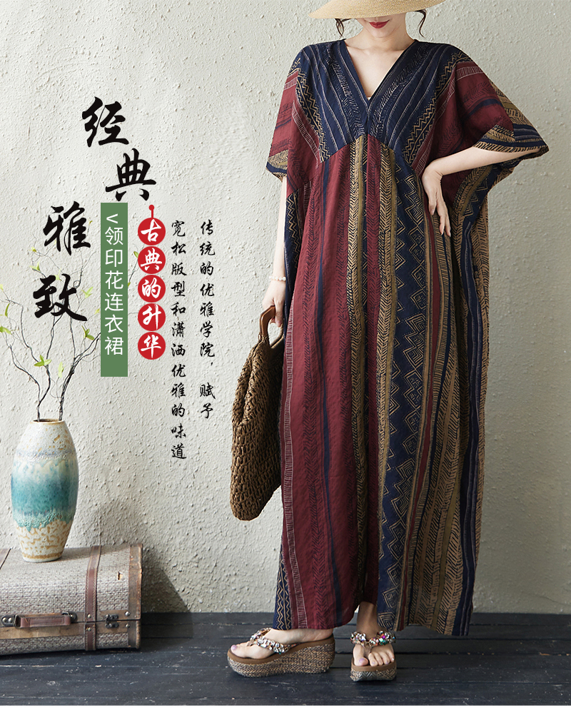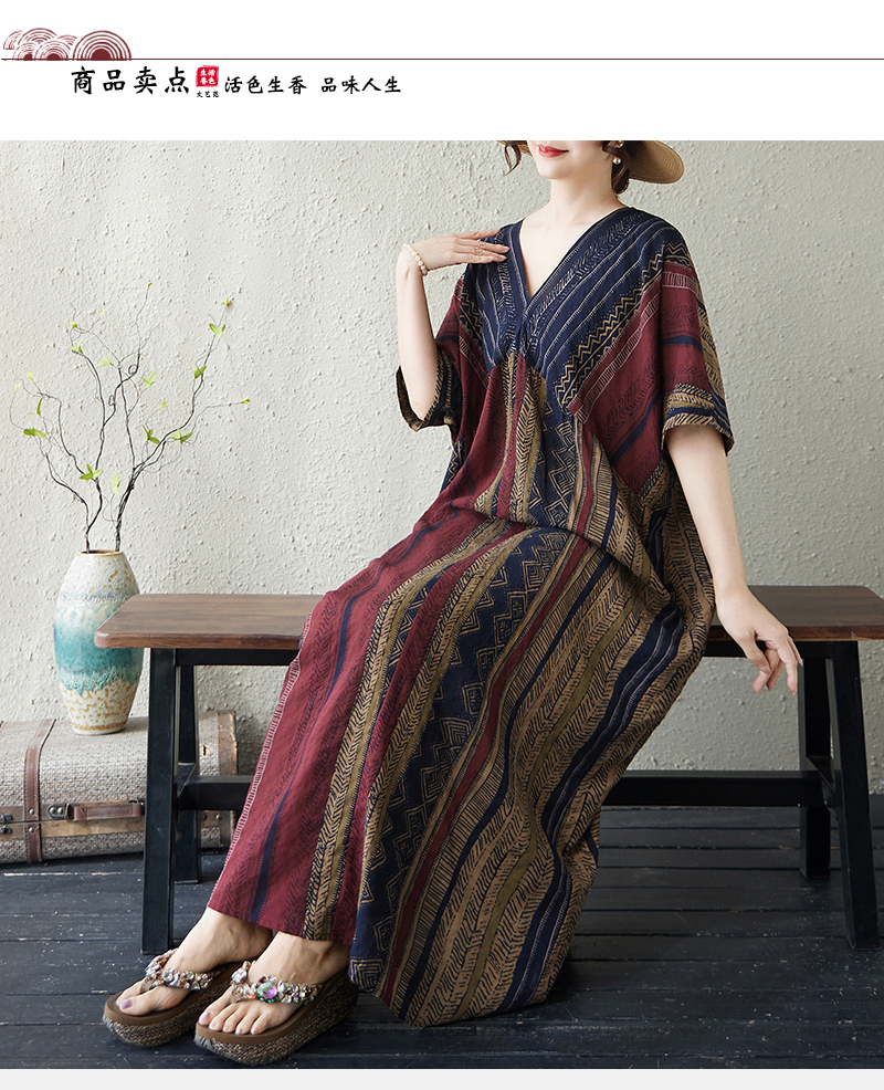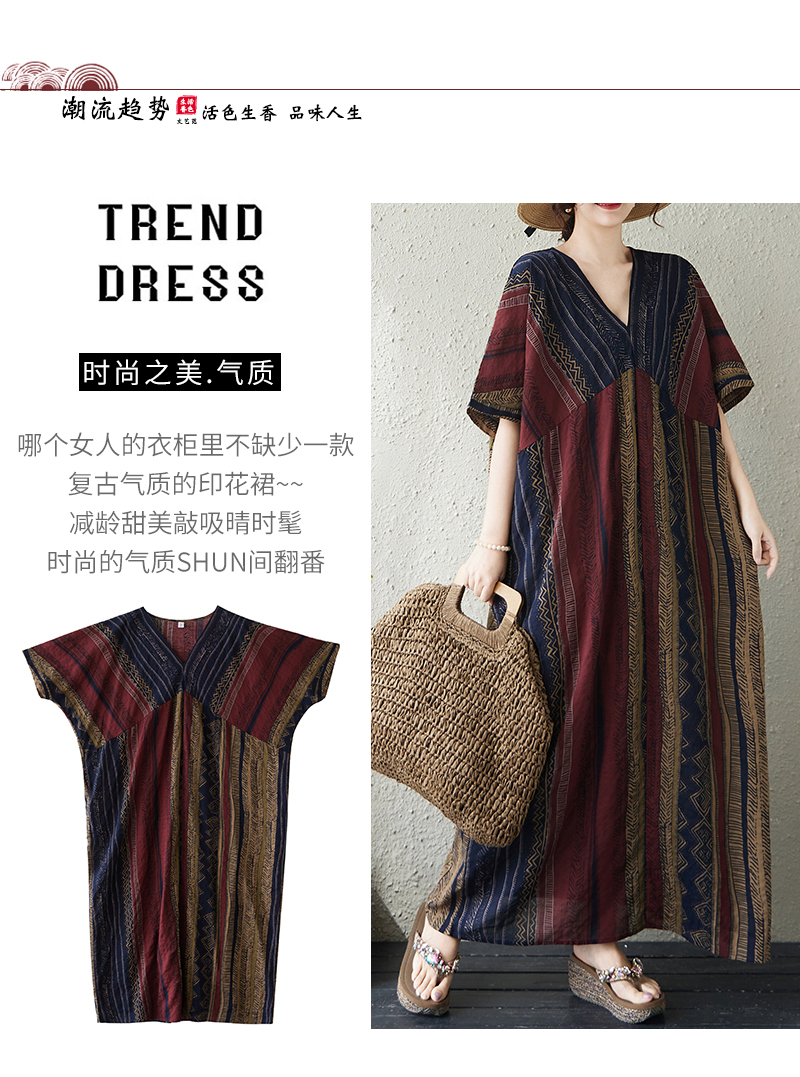 RY3351# 实拍大码原创法式高级感短袖v领薄棉麻印花宽松显瘦连衣裙女夏季
